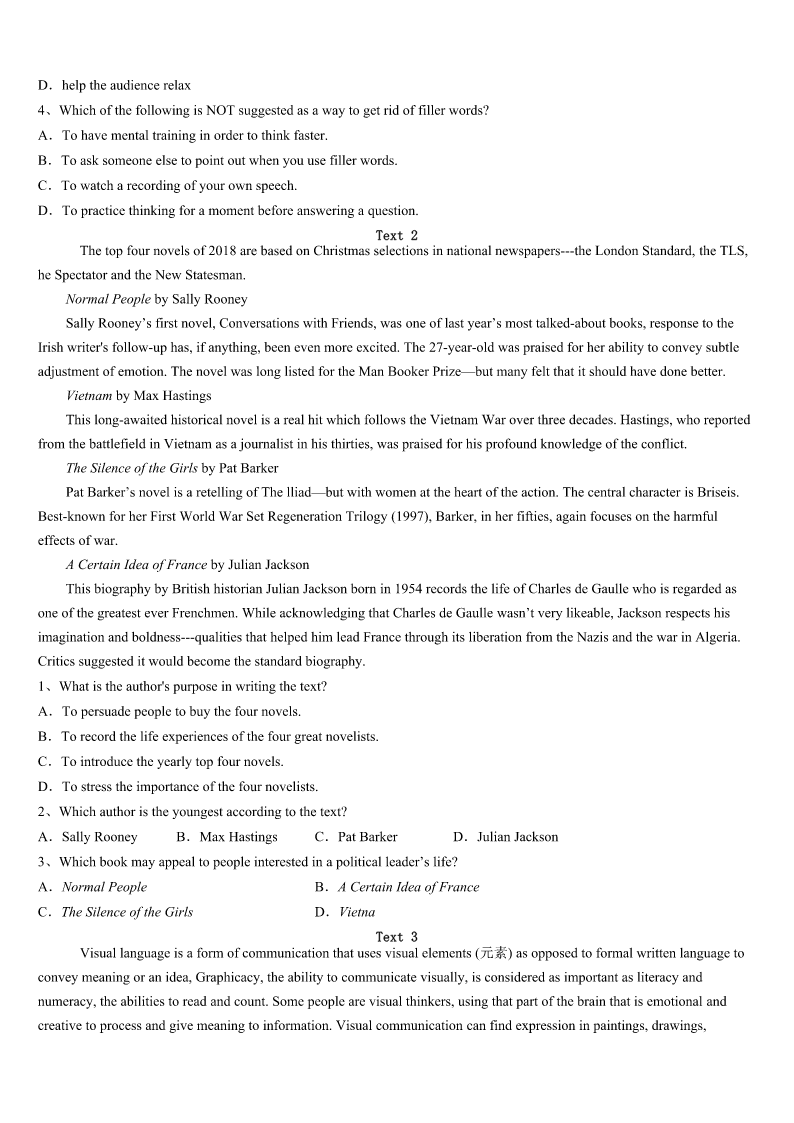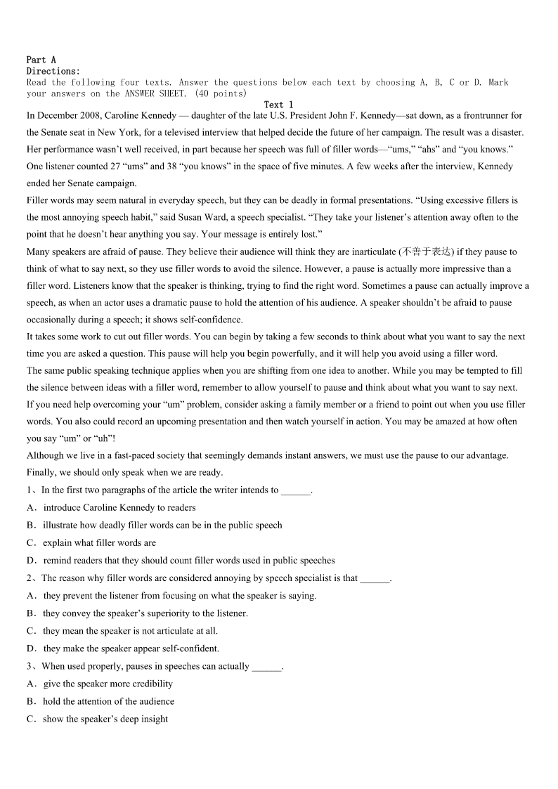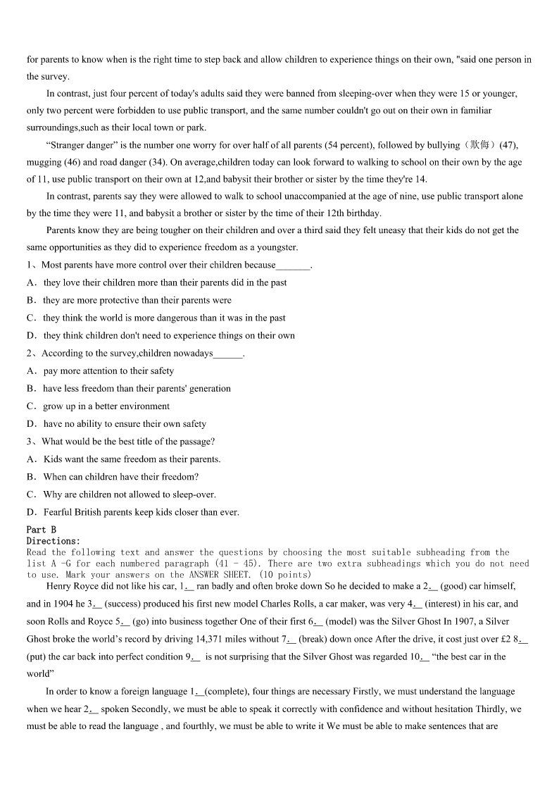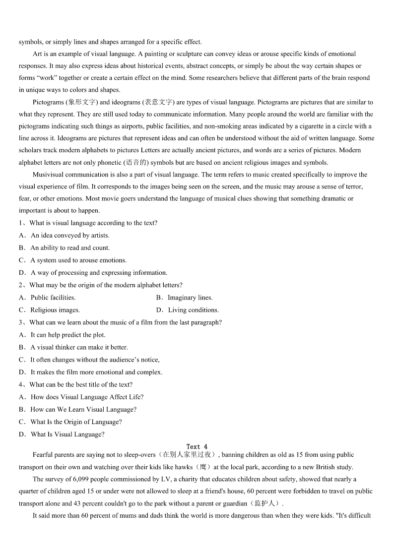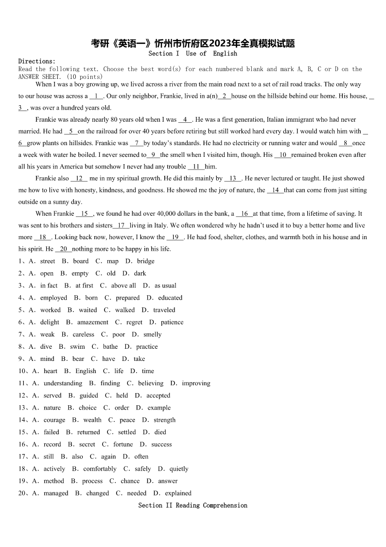 考研《英语一》忻州市忻府区2023年全真模拟试题 SectionIUseofEnglish Directions: Readthefollowingtext.Choosethebestword(s)foreachnumberedblankandmarkA,B,CorDonthe ANSWERSHEET.(10points) WhenIwasaboygrowingup,welivedacrossariverfromthemainroadnexttoasetofrailroadtracks.Theonlyway toourhousewasacrossa1.Ouronlyneighbor,Frankie,livedina(n)2houseonthehillsidebehindourhome.Hishouse, 3,wasoverahundredyearsold. Frankiewasalreadynearly80yearsoldwhenIwas4.Hewasafirstgeneration,Italianimmigrantwhohadnever married.Hehad5ontherailroadforover40yearsbeforeretiringbutstillworkedhardeveryday.Iwouldwatchhimwith 6growplantsonhillsides.Frankiewas7bytoday’sstandards.Hehadnoelectricityorrunningwaterandwould8once aweekwithwaterheboiled.Ineverseemedto9thesmellwhenIvisitedhim,though.His10remainedbrokenevenafter allhisyearsinAmericabutsomehowIneverhadanytrouble11him. Frankiealso12meinmyspiritualgrowth.Hedidthismainlyby13.Heneverlecturedortaught.Hejustshowed mehowtolivewithhonesty,kindness,andgoodness.Heshowedmethejoyofnature,the14thatcancomefromjustsitting outsideonasunnyday. WhenFrankie15,wefoundhehadover40,000dollarsinthebank,a16atthattime,fromalifetimeofsaving.It wassenttohisbrothersandsisters17livinginItaly.Weoftenwonderedwhyhehadn’tusedittobuyabetterhomeandlive more18.Lookingbacknow,however,Iknowthe19.Hehadfood,shelter,clothes,andwarmthbothinhishouseandin hisspirit.He20nothingmoretobehappyinhislife. 1、A.streetB.boardC.mapD.bridge 2、A.openB.emptyC.oldD.dark 3、A.infactB.atfirstC.aboveallD.asusual 4、A.employedB.bornC.preparedD.educated 5、A.workedB.waitedC.walkedD.traveled 6、A.delightB.amazementC.regretD.patience 7、A.weakB.carelessC.poorD.smelly 8、A.diveB.swimC.batheD.practice 9、A.mindB.bearC.haveD.take 10、A.heartB.EnglishC.lifeD.time 11、A.understandingB.findingC.believingD.improving 12、A.servedB.guidedC.heldD.accepted 13、A.natureB.choiceC.orderD.example 14、A.courageB.wealthC.peaceD.strength 15、A.failedB.returnedC.settledD.died 16、A.recordB.secretC.fortuneD.success 17、A.stillB.alsoC.againD.often 18、A.activelyB.co