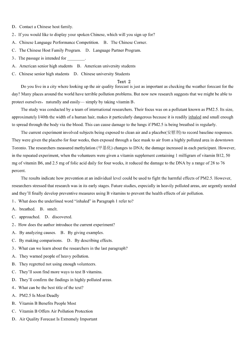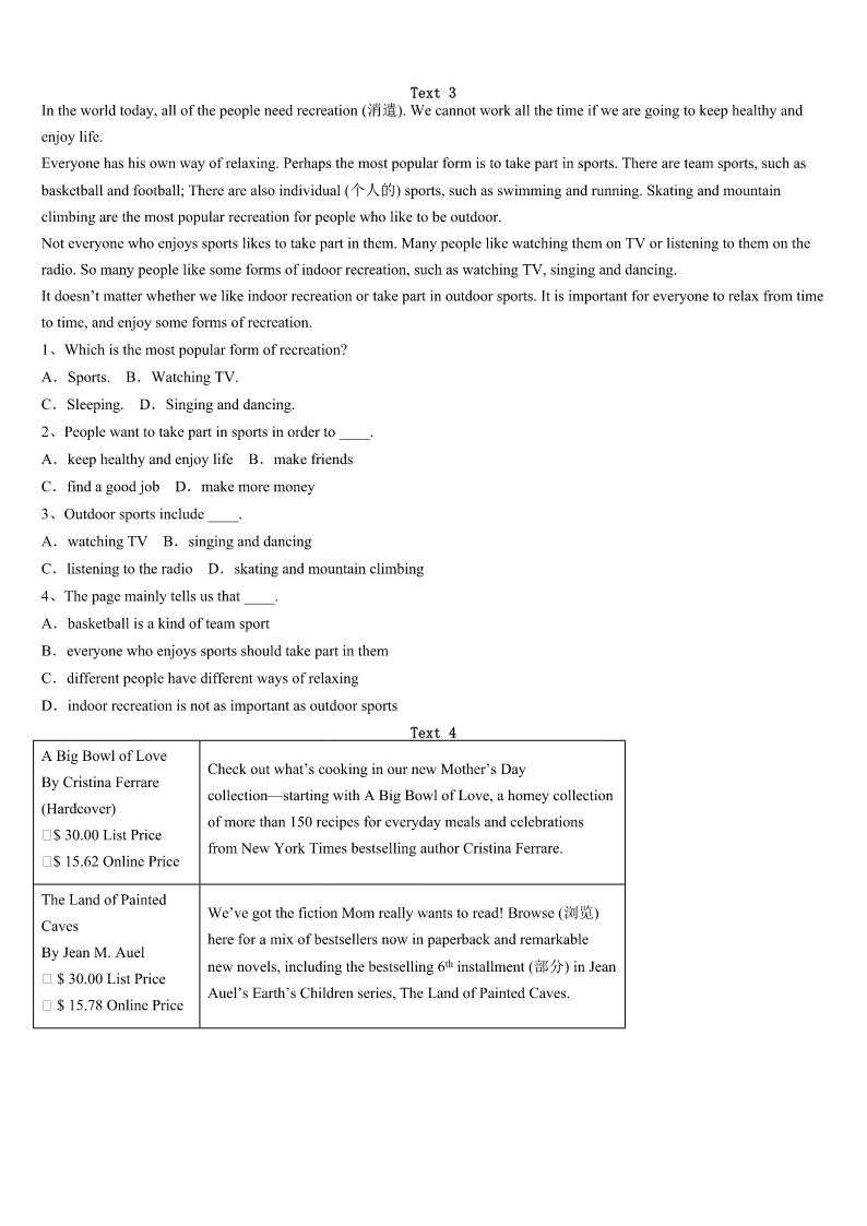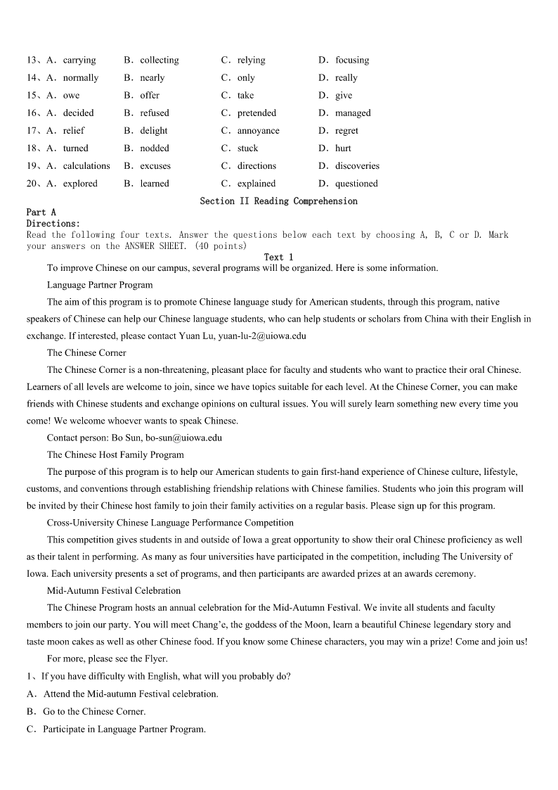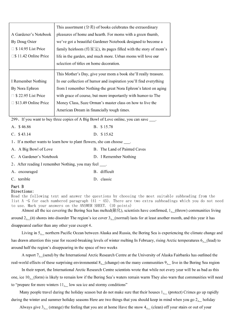考研《英语一》广西壮族贺州市昭平县2023年最后冲刺试题 SectionIUseofEnglish Directions: Readthefollowingtext.Choosethebestword(s)foreachnumberedblankandmarkA,B,CorDonthe ANSWERSHEET.(10points) DoubleTrouble WhenIwaseight,Iwantedatoyandneeded$10tobuyit.But,asusual,Iwasbroken.Idecidedtoaskmy11-year-old sister,Kathleen,foraloan.Iwenttoherroom,1herforthecash.Laughing,sheagreedto2methemoney,butadded,“I willchargeyou10percentcompoundinterestevery3untilyoupaymeback.” “Compoundinterest---what’sthat?”Iasked. “Well,interestiswhatyoucallthe4moneyborrowershavetopaybackonaloan,”sheexplained.“Compoundinterest meansthattheinterestpaymentsgetbiggerandbiggerthe5youtaketopaybacktheloan.Torepaytheloan,youwillneed togiveme$11afteronemonth.Ifyouwaittwomonthstopaymeback,your6willgrowfrom$10to$11.SoI’llbe chargingyouintereston$11.ThenIwilladdthatinteresttothe$11youalreadyoweme,fora7of$12.10.That’swhat you’lloweaftertwomonths.” “Sure.Igetit,”Isaid.Thoughtruthfully,Iwasgetting8. Kathleenlentmethemoney,andIboughtthetoy.Mybirthdaycameamonthlater,andmymomgaveme$10.9,that wasjusttheamountIneededtobuyanothertoyIwanted10.Iputoffpayingmysisterforamonth.Afteranothermonth,I 11abouttheloan. Severalmonthslater,onChristmasmorning,mysisterandIeachfounda$02billinourstockings.Iwasjustputtingit intomypocket12Kathleentappedmeontheshoulder. “Sorry,kiddo.That’smine.I’m13onyourdebt.” “Huh?”ThenIrememberedtheloan.“Hey!Howcanitbethatmuch?I14borrowed$10.” “True,”shesaid,“butinteresthasbeencompoundingforeightmonths.Nowyou15me$1.43.”Shepaused,then added.“Youcanpaymethe$1.43.” I16tobelievethata$10loancouldmorethandoublesoquickly.Muchtomy17,mysistergotherpenciland tabletandshowedmeexactlyhowitalladdedup. Myhead18asItriedtokeeptrackofKathleen’s19,butthistime,Igotthebasicideaofcompoundinterest.I20 thehardwaythatborrowingmoneycanbe“doubletrouble”innotime. 1、A.blamingB.beggingC.searchingD.preparing 2、A.payB.sendC.lendD.hand 3、A.monthB.yearC.weekD.day 4、A.littleB.sameC.enoughD.extra 5、A.shorterB.longerC.moreD.less 6、A.cashB.savingC.noteD.debt 7、A.