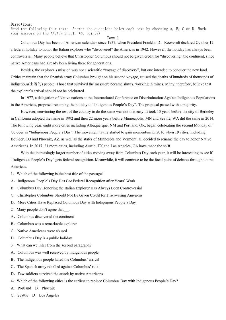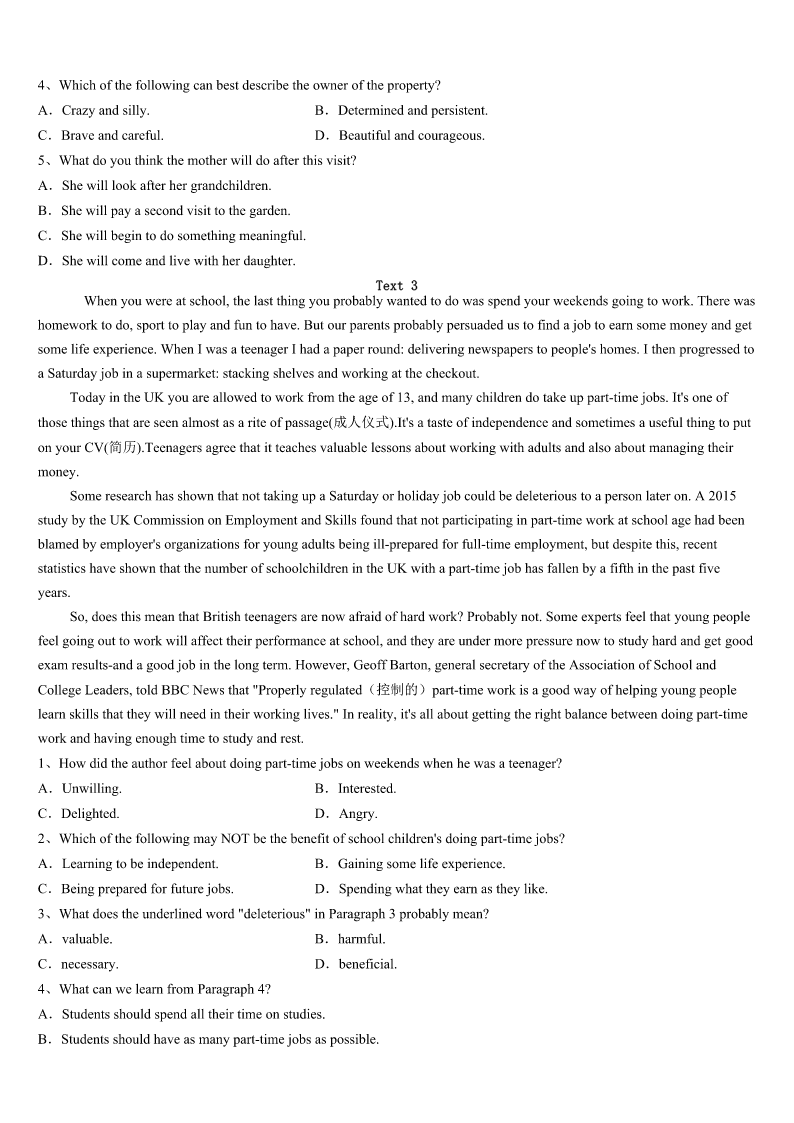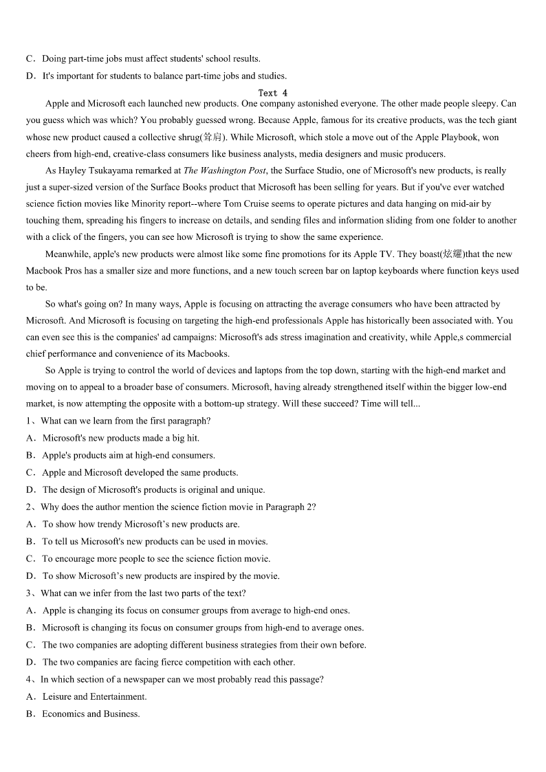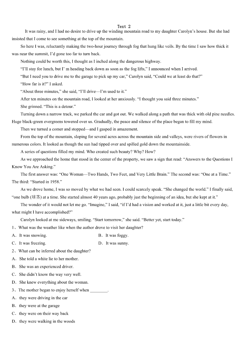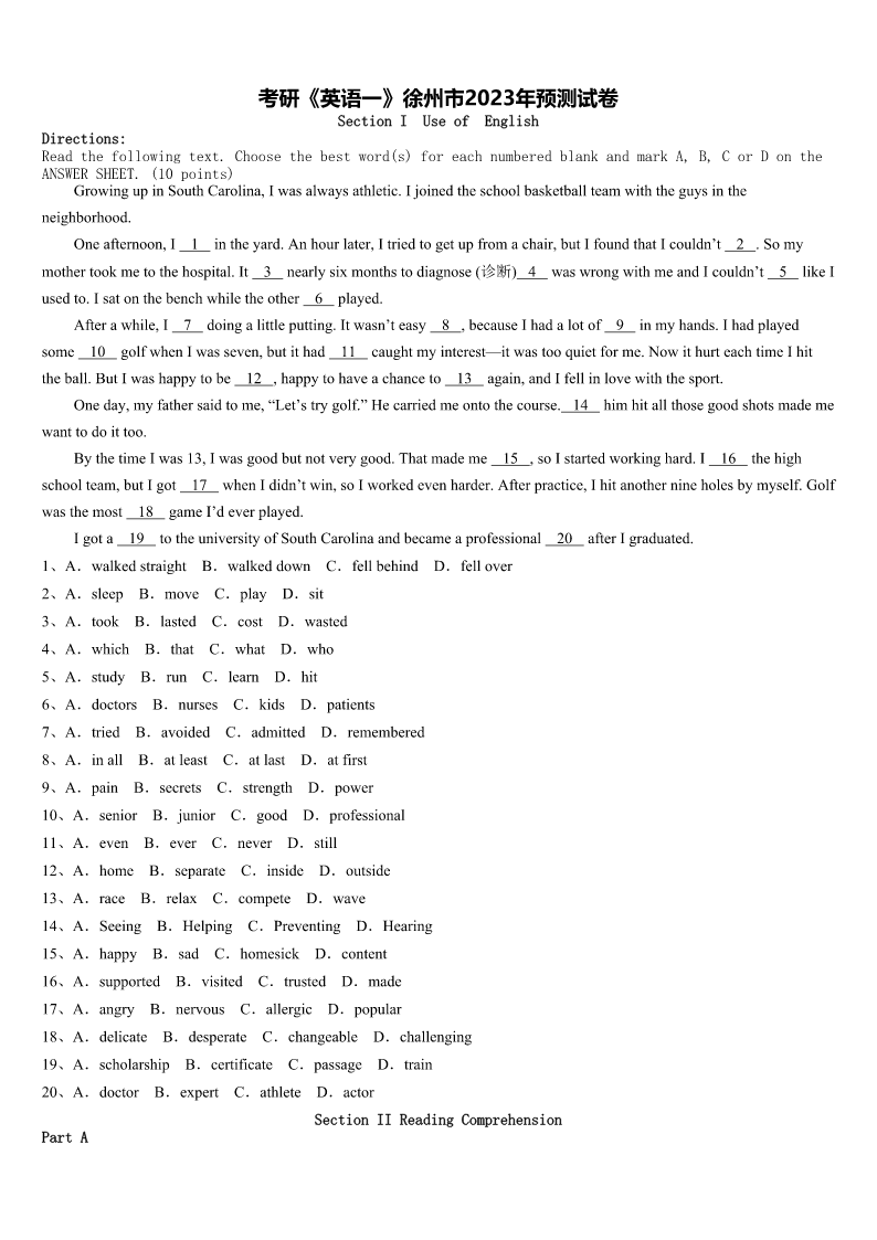 考研《英语一》徐州市2023年预测试卷 SectionIUseofEnglish Directions: Readthefollowingtext.Choosethebestword(s)foreachnumberedblankandmarkA,B,CorDonthe ANSWERSHEET.(10points) GrowingupinSouthCarolina,Iwasalwaysathletic.Ijoinedtheschoolbasketballteamwiththeguysinthe neighborhood. Oneafternoon,I1intheyard.Anhourlater,Itriedtogetupfromachair,butIfoundthatIcouldn’t2.Somy mothertookmetothehospital.It3nearlysixmonthstodiagnose(诊断)4waswrongwithmeandIcouldn’t5likeI usedto.Isatonthebenchwhiletheother6played. Afterawhile,I7doingalittleputting.Itwasn’teasy8,becauseIhadalotof9inmyhands.Ihadplayed some10golfwhenIwasseven,butithad11caughtmyinterest—itwastooquietforme.NowithurteachtimeIhit theball.ButIwashappytobe12,happytohaveachanceto13again,andIfellinlovewiththesport. Oneday,myfathersaidtome,“Let’strygolf.”Hecarriedmeontothecourse.14himhitallthosegoodshotsmademe wanttodoittoo. BythetimeIwas13,Iwasgoodbutnotverygood.Thatmademe15,soIstartedworkinghard.I16thehigh schoolteam,butIgot17whenIdidn’twin,soIworkedevenharder.Afterpractice,Ihitanothernineholesbymyself.Golf wasthemost18gameI’deverplayed. Igota19totheuniversityofSouthCarolinaandbecameaprofessional20afterIgraduated. 1、A.walkedstraightB.walkeddownC.fellbehindD.fellover 2、A.sleepB.moveC.playD.sit 3、A.tookB.lastedC.costD.wasted 4、A.whichB.thatC.whatD.who 5、A.studyB.runC.learnD.hit 6、A.doctorsB.nursesC.kidsD.patients 7、A.triedB.avoidedC.admittedD.remembered 8、A.inallB.atleastC.atlastD.atfirst 9、A.painB.secretsC.strengthD.power 10、A.seniorB.juniorC.goodD.professional 11、A.evenB.everC.neverD.still 12、A.homeB.separateC.insideD.outside 13、A.raceB.relaxC.competeD.wave 14、A.SeeingB.HelpingC.PreventingD.Hearing 15、A.happyB.sadC.homesickD.content 16、A.supportedB.visitedC.trustedD.made 17、A.angryB.nervousC.allergicD.popular 18、A.delicateB.desperateC.changeableD.challenging 19、A.scholarshipB.certificateC.passageD.train 20、A.doctorB.expertC.athleteD.actor SectionIIReadingComprehension PartA Directions: Readthefollowingfourtexts.Answerthequestionsbeloweacht