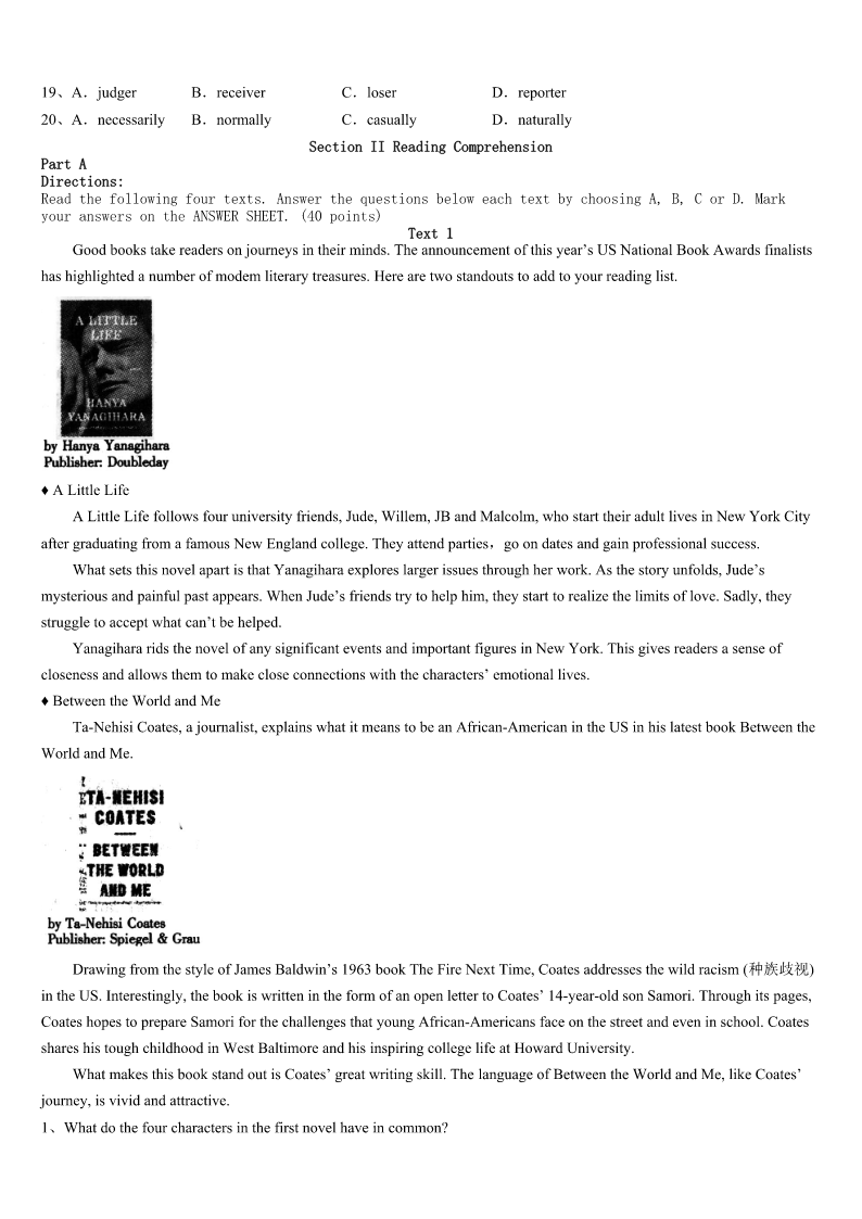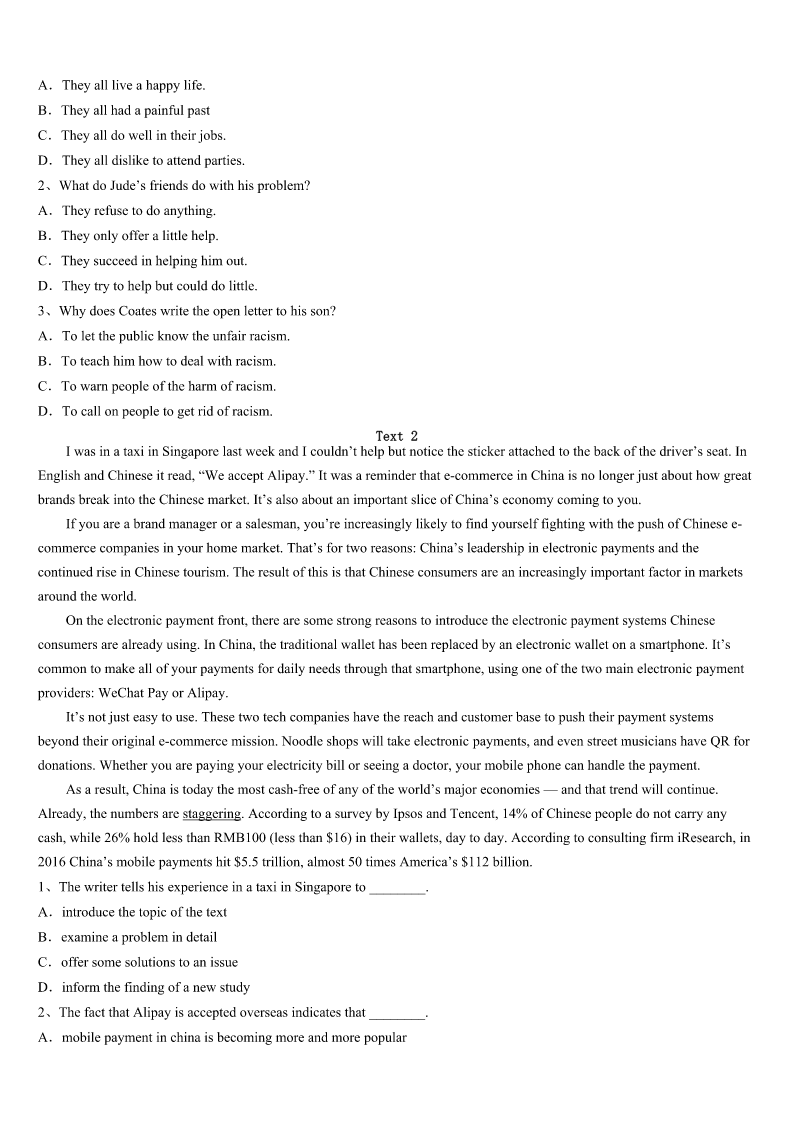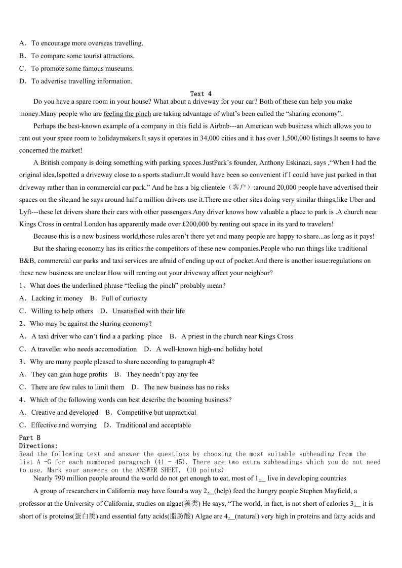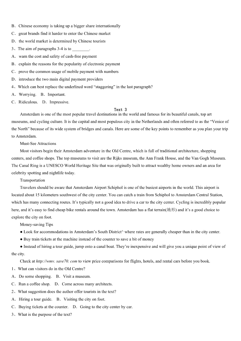 考研《英语一》延边朝鲜族自治州安图县2023年最后冲刺试题 SectionIUseofEnglish Directions: Readthefollowingtext.Choosethebestword(s)foreachnumberedblankandmarkA,B,CorDonthe ANSWERSHEET.(10points) Igrewupwithtwoeldersisters.IfIwasn’tcourteous(礼貌)tothem,they’dfixme.Socourtesywasn’treally1in mychildhoodhome. Mysisters2everychancetotrainmehowtobeacourteous3.Theymademeopendoorsforthemorhelpthem intotheir4atdinner. YearslaterIwentawaytocollege.ThefirsttimeIwalkedintothelibrary,InoticedawomanwalkingbehindmeandI 5thedooropenforher. 6,sheglaredatme,askingloudly,“DoyouthinkthatbecauseI’mawomanI'mnot7enoughtoopenadoor formyself?”Sheslammed(摔)thedoorshut,leavingmeastonishedand8.Myfaceburnedwith9.Idecided10 thattherewouldbenomorecourtesy! AsIstoodthere,anotherlady11thedoor,herarms12withtextbooks.Instinctively(本能地)I13toopenthe doorforher.14IrealizedwhatIhaddone.Ipreparedmyselfforshouts.However,Ireceivedawarmsmileandalookof 15. “Thanks!”shesaidbrightly.“It’snicetoseewestillhaveafewgentlemenaroundhere!” Ofcourse,ifIwereREALLYagentleman,Iwouldhave16tohelpwithherbooks.Despitethis,Iappreciatedthe good17Igotfromperformingallactofsimplecourtesy.Todootherwisewouldbeto18mylifetimeoftraining. Courtesybringspleasant,refreshinglighttoourliveswhetherwearethegiver,the19orjustaninterested observer.Courtesydoesn’t20changeourlives,butitcancertainlytransformthewaywefeelaboutlife. 1、A.importantB.availableC.delightfulD.optional 2、A.madethemostofB.gotreadyforC.gavewaytoD.putforward 3、A.colleagueB.assistantC.companionD.gentleman 4、A.dressesB.chairsC.dishesD.mouths 5、A.answeredB.unlockedC.heldD.forced 6、A.InsteadB.EvensoC.UnexpectedlyD.Sureenough 7、A.strongB.confidentC.courageousD.experienced 8、A.impatientB.speechlessC.anxiousD.desperate 9、A.fearB.excitementC.embarrassmentD.envy 10、A.inadvanceB.inaflashC.oncemoreD.bychance 11、A.approachedB.passedC.pulledD.entered 12、A.surroundedB.crowdedC.coveredD.overloaded 13、A.regrettedB.refusedC.reachedD.hesitated 14、A.UntilB.AlthoughC.IncaseD.Themoment 15、A.doubtB.reliefC.guiltD.curiosity 16