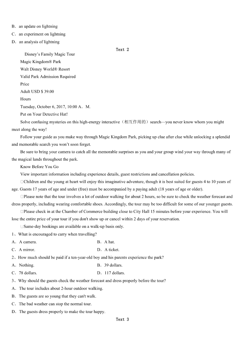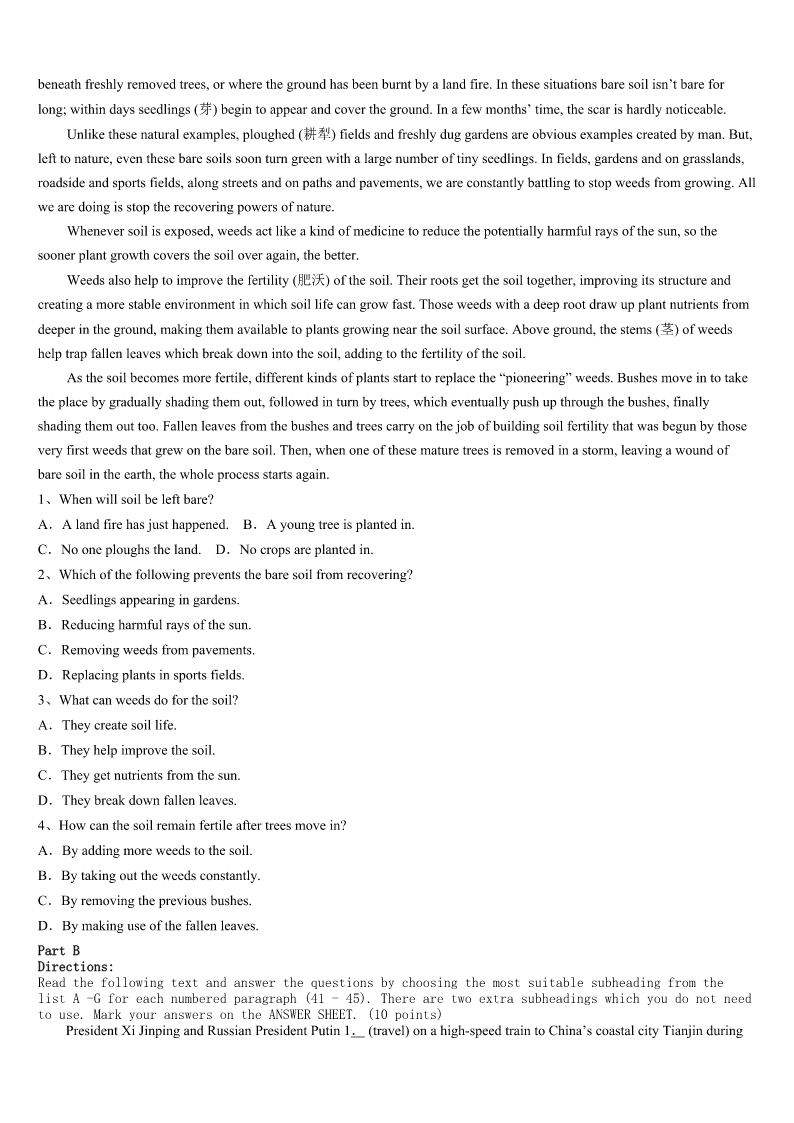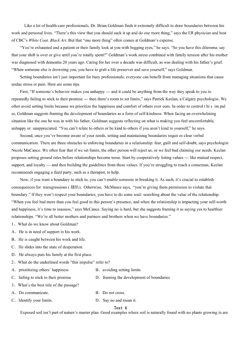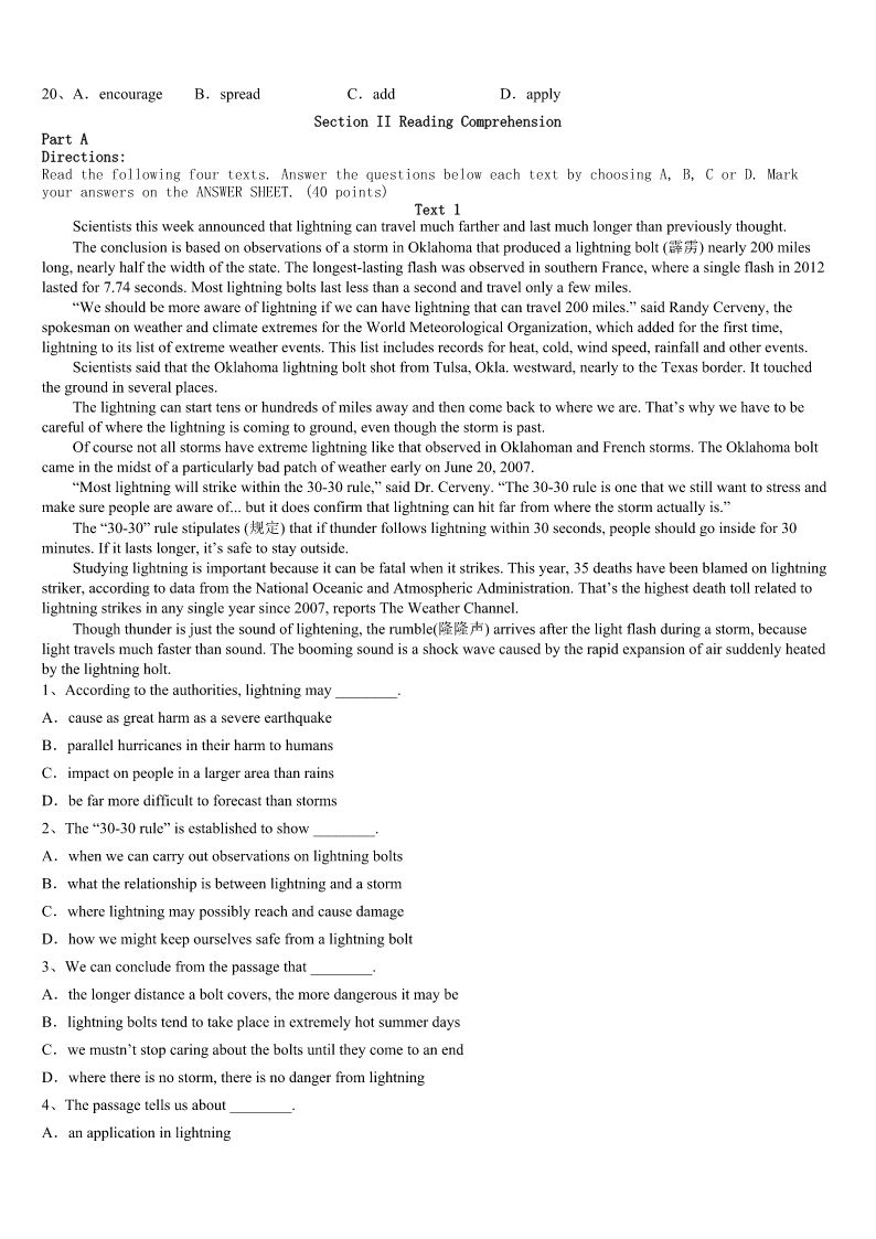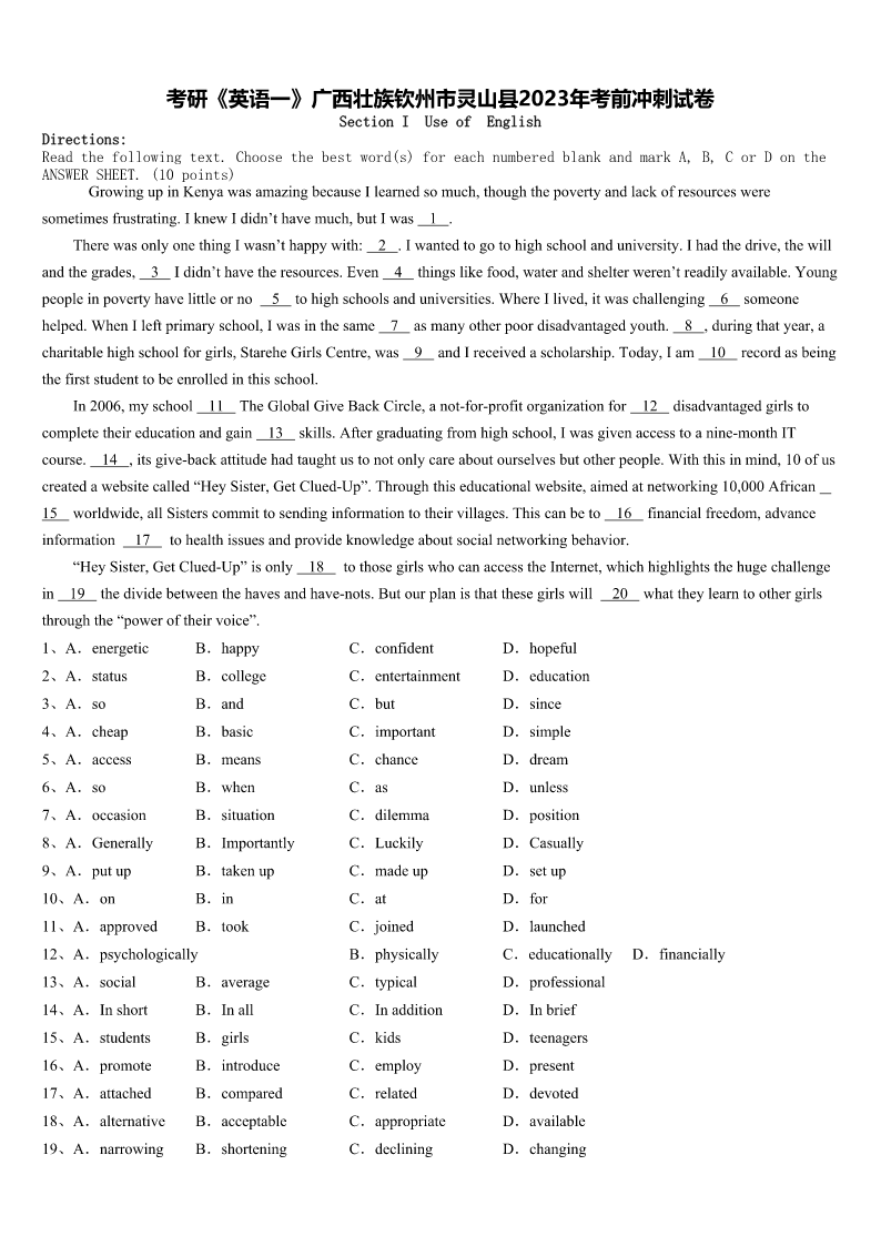 考研《英语一》广西壮族钦州市灵山县2023年考前冲刺试卷 SectionIUseofEnglish Directions: Readthefollowingtext.Choosethebestword(s)foreachnumberedblankandmarkA,B,CorDonthe ANSWERSHEET.(10points) GrowingupinKenyawasamazingbecauseIlearnedsomuch,thoughthepovertyandlackofresourceswere sometimesfrustrating.IknewIdidn’thavemuch,butIwas1. TherewasonlyonethingIwasn’thappywith:2.Iwantedtogotohighschoolanduniversity.Ihadthedrive,thewill andthegrades,3Ididn’thavetheresources.Even4thingslikefood,waterandshelterweren’treadilyavailable.Young peopleinpovertyhavelittleorno5tohighschoolsanduniversities.WhereIlived,itwaschallenging6someone helped.WhenIleftprimaryschool,Iwasinthesame7asmanyotherpoordisadvantagedyouth.8,duringthatyear,a charitablehighschoolforgirls,StareheGirlsCentre,was9andIreceivedascholarship.Today,Iam10recordasbeing thefirststudenttobeenrolledinthisschool. In2006,myschool11TheGlobalGiveBackCircle,anot-for-profitorganizationfor12disadvantagedgirlsto completetheireducationandgain13skills.Aftergraduatingfromhighschool,Iwasgivenaccesstoanine-monthIT course.14,itsgive-backattitudehadtaughtustonotonlycareaboutourselvesbutotherpeople.Withthisinmind,10ofus createdawebsitecalled“HeySister,GetClued-Up”.Throughthiseducationalwebsite,aimedatnetworking10,000African 15worldwide,allSisterscommittosendinginformationtotheirvillages.Thiscanbeto16financialfreedom,advance information17tohealthissuesandprovideknowledgeaboutsocialnetworkingbehavior. “HeySister,GetClued-Up”isonly18tothosegirlswhocanaccesstheInternet,whichhighlightsthehugechallenge in19thedividebetweenthehavesandhave-nots.Butourplanisthatthesegirlswill20whattheylearntoothergirls throughthe“poweroftheirvoice”. 1、A.energeticB.happyC.confidentD.hopeful 2、A.statusB.collegeC.entertainmentD.education 3、A.soB.andC.butD.since 4、A.cheapB.basicC.importantD.simple 5、A.accessB.meansC.chanceD.dream 6、A.soB.whenC.asD.unless 7、A.occasionB.situationC.dilemmaD.position 8、A.GenerallyB.ImportantlyC.LuckilyD.Casually 9、A.putupB.takenupC.madeupD.setup 10、A.onB.inC.atD.f