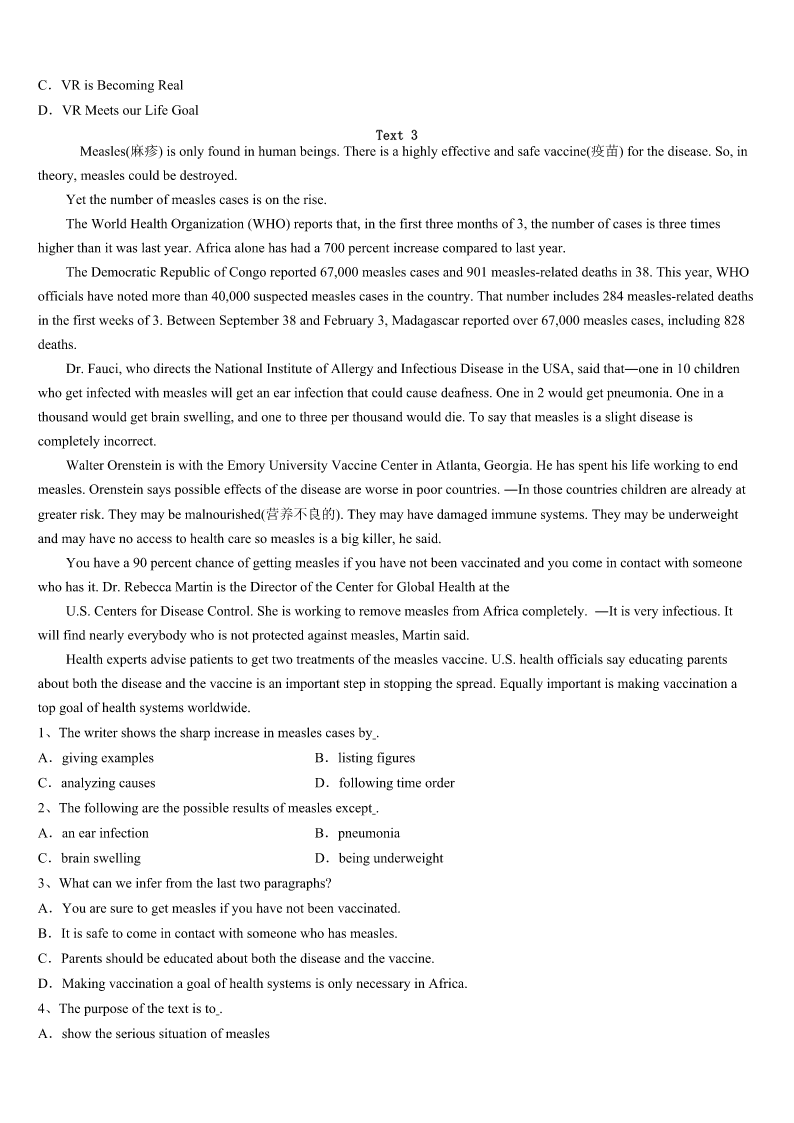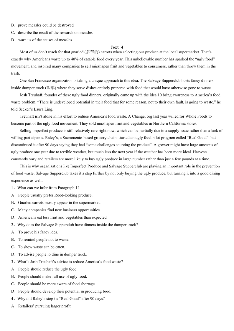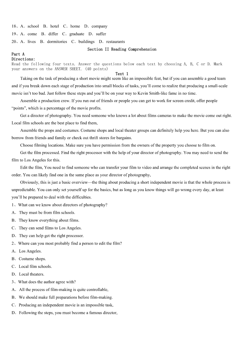 考研《英语一》德钦县2023年高分冲刺试卷 SectionIUseofEnglish Directions: Readthefollowingtext.Choosethebestword(s)foreachnumberedblankandmarkA,B,CorDonthe ANSWERSHEET.(10points) WhatdoChinesecollegegraduateshaveincommonwithants?Therecent1AntTribesaboutthelifeofsomeyoungpeople 2flock(群集)toBeijingafter3university,describesthegraduates,likeants,assmartbut4as individuals,drawingstrengthfromlivingtogetherincommunities. Thebook,whichisbased5twoyearsofinterviewswithabout600low-incomecollegegraduatesinBeijing,6,about amonthaheadofanannouncementbytheMinistryofHumanResourcesandSocialSecuritythat74%ofthe6.11millionnew graduatesfromuniversitiesandcollegeshadbeen7bySept.1. Thebook’schiefeditor,LianSir,tellsthatpieceofstatisticsays8abouttherealsituationformanyofthesegraduates.“I amalways9howmanyoftheseemployedcollegegraduatesareleadingahappylife,”Liansaid.“Ihopethisbookcould offerawindowonthesegraduates,whosestoriesare10known.” Thesettingofthebookisseveralso-called“settlementvillagesforcollegestudents”intheoutskirts(市郊)of Beijing,wherealarge11ofcollegegraduates12.Mostofthesegraduatesworkfor13ormedium-sized businesses,14lessthan2,000Yuanamonth.Theylivetogetherbecauseit’s15Therentinthesecommunitiesisonly around350Yuanamonth.Manyofthemtravelseveralhoursadayforshort-termjobsorjobinterviews. Tangjialing,asmall1620kilometersfromTian’anmenSquare,hasaround3,00017villagers,buthasbecomea18 formorethan50,000migrants(移民),mostofwhom19fromuniversitiesorcollegesalloverthecountry.Lian describesthestudents’20asfiveorsix-storeybuildingsbuiltbylocalfarmerswith12roomsoneachfloorandtwoorthree peoplecrammed(挤)togetherineachroomofabout10squaremeters.Upto70or80peoplesharethesametoiletand kitchen. 1、A.filmB.storyC.bookD.magazine 2、A.whoB.whatC.whichD.whose 3、A.leavingB.enteringC.visitingD.enjoying 4、A.necessaryB.meaninglessC.importantD.strong 5、A.inB.onC.atD.for 6、A.cameupB.cameonC.camealongD.cameout 7、A.firedB.interviewedC.employedD.trained 8、A.muchB.littleC.someD.more 9、A.wonderingB.researchingC.studyingD.telling 10、A.s