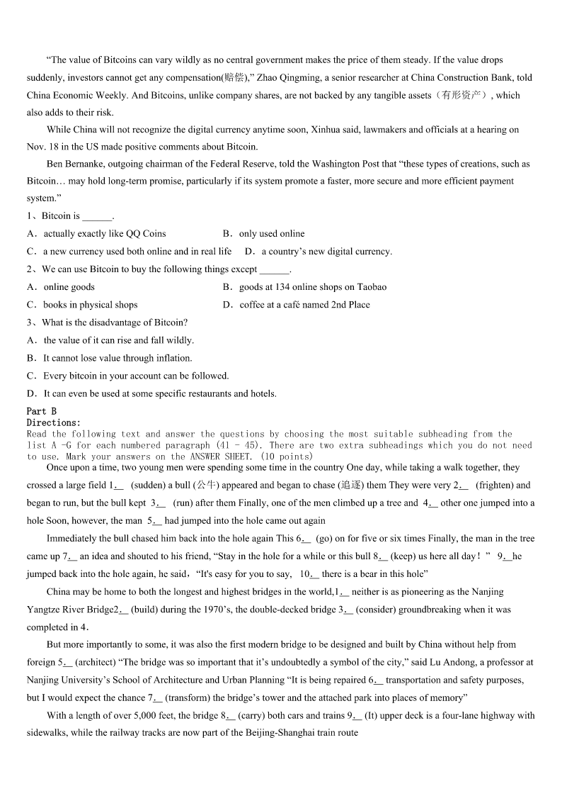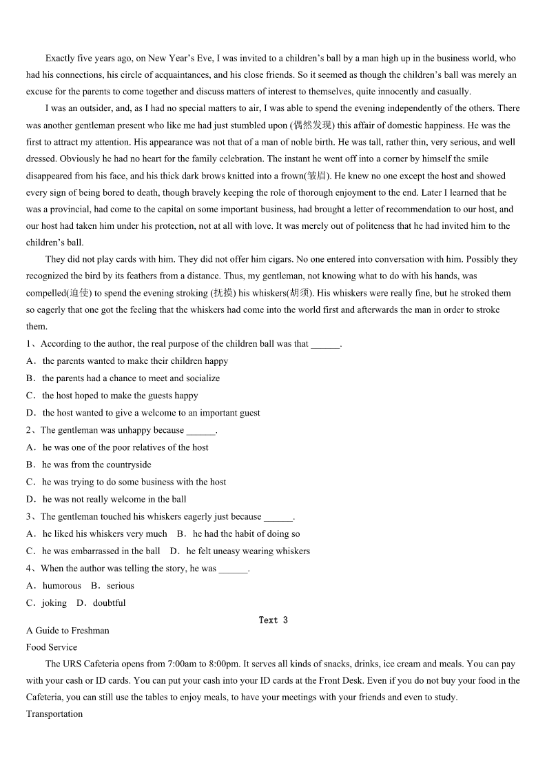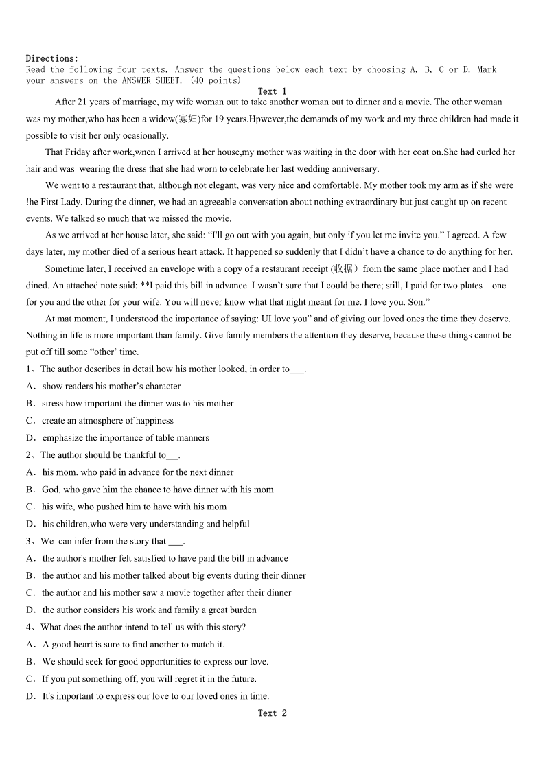考研《英语一》望江县2023年巅峰冲刺试卷 SectionIUseofEnglish Directions: Readthefollowingtext.Choosethebestword(s)foreachnumberedblankandmarkA,B,CorDonthe ANSWERSHEET.(10points) Thismorning,Isetoffverylateinmycartooffice,Iwasina1toreachmyofficeasmyclientswerewaitingforme there.Unfortunately,Igot2inatrafficjam.Allthevehiclesstoodupinalongline,anddriverswere3 blowinghornstogetridoftheir4.Igotdownfrommycarandmovedforwardinsearchofthe5ofthetrafficjam.Ata turningayoungmanwasstrugglinghardtomoveforwardhiscar,whichmight6. Everyonetherewasjust7themanwithoutcomingtooffer8tohim.Meanwhile,theywere9themanforthe trafficjam.Thenumberofvehicleswasgraduallyincreasing.Themanlooked10aseveryoneputhimtothescorn(奚落) forcreatingthispublic11Nobodywasinthemoodof12themanforhiserror. Seeingthis,I13rushedtohelptheman,followedbyotherdrivers.We14topushthecar.Verysoonitstartedwith aloudsound.Themansmiledin15themomenthiscarworkedagain.Thenhethankedusand16toeveryonethereand movedoff. AfterthatIwentintodeepthinkingoverthehuman17inthetimesofcrisis.Everyhumanonthisearthunavoidably makeserrors.Whenotherpeopledothatweblame,butwhenweareinthesamecondition,wedesiretogain18.Inthe timesofcrisisweshouldtryto19themtogetherinsteadofblamingothers.Forgivingisa20choice,asitnotonly avoidsconflictsfurther,butalsospreadsuniversallove. 1、A.fashionB.hurryC.messD.way 2、A.injuredB.stuckC.lostD.removed. 3、A.properlyB.awkwardlyC.consideratelyD.constantly 4、A.worryB.concernC.angerD.sadness 5、A.causeB.evidenceC.influenceD.effect 6、A.setoffB.turnoffC.breakdownD.pullup 7、A.watchingB.directingC.comfortingD.checking 8、A.admissionB.opportunitiesC.trustD.assistance 9、A.observingB.blamingC.inspectingD.punishing 10、A.frustratedB.impatientC.frightenedD.embarrassed 11、A.progressB.focusC.practiceD.inconvenience 12、A.forgivingB.criticizingC.annoyingD.encouraging 13、A.eventuallyB.steadilyC.purposelyD.immediately 14、A.pretendedB.cooperatedC.hesitatedD.promised 15、A.vainB.secretC.reliefD.privacy 16、A.apologizedB.shoutedC.explainedD.complained 17、A.intellig