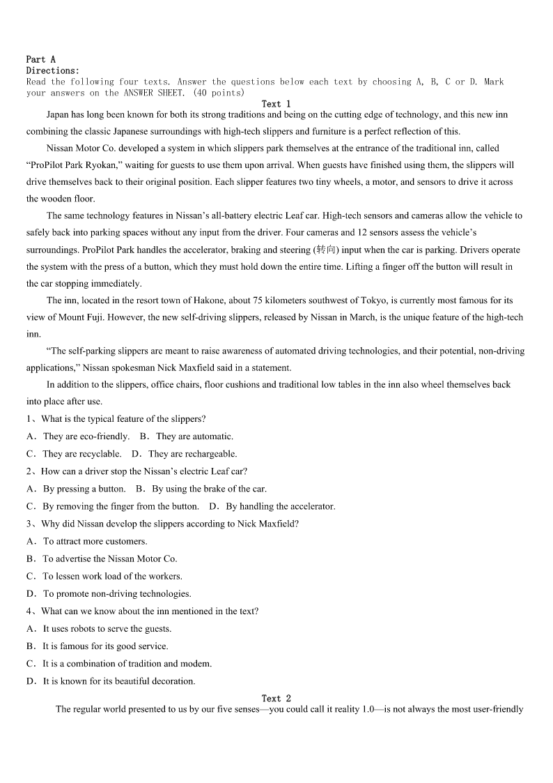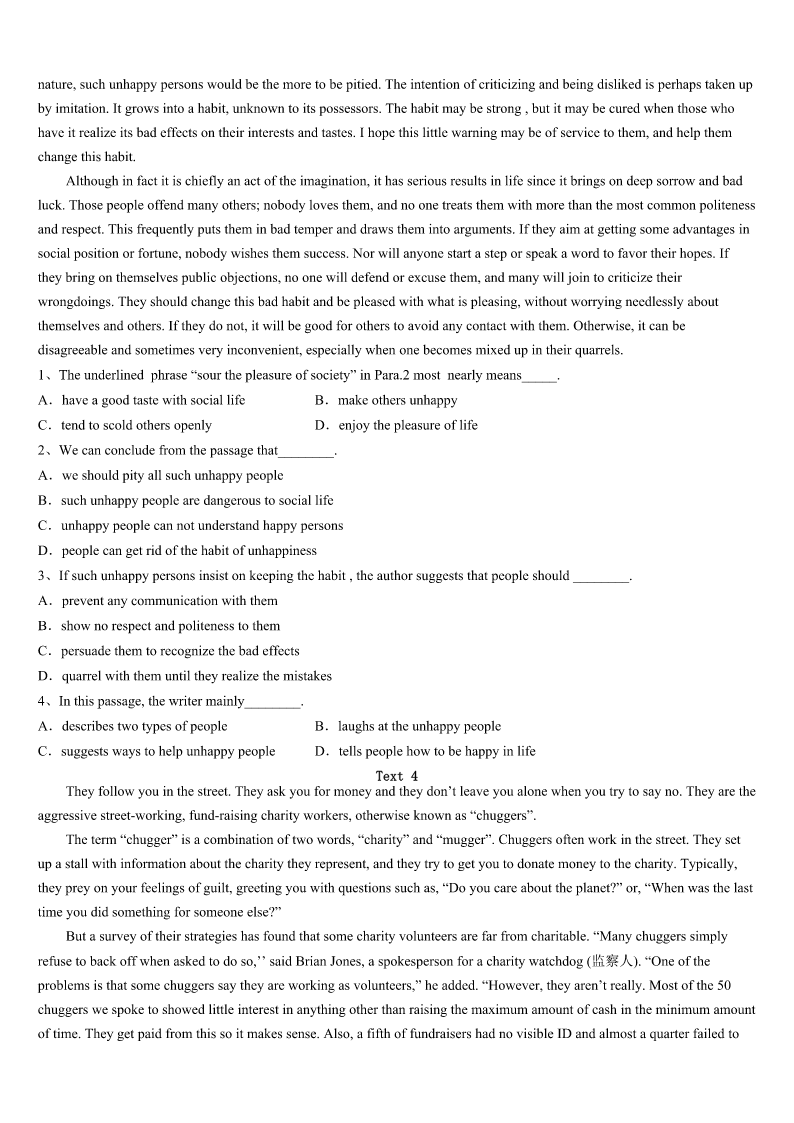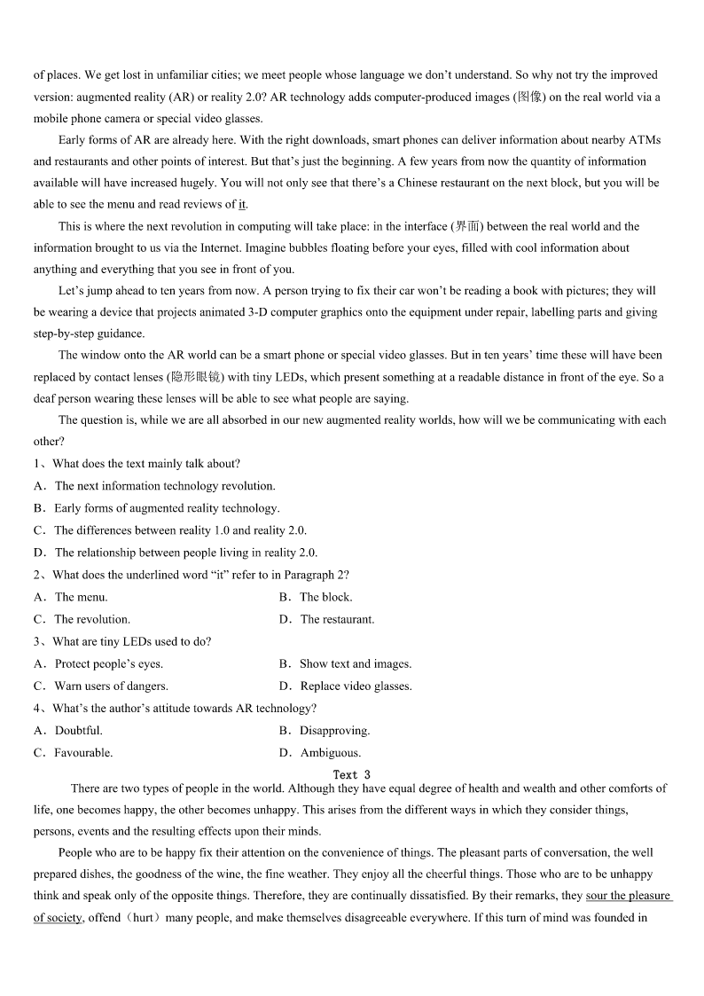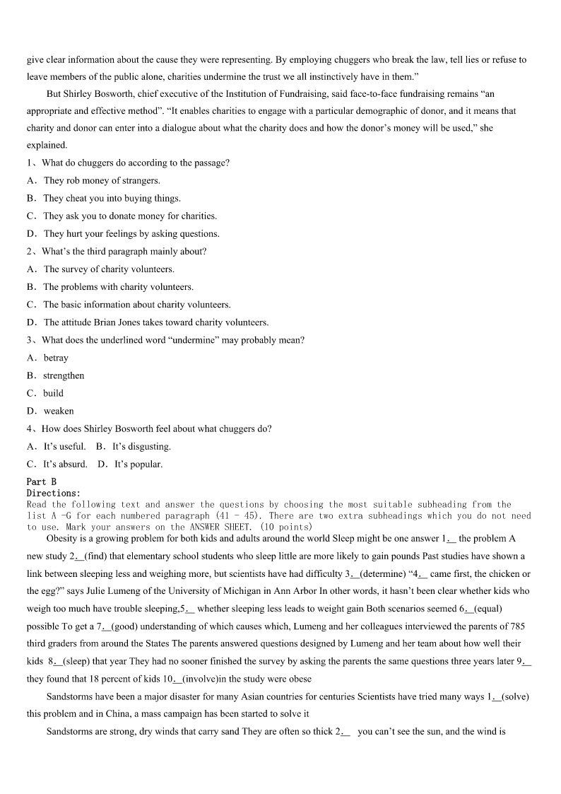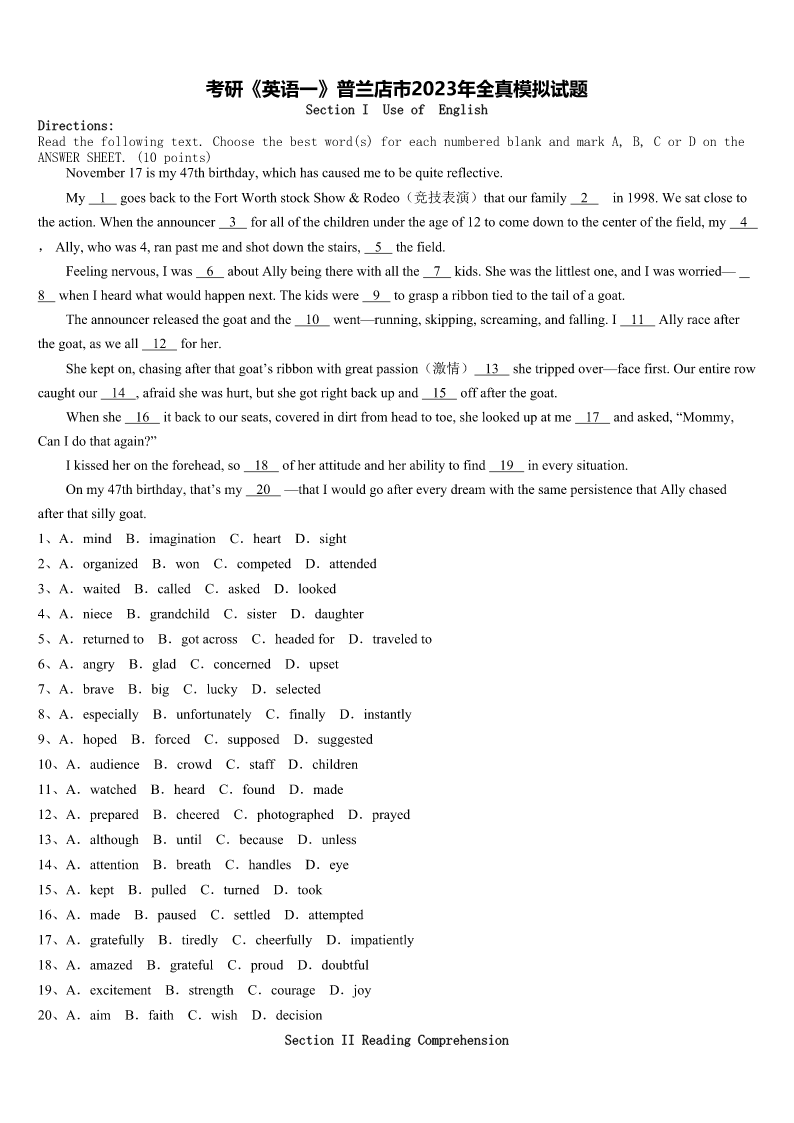 考研《英语一》普兰店市2023年全真模拟试题 SectionIUseofEnglish Directions: Readthefollowingtext.Choosethebestword(s)foreachnumberedblankandmarkA,B,CorDonthe ANSWERSHEET.(10points) November17ismy47thbirthday,whichhascausedmetobequitereflective. My1goesbacktotheFortWorthstockShow&Rodeo(竞技表演)thatourfamily2in1998.Wesatcloseto theaction.Whentheannouncer3forallofthechildrenundertheageof12tocomedowntothecenterofthefield,my4 ,Ally,whowas4,ranpastmeandshotdownthestairs,5thefield. Feelingnervous,Iwas6aboutAllybeingtherewithallthe7kids.Shewasthelittlestone,andIwasworried— 8whenIheardwhatwouldhappennext.Thekidswere9tograsparibbontiedtothetailofagoat. Theannouncerreleasedthegoatandthe10went—running,skipping,screaming,andfalling.I11Allyraceafter thegoat,asweall12forher. Shekepton,chasingafterthatgoat’sribbonwithgreatpassion(激情)13shetrippedover—facefirst.Ourentirerow caughtour14,afraidshewashurt,butshegotrightbackupand15offafterthegoat. Whenshe16itbacktoourseats,coveredindirtfromheadtotoe,shelookedupatme17andasked,“Mommy, CanIdothatagain?” Ikissedherontheforehead,so18ofherattitudeandherabilitytofind19ineverysituation. Onmy47thbirthday,that’smy20—thatIwouldgoaftereverydreamwiththesamepersistencethatAllychased afterthatsillygoat. 1、A.mindB.imaginationC.heartD.sight 2、A.organizedB.wonC.competedD.attended 3、A.waitedB.calledC.askedD.looked 4、A.nieceB.grandchildC.sisterD.daughter 5、A.returnedtoB.gotacrossC.headedforD.traveledto 6、A.angryB.gladC.concernedD.upset 7、A.braveB.bigC.luckyD.selected 8、A.especiallyB.unfortunatelyC.finallyD.instantly 9、A.hopedB.forcedC.supposedD.suggested 10、A.audienceB.crowdC.staffD.children 11、A.watchedB.heardC.foundD.made 12、A.preparedB.cheeredC.photographedD.prayed 13、A.althoughB.untilC.becauseD.unless 14、A.attentionB.breathC.handlesD.eye 15、A.keptB.pulledC.turnedD.took 16、A.madeB.pausedC.settledD.attempted 17、A.gratefullyB.tiredlyC.cheerfullyD.impatiently 18、A.amazedB.gratefulC.proudD.doubtful 19、A.excitementB.strengthC.courageD.joy 20、A.aimB.faithC.wishD.decision SectionIIRe