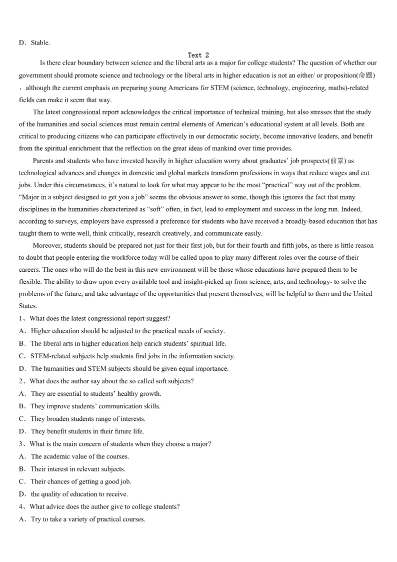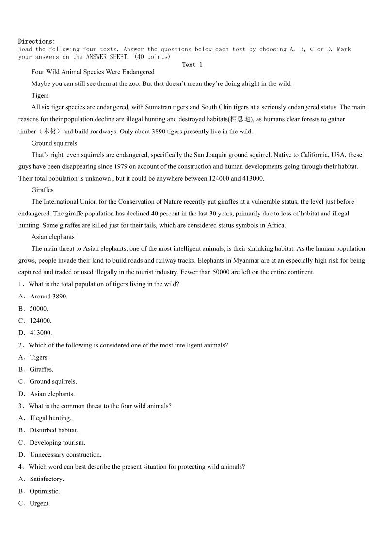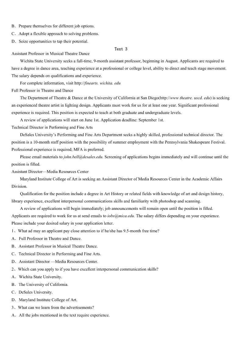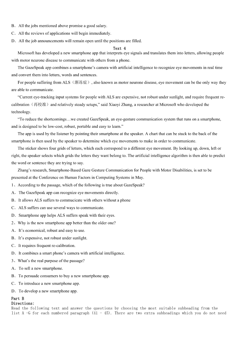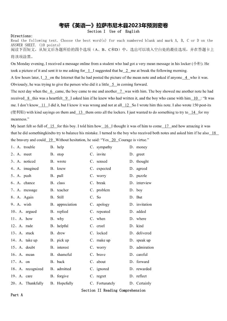 考研《英语一》拉萨市尼木县2023年预测密卷 SectionIUseofEnglish Directions: Readthefollowingtext.Choosethebestword(s)foreachnumberedblankandmarkA,B,CorDonthe ANSWERSHEET.(10points) 阅读下面短文,从短文后各题所给的四个选项(A、B、C和D)中,选出可以填入空白处的最佳选项,并在答题卡上 将该项涂黑。 OnMondayevening,Ireceivedamessageonlinefromastudentwhohadgotaverymeanmessageinhislocker(小柜).He tookapictureofitandsentittomeaskingfor1Isuggestedthathe2meatbreakthefollowingmorning. Afewhourslater,I3ontheInternetthathehadpostedthepictureofthemeannoteandaskedifanyone4whoitwas. Obviously,hewastryingtogivethepersonwhodiditalittle5incomingforward. Thenextdaywhenthe6came,theboycametomeandanother7waswithhim.Theboyshowedmeanothernotehehad received8thiswasaheartfelt9Iaskedhimifheknewwhohadwrittenit,andtheboywhocamewithhim10:“Itwas me.Idon’tknow11Ididit,butIknowitwaswrongandnotatall12SoIwrotehimthisnote.Ialsowrote150post-its (便利贴)withkindsayingsonthemand13themontoallthelockers.Ijustwantedtodosomethingtotryto14formy meanness.” Myheartfeltsofullof15forthisboy.Itoldhimhow16Ithoughtitwasofhimtocome17andhowamazingitwas thathedidsomethingkindtotrytobalancehismistake.Iturnedtotheboywhoreceivedbothnotesandaskedhimifhealso18 thebraveryandcould19Withouthesitation,hesaid:“Yes20Courageisvirtue.” 1、A.troubleB.helpC.sympathyD.money 2、A.meetB.stopC.inviteD.greet 3、A.noticedB.wroteC.sensedD.thought 4、A.imaginedB.knewC.expectedD.agreed 5、A.pushB.pullC.worryD.puzzle 6、A.chanceB.classC.breakD.interview 7、A.messageB.teacherC.problemD.boy 8、A.AgainB.StillC.SoD.But 9、A.wishB.appreciationC.apologyD.invitation 10、A.arguedB.repliedC.repeatedD.added 11、A.howB.whyC.whenD.where 12、A.rudeB.helpfulC.cruelD.kind 13、A.stuckB.drewC.lockedD.delivered 14、A.takeupB.pickupC.makeupD.speakup 15、A.doubtB.interestC.worryD.admiration 16、A.meanB.shamefulC.braveD.careful 17、A.onB.backC.aboutD.forward 18、A.recognizedB.admittedC.ignoredD.rewarded 19、A.careB.forgiveC.regretD.reflect 20、A.ThankfullyB.HopefullyC.FortunatelyD.Certainly SectionIIReadingComprehension PartA Directions: Readthefollowingfourtext
