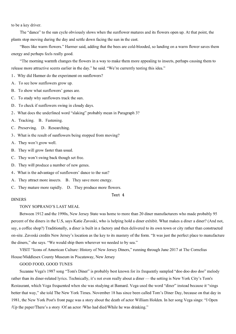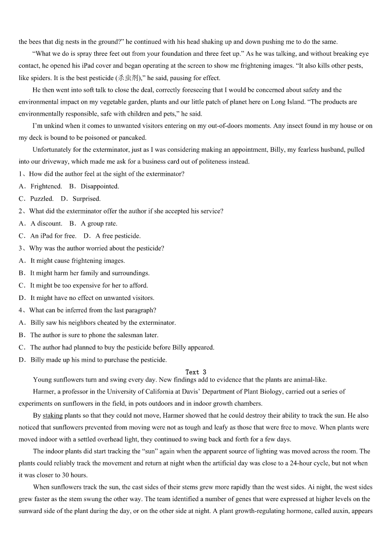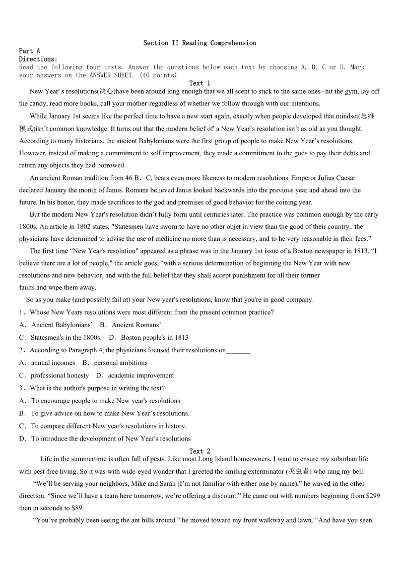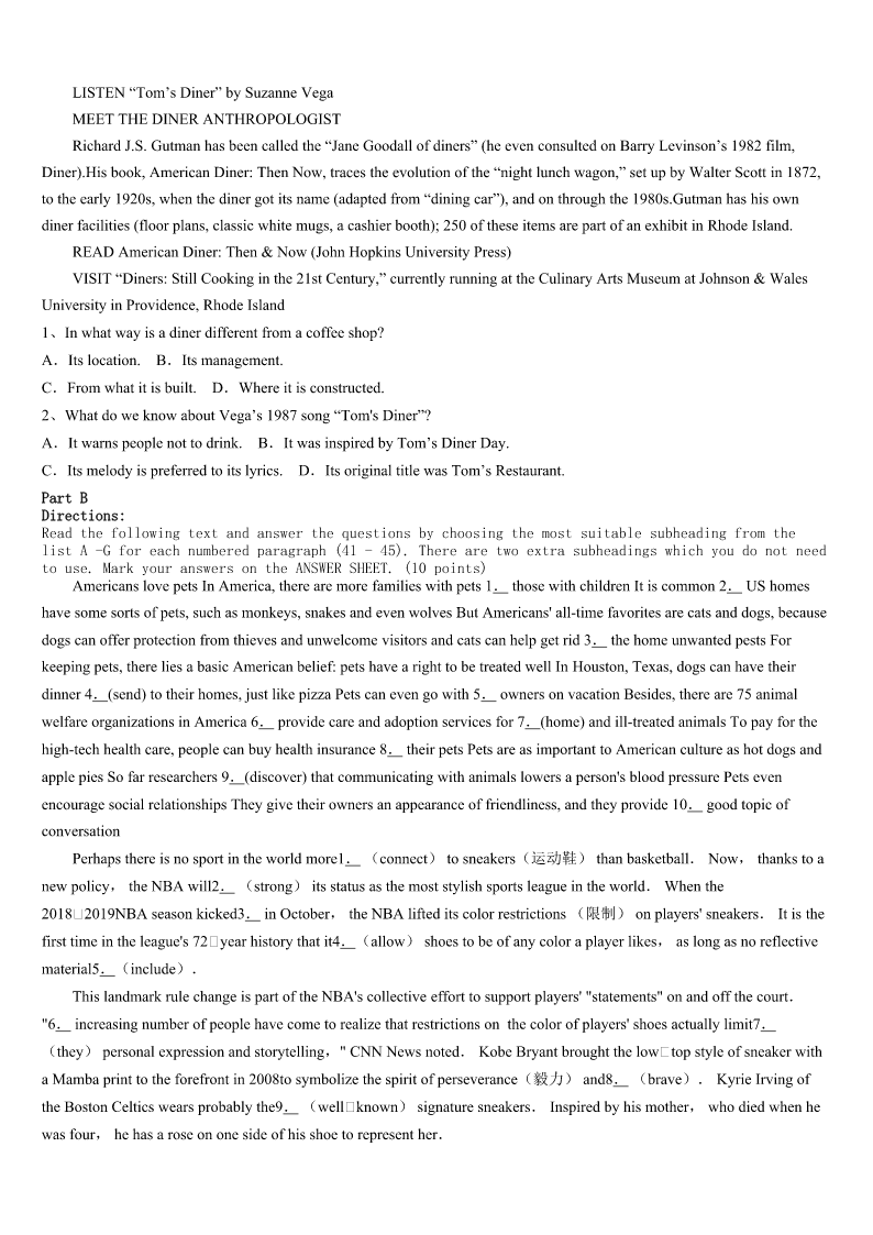考研《英语一》昌都地区贡觉县2023年考前冲刺试卷 SectionIUseofEnglish Directions: Readthefollowingtext.Choosethebestword(s)foreachnumberedblankandmarkA,B,CorDonthe ANSWERSHEET.(10points) 阅读下列短文,从短文后各题所给的四个选项中(A、B、C和D),选出可以填入空白处的最佳选项,并在答题卡上将 该项涂黑。 Ahomelessmanwalkeduptomeandaskedmeforsomesmallchange,“I’llgiveyouaquarterifyoutellmeyourstory,”I said.Helaughed,“You’llgivemeaquarterformystory?’Ilaidthe1infrontofhimand2myself—“No,here’sthe quarterbutitwouldbenicetohearyourstory.”Seeinghimlostin3,Isatdownnexttohimand4 “Iwasonceasniper(狙击兵)inthearmy.”hesaid.“Iwas5toshootdowntheenemyfromthedistance.”Ilistened attentively.Hetoldmehowhe6tohuntwithhisfamily.Hehadhisownwayof7animalsbynotkillingmorethanbe needed.Whenthe8cameknockingonhisdoor,hefelt9andjoinedup.Allthoseyearsofdevelopinghishuntingskills couldnowservealarger10—todefendusfromthebadguys.Hesetoutto11atthefront. “IwasasniperbutIneverreallykilledanyone.”hecontinued.“Onedaytheyaskedmeto12aladyfromthedistance.Isaw thekidsneherandmyhandswereonthetrigger(扳机).ButIcouldn’t13it.Shewasn’tdoinganythingtoanandshewas 14thekids. Thestorywentonashedescribed15beingputintoprisonfor180daysfor16tofolloworders.“Ihaveno17,”he said.“Imaybehomelessnow,18Ineverkilledthatlady.”Hecontinued,“Ican19beinghomeless,butIwouldn’tbe abletostandkillinginnocentpeople.” Imetahero.Itjustnever20tomethataherocouldbeasmellyoldsniper. 1、A.noteB.coinC.dollarD.wallet 2、A.blamedB.remindedC.correctedD.added 3、A.argumentB.actionC.considerationD.thought 4、A.whisperedB.noddedC.sighedD.waited 5、A.demandedB.supposedC.remindedD.determined 6、A.desiredB.wishedC.failedD.used 7、A.trackingB.raisingC.trainingD.respecting 8、A.armyB.ministerC.commanderD.company 9、A.annoyedB.proudC.astonishedD.confused 10、A.groupB.businessC.purposeD.result 11、A.serveB.huntC.aimD.survive 12、A.murderB.fightC.shootD.arrest 13、A.remainB.fireC.makeD.decide 14、A.besidesB.alongC.insideD.among 15、A.graduallyB.eventuallyC.deliberatelyD.desperately 16、A.managingB.failingC.hesitatingD.forgetting 17、A.ideasB.attemptsC.regretsD.fe
