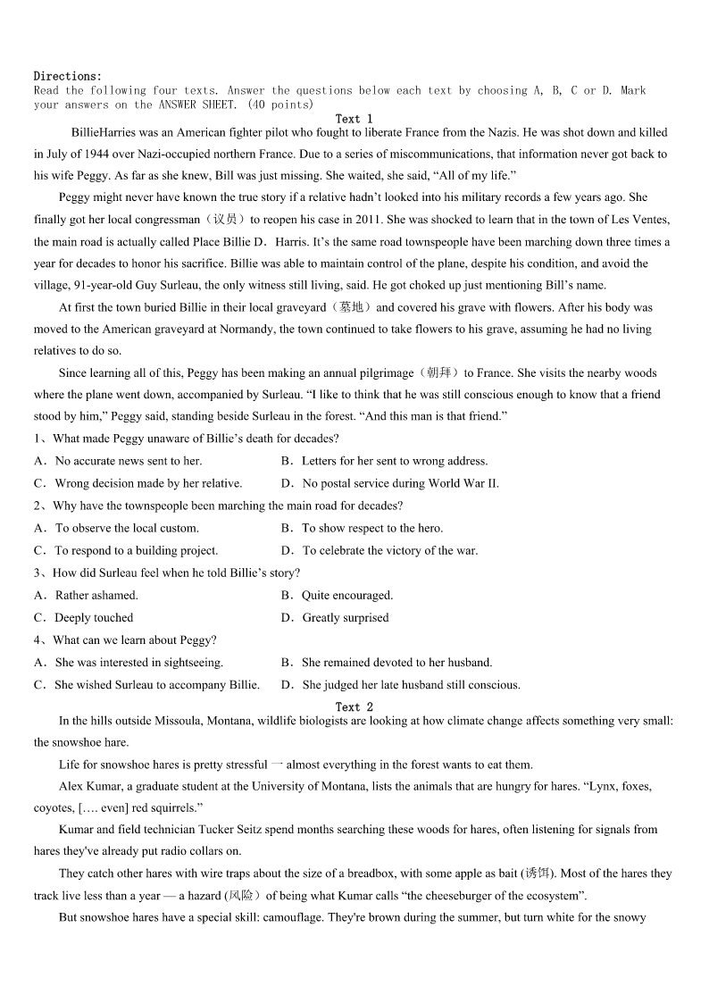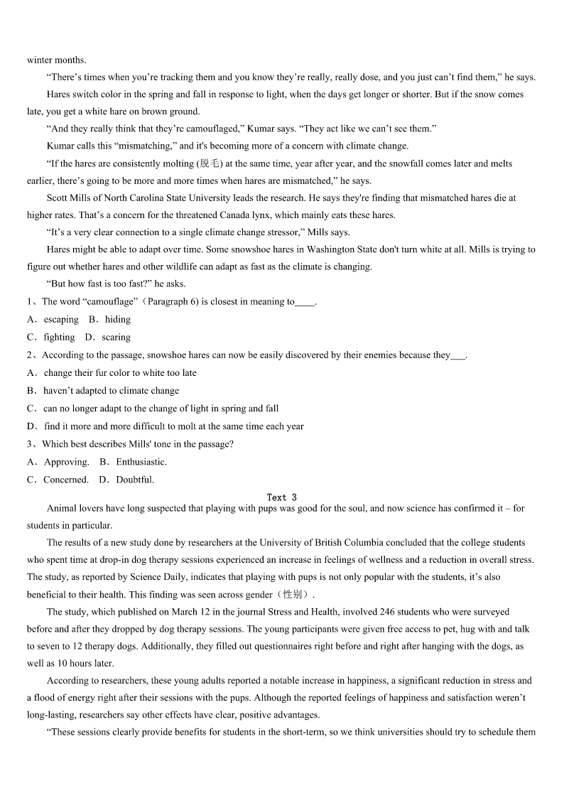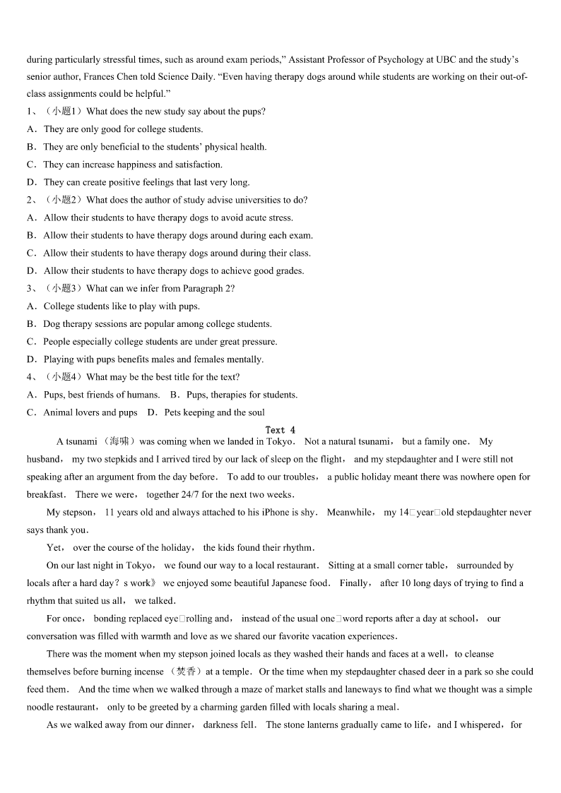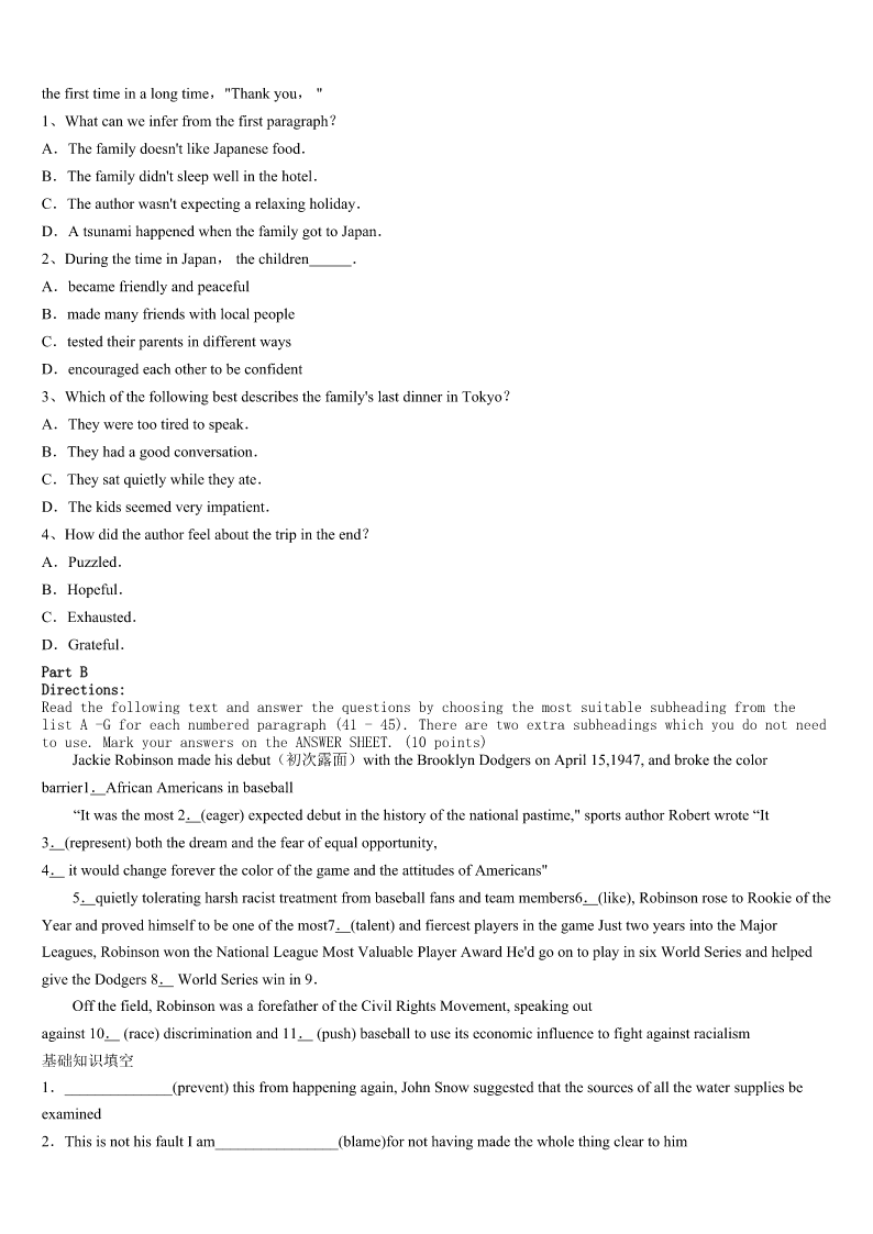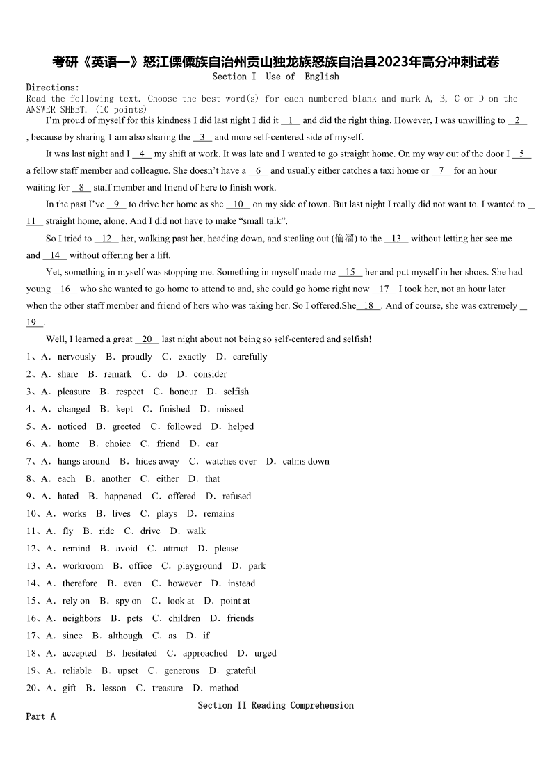 考研《英语一》怒江傈僳族自治州贡山独龙族怒族自治县2023年高分冲刺试卷 SectionIUseofEnglish Directions: Readthefollowingtext.Choosethebestword(s)foreachnumberedblankandmarkA,B,CorDonthe ANSWERSHEET.(10points) I’mproudofmyselfforthiskindnessIdidlastnightIdidit1anddidtherightthing.However,Iwasunwillingto2 ,becausebysharing1amalsosharingthe3andmoreself-centeredsideofmyself. ItwaslastnightandI4myshiftatwork.ItwaslateandIwantedtogostraighthome.OnmywayoutofthedoorI5 afellowstaffmemberandcolleague.Shedoesn’thavea6andusuallyeithercatchesataxihomeor7foranhour waitingfor8staffmemberandfriendofheretofinishwork. InthepastI’ve9todriveherhomeasshe10onmysideoftown.ButlastnightIreallydidnotwantto.Iwantedto 11straighthome,alone.AndIdidnothavetomake“smalltalk”. SoItriedto12her,walkingpasther,headingdown,andstealingout(偷溜)tothe13withoutlettingherseeme and14withoutofferingheralift. Yet,somethinginmyselfwasstoppingme.Somethinginmyselfmademe15herandputmyselfinhershoes.Shehad young16whoshewantedtogohometoattendtoand,shecouldgohomerightnow17Itookher,notanhourlater whentheotherstaffmemberandfriendofherswhowastakingher.SoIoffered.She18.Andofcourse,shewasextremely 19. Well,Ilearnedagreat20lastnightaboutnotbeingsoself-centeredandselfish! 1、A.nervouslyB.proudlyC.exactlyD.carefully 2、A.shareB.remarkC.doD.consider 3、A.pleasureB.respectC.honourD.selfish 4、A.changedB.keptC.finishedD.missed 5、A.noticedB.greetedC.followedD.helped 6、A.homeB.choiceC.friendD.car 7、A.hangsaroundB.hidesawayC.watchesoverD.calmsdown 8、A.eachB.anotherC.eitherD.that 9、A.hatedB.happenedC.offeredD.refused 10、A.worksB.livesC.playsD.remains 11、A.flyB.rideC.driveD.walk 12、A.remindB.avoidC.attractD.please 13、A.workroomB.officeC.playgroundD.park 14、A.thereforeB.evenC.howeverD.instead 15、A.relyonB.spyonC.lookatD.pointat 16、A.neighborsB.petsC.childrenD.friends 17、A.sinceB.althoughC.asD.if 18、A.acceptedB.hesitatedC.approachedD.urged 19、A.reliableB.upsetC.generousD.grateful 20、A.giftB.lessonC.treasureD.method SectionIIReadingComprehension PartA Directions: Readthefollo