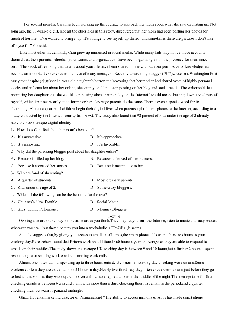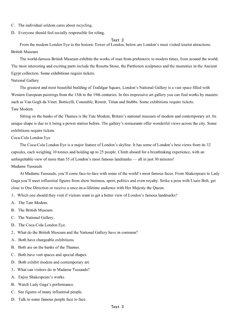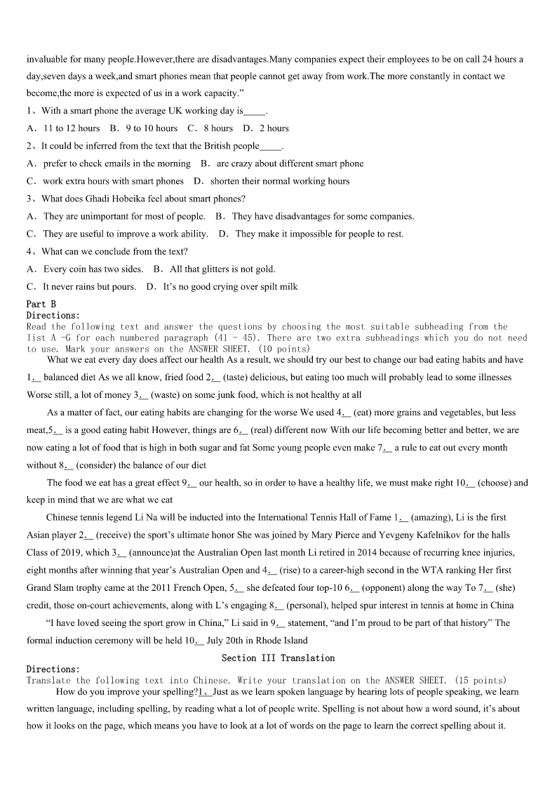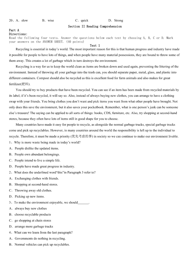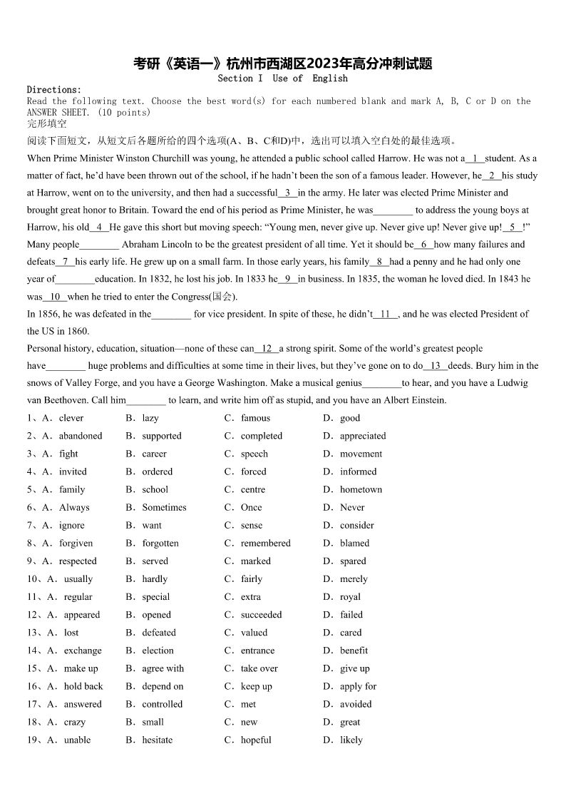考研《英语一》杭州市西湖区2023年高分冲刺试题 SectionIUseofEnglish Directions: Readthefollowingtext.Choosethebestword(s)foreachnumberedblankandmarkA,B,CorDonthe ANSWERSHEET.(10points) 完形填空 阅读下面短文,从短文后各题所给的四个选项(A、B、C和D)中,选出可以填入空白处的最佳选项。 WhenPrimeMinisterWinstonChurchillwasyoung,heattendedapublicschoolcalledHarrow.Hewasnota1student.Asa matteroffact,he’dhavebeenthrownoutoftheschool,ifhehadn’tbeenthesonofafamousleader.However,he2hisstudy atHarrow,wentontotheuniversity,andthenhadasuccessful3inthearmy.HelaterwaselectedPrimeMinisterand broughtgreathonortoBritain.TowardtheendofhisperiodasPrimeMinister,hewas________toaddresstheyoungboysat Harrow,hisold4Hegavethisshortbutmovingspeech:“Youngmen,nevergiveup.Nevergiveup!Nevergiveup!5!” Manypeople________AbrahamLincolntobethegreatestpresidentofalltime.Yetitshouldbe6howmanyfailuresand defeats7hisearlylife.Hegrewuponasmallfarm.Inthoseearlyyears,hisfamily8hadapennyandhehadonlyone yearof________education.In1832,helosthisjob.In1833he9inbusiness.In1835,thewomanheloveddied.In1843he was10whenhetriedtoentertheCongress(国会). In1856,hewasdefeatedinthe________forvicepresident.Inspiteofthese,hedidn’t11,andhewaselectedPresidentof theUSin1860. Personalhistory,education,situation—noneofthesecan12astrongspirit.Someoftheworld’sgreatestpeople have________hugeproblemsanddifficultiesatsometimeintheirlives,butthey’vegoneontodo13deeds.Buryhiminthe snowsofValleyForge,andyouhaveaGeorgeWashington.Makeamusicalgenius________tohear,andyouhaveaLudwig vanBeethoven.Callhim________tolearn,andwritehimoffasstupid,andyouhaveanAlbertEinstein. 1、A.cleverB.lazyC.famousD.good 2、A.abandonedB.supportedC.completedD.appreciated 3、A.fightB.careerC.speechD.movement 4、A.invitedB.orderedC.forcedD.informed 5、A.familyB.schoolC.centreD.hometown 6、A.AlwaysB.SometimesC.OnceD.Never 7、A.ignoreB.wantC.senseD.consider 8、A.forgivenB.forgottenC.rememberedD.blamed 9、A.respectedB.servedC.markedD.spared 10、A.usuallyB.hardlyC.fairlyD.merely 11、A.regularB.specialC.extraD.royal 12、A.appearedB.openedC.succeededD.fai