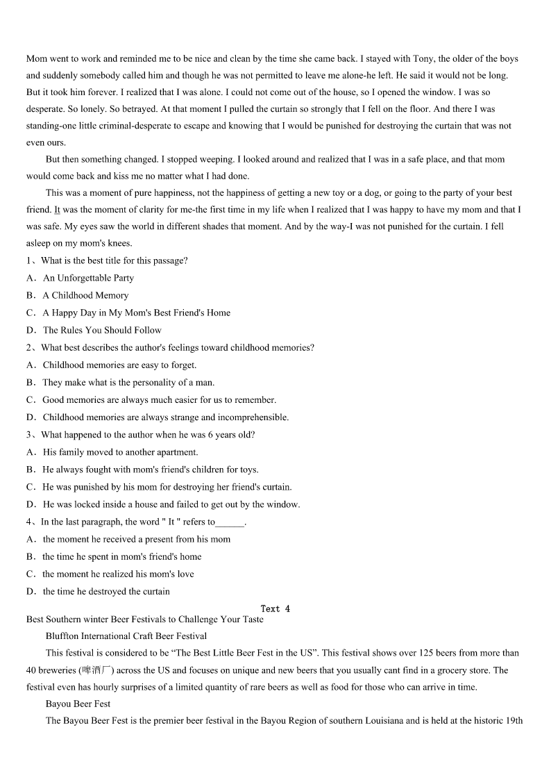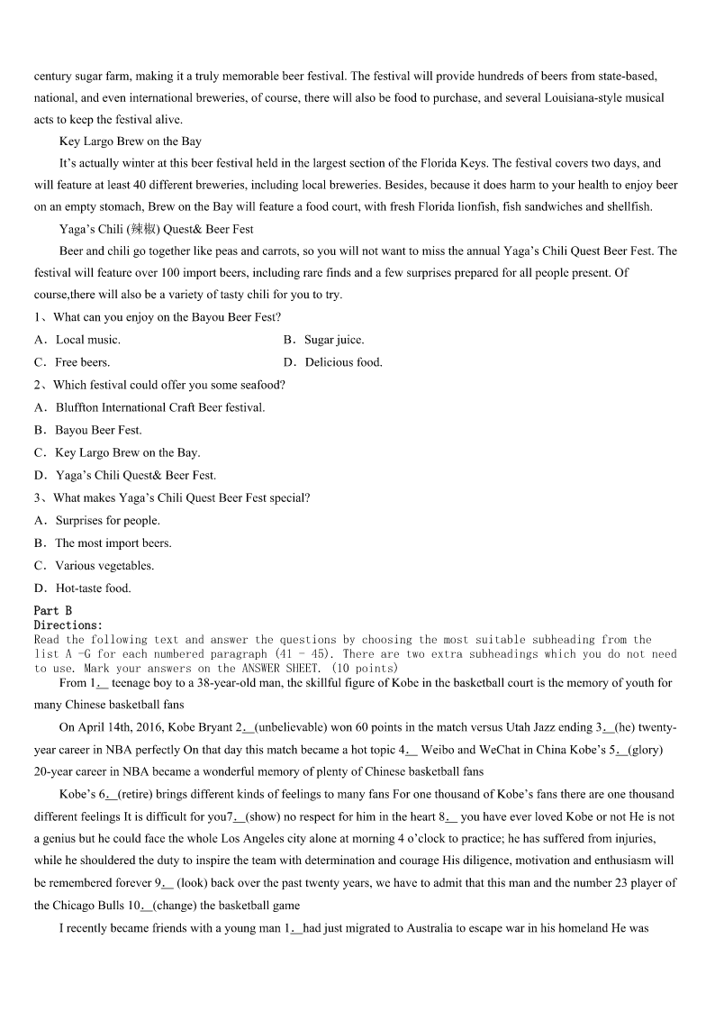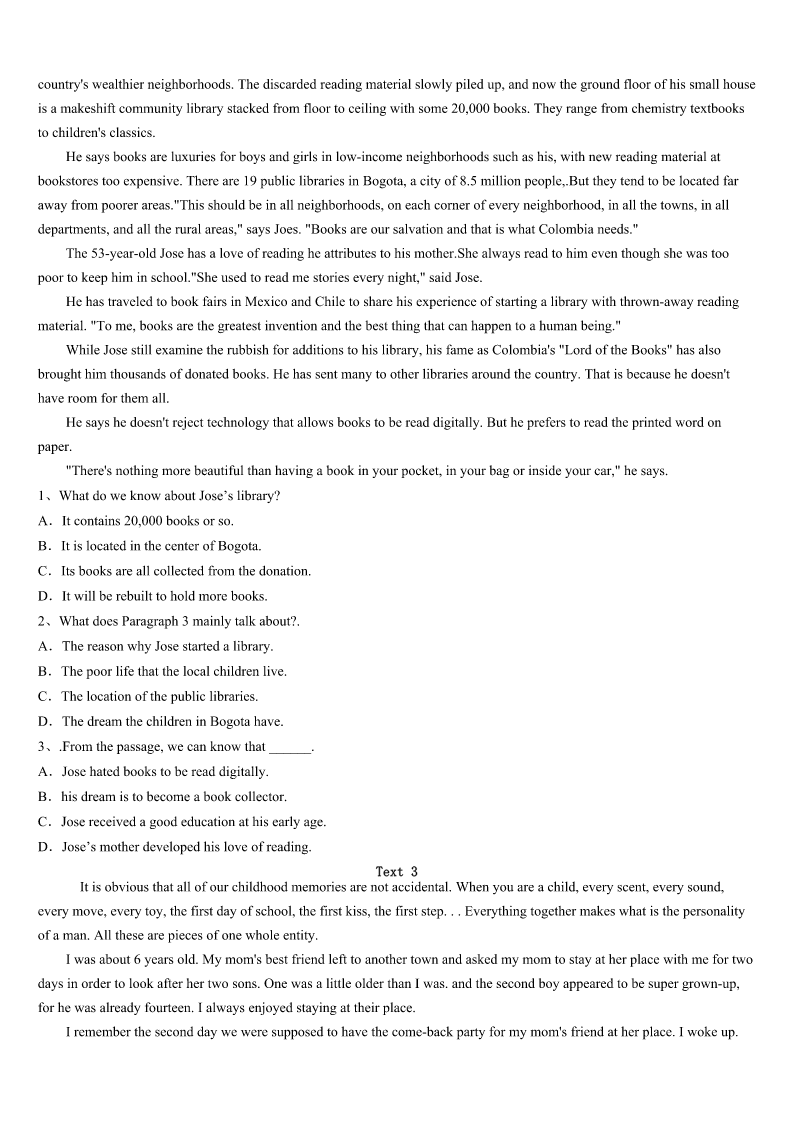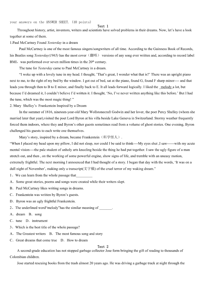 考研《英语一》承德市兴隆县2023年最后冲刺试题 SectionIUseofEnglish Directions: Readthefollowingtext.Choosethebestword(s)foreachnumberedblankandmarkA,B,CorDonthe ANSWERSHEET.(10points) Weeksago,Iwastravellingbytrain.Thetrainstoppedatastation.Thedeliverymanfromthecafeteria1todeliverthe pre-bookedhotmealsanddrinks.Justbehindhimrushedina9-year-oldgirl,whoputoutherhand,2forsomefood.Thefood supplierwas3andpushedheroutofthecoach.Somethinginmemademe4.Istepped5andsawthegirlstill standingthereandcrying.Iaskedherifshewas6andshenodded.SoIdecidedtobuyherfood. WhenItookhertothecoachwiththecafeteria,thepeoplestandingtherehada(n)7expressionontheirfaces.8 theirreaction,Iaskedherto9whatevershewanted.AsIpointedtoeachitem,shekept10. Finally,wecollectedsomuchfood.WhenI11tothecashiertopaythebill,thelittlegirlstartedhurryingdownthe12 .Thecashiershookhishead13andsaidthegirlmusthave14meintobelievinghermisery. AsIreturnedtomycoach,thecashier’s15mademedoubtwhetherthegirlhadreallyfooledme.SoIwentdownthe train,followingthe16thelittlegirlhadtaken.Finally,Iwalkedtoarelatively-desertedcoach.HereIsawa17whichleft medeepinthought.Thislittlegirlwassittinginacirclewithtwootherpooryoungboys.Shehadputallthe18inthecenter andwasputtingsomeintothehandofaboywhowas19blind.Thelittlegirltaughtmethatonecanbe20evenin poverty. 1、A.camearoundB.tookturnsC.turnedoutD.lookedup 2、A.lookingB.beggingC.caringD.waiting 3、A.annoyedB.excitedC.disappointedD.frightened 4、A.wakeB.understandC.believeD.react 5、A.insideB.upstairsC.outsideD.downward 6、A.thirstyB.hurtC.wrongD.hungry 7、A.satisfiedB.worriedC.puzzledD.relaxed 8、A.NoticingB.EnjoyingC.IgnoringD.Showing 9、A.chooseB.eatC.enjoyD.send 10、A.refusingB.noddingC.complainingD.praising 11、A.pointedB.referredC.listenedD.turned 12、A.counterB.cafeteriaC.trainD.road 13、A.indisbeliefB.intimeC.insurpriseD.inhorror 14、A.persuadedB.fooledC.forcedD.changed 15、A.answersB.dreamsC.decisionsD.words 16、A.adviceB.directionC.exampleD.trend 17、A.stationB.houseC.shelterD.sight 18、A.moneyB.wasteC.foodD.drinks 19、A.obvio