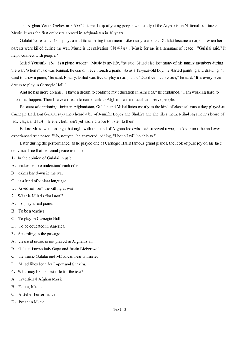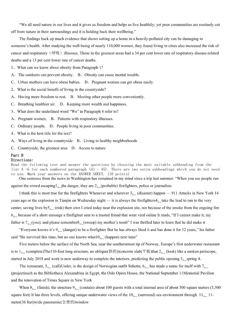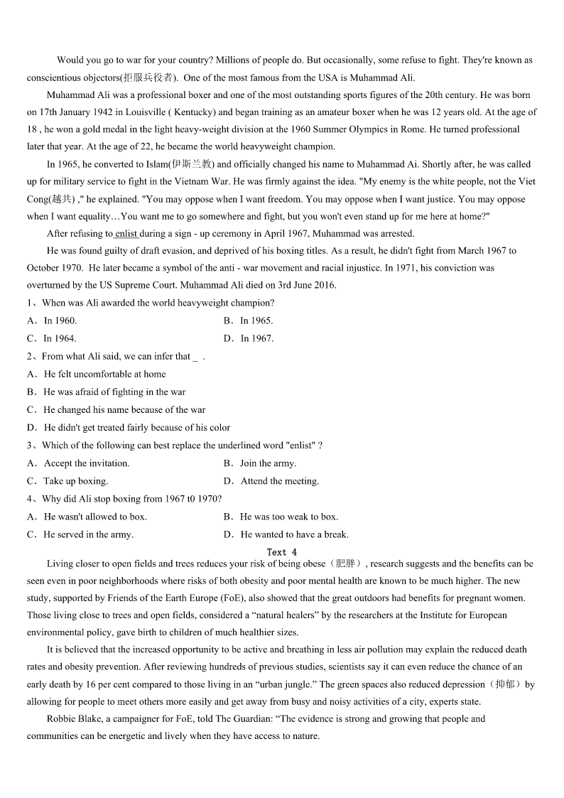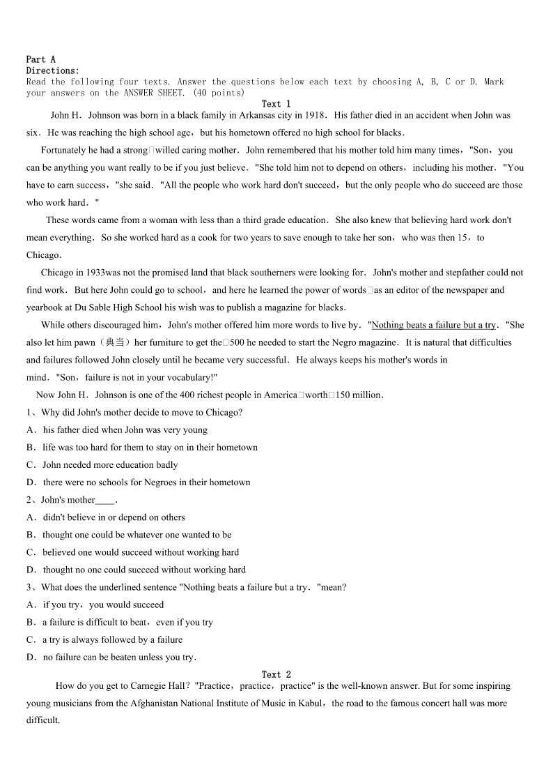 考研《英语一》文昌市2023年深度自测卷 SectionIUseofEnglish Directions: Readthefollowingtext.Choosethebestword(s)foreachnumberedblankandmarkA,B,CorDonthe ANSWERSHEET.(10points) Itwasduringthoseharddaysinasmallcommunity.Foodwasinshortsupply.IusedtostopbyMr.Miller'sstandfor1 Oneparticularday,whileMr.Millerwas2somepotatoesformeInoticedasmallboy3admiringabasketofgreen peas.SoonIwasalso4tothefreshgreenpeas. Theboyleft.Mrs.Miller5tomeandsaid,"Therearetwoothersuchboysinour6,allfrompoorfamilies.Jim alwaysoffersto7ourproducefortheirmarbles(弹珠).Hesomehowmakesthembelievehelikesredmarbles8 .Sometimesheevensendsthemhomewithsomepeasfor9."Ileftthestand,10withthisman. Yearslater,Iwentbacktovisitsome11inthatcommunityandwhileIwasthereIlearnedMr.Millerhaddied.Iagreed to12myfriendstoseeMrs.Miller.Uponourarrival,weofferedwhateverwordsof13.Aheadofuswerethree youngmen.Theymovedtothecasket(棺椁).Mrs.Miller'seyesfollowedthem14eachyoungmanplacedhisown 15handoverthecoldpalehandandthenleft. OurturncametomeetMrs.Miller.ItoldherwhoIwasandmentionedthe16ofthemarbles.Shesaid,"Thosethree youngmenweretheboys.Theytoldmehowthey17Jim'skindness." "We'veneverhadmuch18,"shesaid,"butrightnow,Jimwouldconsiderhimselfthe19man."Thensheliftedher husband'slifelessfingers.20beneaththehandwerethreeshining,redmarbles! 1、A.flowersB.grainsC.vegetablesD.fruits 2、A.baggingB.diggingC.sellingD.cooking 3、A.happilyB.hungrilyC.curiouslyD.seriously 4、A.carriedB.sentC.drawnD.led 5、A.pulledupB.pickedupC.gotupD.cameup 6、A.communityB.townC.homeD.store 7、A.tradeB.bringC.changeD.get 8、A.intimeB.inparticularC.onpurposeD.onaverage 9、A.somethingB.everythingC.anythingD.nothing 10、A.impressedB.surprisedC.disappointedD.satisfied 11、A.relativesB.friendsC.businessmenD.workers 12、A.introduceB.sendC.accompanyD.assist 13、A.comfortB.thanksC.praiseD.encouragement 14、A.sinceB.whetherC.becauseD.as 15、A.coolB.warmC.redD.pale 16、A.priceB.colorC.storyD.number 17、A.appreciatedB.forgotC.neededD.helped 18、A.debtB.wealthC.hopeD.health 19、A.tallestB.dearestC.richestD.toughe