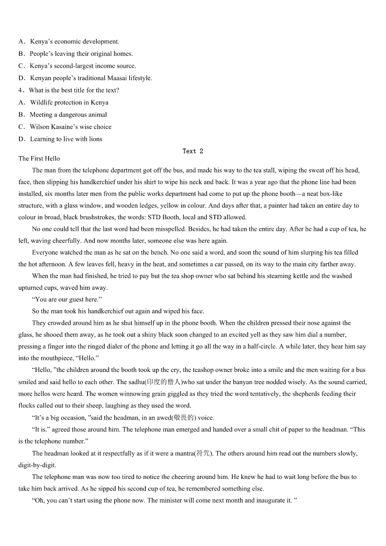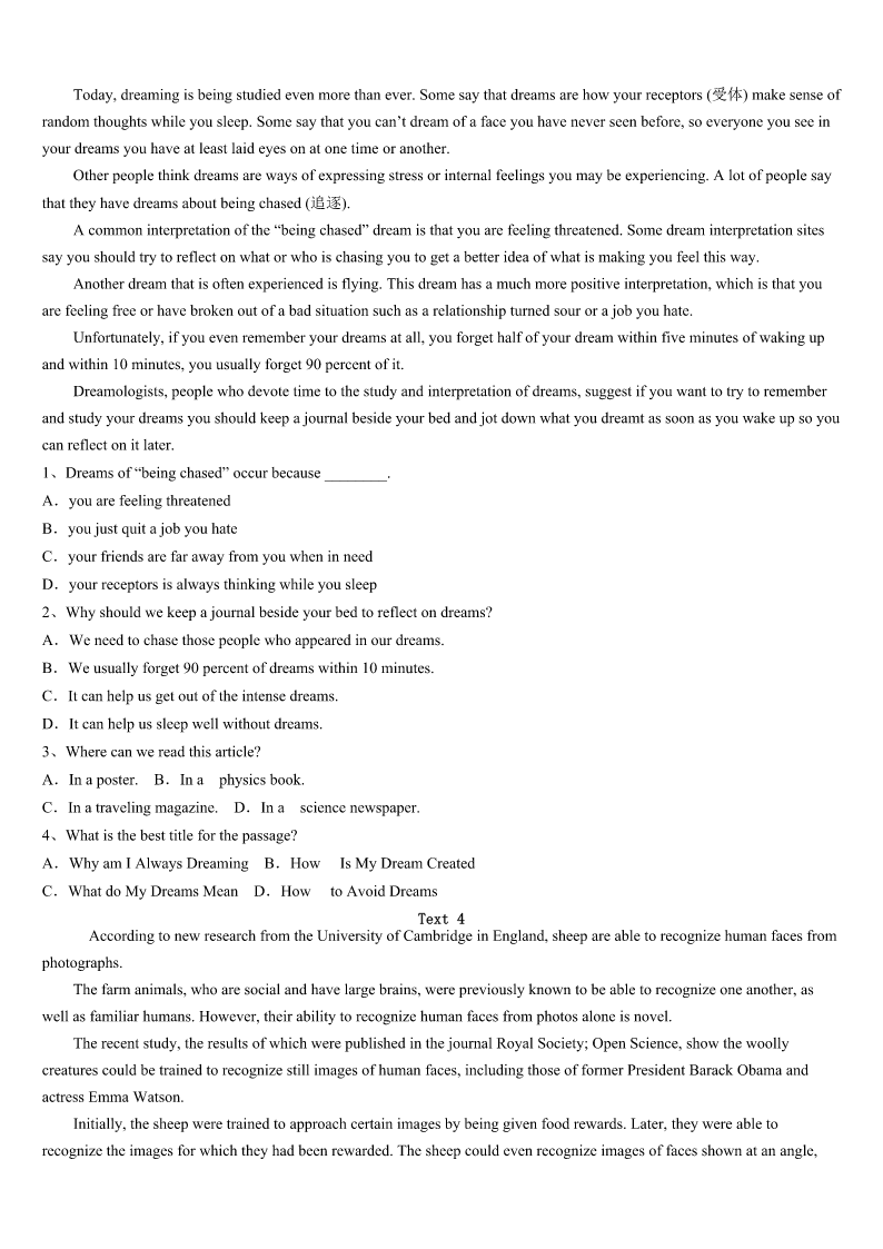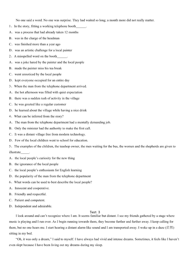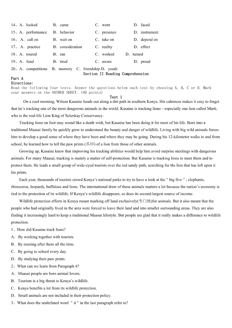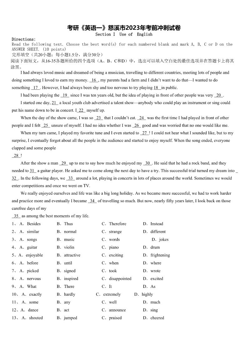 考研《英语一》慈溪市2023年考前冲刺试卷 SectionIUseofEnglish Directions: Readthefollowingtext.Choosethebestword(s)foreachnumberedblankandmarkA,B,CorDonthe ANSWERSHEET.(10points) 完形填空(共20小题;每小题1.5分,满分30分) 阅读下面短文,从16-35各题所给的四个选项(A、B、C和D)中,选出可以填入空白处的最佳选项并在答题卡上将其 涂黑。 Ihadalwayslovedmusicanddreamedofbeingamusician,travellingtodifferentcountries,meetinglotsofpeopleand doingsomethingIlovedtoearnmymoney.16,myparentshadafarmandIdidn’twanttodothat—Iwantedtodo something17.However,Ihadalwaysbeenshyandtoonervoustotryplaying18inpublic. Ihadbeenplayingthe19sinceIwastenyearsold,buttheideaofplayinginfrontofotherpeoplewasvery20. Istartedoneday,21alocalyouthclubadvertisedatalentshow—anybodywhocouldplayaninstrumentorsingcould puthisnamedowntobeinconcert.I22myselfup. Whenthedayoftheshowcame,Iwasso23thatIcouldn’teat.24wasthefirsttimeIhadplayedinfrontofother peopleandIfelt25unsureofmyself.IhadnoideawhetherIwas26goodandwasworriedthatnoonewouldlikeme. Whenmyturncame,IplayedmyfavoritetuneandIevenstartedto27!IcouldnothearwhatIsoundedlike,buttomy surprise,Ieventuallyforgotaboutallthepeopleintheaudienceandstartedtoenjoymyself.Whenthesongended,everyone clappedandsomepeople 28! Aftertheshowaman29uptometosayhowmuchheenjoyedmy30.Hesaidthathehadarockband,andthey neededto31aguitarplayer.Heaskedmetocomealongthenextdaytohaveatry.Thissuccessfultrialturnedmydreaminto 32.Inthefollowingdays,we33aroundalot,playinginconcertsinlotsofplacesaroundtheworld.Sometimeswewould entercompetitionsandoncewewentonTV. Wereallyenjoyedourselvesandlifewaslikeabiglongholiday.Aswebecamemoresuccessful,wehadtoworkharder andpracticemoreandeventuallyIbecame34oftravellingsomuch.Butnow,nearlyfiftyyearslater,Ilookbackonthose carefreedaysofmy 35asamongthebestmomentsofmylife. 1、A.BesidesB.ThusC.ThereforeD.Instead 2、A.similarB.normalC.strangeD.different 3、A.songsB.musicC.wordsD.jokes 4、A.guitarB.violinC.pianoD.drum 5、A.enjoyableB.attractiveC.excitingD.frightening 6、A.beforeB.untilC.whenD.where 7、A.pickedB.signedC.tookD.wrote 8、A.nervousB.inspiredC.disapp