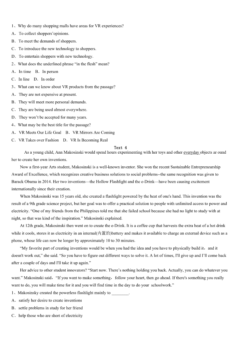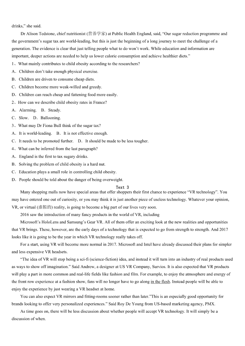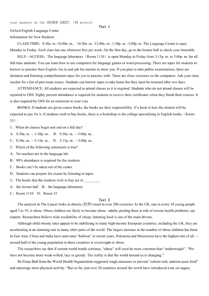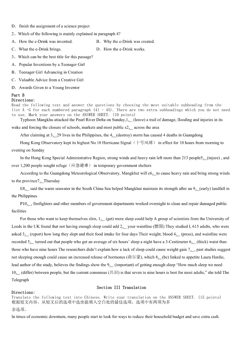 考研《英语一》景谷傣族彝族自治县2023年全真模拟试题 SectionIUseofEnglish Directions: Readthefollowingtext.Choosethebestword(s)foreachnumberedblankandmarkA,B,CorDonthe ANSWERSHEET.(10points) In1975,whenIwasfifteen,mygrandmothersufferedaterriblediseaseanddied.1mymemoriesofherarestillvivid. I2hertellingmestories,kissingme3andwhisperingjustbeforeIfellasleep:“Goodnight,darling.” She4tellmemanystories.Ifeltthesadnessand5whenshetoldaboutheronlysonbeing6missinginan actionafterD-day(诺曼底登陆).Ifeltthe7awifefeltasthroatcancerrobbedherbelovedhusbandofspeechand8of life.Grandmanevercriedwhentellingthesestories.Shetoldthemstraightout,quietlyandafterward,shealways9along, deepsighandsaid,“Oh,kid,it’sagreatlifeifyoudon’tweaken.” Afewyearsago,mylifetookastressfulturnand10enough,Ifoundmygrandmaandherstoriesfrequently11my mind.Irealizedthen12shehadnotleftmeanykeepsake(纪念品),shehadleftmethegreatest13—herstrength,her perseverance,andhercouragetofacelifehead-on.Shegavemethe14Ilacked.Grandmacould15thedifficultiesof herlife,andIknewIcould,too. Oftenat16now,Itellmydaughterstories.Welaughandsigh,andoccasionallyatearfalls.Thenjust17my child’seyelidsbegintodropandherbreathingbecomes18,Ileanoverand19mylipsagainsthercheek.AndIheara 20inthedarknesswhisperingwithme,“Goodnight,darling.” 1、A.OrB.ThenC.ButD.So 2、A.rememberB.appreciateC.enjoyD.admire 3、A.carefullyB.gentlyC.hardlyD.kindly 4、A.wouldB.couldC.shouldD.might 5、A.lonelinessB.sillinessC.tirednessD.helplessness 6、A.declaredB.suspectedC.remindedD.informed 7、A.angerB.apologyC.sorrowD.shame 8、A.reasonablyB.eventuallyC.considerablyD.painfully 9、A.setoutB.setdownC.letdownD.letout 10、A.peacefullyB.hopefullyC.comfortablyD.curiously 11、A.occurringB.readingC.occupyingD.understanding 12、A.althoughB.sinceC.thatD.unless 13、A.itemB.giftC.storyD.time 14、A.forceB.willC.energyD.freedom 15、A.lookthroughB.gothroughC.secthroughD.gelthrough 16、A.mealtimeB.suppertimeC.bedtimeD.lunchtime 17、A.asB.whileC.beforeD.until 18、A.hardB.roughC.toughD.soft 19、A.turnB.pullC.pressD.lift 20、A.soundB.voiceC