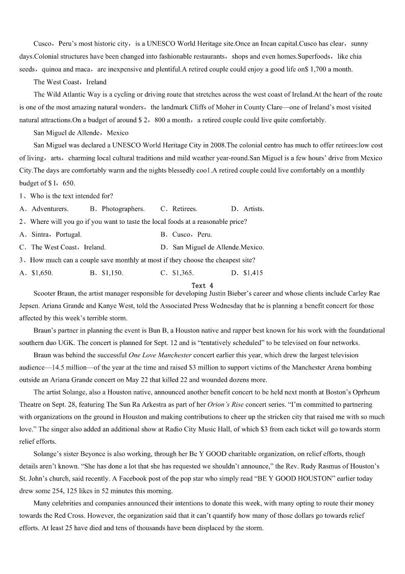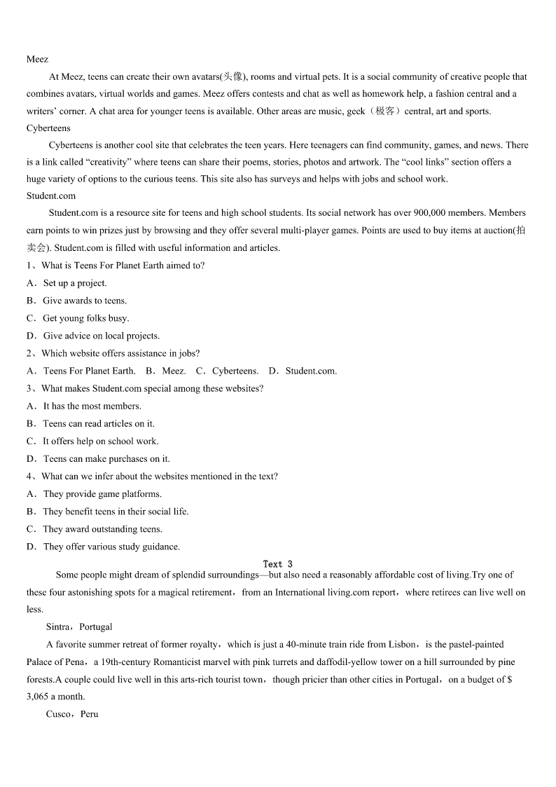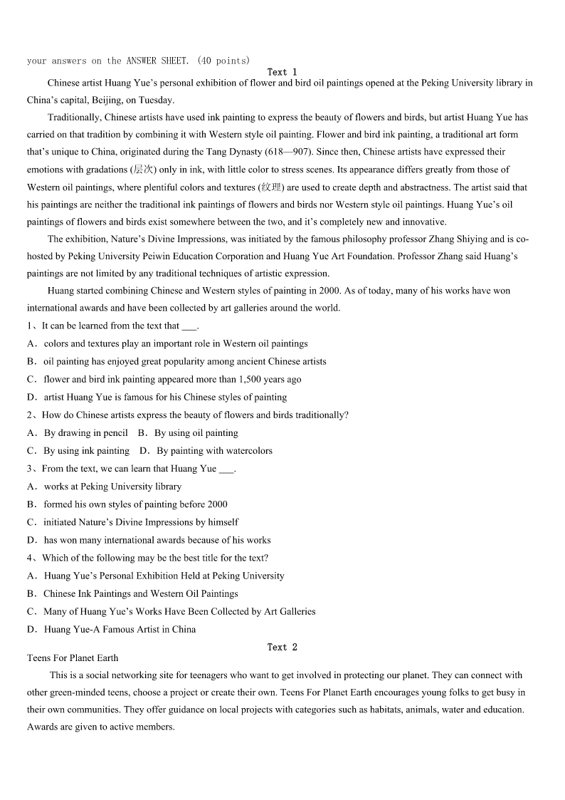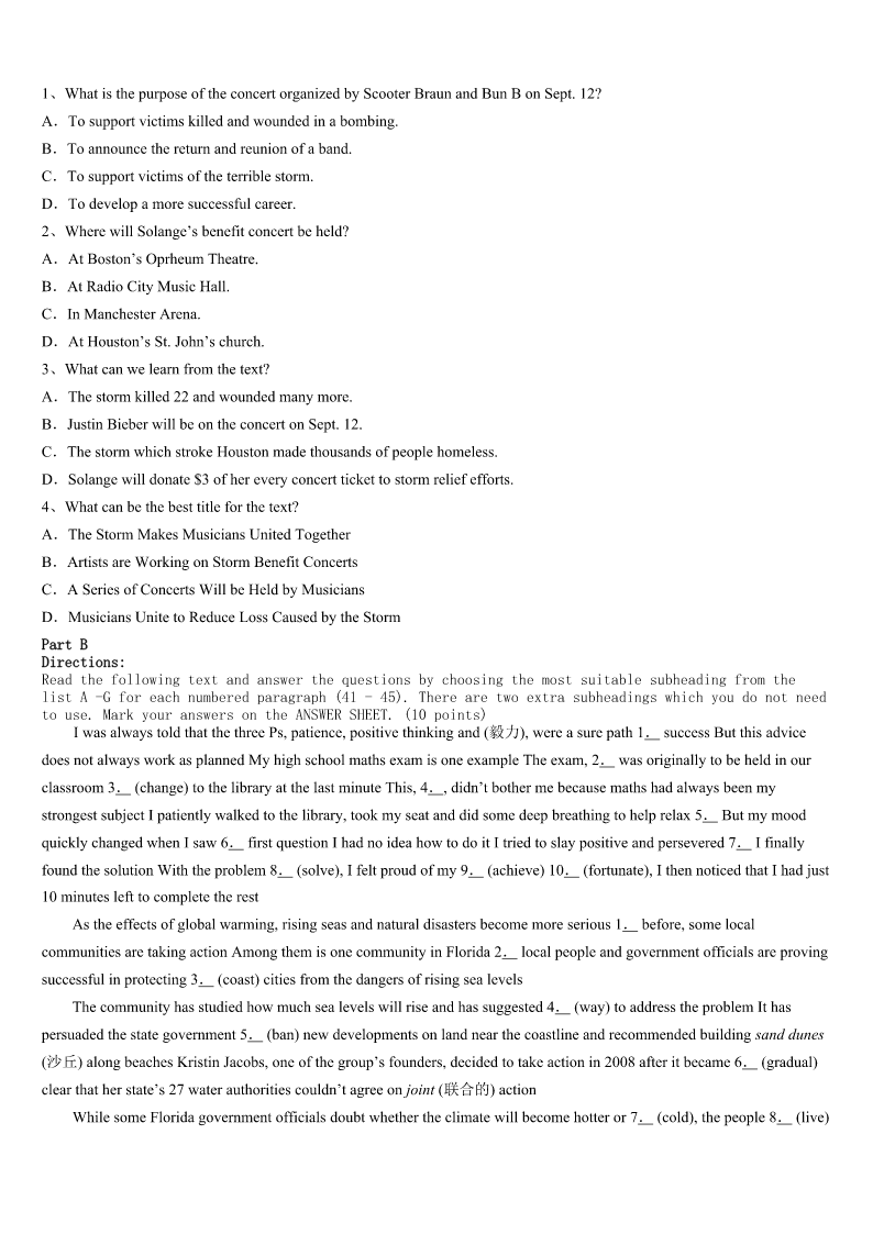 考研《英语一》江西省九江市庐山区2023年全真模拟试题 SectionIUseofEnglish Directions: Readthefollowingtext.Choosethebestword(s)foreachnumberedblankandmarkA,B,CorDonthe ANSWERSHEET.(10points) WhenIwasasmallchild,duringthewar,wewereverypoorandwelivedinafarawayvillage.Oneday,ontheroad,I foundthe1piecesofamirror.TherewasaGermanmotorcycleaccident. Itriedtofindallthepiecesandputthem2,butitwasnotpossible,soIkeptonlythe3pieceandImadeitround.I beganto4withitasatoyandbecamegreatlyattractedbythe5thatIcouldreflect(反射)lighttodarkplaceswherethe sunwouldnevershine—in6holesandsomeotherdarkplaces.Itbecamea7formetogetlightintothedarkestplacesI couldfind. I8thelittlemirror,and,asI9up,IwouldtakeitoutwhenIhadnothingtodoand10thegame,AsIbecamea 11,Igrewtounderstandthatthiswasnot12achild’sgamebutametaphor(象征)forwhatImightdowithmylife.I cameto13thatIamnotthelightorthesource(来源)oflight.Butlight—truth,understanding,knowledge—is14,andit willshineinmanydarkplacesonlyifIreflectit. Iamjustasinglepieceofamirrorwhose15designandshapeIdonotknow.16,withwhatIhaveIcanreflect lightintothedarkplacesofthis17—intotheblackplacesinthe18ofmen—andchangesomethings19somepeople. Perhapsothersmayseeanddothesame.ThisiswhatIamabout.Thisisthe20ofmylife. 1、A.pointedB.droppedC.brokenD.sharpened 2、A.togetherB.downC.backD.up 3、A.bestB.largestC.smallestD.longest 4、A.talkB.shareC.flashD.play 5、A.ideaB.reasonC.decisionD.fact 6、A.prettyB.bigC.deepD.empty 7、A.gameB.taskC.jobD.trouble 8、A.forgotB.hidC.keptD.lost 9、A.grewB.stoodC.cameD.went 10、A.watchB.changeC.rememberD.continue 11、A.fatherB.boyC.manD.grandfather 12、A.alwaysB.justC.reallyD.completely 13、A.understandB.doubtC.announceD.expect 14、A.absentB.thereC.farD.home 15、A.halfB.mostC.wholeD.other 16、A.SoB.CertainlyC.BesidesD.However 17、A.worldB.villageC.countryD.city 18、A.handsB.heartsC.eyesD.brains 19、A.onB.likeC.withD.in 20、A.wayB.meaningC.qualityD.standard SectionIIReadingComprehension PartA Directions: Readthefollowingfourtexts.AnswerthequestionsbeloweachtextbychoosingA,B,CorD.Mark youranswerson