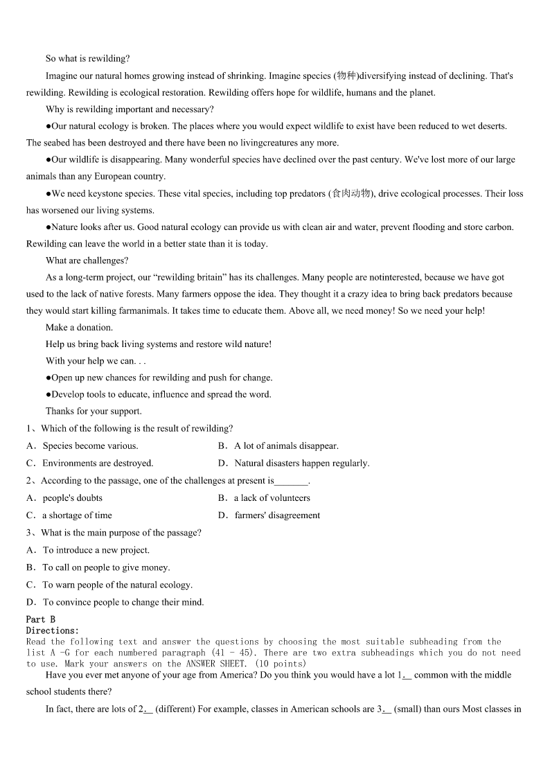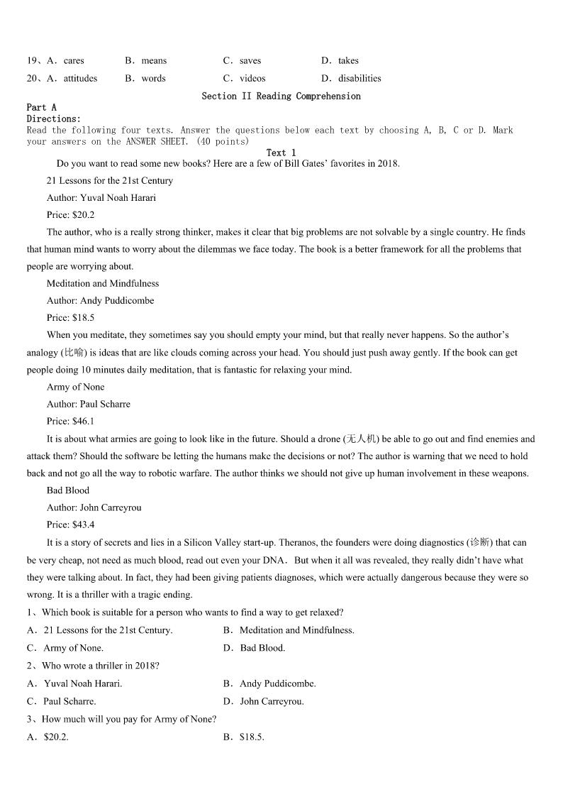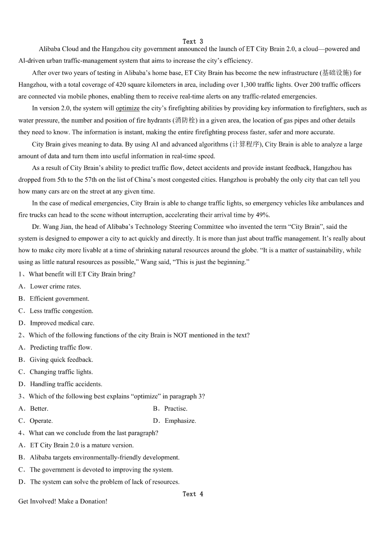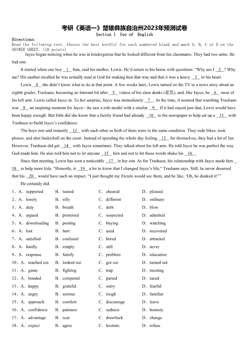 考研《英语一》楚雄彝族自治州2023年预测试卷 SectionIUseofEnglish Directions: Readthefollowingtext.Choosethebestword(s)foreachnumberedblankandmarkA,B,CorDonthe ANSWERSHEET.(10points) Jaycebegannoticingwhenhewasinkindergartenthathelookeddifferentfromhisclassmates.Theyhadtwoarms.He hadone. Itstartedwhenoneboy1him,saidhismother,Lewis.He’dreturntohishomewithquestions:“WhyamI2?Why me?HismotherrecalledhewasactuallymadatGodformakinghimthatwayandthatitwasaheavy3tohisheart. Lewis4shedidn’tknowwhattodoatthatpoint.Afewweekslater,LewisturnedontheTVtoanewsstoryaboutan eighthgrader,Trashaun,becominganInternethitafter5videosofhisslamdunks(灌篮),and,likeJayce,he6mostof hisleftarm.LewiscalledJaycein.Tohersurprise,Jaycewasimmediately7.Atthetime,itseemedthatwatchingTrashaun was8aninspiringmomentforJayce—hesawarolemodelwithasimilar9.Ifithadstayedjustthat,Lewiswouldhave beenhappyenough.Butlittledidsheknowthatafamilyfriendhadalready10tothenewspapertohelpsetupa11with TrashauntobuildJayce’sconfidence. Theboysmetandinstantly12witheachotherasbothofthemwereinthesamecondition.Theyrodebikes,took photos,andshotbasketballonthecourt.Insteadofspendingthewholedayfeeling13forthemselves,theyhadalotoffun. However,Trashaundidget14withJaycesometimes.Theytalkedabouthisleftarm.HetoldJaycehewasperfecttheway Godmadehim.Healsotoldhimnottoletanyone15himandnottoletthosewordsshakehis16. Sincethatmeeting,Lewishasseenanoticeable17inherson.AsforTrashaun,hisrelationshipwithJaycemadehim 18tohelpmorekids.“Honestly,it19alottoknowthatIchangedJayce’slife,”Trashaunsays.Still,heneverdreamed thathis20wouldhavesuchanimpact.“Ijustthoughtmyfriendswouldseethem,andbelike,‘Oh,hedunkedit!’” Hecertainlydid. 1、A.supportedB.teasedC.cheatedD.pleased 2、A.lonelyB.sillyC.differentD.ordinary 3、A.dutyB.breathC.debtD.blow 4、A.arguedB.promisedC.suspectedD.admitted 5、A.downloadingB.postingC.buyingD.watching 6、A.lostB.hurtC.usedD.recovered 7、A.satisfiedB.confusedC.boredD.attracted 8、A.hardlyB.simplyC.stillD.never 9、A.responseB.familyC.problemD.education 10、A.reached