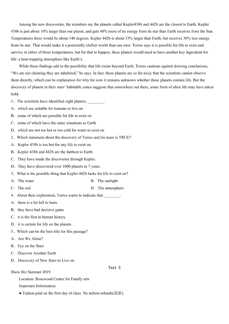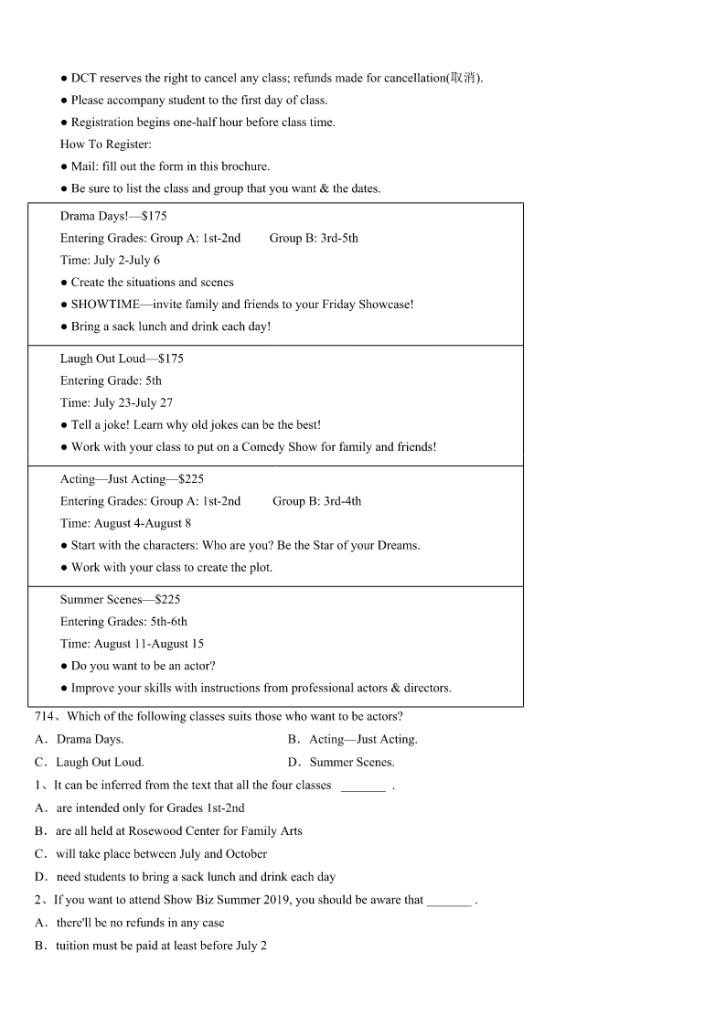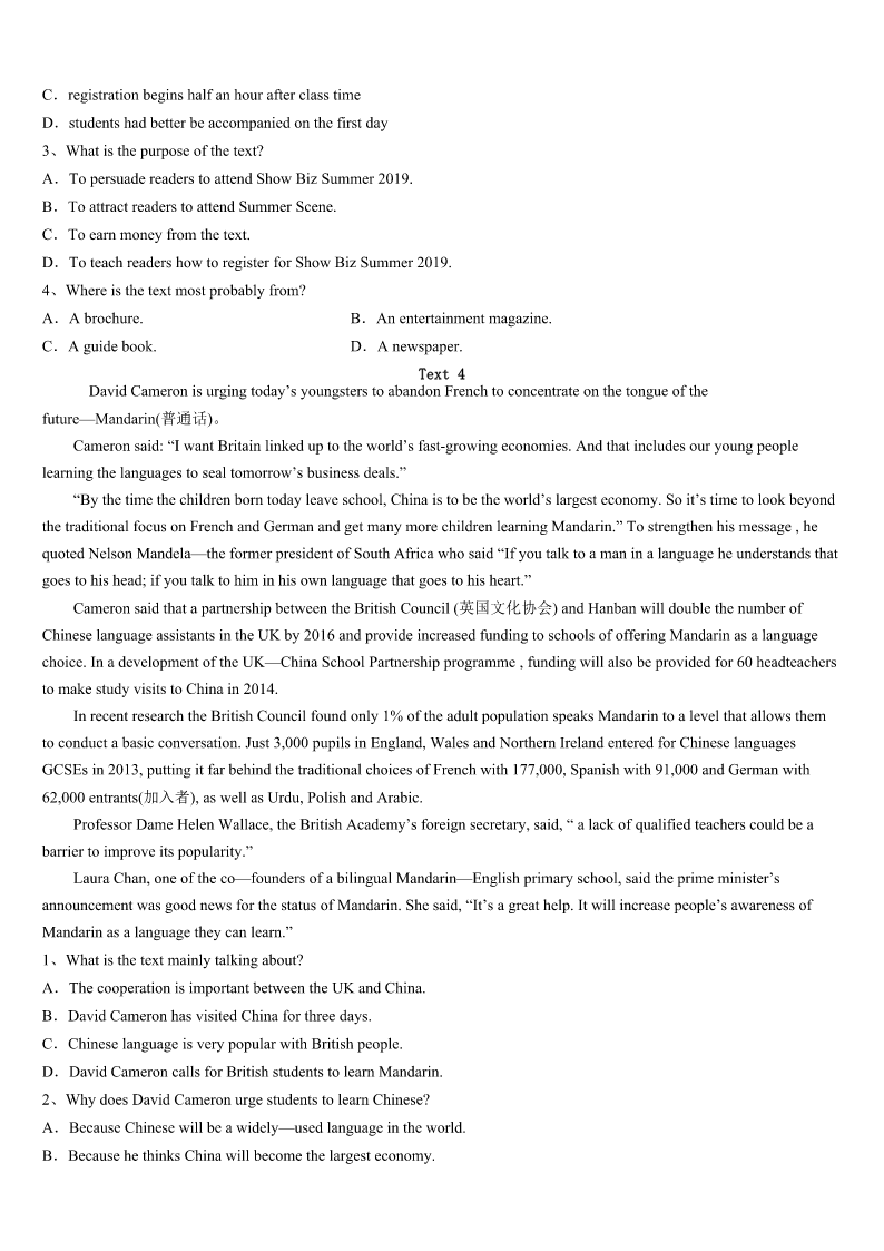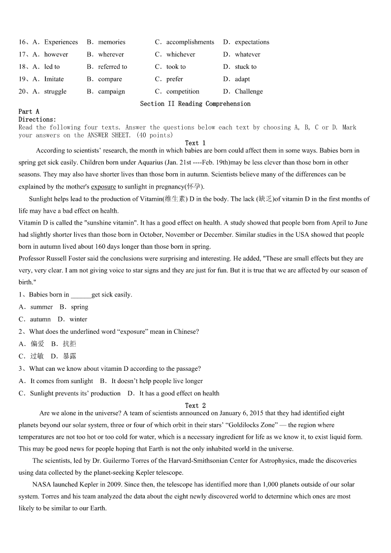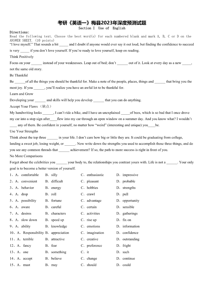 考研《英语一》梅县2023年深度预测试题 SectionIUseofEnglish Directions: Readthefollowingtext.Choosethebestword(s)foreachnumberedblankandmarkA,B,CorDonthe ANSWERSHEET.(10points) “Ilovemyself.”Thatsoundsabit_____andIdoubtifanyonewouldeversayitoutloud,butfindingtheconfidencetosucceed isvery_____ifyoudon’tloveyourself.Ifyou’rereadytoloveyourself,keeponreading. ThinkPositively Focusonyour______insteadofyourweaknesses.Leapoutofbed;don’t______outofit.Lookateverydayasanew_____, notthesameoldstory. BeThankful Be______ofallthethingsyoushouldbethankfulfor.Makeanoteofthepeople,places,thingsand______thatbringyouthe mostjoy.Ifyou______,you’llrealizeyouhaveanawfullottobethankfulfor. LearnandGrow Developingyour______andskillswillhelpyoudevelop______thatyoucandoanything. AcceptYourFlaws(缺点) Myhandwritinglooks______,Ican’trideabike,andIhaveanunexplained_____ofbees,whichissobadthatIoncedrove mycarintoastopsignafter____flewintomycarthroughanopenwindowonasummerday.Andyouknowwhat?Iwouldn’t ____anyofthem.Beconfidentinyourself,nomatterhow“weird”(interestingandunique)you____be. UseYourStrengths Thinkaboutthetopthree______inyourlife.Idon’tcarehowbigorlittletheyare.Itcouldbegraduatingfromcollege, landingasweetjob,losingweight,or______.Nowwritedownthestrengthsyouusedtoaccomplishthosethreethings,anddo youseeanycommonthreadsthat______achievement?Ifso,thepathtomoresuccessisrightinfrontofyou. NoMoreComparisons Forgetaboutthecelebritiesyou______yourbodyto,therelationshipsyoucontrastyourswith.Lifeisnota______.Youronly goalistobecomeabetterversionofyourself. 1、A.comfortableB.sillyC.enthusiasticD.impressive 2、A.convenientB.difficultC.pleasantD.probable 3、A.behaviorB.energyC.hobbiesD.strengths 4、A.dropB.rollC.crawlD.pull 5、A.possibilityB.fortuneC.advantageD.opportunity 6、A.awareB.carefulC.certainD.sensible 7、A.desiresB.charactersC.activitiesD.gatherings 8、A.slowdownB.speedupC.riseupD.fixon 9、A.abilityB.knowledgeC.emotionsD.information 10、A.ResponsibilityB.appreciationC.imaginationD.confidence 11、A.terribleB.attractiveC.