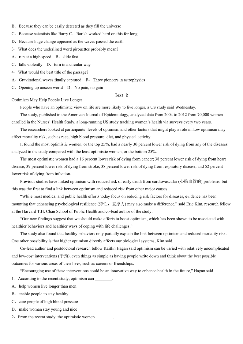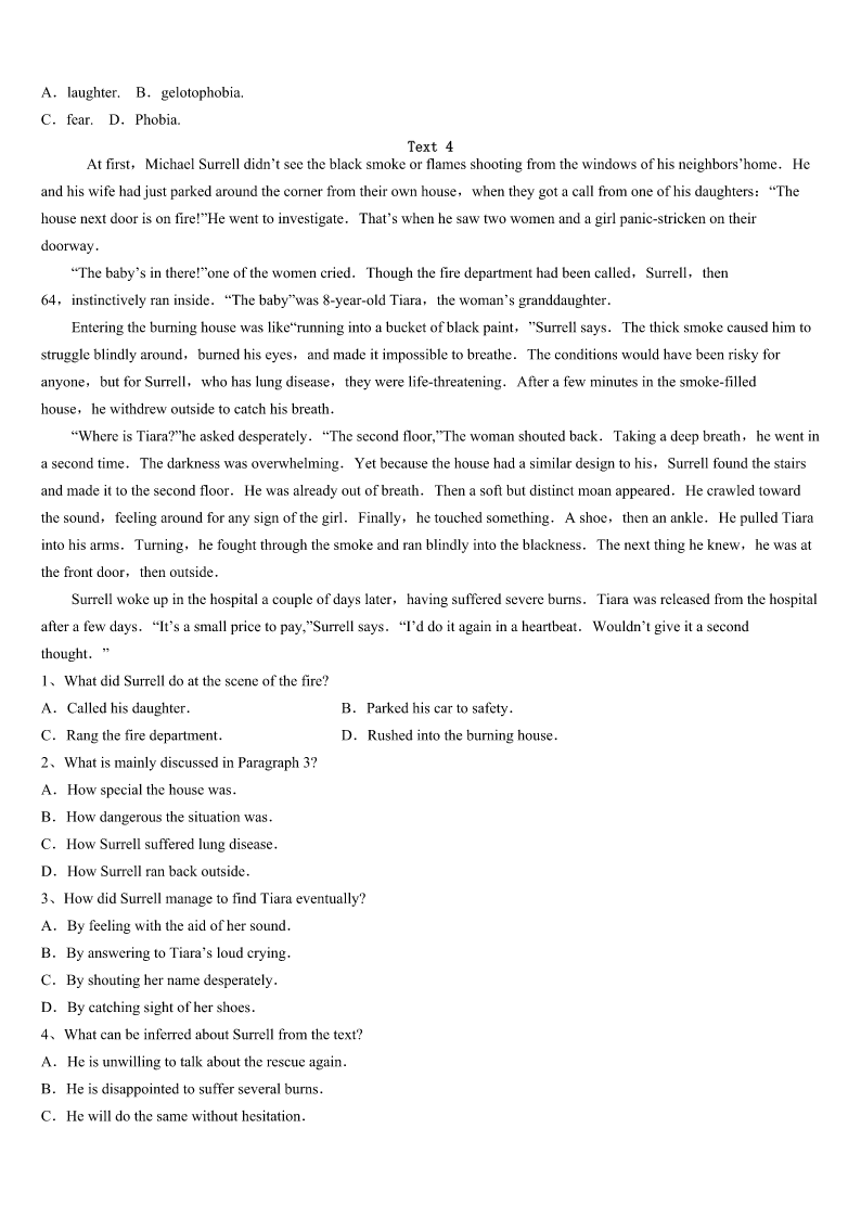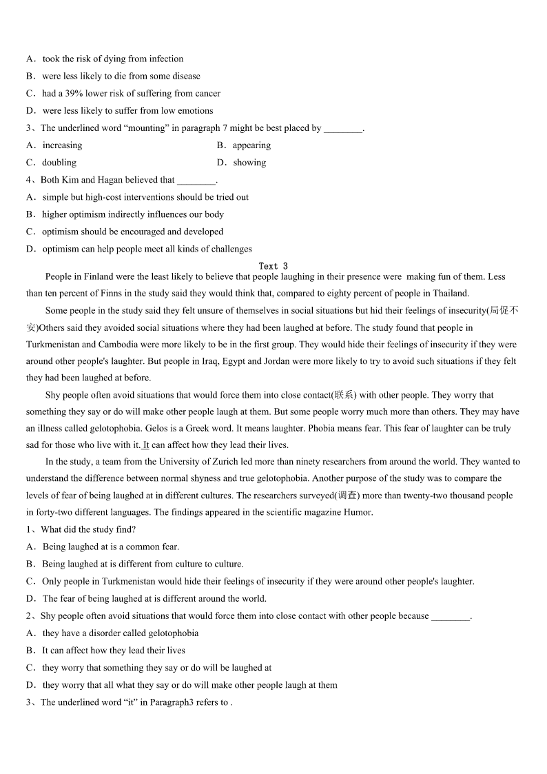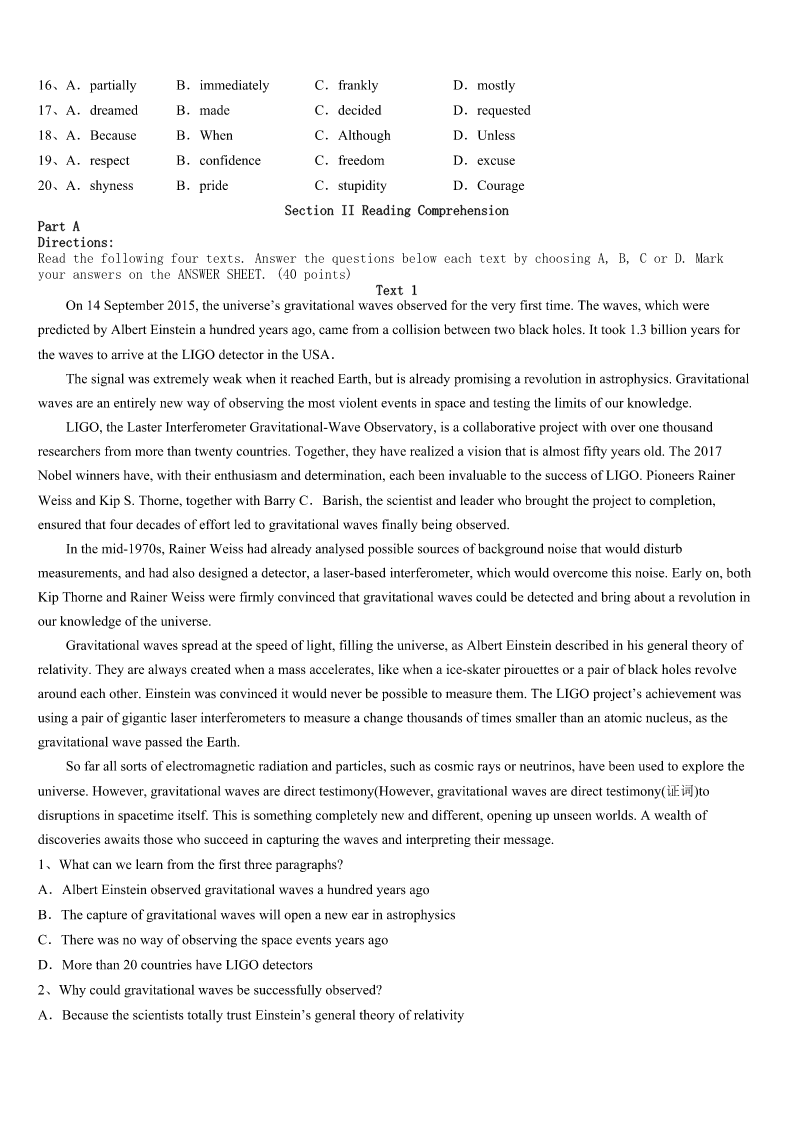 考研《英语一》枣强县2023年考前冲刺试题 SectionIUseofEnglish Directions: Readthefollowingtext.Choosethebestword(s)foreachnumberedblankandmarkA,B,CorDonthe ANSWERSHEET.(10points) ThemostimportantlessonIlearnedinhighschoolhadnothingtodowithmathsorAmericanhistory.Itcameatgraduation, severalminutesbeforeIleftMiramonteHighSchool. Iwasrathershybackthen,contentto1aroundwithmyfewfriendsandtoconcentrateonmy2Iwasdoingsowellthatby theendofsenioryearIhadperfectscoresandenough3togotocollege. Butmygoodrecordsoonbecamea4tomywell-being.InearlyJuneofsenioryear,theheadmastercalledmeintohis office.Heaskedmetogivealeave-takingspeechatgraduation.Ilookedathim,myheart5fast.Thiswasthe6formy hardwork?Isaidsomething,butnotveryclearly,andhurriedawayfromtheoffice. Iwas7aboutthedecision,finallyagreeingtocompromise.Iwasn'ttheonlyspeaker—Iwould8thehonorwithfive otherstudents.Still,itwasdoubtfulwhetherthetaskwas9me.HowintheworldwouldIgiveaspeechtohundredsof people? Graduationdaysoonarrivedand,as10.Iwasnervous.I'dbeenpracticingmyspeechfordays,andIhadit11.ButI hadneverbeenso12inmylife.Thefirsthalfhouroftheceremonypassed,andthenmy13came.Mynamewas announced.Imanagedtoreachtheplatformwithoutfallingdown.Butwithinminutes,Iwas14,headingbacktomy seat. NowIstillhavethe15ofthatspeech.Myvoicetrembledalittle,but16itwasclearandstrong.I'mproudofthat tape.IachievedsomethingI'dnever17Ispokeinfrontofhundredsofpeople.18Ididn'trealizeitatthetime,the successfulcompletionofthatspeechgavemethe19toparticipateinclassatcollege,togiveoralreports,andtoeventually breakfreeofmy20 Ineverwouldhavechosentogiveaspeechatgraduation.ButI'mgladIdid.Iknowitmaywellturnouttobeoneofmy shiningmoments. 1、A.hangB.lookC.walkD.run 2、A.charactersB.interestsC.gamesD.subjects 3、A.moneyB.creditsC.timeD.standards 4、A.luckB.benefitC.fearD.solution 5、A.burningB.breakingC.achingD.beating 6、A.punishmentB.rewardC.arrangementD.sympathy 7、A.doubtfulB.optimisticC.generousD.hesitant 8、A.shareB.bringC.spareD.give 9、A.aboutB.forC.uponD.beyond 10、A.knownB.hopedC.expectedD.plann