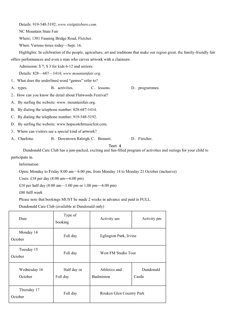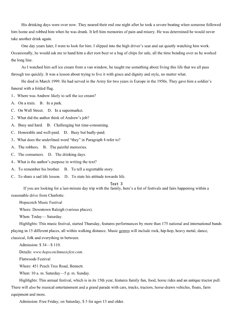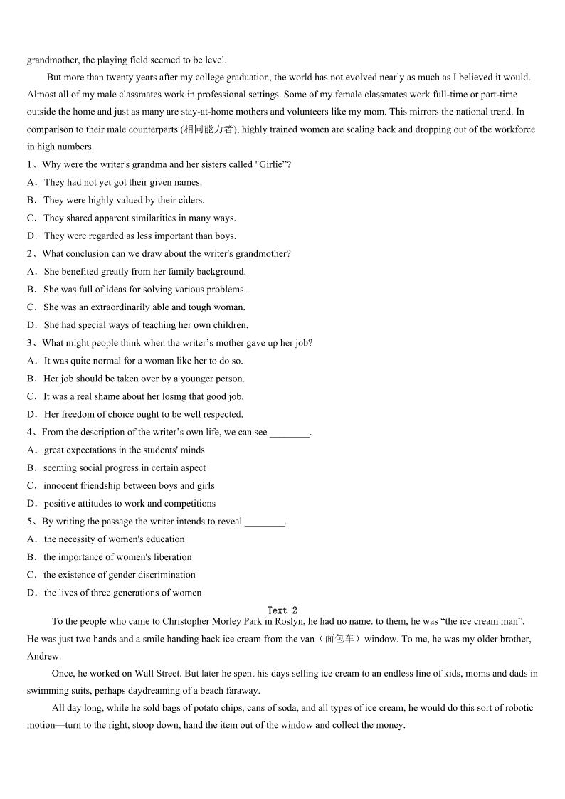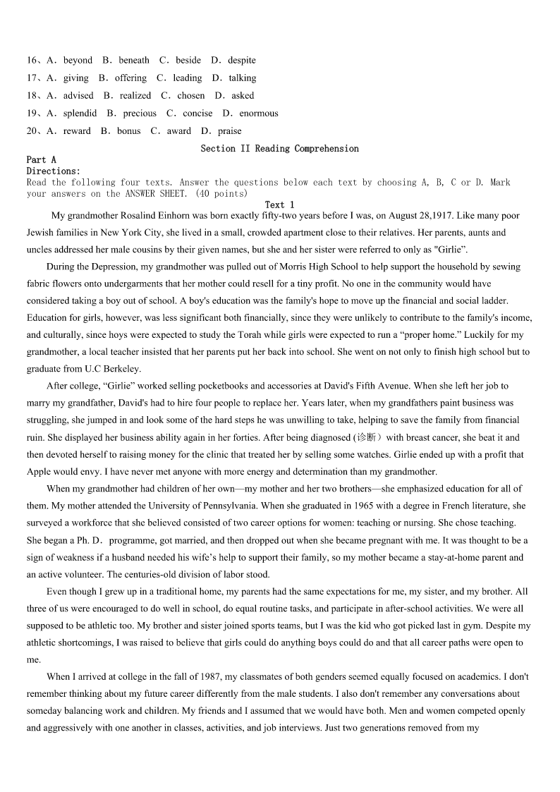 考研《英语一》汉阴县2023年高分冲刺试题 SectionIUseofEnglish Directions: Readthefollowingtext.Choosethebestword(s)foreachnumberedblankandmarkA,B,CorDonthe ANSWERSHEET.(10points) “Ihaverights.Ihavetherightofeducation.Ihavetherighttoplay.Ihavetherighttosing.Ihavetherighttotalk.Ihave therighttogotomarket.Ihavetherightto...” ThatwasMalalaYousafzai.Shewas1aboutgirls’rightstoaneducation,something2bytheTalibanmilitant group. Aboutayearafterthatinterview,15-yearoldMalalawasshot3theheadbyaTalibangunman.She4,and continuedherworktohelpyoungwomengetaneducation.OnFriday,atage17,Malalabecametheyoungestpersonever awardedaNobelPeaceprize.She5itwithKailashSatyarthiofIndia.The60-year-oldactivisthasledpeaceful demonstrations6childslaveryandforcedlabor. The7thattheawardissharedissignificant.MalalaisaPakistaniMuslim.SatyarthiisanIndianHindu.Theirnations are8.MalalasaystheawardgivesamessagetopeopleoflovebetweenPakistanandIndiaandbetweendifferent9. Malalacametothepressconference10fromschool.Shespokemostlywithoutnote,shetalkedforabout15minutes, andshedescribedhowshe’dbeeninthe11lessonat10:15inthemorning,andsheknewitwasa(an)12day,sheknew theNobelPeaceawardsweregoingtobeannounced,andat10:15shehadsaidto13,thatshedidn’texpectthatshewas goingtogettheaward. Thenateachercametothechemistryclass14shewas,andshewas15toonesidetoldthatshehadwontheaward, butshedecided16thatthatshewouldstayandfinishherlesson. Shehadaphysicslessonbeforecomingand17thespeech.Andshetalkedabouthowshefelthonoredtohave receivedthisaward. “I’mfeelinghonoredthatI’mbeing18asaNobellaureate(获奖者),andIhavebeenhonoredwiththis-this19 awardtotheNobelPeacePrize.AndI’mproudthatI’mthefirstPakistaniandthefirstyoungwomanorthefirstyoungperson who’sgettingthis20.It’sagreathonorforme.” 1、A.takingupB.holdingupC.summingupD.speakingup 2、A.supportedB.approvedC.objectedD.opposed 3、A.inB.atC.onD.to 4、A.diedB.snuggledC.escapedD.survived 5、A.speaksB.sharesC.getsD.accepts 6、A.forB.towardsC.againstD.through 7、A.newsB.informationC.ideaD.fact 8、A.friendsB.rivalsC.relativesD.