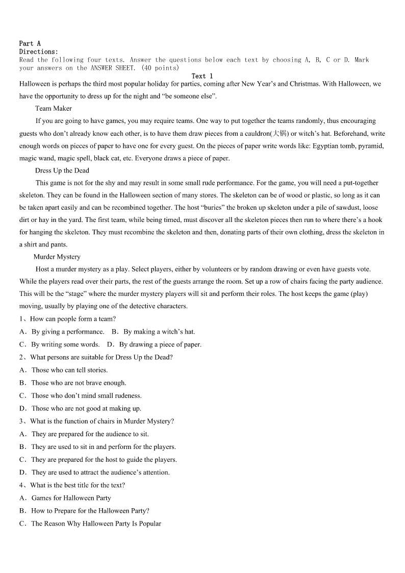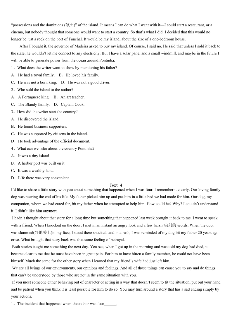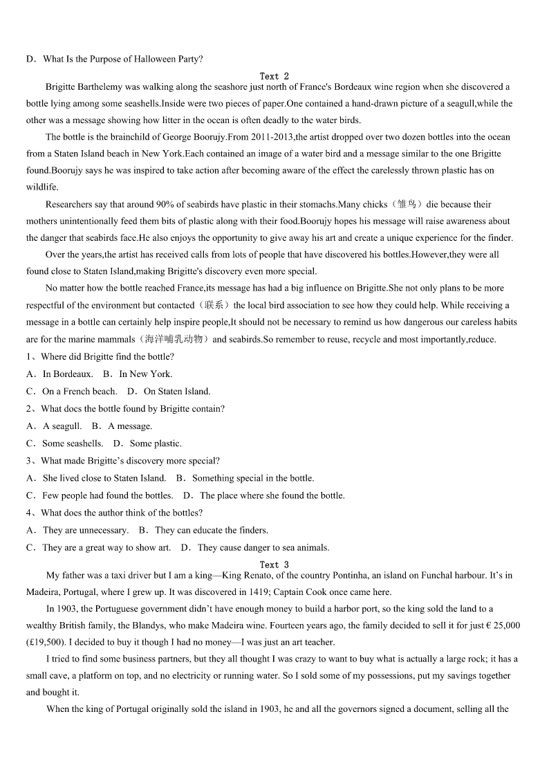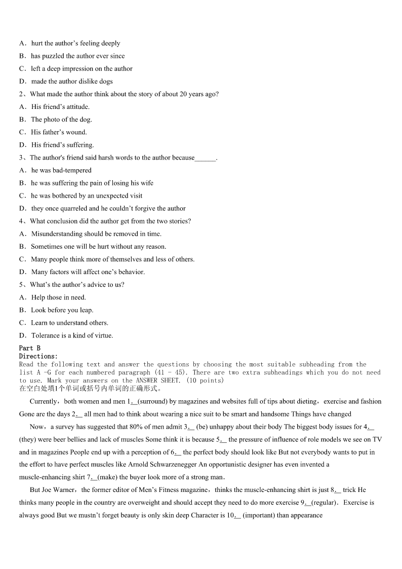 考研《英语一》永城市2023年临考冲刺试卷 SectionIUseofEnglish Directions: Readthefollowingtext.Choosethebestword(s)foreachnumberedblankandmarkA,B,CorDonthe ANSWERSHEET.(10points) Fromayoungage,myparentshavetaughtmetheimportanceofgivinggenerouslytothelessfortunate.Outof1, wheneverthereissomethingIcan2,Igiveittosomeoneonthestreet. Lastweek,3Ileftthehousetorunafewerrands(差事),Icarriedwithmesomeoldclothes,somefoodanda handbagtohandovertosomeone4. Asthecar5atthetrafficsignal,Isawagirloffiveorsixaskingformoney.I6hertocometomeandquickly7 allthethingsIhad.AsIstartedhandingthemover,sheseemed8.Shelookedupatmewithasweetsmileonherfaceand askedwhatwasinthe9.Itoldherthereweresomeclothesandfoodforher. 10shelookedupatmeandasked,“Canyougivemesomewater?”ItwasthenthatInoticedher11lips.Itseemed asifshehadnothadadropofwaterallday. I12mybottleofwaterthatIalwayscarriedwithmeandhelpedhertodrinkfromit.Shefinisheditquicklyandgave meaheartwarmingsmileof13. IwasthankfulthatIcould14hersimplewish!Irealizedonceagainthatdaythatyoudon’tnecessarilyhavetomake big15tohelpsomeone.Thisexperience16onceagainmybeliefinthe17actsofkindnessandhowtheycanmake someone’s18. Thenexttimeyouwanttodosomethingniceforsomeone,don’t19,waitingfortherightchance.20anddoit. 1、A.habitB.respectC.sympathyD.kindness 2、A.affordB.getC.spareD.serve 3、A.untilB.asC.onceD.before 4、A.needyB.sickC.disabledD.sad 5、A.parkedB.staredC.turnedD.paused 6、A.phonedB.signaledC.advisedD.allowed 7、A.collectedB.fetchedC.packedD.threw 8、A.ashamedB.upsetC.embarrassedD.astonished 9、A.carB.bagC.bottleD.clothes 10、A.ThenB.NextC.AgainD.But 11、A.dirtyB.paleC.thickD.dry 12、A.pointedoutB.tookoutC.gaveoutD.pickedout 13、A.happinessB.pleasureC.appreciationD.welcome 14、A.satisfyB.attainC.promiseD.realize 15、A.differencesB.ambitionsC.achievementsD.donations 16、A.foundB.doubtedC.provedD.showed 17、A.uniqueB.simpleC.reliableD.polite 18、A.dayB.fortuneC.dreamD.life 19、A.holdonB.holdupC.holddownD.holdback 20、A.SpeedupB.TakecareC.GoaheadD.Lookout SectionIIReadingComprehension PartA Direct