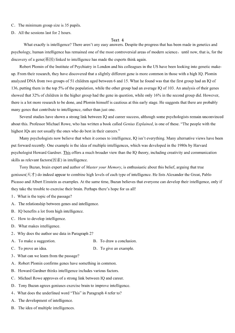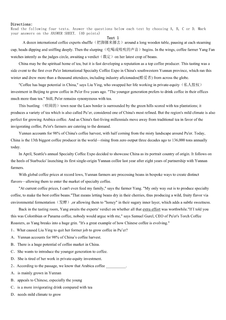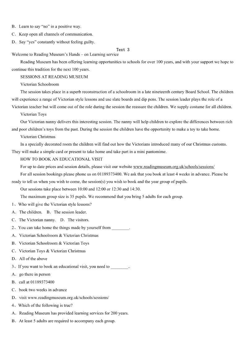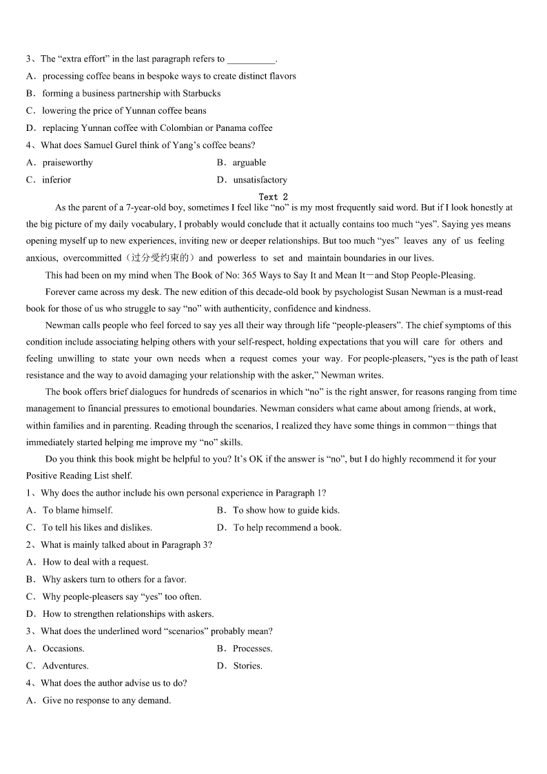 考研《英语一》江苏省常州市金坛市2023年点睛提分卷 SectionIUseofEnglish Directions: Readthefollowingtext.Choosethebestword(s)foreachnumberedblankandmarkA,B,CorDonthe ANSWERSHEET.(10points) Oneafternoon,manyyearsago,Iwenttopickupmymotherfromwork.IgottherealittleearlysoI1thecarbythe roadsideandwaitedforher. AsIlooked2thecarwindow,therewasasmallparkwhereIsawalittleboy,aroundtwoyearsold,3freelyonthegrass ashismotherwatchedfromashort4Theboyhadabigsmileonhisface5hehadjustbeensetfreefromsomesortof6 Theboywouldthenfalltothegrass,7,andwithouthesitationorwithoutlookingbackathismother,runasfastashecould again,stillwitha8onhisface. Kids,whentheyfalldown,don'tviewtheirfallingdownasfailure,but9,theytreatitasalearningexperience.Theytryand tryagainuntilthey10WhileIwastouchedbytheboy'spersistence,Iwas11touchedbythemannerinwhichheran.With eachattempt,helookedso12andsonatural—nosignsoffear,nervousness,orofbeingdiscouraged.Hisonly13wasto runfreelyandtodoitaseffectivelyashecould.Hewasjustbeinga14—justbeinghimself—beingcompletelyinthe moment.Hewasnotlookingfor15orwasnotworryingaboutwhether16waswatching.Hedidn'tseemtobebotheredby thefactthatmaybesomeonewouldseehim17andthatitwouldbe18ifhedidfall.No,allthat19tohimwasto accomplishthetask,tofeeltheexperienceofrunningfullyandfreely.Ilearnedalotfromthat20andexperience,andhave successfullybroughtthatlessonwithmeinmymanypursuits(追求)inlife. 1、A.droveB.startedC.parkedD.broke 2、A.outsideB.downC.towardD.over 3、A.playingB.smilingC.rollingD.running 4、A.wayB.lengthC.timeD.distance 5、A.evenifB.asifC.solongasD.nowthat 6、A.parkB.caveC.prisonD.castle 7、A.getupB.takeupC.breakdownD.liedown 8、A.tearB.smileC.pleasureD.surprise 9、A.howeverB.insteadC.thereforeD.anyhow 10、A.stopB.winC.achieveD.succeed 11、A.luckilyB.apparentlyC.actuallyD.equally 12、A.confidentB.joyfulC.quietD.proud 13、A.worryB.dreamC.aimD.hope 14、A.boyB.childC.playerD.winner 15、A.chanceB.fortuneC.approvalD.trouble 16、A.someoneB.anyoneC.everyoneD.one 17、A.failB.runC.fallD.cry 18、A.embarrassingB.disappointingC.frighteningD.