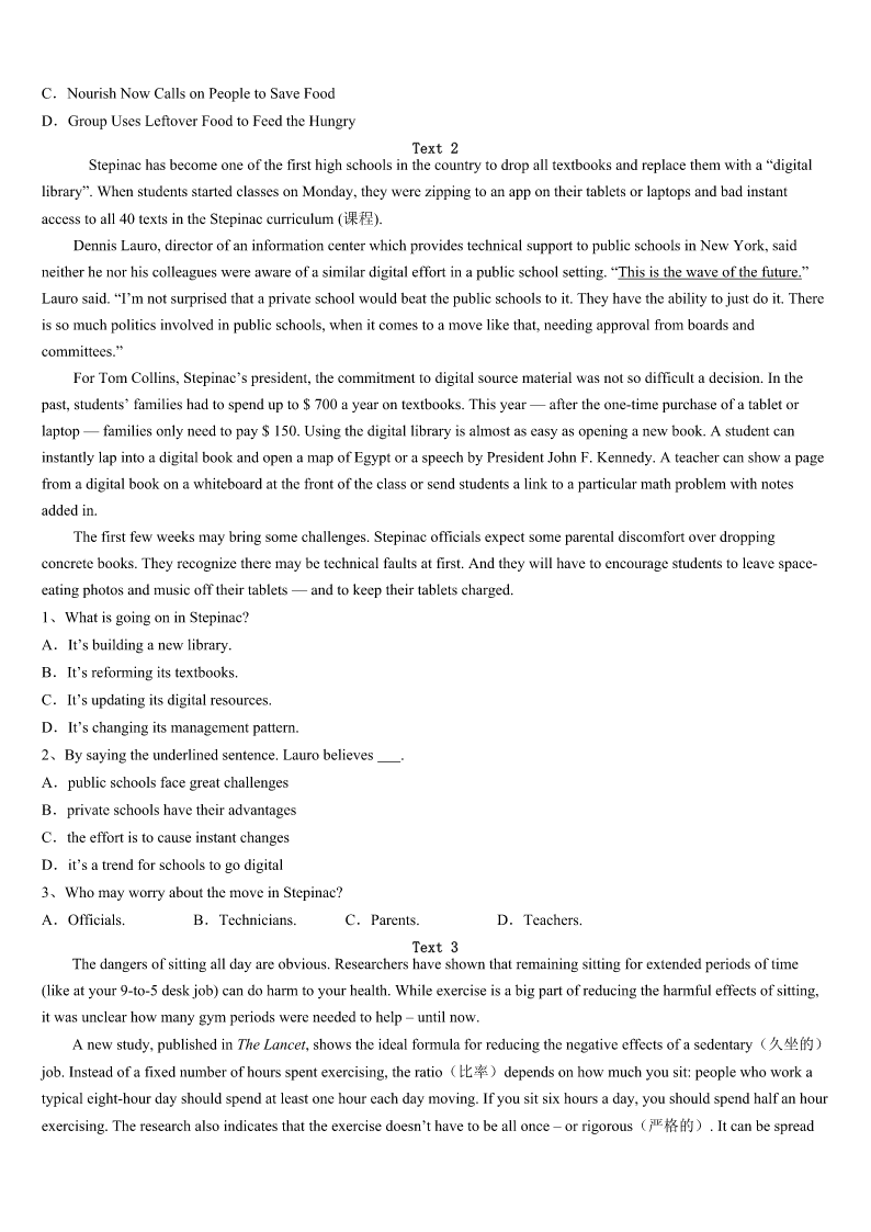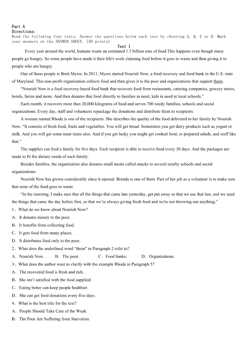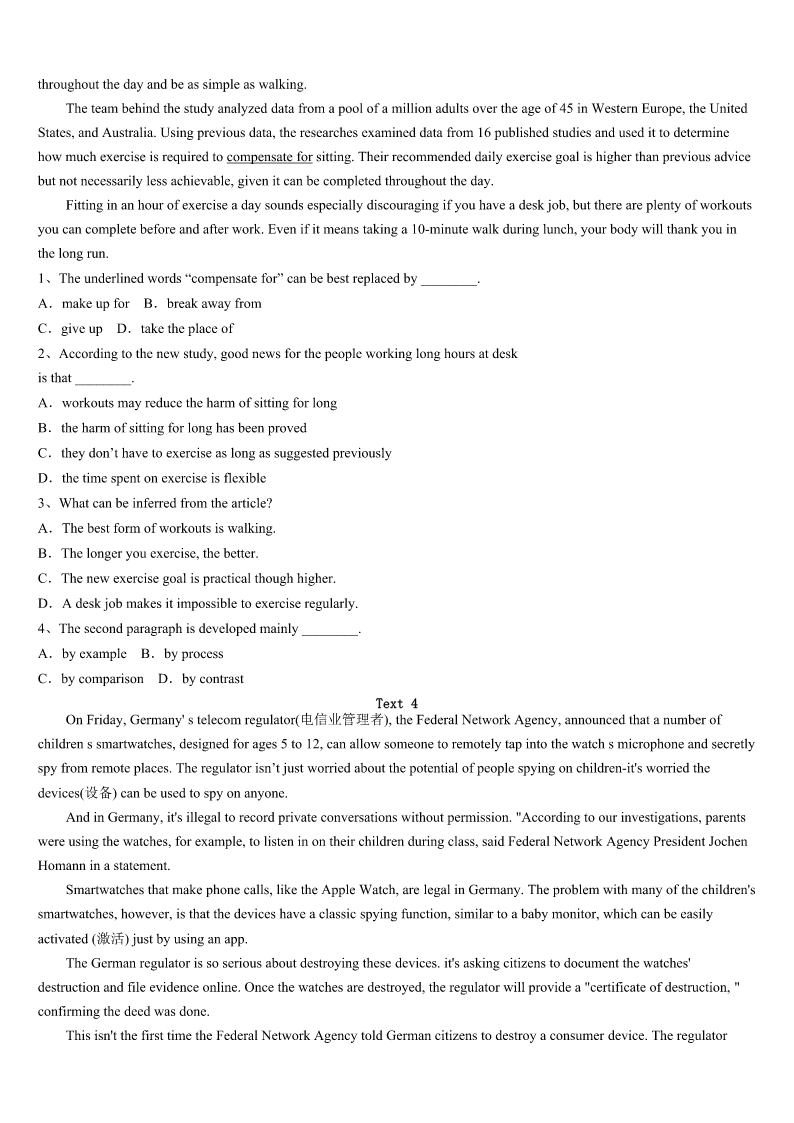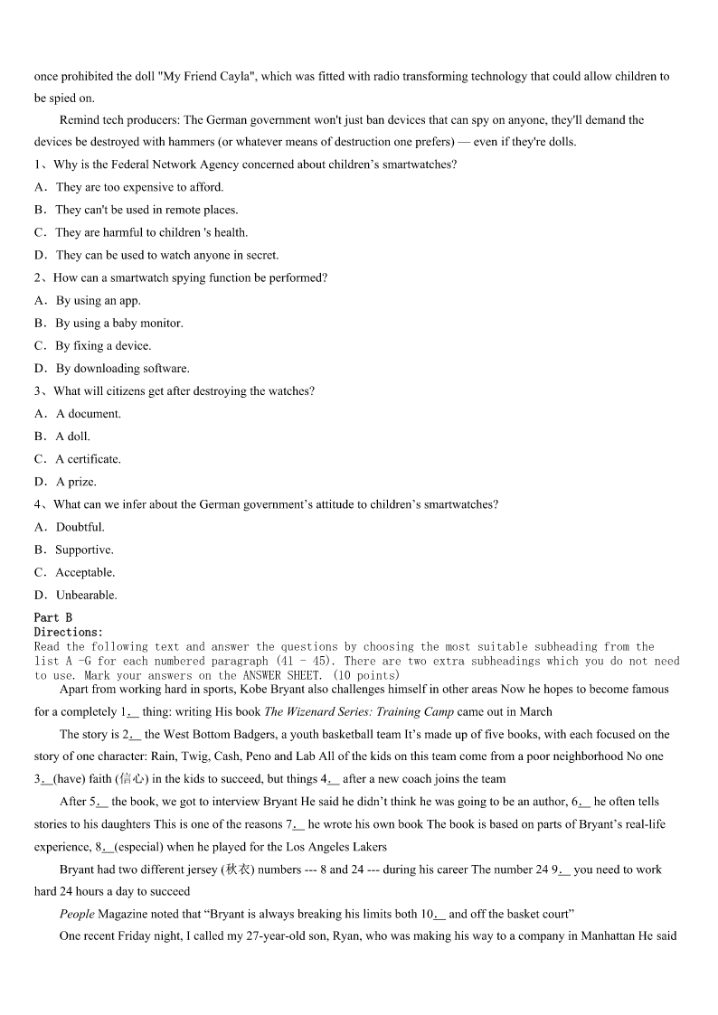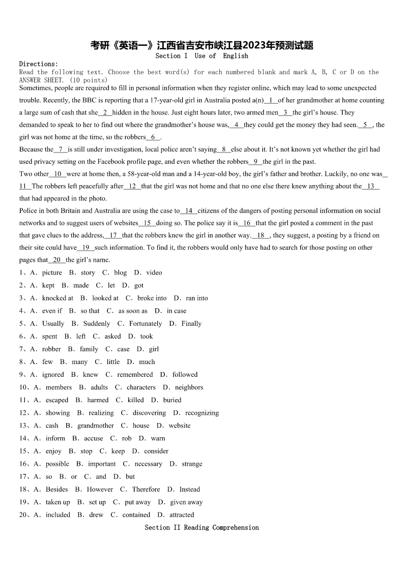 考研《英语一》江西省吉安市峡江县2023年预测试题 SectionIUseofEnglish Directions: Readthefollowingtext.Choosethebestword(s)foreachnumberedblankandmarkA,B,CorDonthe ANSWERSHEET.(10points) Sometimes,peoplearerequiredtofillinpersonalinformationwhentheyregisteronline,whichmayleadtosomeunexpected trouble.Recently,theBBCisreportingthata17-year-oldgirlinAustraliaposteda(n)1ofhergrandmotherathomecounting alargesumofcashthatshe2hiddeninthehouse.Justeighthourslater,twoarmedmen3thegirl’shouse.They demandedtospeaktohertofindoutwherethegrandmother’shousewas,4theycouldgetthemoneytheyhadseen.5,the girlwasnothomeatthetime,sotherobbers6. Becausethe7isstillunderinvestigation,localpolicearen’tsaying8elseaboutit.It’snotknownyetwhetherthegirlhad usedprivacysettingontheFacebookprofilepage,andevenwhethertherobbers9thegirlinthepast. Twoother10wereathomethen,a58-year-oldmananda14-year-oldboy,thegirl’sfatherandbrother.Luckily,noonewas 11Therobbersleftpeacefullyafter12thatthegirlwasnothomeandthatnooneelsethereknewanythingaboutthe13 thathadappearedinthephoto. PoliceinbothBritainandAustraliaareusingthecaseto14citizensofthedangersofpostingpersonalinformationonsocial networksandtosuggestusersofwebsites15doingso.Thepolicesayitis16thatthegirlpostedacommentinthepast thatgavecluestotheaddress,17thattherobbersknewthegirlinanotherway.18,theysuggest,apostingbyafriendon theirsitecouldhave19suchinformation.Tofindit,therobberswouldonlyhavehadtosearchforthosepostingonother pagesthat20thegirl’sname. 1、A.pictureB.storyC.blogD.video 2、A.keptB.madeC.letD.got 3、A.knockedatB.lookedatC.brokeintoD.raninto 4、A.evenifB.sothatC.assoonasD.incase 5、A.UsuallyB.SuddenlyC.FortunatelyD.Finally 6、A.spentB.leftC.askedD.took 7、A.robberB.familyC.caseD.girl 8、A.fewB.manyC.littleD.much 9、A.ignoredB.knewC.rememberedD.followed 10、A.membersB.adultsC.charactersD.neighbors 11、A.escapedB.harmedC.killedD.buried 12、A.showingB.realizingC.discoveringD.recognizing 13、A.cashB.grandmotherC.houseD.website 14、A.informB.accuseC.robD.warn 15、A.enjoyB.stopC.keepD.consid
