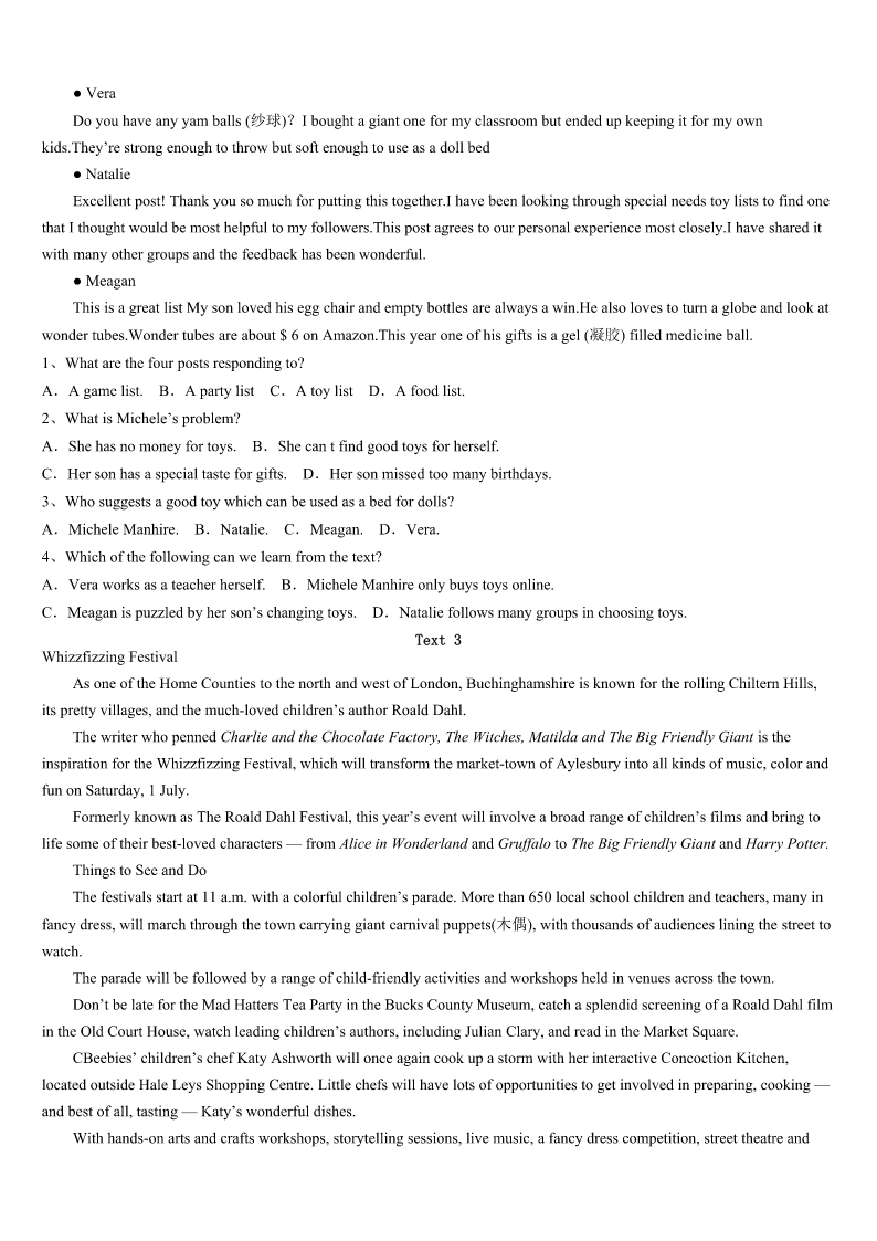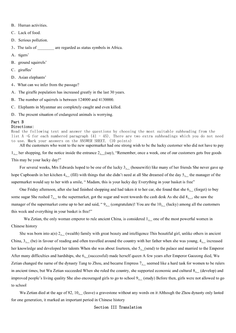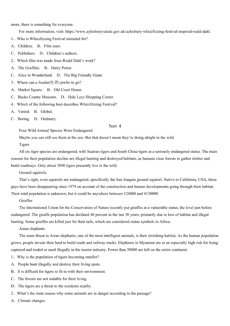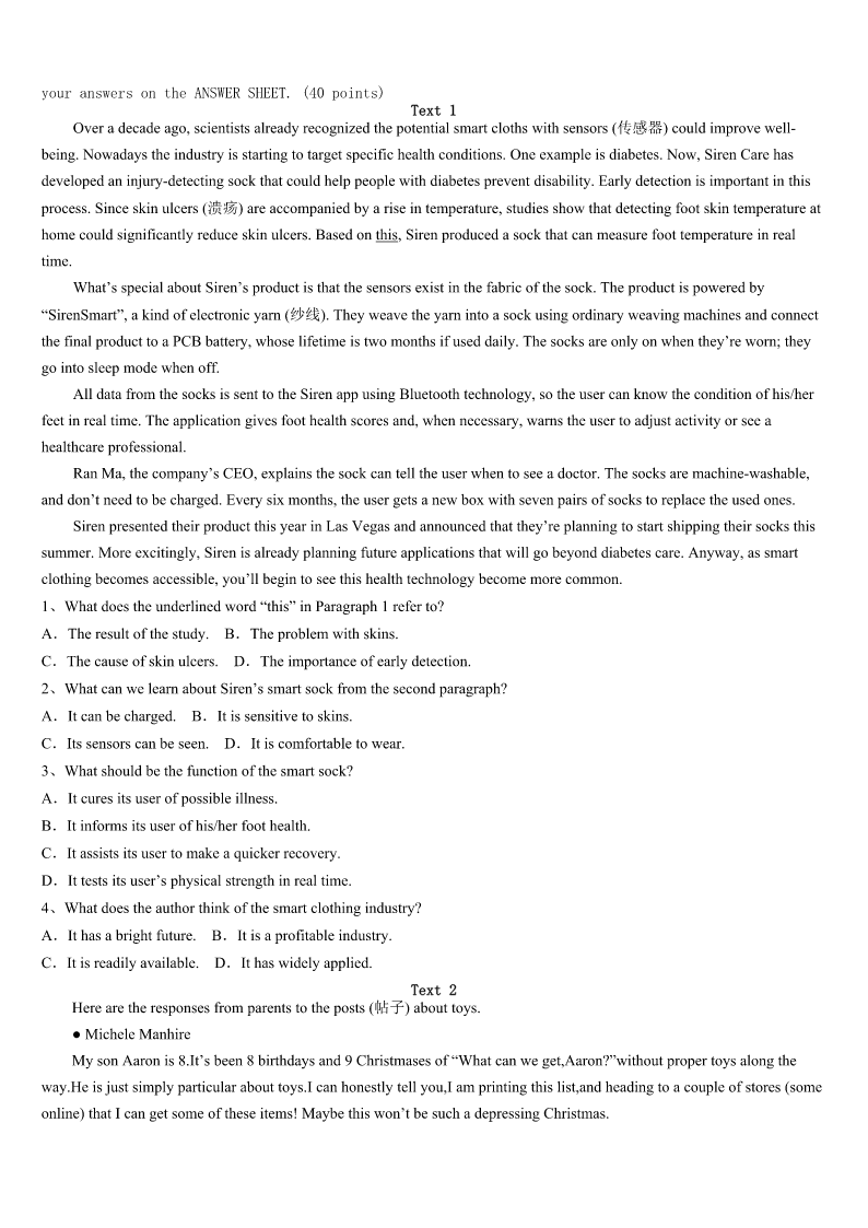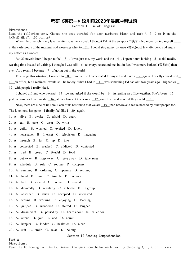 考研《英语一》汶川县2023年最后冲刺试题 SectionIUseofEnglish Directions: Readthefollowingtext.Choosethebestword(s)foreachnumberedblankandmarkA,B,CorDonthe ANSWERSHEET.(10points) WhenIleftmyjobinmylatetwentiestowriteanovel,IthoughtI’dhitthejackpot(中头彩).Nomoreforcingmyself1 attheearlyhoursofthemorningandworryingwhatto2.Icouldstayinmypajamas(睡衣)untillateafternoonandenjoy mycoffeeasIworked. But20novelslater,Ibegantofeel3.Itwasjustme,mywork,andthe4.Ispenthourslooking5socialmedia, wastingtimeinsteadofwriting.IthoughtIwasstill6toeveryonearoundme,butinfactIwasmoreisolated(孤独的)than ever.Asaresult,Ibecame7ofgoingoutintheworld. Tochangethissituation,Iwantedto8fromthelifeIhadcreatedformyselfandhavea9again.Ibrieflyconsidered 10anoffice,butIrealizedIwouldstillbelonely.WhatIhadin11wassomethingI’dhadallthoseyearsago—bigtables 12withpeopleIreallyliked. Iphonedafriendwhoworked13tooandaskedifshewouldbe14inrentinganofficetogether.She’dbeen15 justthesameasIhad,soshe16atthechance.Otherssoon17ourofficeandaskediftheycould18. Now,therearenineofushere.Eachofushasfoundthatweare19thanbeforeandwe’reneededbyotherpeopletoo. Thelonelinesshasgone—IfinallyfeellikeI20again. 1、A.aliveB.awakeC.afraidD.apart 2、A.eatB.takeC.wearD.write 3、A.guiltyB.worriedC.excitedD.lonely 4、A.newspaperB.InternetC.televisionD.magazine 5、A.throughB.forC.upD.into 6、A.connectedB.reachedC.addictedD.contacted 7、A.tiredB.proudC.fearfulD.fond 8、A.putawayB.stepawayC.giveawayD.takeaway 9、A.scheduleB.ruleC.routineD.company 10、A.runningB.orderingC.openingD.renting 11、A.handB.mindC.troubleD.common 12、A.laidB.clearedC.bookedD.shared 13、A.devotedlyB.regularlyC.athomeD.ingroup 14、A.absorbedB.stuckC.occupiedD.interested 15、A.feelingB.workingC.enjoyingD.learning 16、A.jumpedB.wonderedC.startedD.laughed 17、A.dreamedofB.passedbyC.heardaboutD.calledfor 18、A.attendB.joinC.addD.admit 19、A.happierB.kinderC.healthierD.nicer 20、A.suitB.smileC.relaxD.belong SectionIIReadingComprehension PartA Directions: Readthefollowingfourtexts.Answerthequestionsbeloweachtextbycho