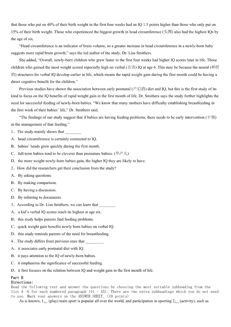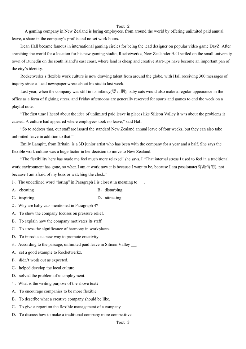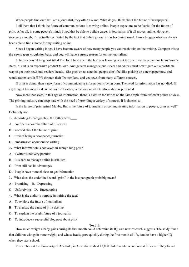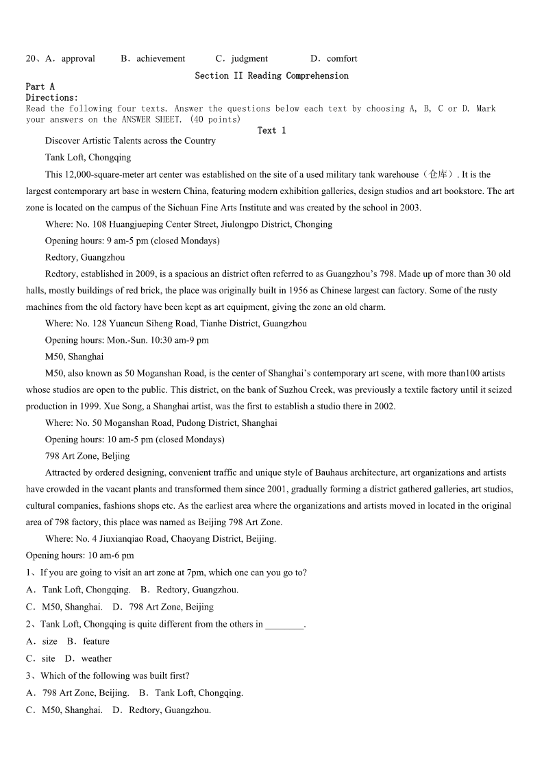 考研《英语一》河北省保定市涞源县2023年押题密卷 SectionIUseofEnglish Directions: Readthefollowingtext.Choosethebestword(s)foreachnumberedblankandmarkA,B,CorDonthe ANSWERSHEET.(10points) Myfatherwasahighlyeducated,intelligentgentleman.Hecoulddebateordiscussfor1onalmostanytopicand holdyourattentionintheprocess.Ithoughttherewas2hewasn'tabletodo. Afewdays3myyoungerbrother's7thbirthday,Dadplannedtoputtogetherashinynew4asaspecialbirthday surprise.Afternearlyanhourof5theinstructions,Dadwasstillunabletoputthenewbiketogether.Laterhefoldedupthe paperofinstructions,6histoolbox,anddecidedtotakethebikebacktothelocaltoystoreandpayextramoneytohaveit 7assembled(组装)there.Then,a(n)8cametohim,ashecalledouttoLovett,thequietlittlemanwhomowedour grassland. "Lovett,haveyoueverassembledaboy'sbicycle?"AsLovettwalkedtowardsthebike,Dadhandedhimthepaperof instructions.Lovetthandedit9tohim,saying,"No,thanks.Ican'tread.Whenyoucan'tread,youhaveto10."Less than15minuteslater,thenewbicyclewasfullyassembled,withnospareparts11.DadshookLovett'shand,pattedhimon theback,thankedhimandhidthebike. Onthenightaftermybrother12hissimlynewgift.Dadannouncedatthefamilydinnertable13hadhappened severaldaysearlier.Hetookgreatdelightintellingit14---heuseditasanexampleofthinking. Hedidnot15illiteracy(文盲),butstronglytaughtustouseour16.Thejokewasonmyfather,17hewasable toturnitintoalearningtool,andIlikedhimeven18aftertheincident.IalsogainedarespectforLovett.Tomehehad alwaysbeentheoldyardmanwhodidn'tsaymuch,butafterthatday,heseemedtosmile19,evenwalktaller.It'samazing whatarealnodof20candotoliftpeopleup. 1、A.minutesB.secondsC.hoursD.years 2、A.nothingB.everythingC.somethingD.onething 3、A.afterB.agoC.beforeD.during 4、A.toyB.carC.vehicleD.bike 5、A.writingB.readingC.hearingD.explaining 6、A.tookupB.pickedupC.heldupD.gaveup 7、A.simplyB.deliberatelyC.evidentlyD.correctly 8、A.plotB.sceneC.ideaD.story 9、A.backB.inC.outD.down 10、A.quitB.stopC.argueD.think 11、A.remainingB.remainedC.spottedD.losing 12、A.designedB.boughtC.decoratedD.received 13、A.whatB.thatC
