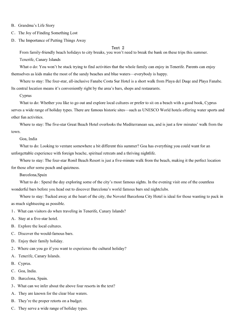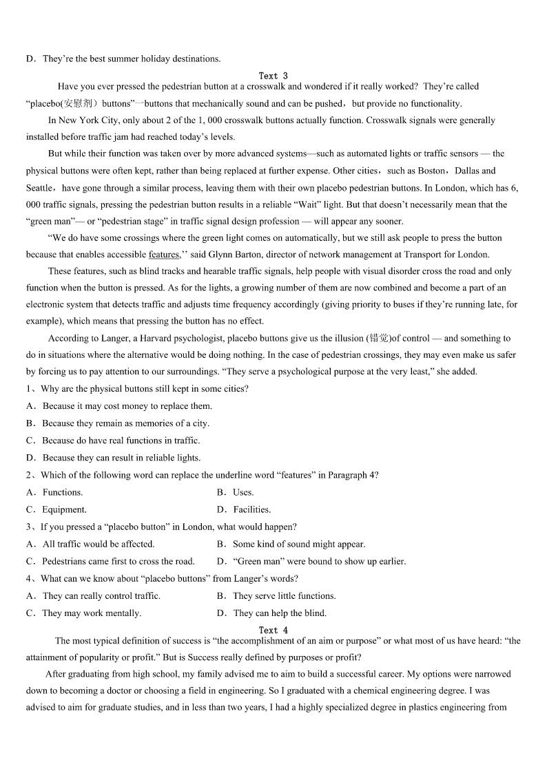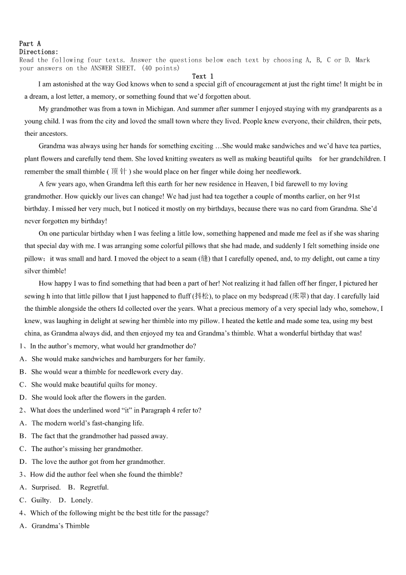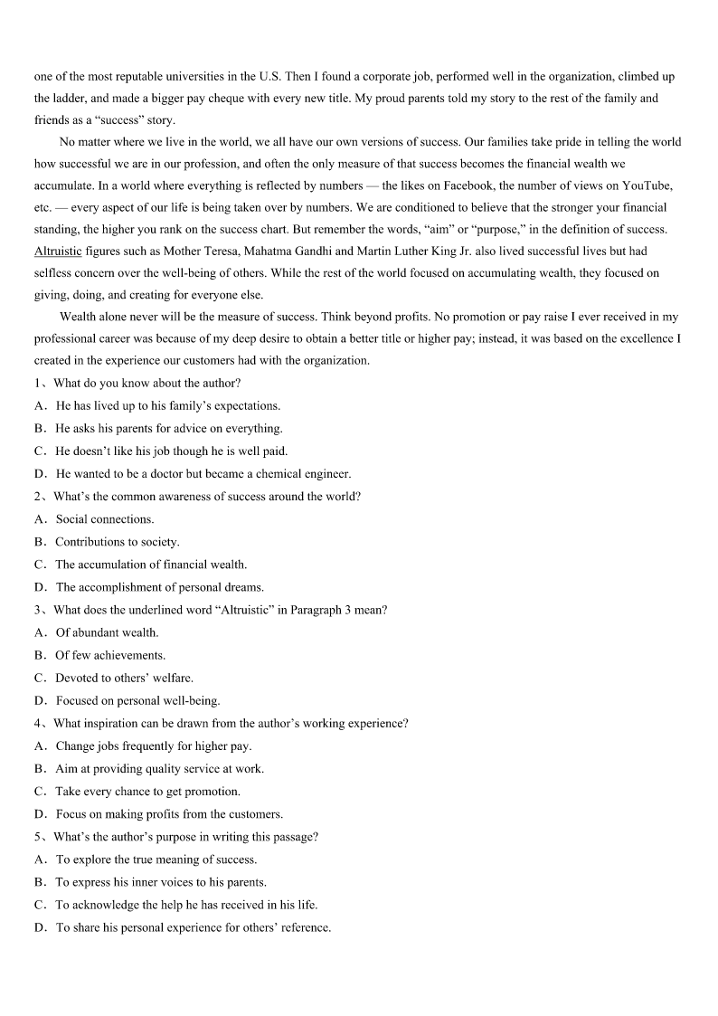 考研《英语一》河北省沧州市运河区2023年预测试题 SectionIUseofEnglish Directions: Readthefollowingtext.Choosethebestword(s)foreachnumberedblankandmarkA,B,CorDonthe ANSWERSHEET.(10points) 阅读下面短文,从短文后各题所给的四个选项(A、B、C和D)中,选出可以填入空白处的最佳选项,并在答题卡上 将该项涂黑。 ItwasmysisterSandra’sfirstChristmaswithoutherhusband.LastThursday,shewasinthestore1foranidealcardforher twosonsanddaughter.Timepassedbyquicklyasshe___________themanychoices.Shewantedacardthatsentsomething2 toeachofthem,assheknewtheywouldhavea(n)3placeintheirheartthisholidayseason. Finally,shefoundtheonethatexpressedthe4feeling.5,asharppainpierced(穿透)herheartwhensherealizedthatthe cardwas6“momanddad”.Shestood,holdingitcloseforalongtime,unabletomovefromthespot.___________beganto runoverhercheeks. “IstheresomethingIcandoforyou?”a7voiceasked.She8ofaceastranger,awoman.“Uh..oh...OH!”Sandra9,“I can’tgivethiscardtomychildrenbecause…becausemyhusbanddiedandthisisthe10card.” Thestranger’sfacesoftenedwith11andlove.Shereachedoutand12mysisterintoherarms,givingher unspoken___________tocryintheprotectionofherembrace(拥抱).She13heldmysisteruntilher14returned. DuringhertellingofthiseventIwasfeeling15thatIhadn’tbeenthere.Mysisterneededmeandastrangerhadtodomy 16“Youknow,”shewenton,“afriendsuggestedthatitwaslikemeetingwithanAngel.”Myguilt17inaninstant.My sisterrequiredanAngel,andIthinkthatisexactlywhatshegot. 1、A.payingB.caringC.callingD.looking 2、A.leftB.offeredC.readD.discovered 3、A.attractiveB.specialC.traditionalD.wealthy 4、A.unknownB.emptyC.safeD.different 5、A.sadB.strangeC.amazingD.perfect 6、A.HoweverB.ThereforeC.AnyhowD.Otherwise 7、A.forB.toC.fromD.by 8、A.TearsB.SweatsC.LightsD.Smiles 9、A.firmB.proudC.coldD.soft 10、A.walkedB.turnedC.decidedD.woke 11、A.respondedB.demandedC.askedD.explained 12、A.delicateB.oldC.wrongD.decorative 13、A.devotionB.respectC.sympathyD.responsibility 14、A.pulledB.caughtC.sentD.threw 15、A.thoughtB.permissionC.sorrowD.suggestion 16、A.quietlyB.tightlyC.eagerlyD.seriously 17、A.confidenceB.courageC.happinessD.calmness 18、A.shockedB.angryC.shyD