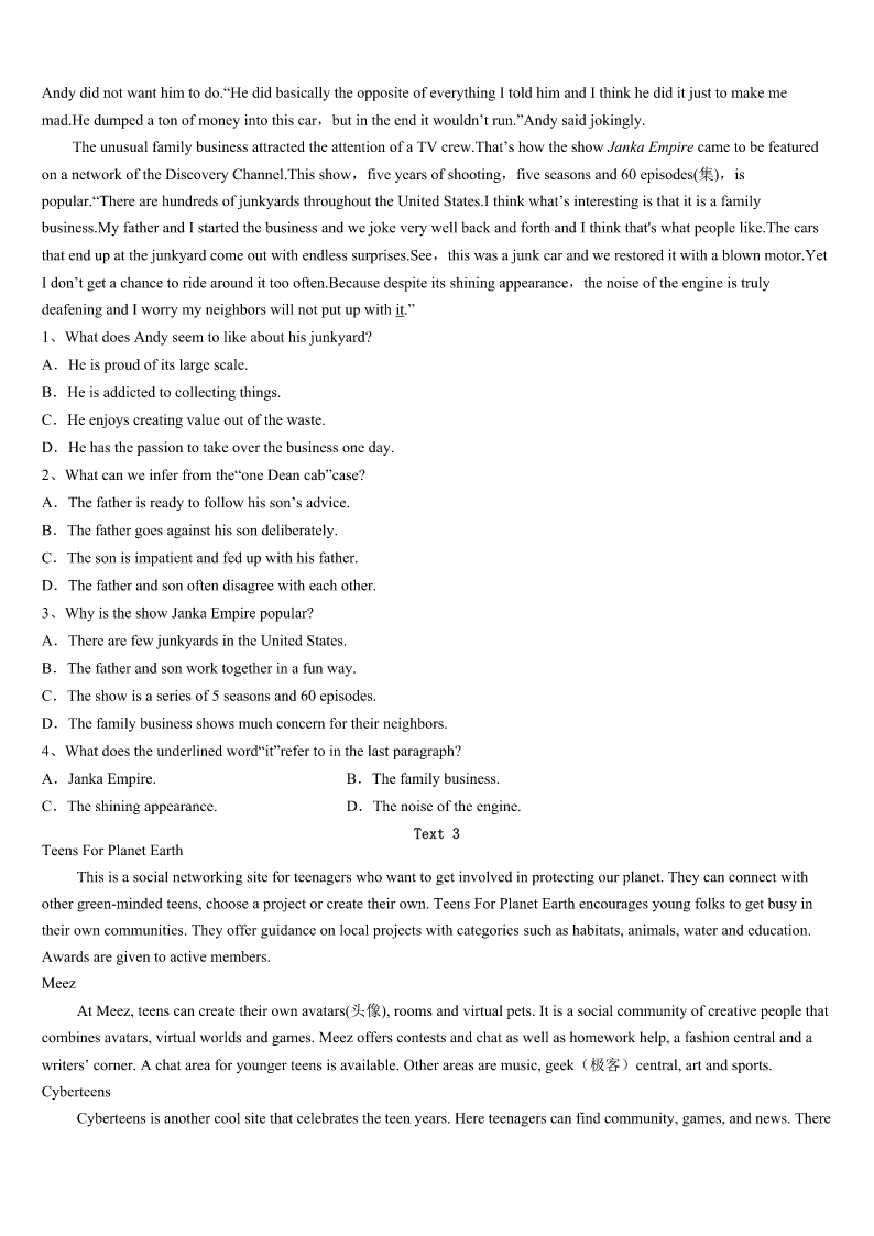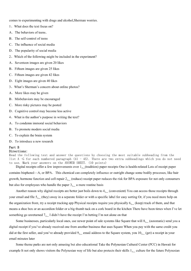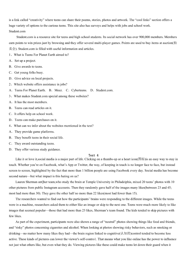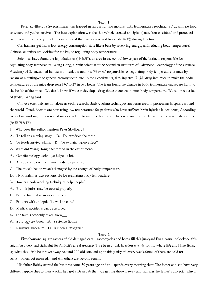 2023年广西壮族南宁市邕宁区考研《英语一》考前冲刺预测试卷 SectionIUseofEnglish Directions: Readthefollowingtext.Choosethebestword(s)foreachnumberedblankandmarkA,B,CorDonthe ANSWERSHEET.(10points) LeonardodaVincibeganpaintingtheMonaLisain1503.Hewasworking1aspecialpaintingforachurchatthattime, 2thechurchpaintingwasnot3well.AnItalianbusinessmanaskeddaVincitopaintapictureofhissecond4.Thisis thewomanwho5beseenintheMonaLisa. Allinall,theMonaLisaisaverygoodexampleofdaVinci's6,anditsatisfiedthehusband.DaVinciused7and lightinaclever8inthepainting. DaVincilovedscienceand9Rightawayapersoncanseethatthereisalotofgeometry(几何形状)intheMonaLisa. ThefaceoftheMonaLisaismadeofmanycirclesand10shapeslike11.Evenher12canbeseenasasmallpartofa largecircle. Thewomaninthe13issittingonabalcony(阳台),and14canbeseenbehindherbecauseDaVincilovedtostudy rocks,andthesecanbeseen15inhisotherpaintings.Thewomanissittingwithherknees16theside.Herheadisturned tolookoutofthepainting.Herhandsare17togetherinfrontofher.Thiswayof18isnowusedbymany19whenthey are20.TheMonaLisaisaremarkablemaster. 1、A.aboutB.upC.inD.on 2、A.solongasB.butC.inspiteofD.however 3、A.workingB.doingC.goingD.making 4、A.wifeB.servantC.daughterD.nurse 5、A.canB.mustC.shouldD.might 6、A.novelsB.photosC.worksD.masterpiece 7、A.darknessB.oilsC.heavinessD.blank 8、A.handB.eyeC.wayD.picture 9、A.geographyB.biologyC.chemistryD.maths 10、A.longB.circularC.squareD.round 11、A.cigarsB.packetsC.diamondsD.balls 12、A.emotionB.patternC.preferenceD.smile 13、A.paintingB.cottageC.exhibitionD.canvas 14、A.sparrowB.mountainsC.landscapeD.kitten 15、A.that’stosayB.overandoverC.ontheotherhandD.byandby 16、A.onB.byC.toD.beyond 17、A.hungB.caughtC.heldD.supported 18、A.sittingB.paintingC.livingD.smiling 19、A.modelsB.femalesC.bridegroomsD.brides 20、A.playedB.beingpaintedC.paintingD.beingplayed SectionIIReadingComprehension PartA Directions: Readthefollowingfourtexts.AnswerthequestionsbeloweachtextbychoosingA,B,CorD.Mark youranswersontheANSWERSHEET.(40points) Text1 PeterSkyllberg,aSwedishman,wastrappedinhisc