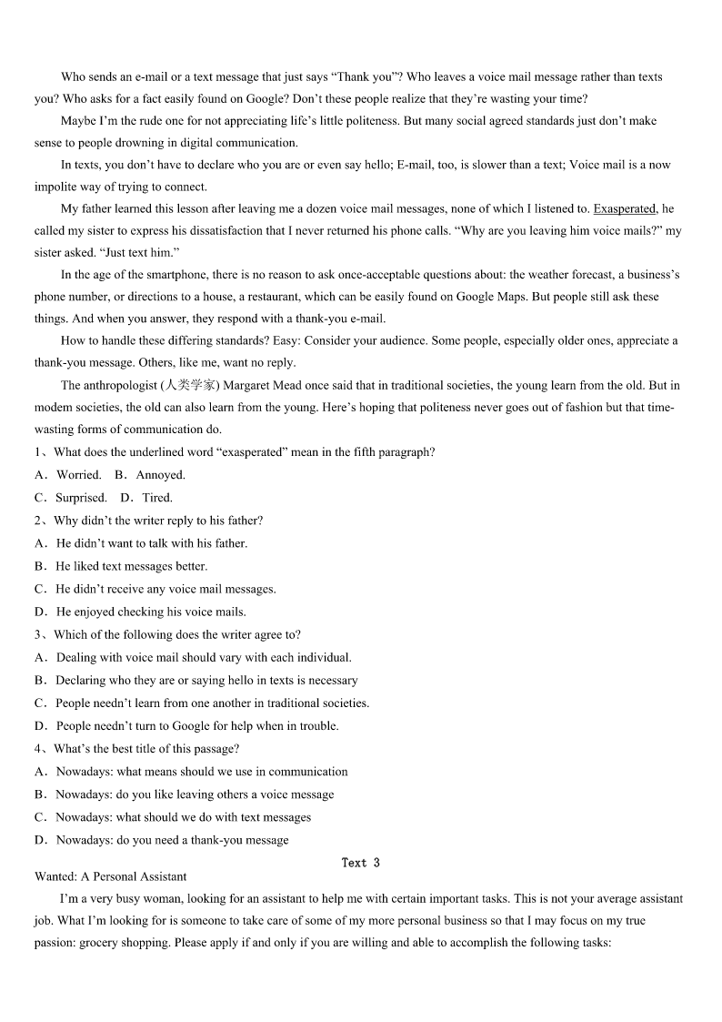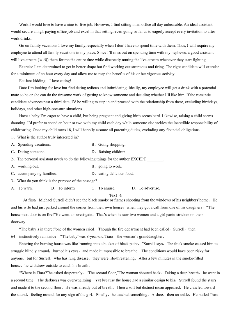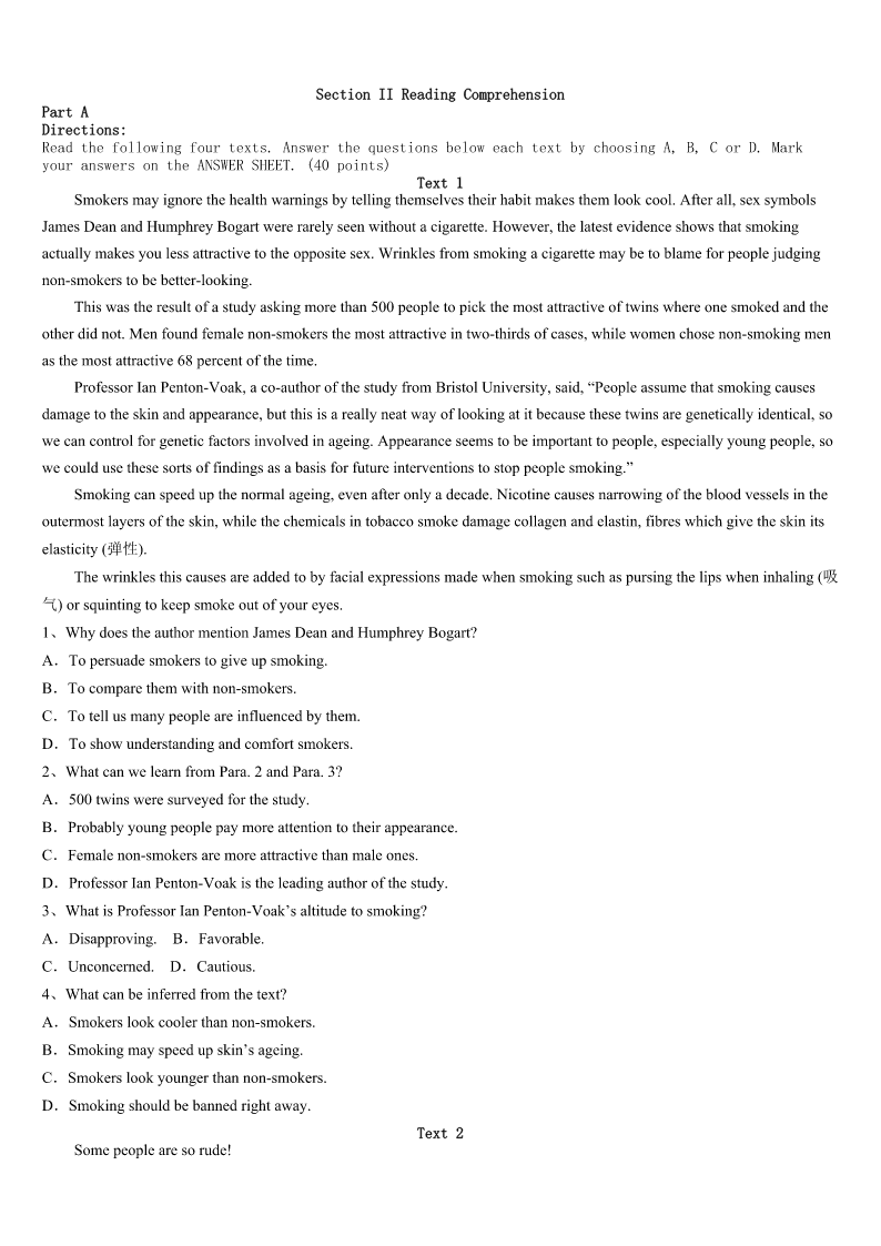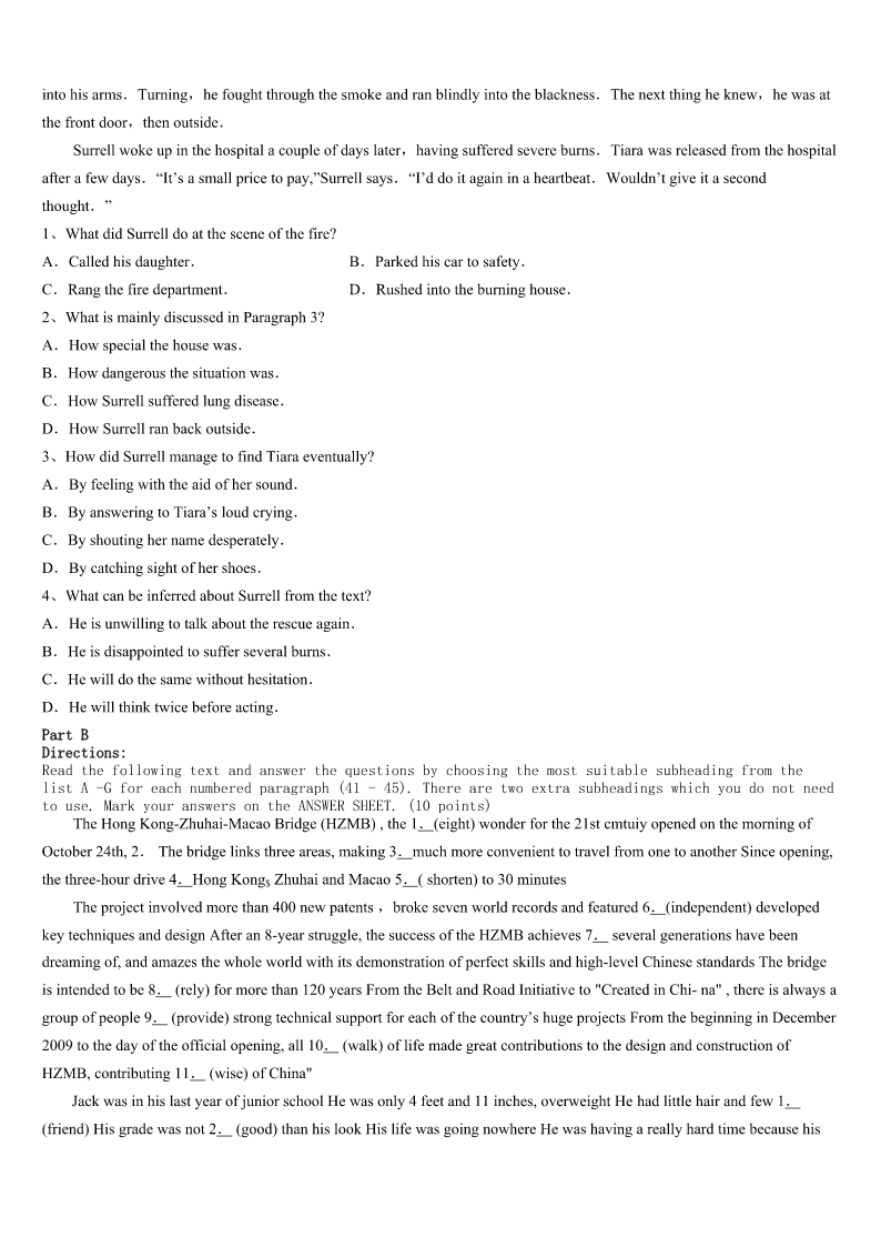 考研《英语一》海安县2023年点睛提分卷 SectionIUseofEnglish Directions: Readthefollowingtext.Choosethebestword(s)foreachnumberedblankandmarkA,B,CorDonthe ANSWERSHEET.(10points) WhenIwasyoungIlovedtakingpartinhighschoolmusicals.Ilovedto1.Inoneproduction,Iauditioned(试音)like 2else.Mymusicteacherwas38thatIwouldgetaparticularpartinthemusicdrama.ThepartIthoughtIhadwasa3lead whosangsomeofthemostbeautifullovesongs. Butonedaytheshowdirectorpulledmeaside.Iwas4tobeofferedtheleadingrole.Tomydisappointment,hesaid,“Bob,I foundaboywithanexcellentvoice.Ineedtogivethe5tohim.” FromthatmomentonIbeganhatingmusicclass.I6thatIdidn’tlikewhatweweresinging.Mymusicteacherdidn’tknow why.She7meinfrontoftheclassandtoldmeIhadchanged.Shedidn’tknowwhatIhadbeentold.Butwhenthey8the finalists,Iwasgivena9role.Forsometimemypridewas10withhavingtodosomethingIdidn’tthinkIshouldbe doing.ButIdidit.TheminorroleIhad11tobemuchmorefunthanIhadexpected.Myperformanceeven12mybrother whowasalsointheaudience. Lifeisreallylikea13andalthoughwedonotauditionfortherole,eachofusis14bythedirectortoplayacertainpartin it.The15isthatwesometimesdon’tlikethepartwearegiven.LikemeinhighschoolIbecame16-–ifIcouldn’tbethe lead,Iwouldn’tshowupforrehearsal(彩排). Thenwewonderwhywefeelso17Sometimeswedon’tevenfeellikeweareapartofthe“BigShow.”Everyonedoes indeedhavearole.Someareinfrontofthecurtain,somearebehind,butallare18fortheshowtogoon.All19tosuccess nomatterhowminorthepartis. 1、A.debateB.broadcastC.singD.show 2、A.someoneB.everyoneC.anyoneD.noone 3、A.prejudicedB.concernedC.unexpectedD.convinced 4、A.romanticB.ridiculousC.mysteriousD.sensitive 5、A.attemptingB.expectingC.volunteeringD.pretending 6、A.partB.dealC.favorD.item 7、A.assessedB.advocatedC.concludedD.complained 8、A.warnedB.scoldedC.informedD.suspected 9、A.presentedB.identifiedC.announcedD.delivered 10、A.specificB.superC.slightD.small 11、A.strugglingB.competingC.swingingD.changing 12、A.happenedB.provedC.expandedD.switched 13、A.terrified:B.disappointedC.surprisedD.embarrassed 14、A.jokeB.journeyC.stageD
