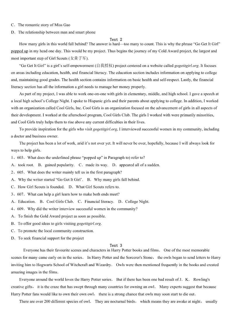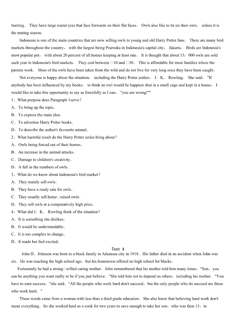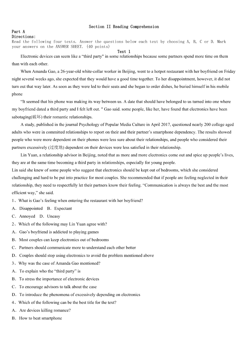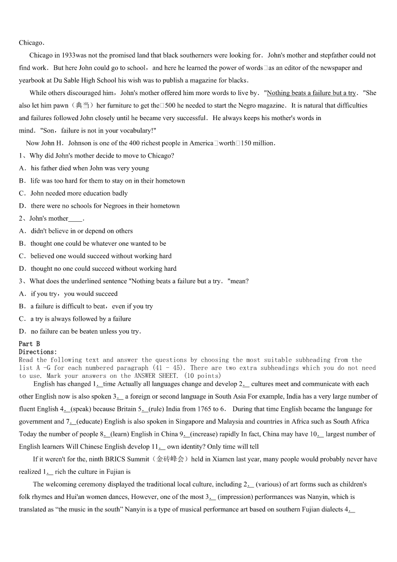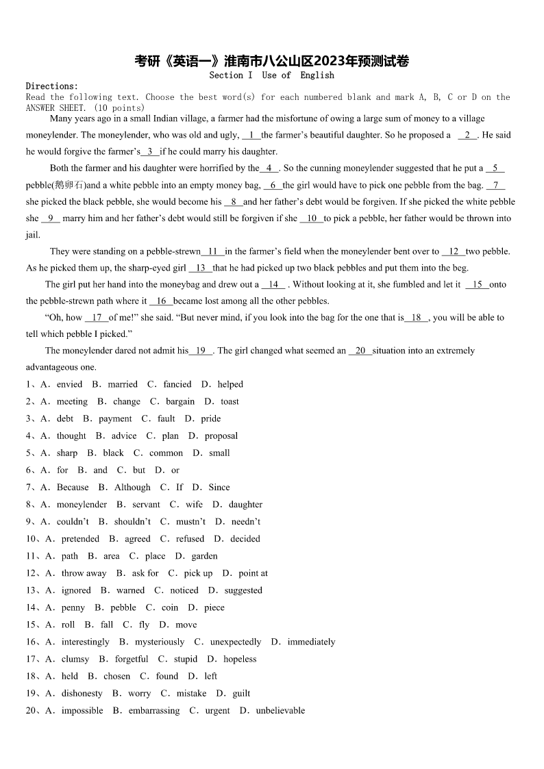 考研《英语一》淮南市八公山区2023年预测试卷 SectionIUseofEnglish Directions: Readthefollowingtext.Choosethebestword(s)foreachnumberedblankandmarkA,B,CorDonthe ANSWERSHEET.(10points) ManyyearsagoinasmallIndianvillage,afarmerhadthemisfortuneofowingalargesumofmoneytoavillage moneylender.Themoneylender,whowasoldandugly,1thefarmer’sbeautifuldaughter.Soheproposeda2.Hesaid hewouldforgivethefarmer’s3ifhecouldmarryhisdaughter. Boththefarmerandhisdaughterwerehorrifiedbythe4.Sothecunningmoneylendersuggestedthatheputa5 pebble(鹅卵石)andawhitepebbleintoanemptymoneybag,6thegirlwouldhavetopickonepebblefromthebag.7 shepickedtheblackpebble,shewouldbecomehis8andherfather’sdebtwouldbeforgiven.Ifshepickedthewhitepebble she9marryhimandherfather’sdebtwouldstillbeforgivenifshe10topickapebble,herfatherwouldbethrowninto jail. Theywerestandingonapebble-strewn11inthefarmer’sfieldwhenthemoneylenderbentoverto12twopebble. Ashepickedthemup,thesharp-eyedgirl13thathehadpickeduptwoblackpebblesandputthemintothebeg. Thegirlputherhandintothemoneybaganddrewouta14.Withoutlookingatit,shefumbledandletit15onto thepebble-strewnpathwhereit16becamelostamongalltheotherpebbles. “Oh,how17ofme!”shesaid.“Butnevermind,ifyoulookintothebagfortheonethatis18,youwillbeableto tellwhichpebbleIpicked.” Themoneylenderdarednotadmithis19.Thegirlchangedwhatseemedan20situationintoanextremely advantageousone. 1、A.enviedB.marriedC.fanciedD.helped 2、A.meetingB.changeC.bargainD.toast 3、A.debtB.paymentC.faultD.pride 4、A.thoughtB.adviceC.planD.proposal 5、A.sharpB.blackC.commonD.small 6、A.forB.andC.butD.or 7、A.BecauseB.AlthoughC.IfD.Since 8、A.moneylenderB.servantC.wifeD.daughter 9、A.couldn’tB.shouldn’tC.mustn’tD.needn’t 10、A.pretendedB.agreedC.refusedD.decided 11、A.pathB.areaC.placeD.garden 12、A.throwawayB.askforC.pickupD.pointat 13、A.ignoredB.warnedC.noticedD.suggested 14、A.pennyB.pebbleC.coinD.piece 15、A.rollB.fallC.flyD.move 16、A.interestinglyB.mysteriouslyC.unexpectedlyD.immediately 17、A.clumsyB.forgetfulC.stupidD.hopeless 18、A.heldB.chosenC.foundD.left