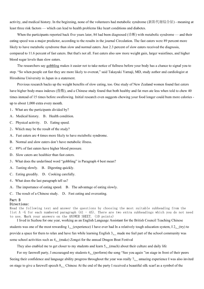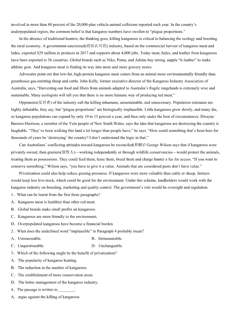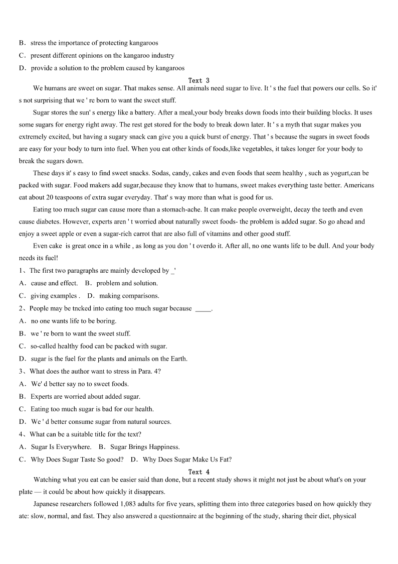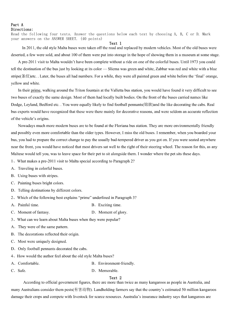 考研《英语一》淮安市清河区2023年高分冲刺试卷 SectionIUseofEnglish Directions: Readthefollowingtext.Choosethebestword(s)foreachnumberedblankandmarkA,B,CorDonthe ANSWERSHEET.(10points) WhenMercadodreamedofbecomingaprofessionalmodel,shesurfedtheInternetforsomeonewithaphysicaldisability inthemodelingworld.Thatwaseightyearsago,whendisabledmodelswere1.Thus,hersearch2empty. “Ididn’tthinkitwasa3.That’snotbecauseIwasn’tworthyofit,butbecauseIdidn’tsee4elselikemeoutthere.” However,Mercado,whowasdiagnosedwithspasticmusculardystrophy(肌肉萎缩症)asateen,hashelped5thatreality becauseofnotgivingup.Lastyear,MercadosignedwithIMGModels,thepowerhouseagencythat6topsupermodels, “There’s7beenaproblemwiththeteamnotgettingwhattheyneedtogetfromme.There’sneverbeena(n)8-‘she hasadisability,thisisnotgoingtoworkbecausethephotoswon’tlooknice.’”Shesays.“IfI’ma9,aclothingcompany wantstodisplaytheirclothes10me.That’sallitshouldbe.” Hersmallbodyhasmorethanadozensurgical11andshefeltbothnervousandex-citedwhenshedecidedlastyearto 12themforalingerie(内衣)company.“13I’mveryoutspokenwithwhatIbelievein.I’mverymuchofa14person stillatheart.ButIwantedto15anewchallenge.”Sheliked16peoplethateveryonecanfeelattractiveintheirown skin,“Youshouldn’tbeashamedofyourown17. Inthemeantime,she’sfocusedonusingherblogtoencouragethosewhowanttofollowherexample.She18her successtoconfidence,faithandnever19.“Iturnedmyweaknessintomystrength.I’ma(n)20thatyoucandowhatyou want,because…”shepauses,“Justbecause!That’sit.Youjustcan!” 1、A.popularB.commonC.reservedD.scarce 2、A.cameupB.putupC.heldupD.lookedup 3、A.responsibilityB.possibilityC.stabilityD.flexibility 4、A.nothingB.nobodyC.anythingD.anyone 5、A.escapeB.proveC.changeD.avoid 6、A.rejectsB.representsC.praisesD.complains 7、A.everB.justC.neverD.even 8、A.suggestionB.excuseC.assessmentD.notice 9、A.modelB.directorC.designerD.manager 10、A.onB.inC.aroundD.beside 11、A.symptomsB.marksC.scarsD.wounds 12、A.growB.bareC.hideD.cover 13、A.AsthoughB.AsusualC.EversinceD.Eventhough 14、A.ambitiousB.kindC.shyD.active 15、A.resistB