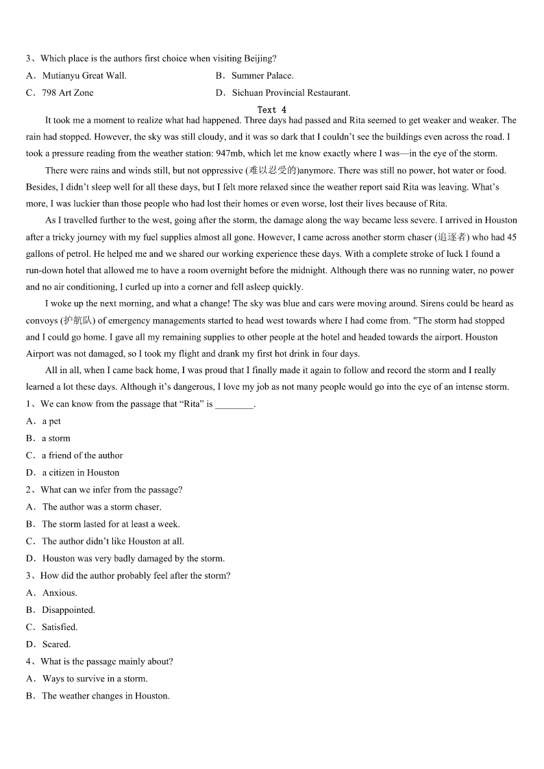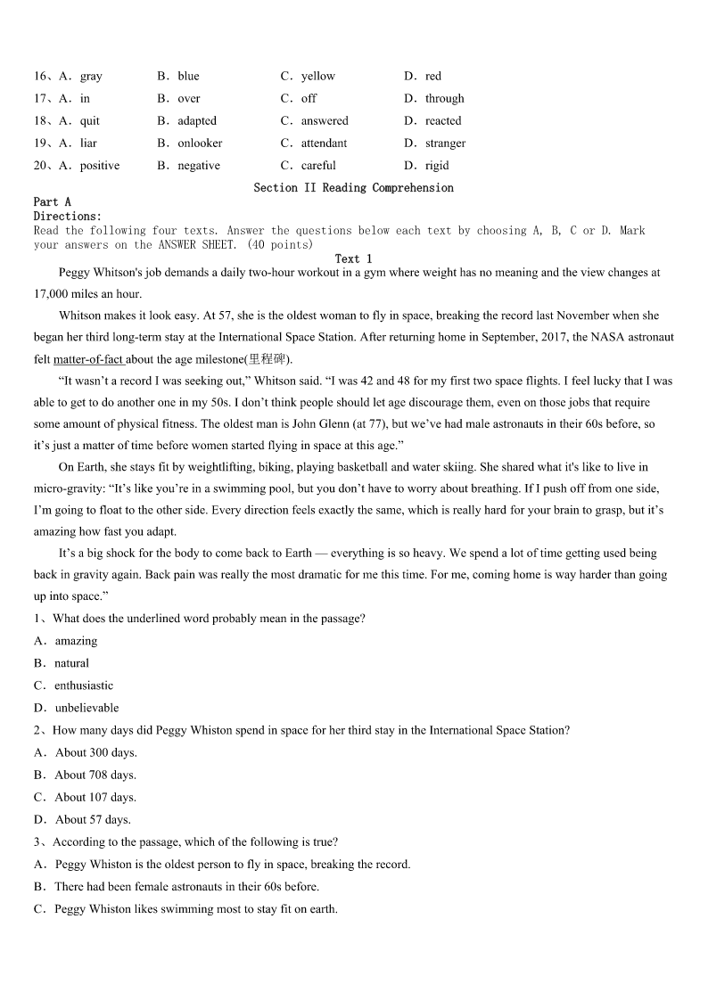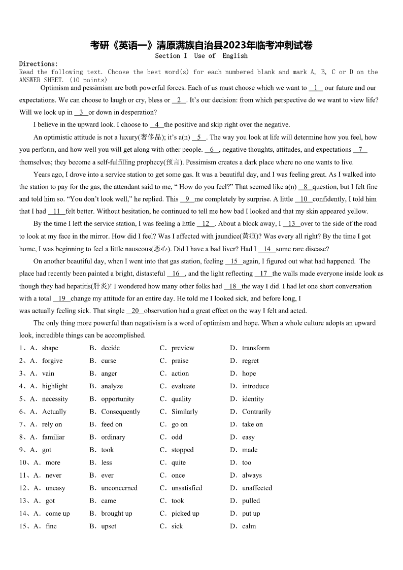 考研《英语一》清原满族自治县2023年临考冲刺试卷 SectionIUseofEnglish Directions: Readthefollowingtext.Choosethebestword(s)foreachnumberedblankandmarkA,B,CorDonthe ANSWERSHEET.(10points) Optimismandpessimismarebothpowerfulforces.Eachofusmustchoosewhichwewantto1ourfutureandour expectations.Wecanchoosetolaughorcry,blessor2.It’sourdecision:fromwhichperspectivedowewanttoviewlife? Willwelookupin3ordownindesperation? Ibelieveintheupwardlook.Ichooseto4thepositiveandskiprightoverthenegative. Anoptimisticattitudeisnotaluxury(奢侈品);it’sa(n)5.Thewayyoulookatlifewilldeterminehowyoufeel,how youperform,andhowwellyouwillgetalongwithotherpeople.6,negativethoughts,attitudes,andexpectations7 themselves;theybecomeaself-fulfillingprophecy(预言).Pessimismcreatesadarkplacewherenoonewantstolive. Yearsago,Idroveintoaservicestationtogetsomegas.Itwasabeautifulday,andIwasfeelinggreat.AsIwalkedinto thestationtopayforthegas,theattendantsaidtome,“Howdoyoufeel?”Thatseemedlikea(n)8question,butIfeltfine andtoldhimso.“Youdon’tlookwell,”hereplied.This9mecompletelybysurprise.Alittle10confidently,Itoldhim thatIhad11feltbetter.Withouthesitation,hecontinuedtotellmehowbadIlookedandthatmyskinappearedyellow. BythetimeIlefttheservicestation,Iwasfeelingalittle12.Aboutablockaway,I13overtothesideoftheroad tolookatmyfaceinthemirror.HowdidIfeel?WasIaffectedwithjaundice(黄疸)?Waseveryallright?BythetimeIgot home,Iwasbeginningtofeelalittlenauseous(恶心).DidIhaveabadliver?HadI14someraredisease? Onanotherbeautifulday,whenIwentintothatgasstation,feeling15again,Ifiguredoutwhathadhappened.The placehadrecentlybeenpaintedabright,distasteful16,andthelightreflecting17thewallsmadeeveryoneinsidelookas thoughtheyhadhepatitis(肝炎)!Iwonderedhowmanyotherfolkshad18thewayIdid.Ihadletoneshortconversation withatotal19changemyattitudeforanentireday.HetoldmeIlookedsick,andbeforelong,I wasactuallyfeelingsick.Thatsingle20observationhadagreateffectonthewayIfeltandacted. Theonlythingmorepowerfulthannegativismisawordofoptimismandhope.Whenawholecultureadoptsanupward look,i