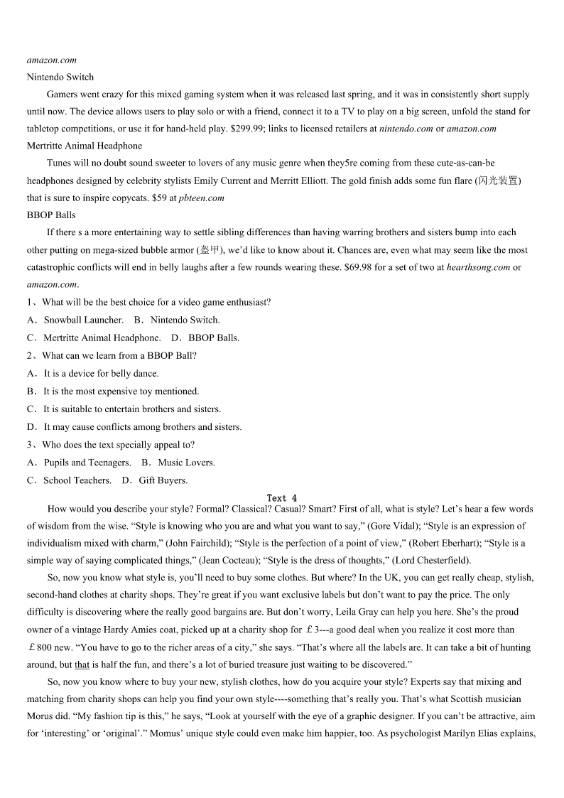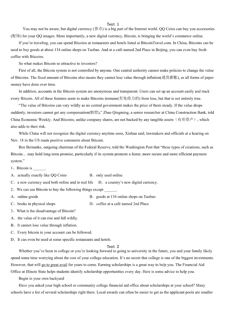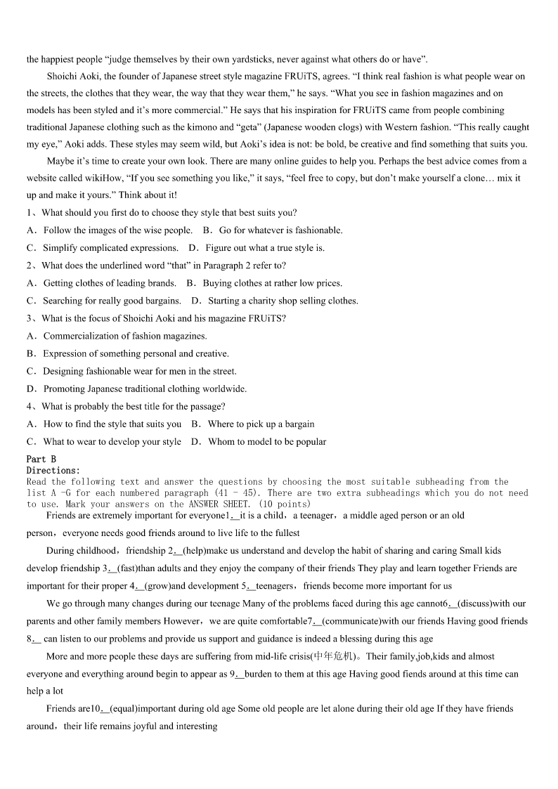 考研《英语一》湖北省十堰市房县2023年全真模拟试题 SectionIUseofEnglish Directions: Readthefollowingtext.Choosethebestword(s)foreachnumberedblankandmarkA,B,CorDonthe ANSWERSHEET.(10points) Bodylanguageisthequiet,secretandmostpowerfullanguageofall!Itspeaks1thanwords.Accordingto specialists,ourbodiessendoutmore2thanwerealize.Infact,non-verbal(非言语)communicationtakesupabout50%of whatwereally3.Andbodylanguageisparticularly4whenweattempttocommunicateacrosscultures.Indeed,whatis calledbodylanguageisso5apartofusthatit’sactuallyoftenunnoticed.Andmisunderstandingsoccurasaresultofit.6 ,differentsocietiestreatthe7betweenpeopledifferently.NorthernEuropeansusuallydonotlikehaving8contact(接触) evenwithfriends,andcertainlynotwith9.PeoplefromLatinAmericancountries,10,toucheachotherquitealot. Therefore,it’spossiblethatin11,itmaylooklikeaLatinois12aNorwegianallovertheroom.TheLatino,tryingto expressfriendship,willkeepmoving13.TheNorwegian,veryprobablyseeingthisaspushiness,willkeep14—which theLatinowillinreturnregardas15. Clearly,agreatdealisgoingonwhenpeople16.Andonlyapartofitisinthewordsthemselves.Andwhenpartiesare from17cultures,there’sastrongpossibilityof18.Butwhateverthesituation,thebest19istoobeytheGoldenRule: treatothersasyouwouldliketobe20. 1、A.straighterB.louderC.harderD.further 2、A.soundsB.invitationsC.feelingsD.messages 3、A.hopeB.receiveC.discoverD.mean 4、A.immediateB.misleadingC.importantD.difficult 5、A.wellB.farC.muchD.long 6、A.ForexampleB.ThusC.HoweverD.Inshort 7、A.tradeB.distanceC.connectionsD.greetings 8、A.eyeB.verbalC.bodilyD.telephone 9、A.strangersB.relativesC.neighborsD.enemies 10、A.inotherwordsB.ontheotherhandC.inasimilarwayD.byallmeans 11、A.troubleB.conversationC.silenceD.experiment 12、A.disturbingB.helpingC.guidingD.following 13、A.closerB.fasterC.inD.away 14、A.steppingforwardB.goingonC.backingawayD.comingout 15、A.weaknessB.carelessnessC.friendlinessD.coldness 16、A.talkB.travelC.laughD.think 17、A.differentB.EuropeanC.LatinoD.rich 18、A.curiosityB.excitementC.misunderstandingD.nervousness 19、A
