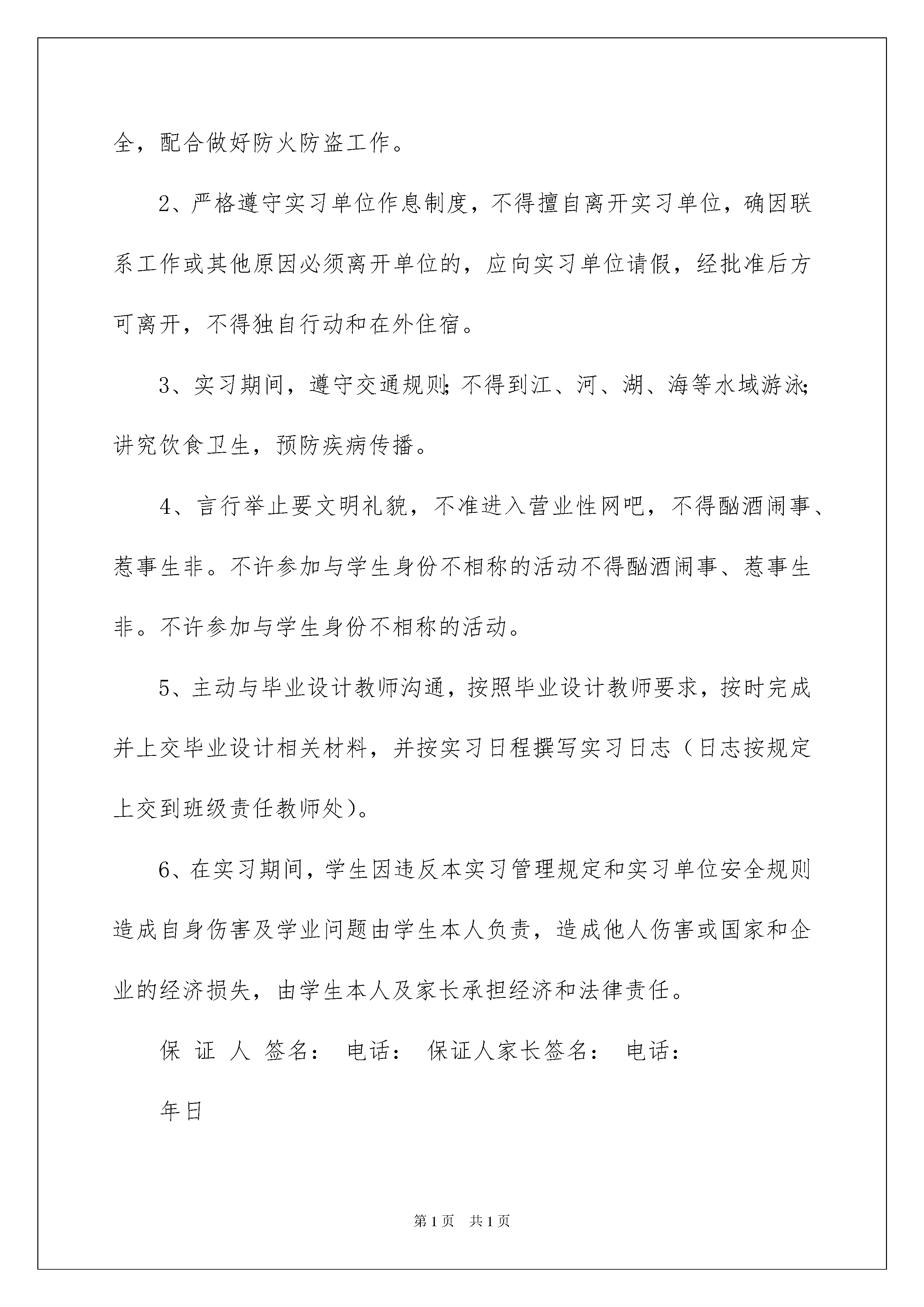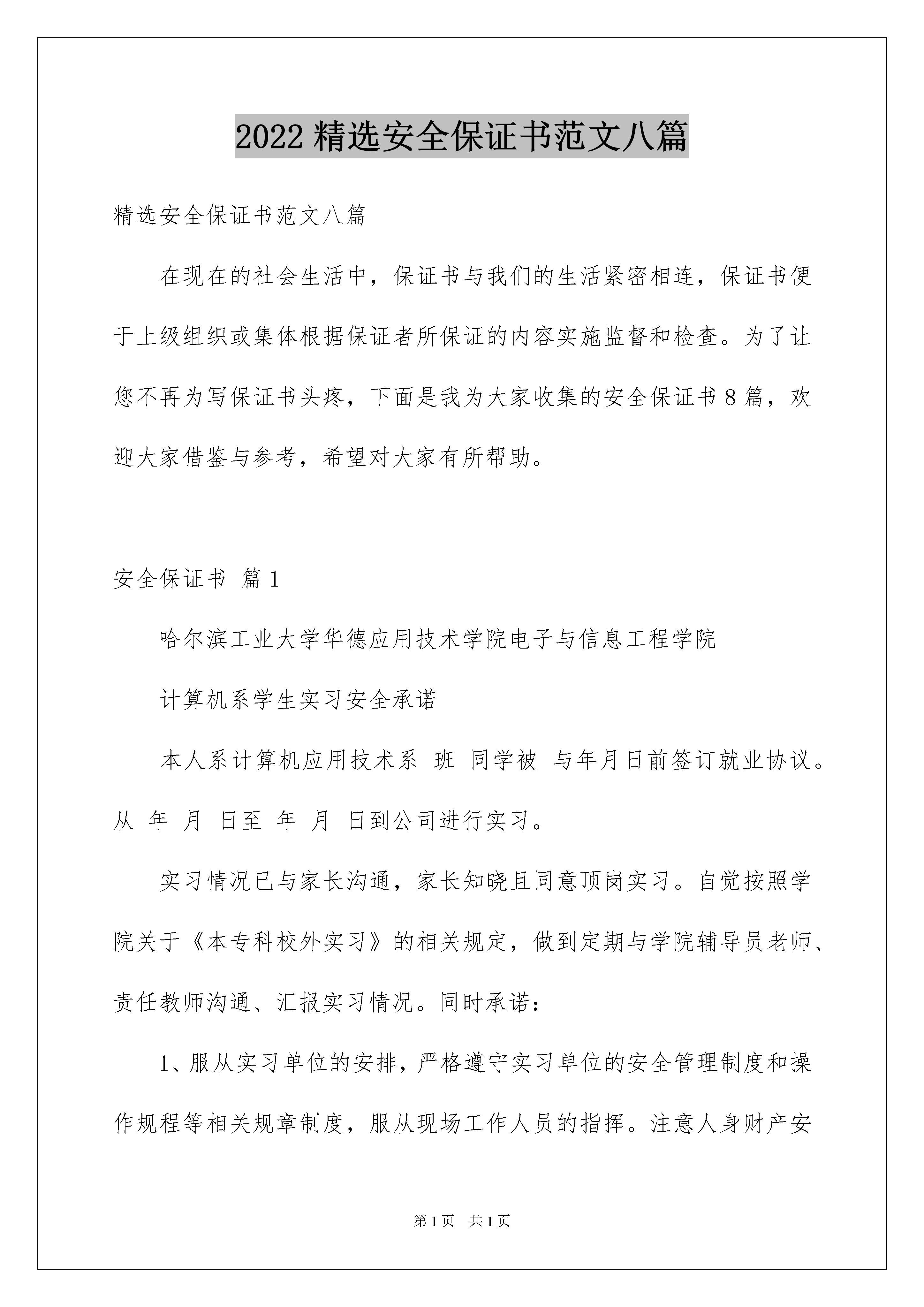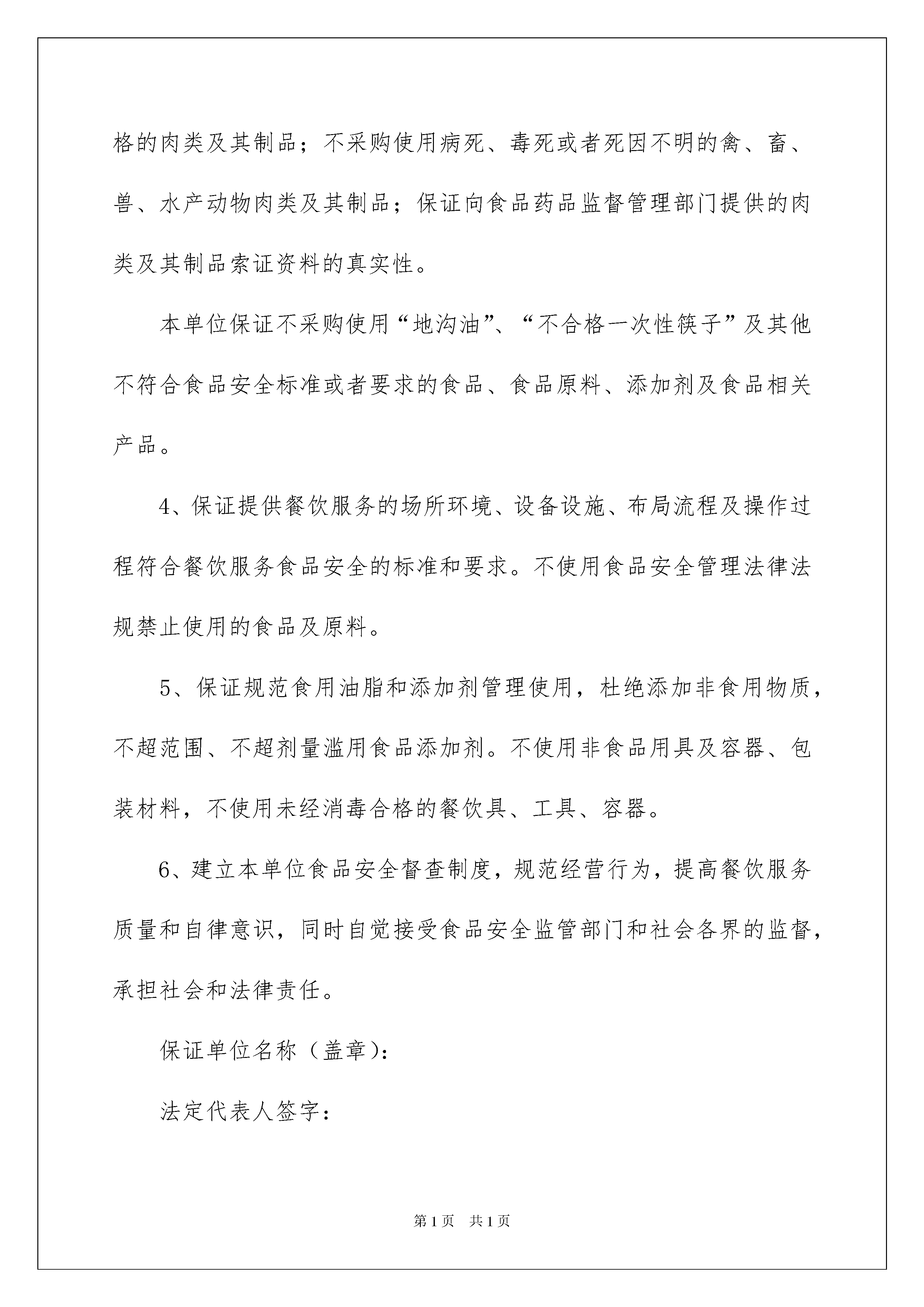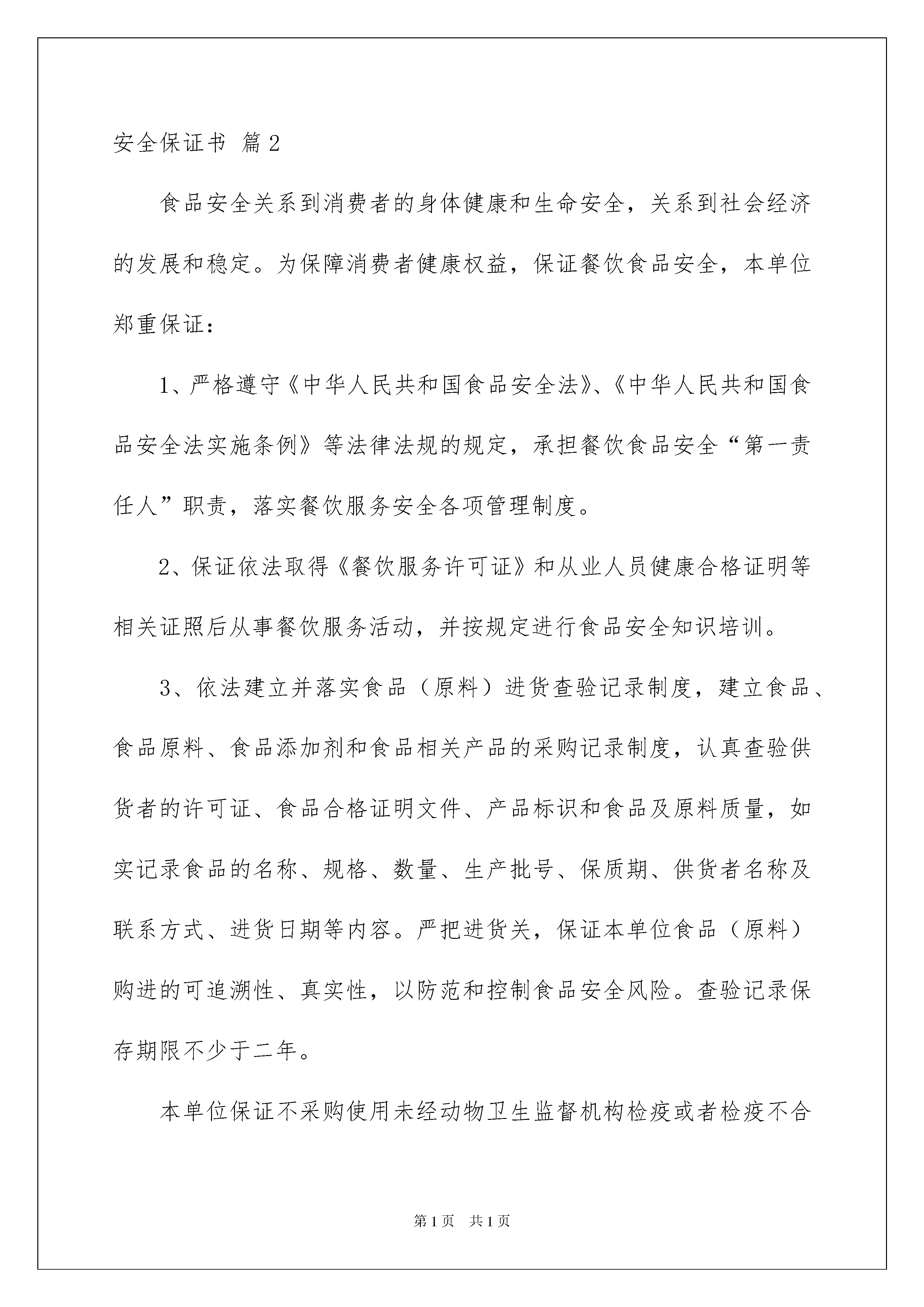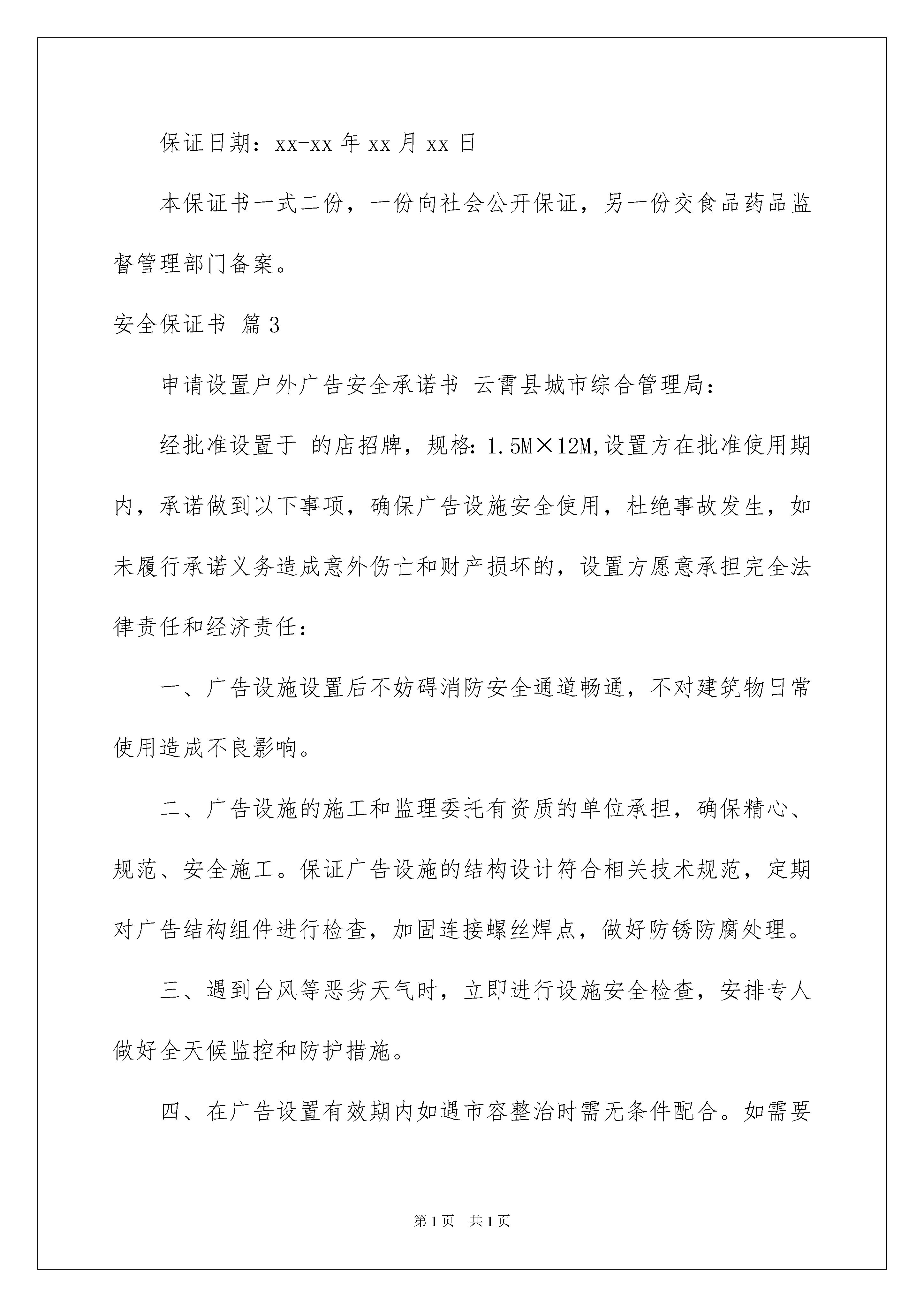 2022精选安全保证书范文八篇精选安全保证书范文八篇在现在的社会生活中,保证书与我们的生活紧密相连,保证书便于上级组织或集体根据保证者所保证的内容实施监督和检查。为了让您不再为写保证书头疼,下面是我为大家收集的安全保证书8篇,欢迎大家借鉴与参考,希望对大家有所帮助。安全保证书篇1哈尔滨工业大学华德应用技术学院电子与信息工程学院计算机系学生实习安全承诺本人系计算机应用技术系班同学被与年月日前签订就业协议。从年月日至年月日到公司进行实习。实习情况已与家长沟通,家长知晓且同意顶岗实习。自觉按照学院关于《本专科校外实习》的相关规定,做到定期与学院辅导员老师、责任教师沟通、汇报实习情况。同时承诺:1、服从实习单位的安排,严格遵守实习单位的安全管理制度和操作规程等相关规章制度,服从现场工作人员的指挥。注意人身财产安全,配合做好防火防盗工作。2、严格遵守实习单位作息制度,不得擅自离开实习单位,确因联系工作或其他原因必须离开单位的,应向实习单位请假,经批准后方可离开,不得独自行动和在外住宿。3、实习期间,遵守交通规则;不得到江、河、湖、海等水域游泳;讲究饮食卫生,预防疾病传播。4、言行举止要文明礼貌,不准进入营业性网吧,不得酗酒闹事、惹事生非。不许参加与学生身份不相称的活动不得酗酒闹事、惹事生非。不许参加与学生身份不相称的活动。5、主动与毕业设计教师沟通,按照毕业设计教师要求,按时完成并上交毕业设计相关材料,并按实习日程撰写实习日志(日志按规定上交到班级责任教师处)。6、在实习期间,学生因违反本实习管理规定和实习单位安全规则造成自身伤害及学业问题由学生本人负责,造成他人伤害或国家和企业的经济损失,由学生本人及家长承担经济和法律责任。保证人签名:电话:保证人家长签名:电话:年日安全保证书篇2食品安全关系到消费者的身体健康和生命安全,关系到社会经济的发展和稳定。为保障消费者健康权益,保证餐饮食品安全,本单位郑重保证:1、严格遵守《中华人民共和国食品安全法》、《中华人民共和国食品安全法实施条例》等法律法规的规定,承担餐饮食品安全“第一责任人”职责,落实餐饮服务安全各项管理制度。2、保证依法取得《餐饮服务许可证》和从业人员健康合格证明等相关证照后从事餐饮服务活动,并按规定进行食品安全知识培训。3、依法建立并落实食品(原料)进货查验记录制度,建立食品、食品原料、食品添加剂和食品相关产品的采购记录制度,认真查验供货者的许可证、食品合格证明文件、产品标识和食品及原料质量,如实记录食品的名称、规格、数量、生产批号、保质期、供货者名称及联系方式、进货日期等内容。严把进货关,保证本单位食品(原料)购进的可追溯性、真实性,以防范和控制食品安全风险。查验记录保存期限不少于二年。本单位保证不采购使用未经动物卫生监督机构检疫或者检疫不合格的肉类及其制品;不采购使用病死、毒死或者死因不明的禽、畜、兽、水产动物肉类及其制品;保证向食品药品监督管理部门提供的肉类及其制品索证资料的真实性。本单位保证不采购使用“地沟油”、“不合格一次性筷子”及其他不符合食品安全标准或者要求的食品、食品原料、添加剂及食品相关产品。4、保证提供餐饮服务的场所环境、设备设施、布局流程及操作过程符合餐饮服务食品安全的标准和要求。不使用食品安全管理法律法规禁止使用的食品及原料。5、保证规范食用油脂和添加剂管理使用,杜绝添加非食用物质,不超范围、不超剂量滥用食品添加剂。不使用非食品用具及容器、包装材料,不使用未经消毒合格的餐饮具、工具、容器。6、建立本单位食品安全督查制度,规范经营行为,提高餐饮服务质量和自律意识,同时自觉接受食品安全监管部门和社会各界的监督,承担社会和法律责任。保证单位名称(盖章):法定代表人签字:保证日期:xx-xx年xx月xx日本保证书一式二份,一份向社会公开保证,另一份交食品药品监督管理部门备案。安全保证书篇3申请设置户外广告安全承诺书云霄县城市综合管理局:经批准设置于的店招牌,规格:1.5M×12M,设置方在批准使用期内,承诺做到以下事项,确保广告设施安全使用,杜绝事故发生,如未履行承诺义务造成意外伤亡和财产损坏的,设置方愿意承担完全法律责任和经济责任:一、广告设施设置后不妨碍消防安全通道畅通,不对建筑物日常使用造成不良影响。二、广告设施的施工和监理委托有资质的单位承担,确保精心、规范、安全施工。保证广告设施的结构设计符合相关技术规范,定期对广告结构组件进行检查,加固连接螺丝焊点,做好防锈防腐处理。三、遇到台风等恶劣天气时,立即进行设施安全检查,安排专人做好全天候监控和防护措施。四、在广告设置有效期内如遇市容整治时需无条件配合