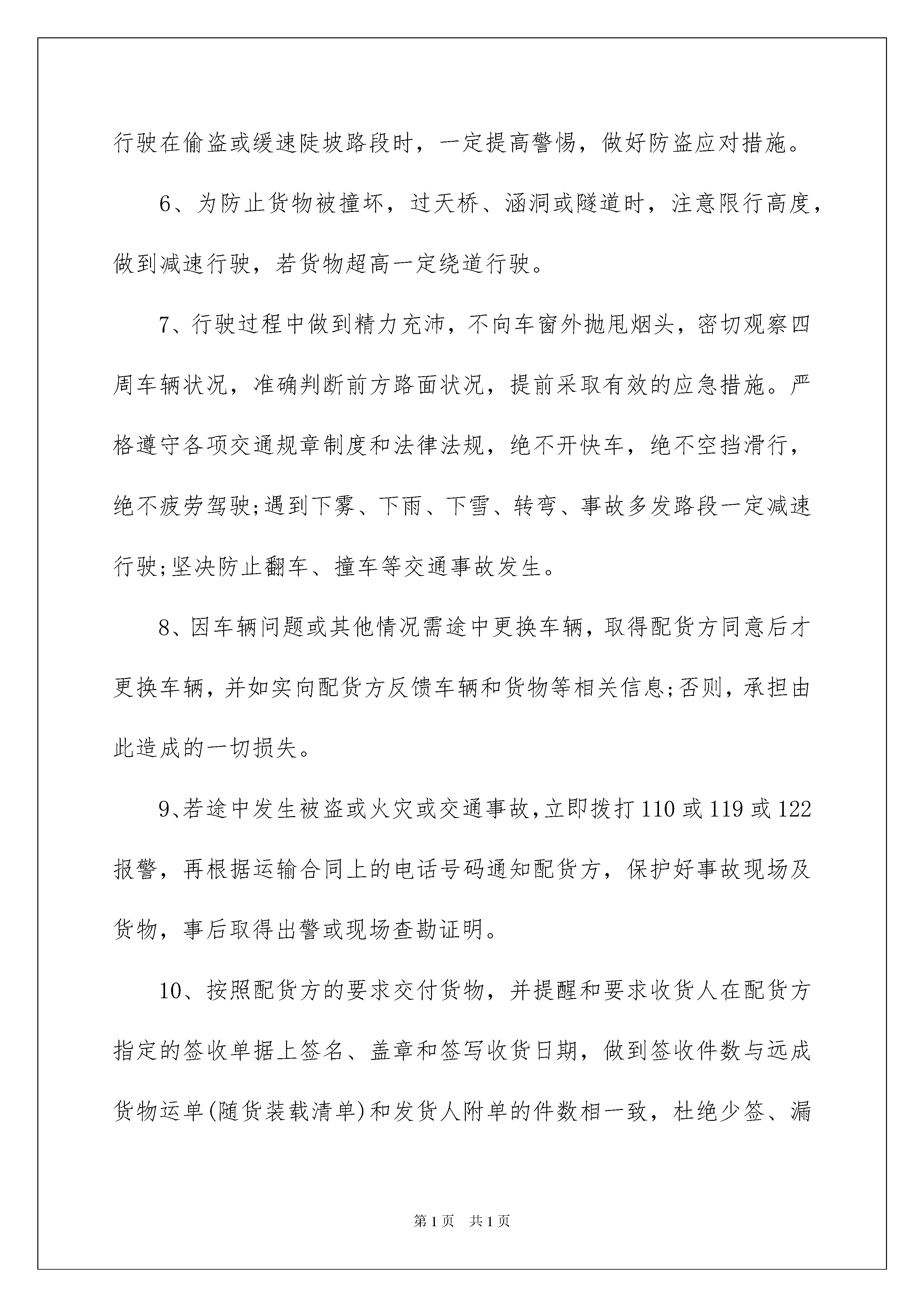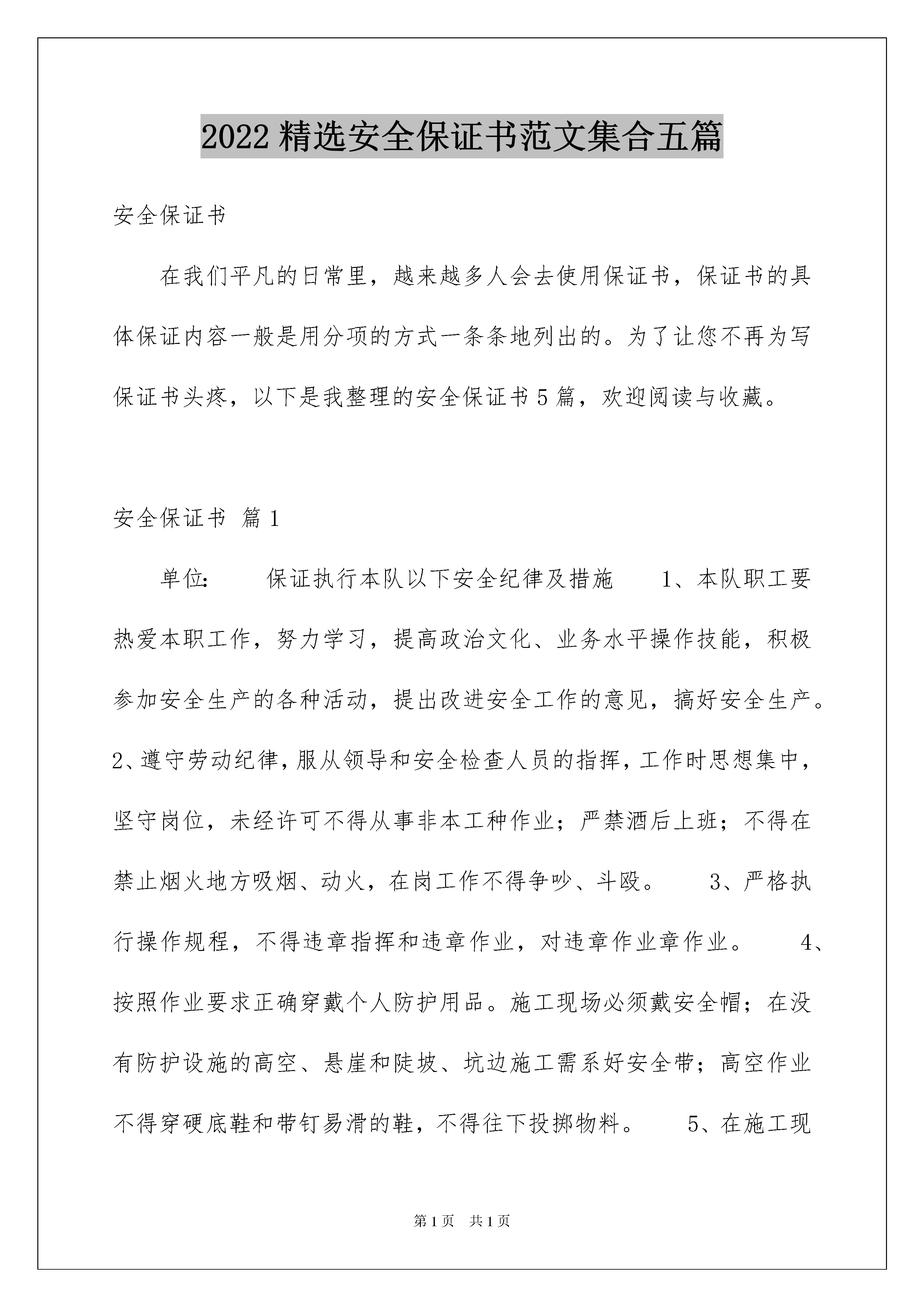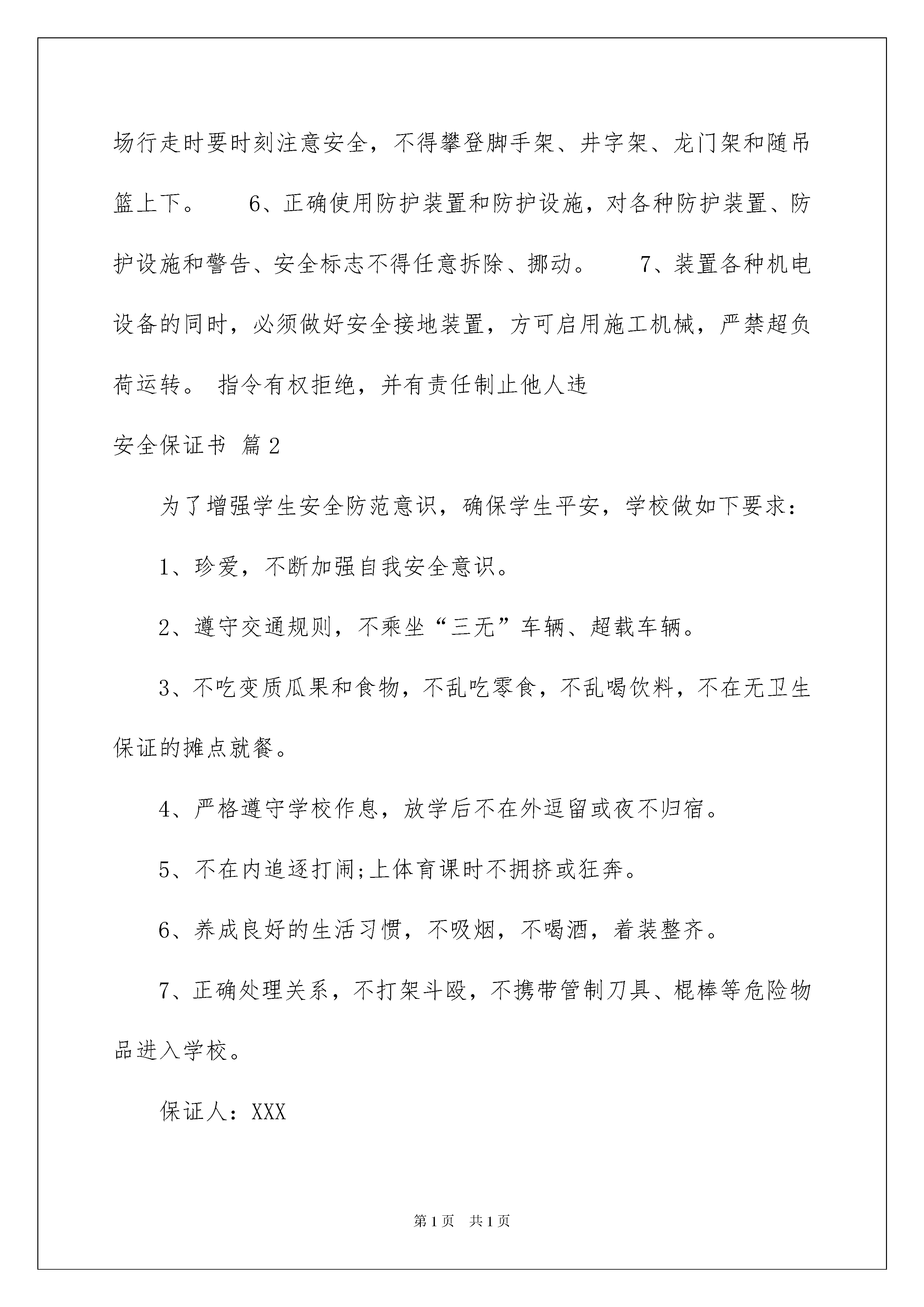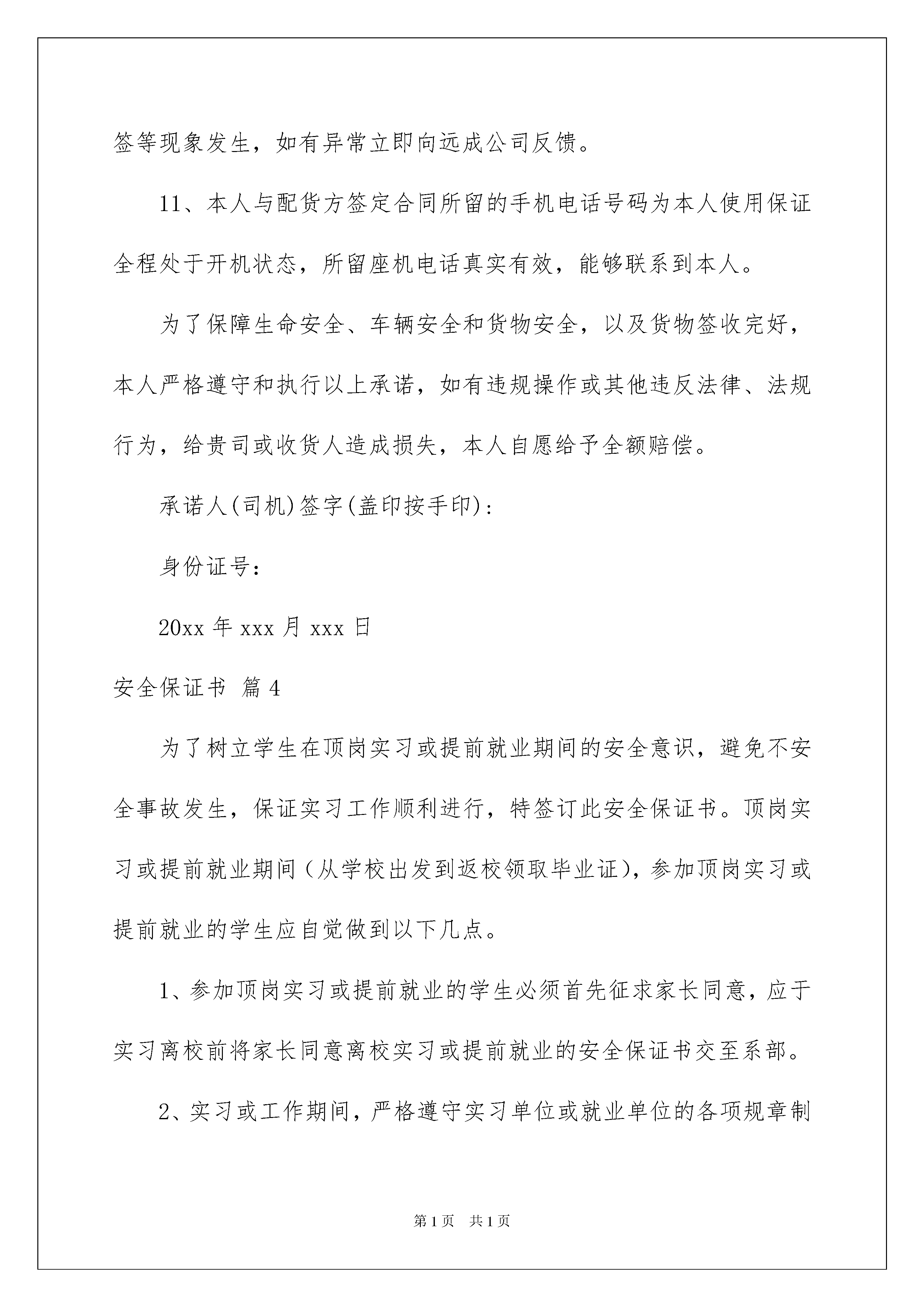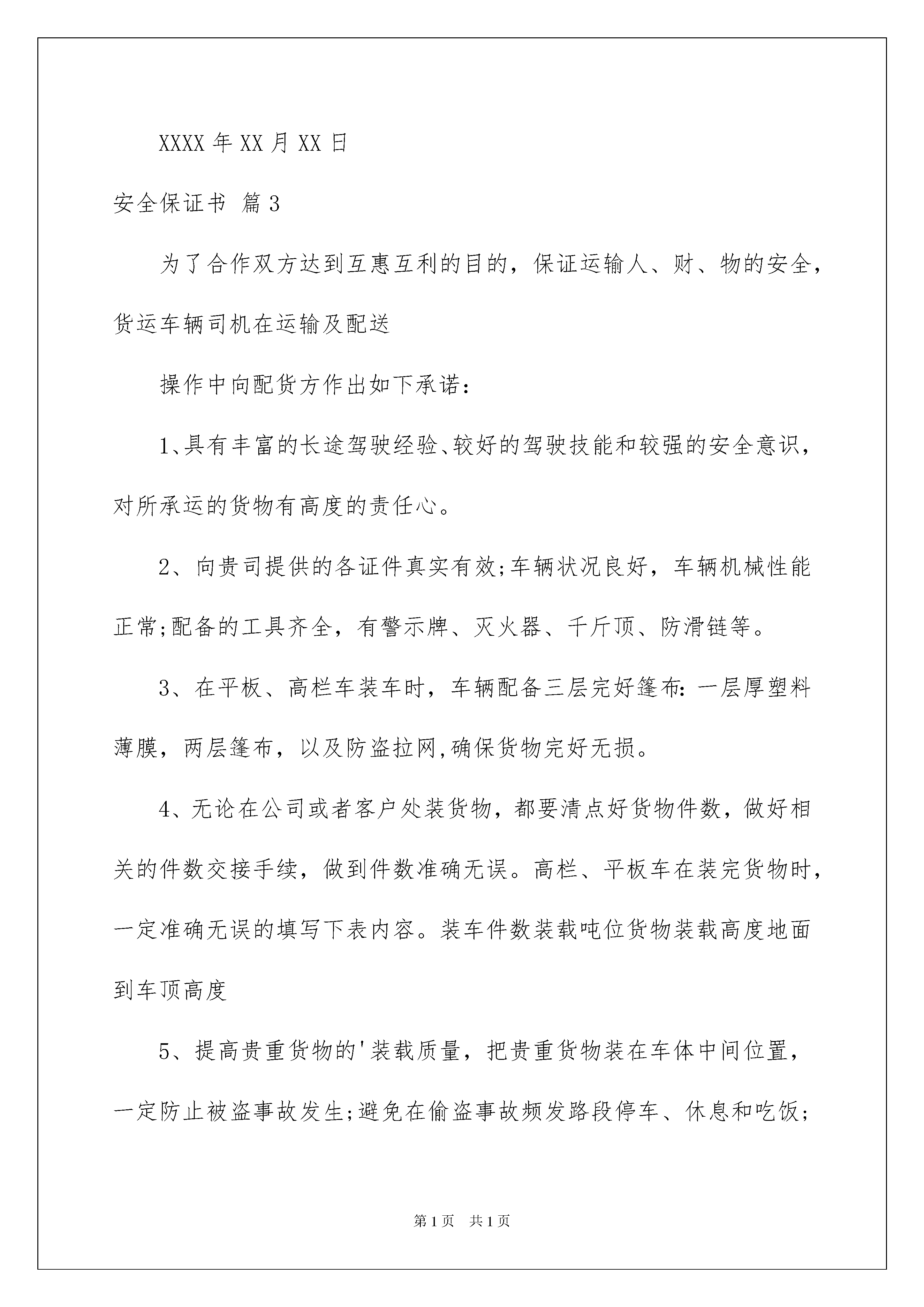 2022精选安全保证书范文集合五篇安全保证书在我们平凡的日常里,越来越多人会去使用保证书,保证书的具体保证内容一般是用分项的方式一条条地列出的。为了让您不再为写保证书头疼,以下是我整理的安全保证书5篇,欢迎阅读与收藏。安全保证书篇1单位:保证执行本队以下安全纪律及措施1、本队职工要热爱本职工作,努力学习,提高政治文化、业务水平操作技能,积极参加安全生产的各种活动,提出改进安全工作的意见,搞好安全生产。2、遵守劳动纪律,服从领导和安全检查人员的指挥,工作时思想集中,坚守岗位,未经许可不得从事非本工种作业;严禁酒后上班;不得在禁止烟火地方吸烟、动火,在岗工作不得争吵、斗殴。3、严格执行操作规程,不得违章指挥和违章作业,对违章作业章作业。4、按照作业要求正确穿戴个人防护用品。施工现场必须戴安全帽;在没有防护设施的高空、悬崖和陡坡、坑边施工需系好安全带;高空作业不得穿硬底鞋和带钉易滑的鞋,不得往下投掷物料。5、在施工现场行走时要时刻注意安全,不得攀登脚手架、井字架、龙门架和随吊篮上下。6、正确使用防护装置和防护设施,对各种防护装置、防护设施和警告、安全标志不得任意拆除、挪动。7、装置各种机电设备的同时,必须做好安全接地装置,方可启用施工机械,严禁超负荷运转。指令有权拒绝,并有责任制止他人违安全保证书篇2为了增强学生安全防范意识,确保学生平安,学校做如下要求:1、珍爱,不断加强自我安全意识。2、遵守交通规则,不乘坐“三无”车辆、超载车辆。3、不吃变质瓜果和食物,不乱吃零食,不乱喝饮料,不在无卫生保证的摊点就餐。4、严格遵守学校作息,放学后不在外逗留或夜不归宿。5、不在内追逐打闹;上体育课时不拥挤或狂奔。6、养成良好的生活习惯,不吸烟,不喝酒,着装整齐。7、正确处理关系,不打架斗殴,不携带管制刀具、棍棒等危险物品进入学校。保证人:XXXXXXX年XX月XX日安全保证书篇3为了合作双方达到互惠互利的目的,保证运输人、财、物的安全,货运车辆司机在运输及配送操作中向配货方作出如下承诺:1、具有丰富的长途驾驶经验、较好的驾驶技能和较强的安全意识,对所承运的货物有高度的责任心。2、向贵司提供的各证件真实有效;车辆状况良好,车辆机械性能正常;配备的工具齐全,有警示牌、灭火器、千斤顶、防滑链等。3、在平板、高栏车装车时,车辆配备三层完好篷布:一层厚塑料薄膜,两层篷布,以及防盗拉网,确保货物完好无损。4、无论在公司或者客户处装货物,都要清点好货物件数,做好相关的件数交接手续,做到件数准确无误。高栏、平板车在装完货物时,一定准确无误的填写下表内容。装车件数装载吨位货物装载高度地面到车顶高度5、提高贵重货物的'装载质量,把贵重货物装在车体中间位置,一定防止被盗事故发生;避免在偷盗事故频发路段停车、休息和吃饭;行驶在偷盗或缓速陡坡路段时,一定提高警惕,做好防盗应对措施。6、为防止货物被撞坏,过天桥、涵洞或隧道时,注意限行高度,做到减速行驶,若货物超高一定绕道行驶。7、行驶过程中做到精力充沛,不向车窗外抛甩烟头,密切观察四周车辆状况,准确判断前方路面状况,提前采取有效的应急措施。严格遵守各项交通规章制度和法律法规,绝不开快车,绝不空挡滑行,绝不疲劳驾驶;遇到下雾、下雨、下雪、转弯、事故多发路段一定减速行驶;坚决防止翻车、撞车等交通事故发生。8、因车辆问题或其他情况需途中更换车辆,取得配货方同意后才更换车辆,并如实向配货方反馈车辆和货物等相关信息;否则,承担由此造成的一切损失。9、若途中发生被盗或火灾或交通事故,立即拨打110或119或122报警,再根据运输合同上的电话号码通知配货方,保护好事故现场及货物,事后取得出警或现场查勘证明。10、按照配货方的要求交付货物,并提醒和要求收货人在配货方指定的签收单据上签名、盖章和签写收货日期,做到签收件数与远成货物运单(随货装载清单)和发货人附单的件数相一致,杜绝少签、漏签等现象发生,如有异常立即向远成公司反馈。11、本人与配货方签定合同所留的手机电话号码为本人使用保证全程处于开机状态,所留座机电话真实有效,能够联系到本人。为了保障生命安全、车辆安全和货物安全,以及货物签收完好,本人严格遵守和执行以上承诺,如有违规操作或其他违反法律、法规行为,给贵司或收货人造成损失,本人自愿给予全额赔偿。承诺人(司机)签字(盖印按手印):身份证号:20xx年xxx月xxx日安全保证书篇4为了树立学生在顶岗实习或提前就业期间的安全意识,避免不安全事故发生,保证实习工作顺利进行,特签订此安全保证书。顶岗实习或提前就业期间(从学校出发到返校领取毕业证),参加顶岗实习或提前就业的学生应自觉做到