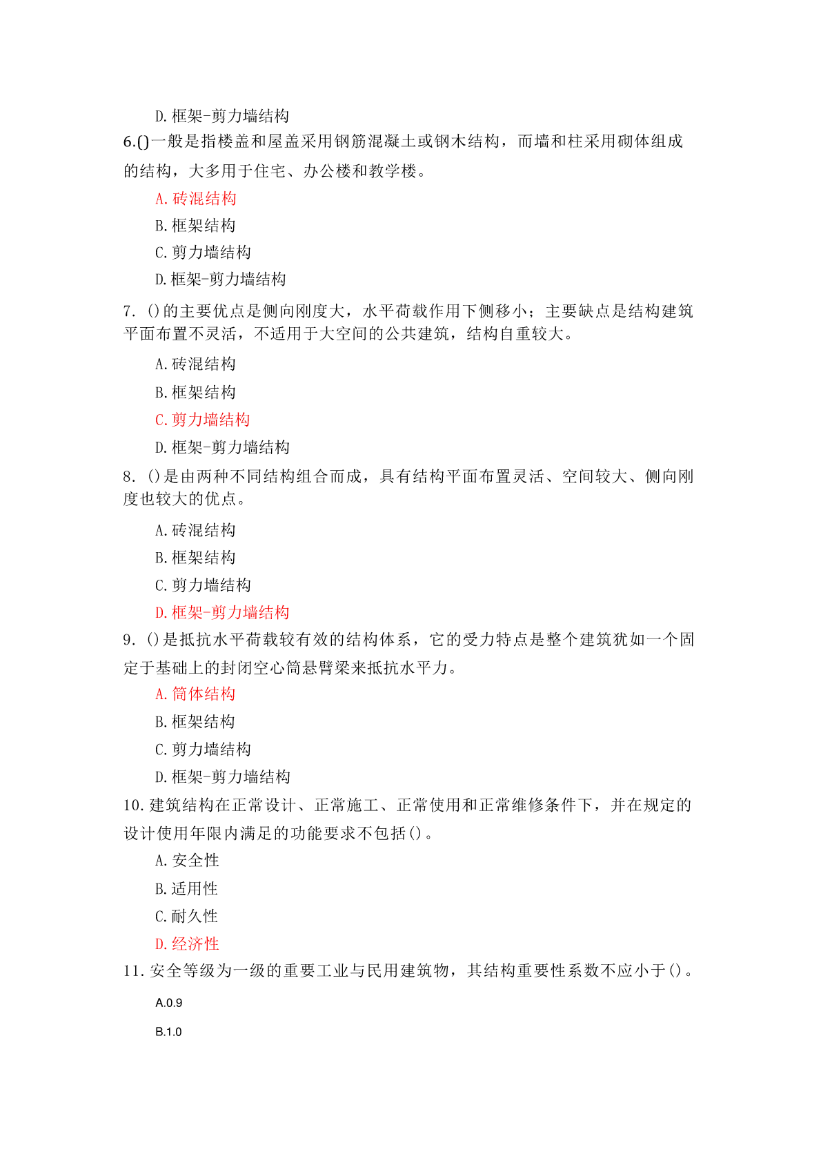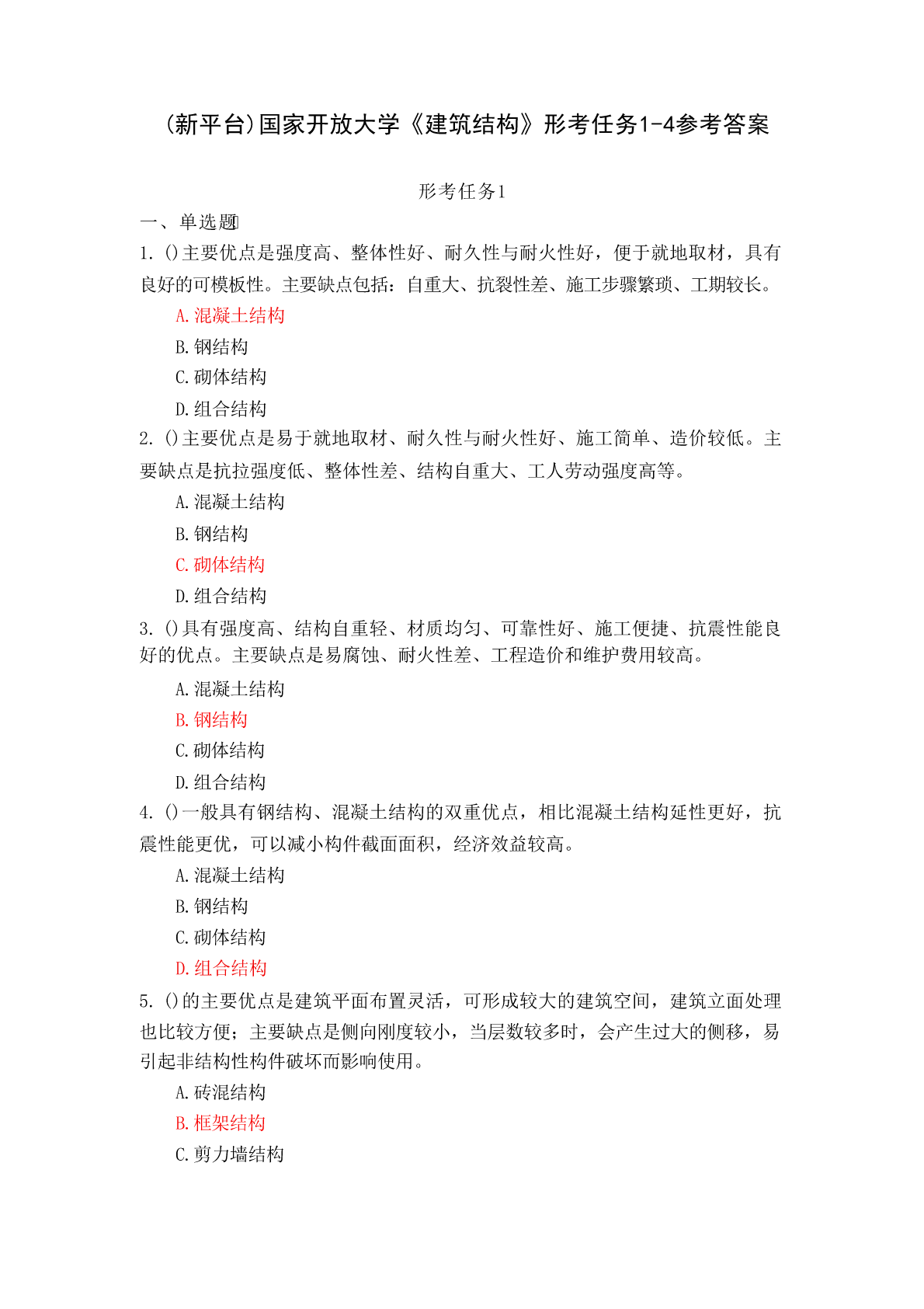 (新平台)国家开放大学《建筑结构》形考任务1-4参考答案 形考任务1 一、单选题 1.()主要优点是强度高、整体性好、耐久性与耐火性好,便于就地取材,具有 良好的可模板性。主要缺点包括:自重大、抗裂性差、施工步骤繁琐、工期较长。 A.混凝土结构 B.钢结构 C.砌体结构 D.组合结构 2.()主要优点是易于就地取材、耐久性与耐火性好、施工简单、造价较低。主 要缺点是抗拉强度低、整体性差、结构自重大、工人劳动强度高等。 A.混凝土结构 B.钢结构 C.砌体结构 D.组合结构 3.()具有强度高、结构自重轻、材质均匀、可靠性好、施工便捷、抗震性能良 好的优点。主要缺点是易腐蚀、耐火性差、工程造价和维护费用较高。 A.混凝土结构 B.钢结构 C.砌体结构 D.组合结构 4.()一般具有钢结构、混凝土结构的双重优点,相比混凝土结构延性更好,抗 震性能更优,可以减小构件截面面积,经济效益较高。 A.混凝土结构 B.钢结构 C.砌体结构 D.组合结构 5.()的主要优点是建筑平面布置灵活,可形成较大的建筑空间,建筑立面处理 也比较方便;主要缺点是侧向刚度较小,当层数较多时,会产生过大的侧移,易 引起非结构性构件破坏而影响使用。 A.砖混结构 B.框架结构 C.剪力墙结构 D.框架-剪力墙结构 6.()一般是指楼盖和屋盖采用钢筋混凝土或钢木结构,而墙和柱采用砌体组成 的结构,大多用于住宅、办公楼和教学楼。 A.砖混结构 B.框架结构 C.剪力墙结构 D.框架-剪力墙结构 7.()的主要优点是侧向刚度大,水平荷载作用下侧移小;主要缺点是结构建筑 平面布置不灵活,不适用于大空间的公共建筑,结构自重较大。 A.砖混结构 B.框架结构 C.剪力墙结构 D.框架-剪力墙结构 8.()是由两种不同结构组合而成,具有结构平面布置灵活、空间较大、侧向刚 度也较大的优点。 A.砖混结构 B.框架结构 C.剪力墙结构 D.框架-剪力墙结构 9.()是抵抗水平荷载较有效的结构体系,它的受力特点是整个建筑犹如一个固 定于基础上的封闭空心筒悬臂梁来抵抗水平力。 A.筒体结构 B.框架结构 C.剪力墙结构 D.框架-剪力墙结构 10.建筑结构在正常设计、正常施工、正常使用和正常维修条件下,并在规定的 设计使用年限内满足的功能要求不包括()。 A.安全性 B.适用性 C.耐久性 D.经济性 11.安全等级为一级的重要工业与民用建筑物,其结构重要性系数不应小于()。 A.0.9 B.1.0