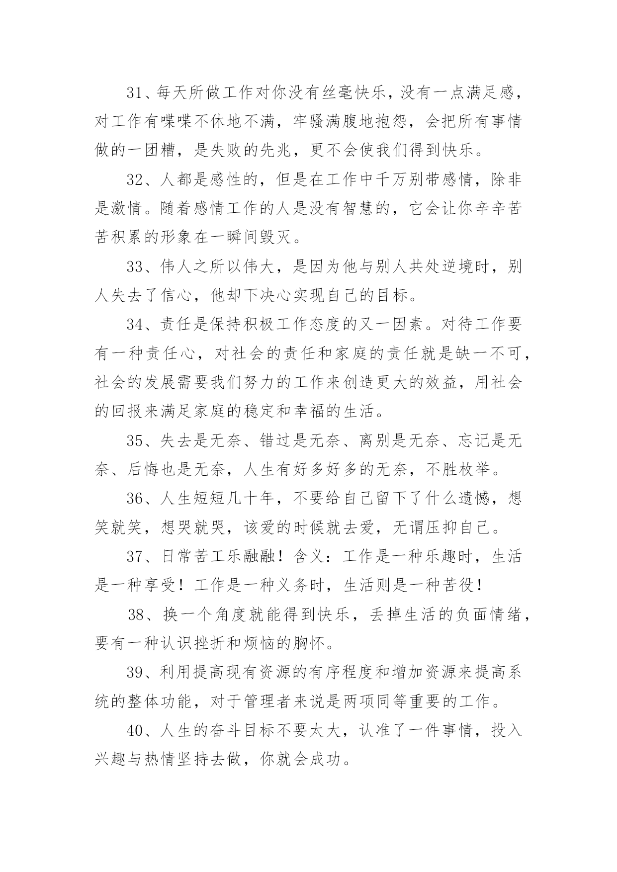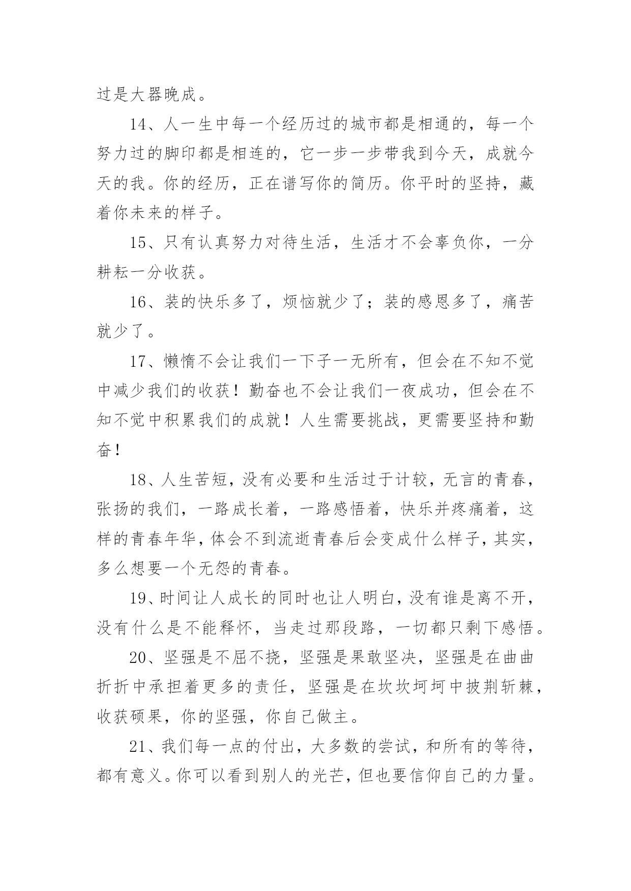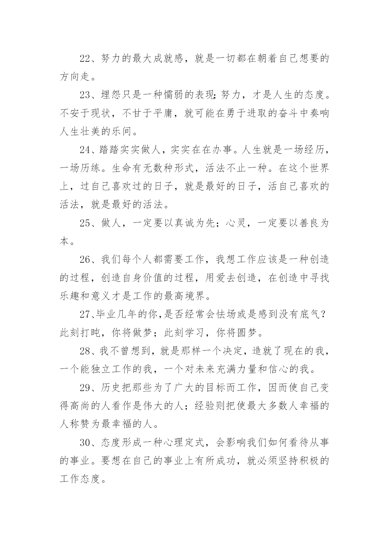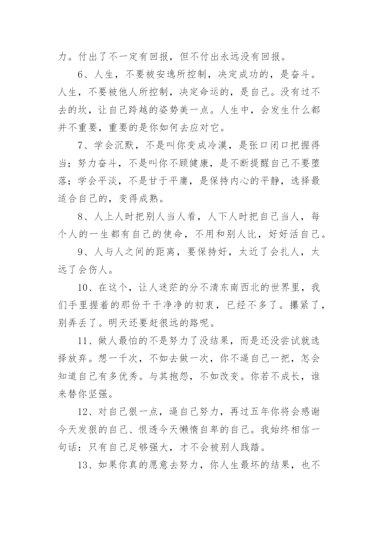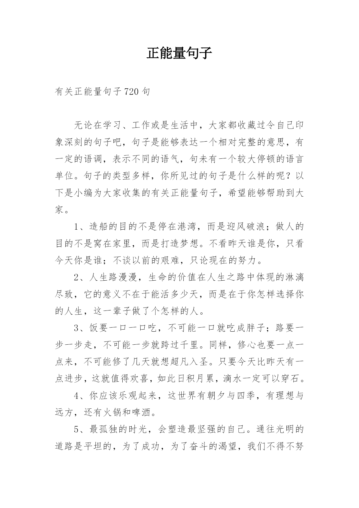 正能量句子 有关正能量句子720句无论在学习、工作或是生活中,大家都收藏过令自己印象深刻的句子吧,句子是能够表达一个相对完整的意思,有一定的语调,表示不同的语气,句未有一个较大停顿的语言单位。句子的类型多样,你所见过的句子是什么样的呢?以下是小编为大家收集的有关正能量句子,希望能够帮助到大家。1、造船的目的不是停在港湾,而是迎风破浪;做人的目的不是窝在家里,而是打造梦想。不看昨天谁是你,只看今天你是谁;不谈以前的艰难,只论现在的努力。2、人生路漫漫,生命的价值在人生之路中体现的淋漓尽致,它的意义不在于能活多少天,而是在于你怎样选择你的人生,这一辈子做了个怎样的人。3、饭要一口一口吃,不可能一口就吃成胖子;路要一步一步走,不可能一步就跨过千里。同样,修心也要一点一点来,不可能修了几天就想超凡入圣。只要今天比昨天有一点进步,这就值得欢喜,如此日积月累,滴水一定可以穿石。4、你应该乐观起来,这世界有朝夕与四季,有理想与远方,还有火锅和啤酒。5、最孤独的时光,会塑造最坚强的自己。通往光明的道路是平坦的,为了成功,为了奋斗的渴望,我们不得不努力。付出了不一定有回报,但不付出永远没有回报。6、人生,不要被安逸所控制,决定成功的,是奋斗。人生,不要被他人所控制,决定命运的,是自己。没有过不去的坎,让自己跨越的姿势美一点。人生中,会发生什么都并不重要,重要的是你如何去应对它。7、学会沉默,不是叫你变成冷漠,是张口闭口把握得当;努力奋斗,不是叫你不顾健康,是不断提醒自己不要堕落;学会平淡,不是甘于平庸,是保持内心的平静,选择最适合自己的,变得成熟。8、人上人时把别人当人看,人下人时把自己当人,每个人的一生都有自己的使命,不用和别人比,好好活自己。9、人与人之间的距离,要保持好,太近了会扎人,太远了会伤人。10、在这个,让人迷茫的分不清东南西北的世界里,我们手里握着的那份干干净净的初衷,已经不多了。攥紧了,别弄丢了。明天还要赶很远的路呢。11、做人最怕的不是努力了没结果,而是还没尝试就选择放弃。想一千次,不如去做一次,你不逼自己一把,怎会知道自己有多优秀。与其抱怨,不如改变。你若不成长,谁来替你坚强。12、对自己狠一点,逼自己努力,再过五年你将会感谢今天发狠的自己、恨透今天懒惰自卑的自己。我始终相信一句话:只有自己足够强大,才不会被别人践踏。13、如果你真的愿意去努力,你人生最坏的结果,也不过是大器晚成。14、人一生中每一个经历过的城市都是相通的,每一个努力过的脚印都是相连的,它一步一步带我到今天,成就今天的我。你的经历,正在谱写你的简历。你平时的坚持,藏着你未来的样子。15、只有认真努力对待生活,生活才不会辜负你,一分耕耘一分收获。16、装的快乐多了,烦恼就少了;装的感恩多了,痛苦就少了。17、懒惰不会让我们一下子一无所有,但会在不知不觉中减少我们的收获!勤奋也不会让我们一夜成功,但会在不知不觉中积累我们的成就!人生需要挑战,更需要坚持和勤奋!18、人生苦短,没有必要和生活过于计较,无言的青春,张扬的我们,一路成长着,一路感悟着,快乐并疼痛着,这样的青春年华,体会不到流逝青春后会变成什么样子,其实,多么想要一个无怨的青春。19、时间让人成长的同时也让人明白,没有谁是离不开,没有什么是不能释怀,当走过那段路,一切都只剩下感悟。20、坚强是不屈不挠,坚强是果敢坚决,坚强是在曲曲折折中承担着更多的责任,坚强是在坎坎坷坷中披荆斩棘,收获硕果,你的坚强,你自己做主。21、我们每一点的付出,大多数的尝试,和所有的等待,都有意义。你可以看到别人的光芒,但也要信仰自己的力量。22、努力的最大成就感,就是一切都在朝着自己想要的方向走。23、埋怨只是一种懦弱的表现;努力,才是人生的态度。不安于现状,不甘于平庸,就可能在勇于进取的奋斗中奏响人生壮美的乐间。24、踏踏实实做人,实实在在办事。人生就是一场经历,一场历练。生命有无数种形式,活法不止一种。在这个世界上,过自己喜欢过的日子,就是最好的日子,活自己喜欢的活法,就是最好的活法。25、做人,一定要以真诚为先;心灵,一定要以善良为本。26、我们每个人都需要工作,我想工作应该是一种创造的过程,创造自身价值的过程,用爱去创造,在创造中寻找乐趣和意义才是工作的最高境界。27、毕业几年的你,是否经常会怯场或是感到没有底气?此刻打盹,你将做梦;此刻学习,你将圆梦。28、我不曾想到,就是那样一个决定,造就了现在的我,一个能独立工作的我,一个对未来充满力量和信心的我。29、历史把那些为了广大的目标而工作,因而使自己变得高尚的人看作是伟大的人;经验则把使最大多数人幸福的人称赞为最幸福的人。30、态度形成一种心理定式,会影响我们如何看待从事的事业。要想在自己的事业上有所成功,就必须坚持积极的工作态度。31、每天所做工作对你没有丝毫快