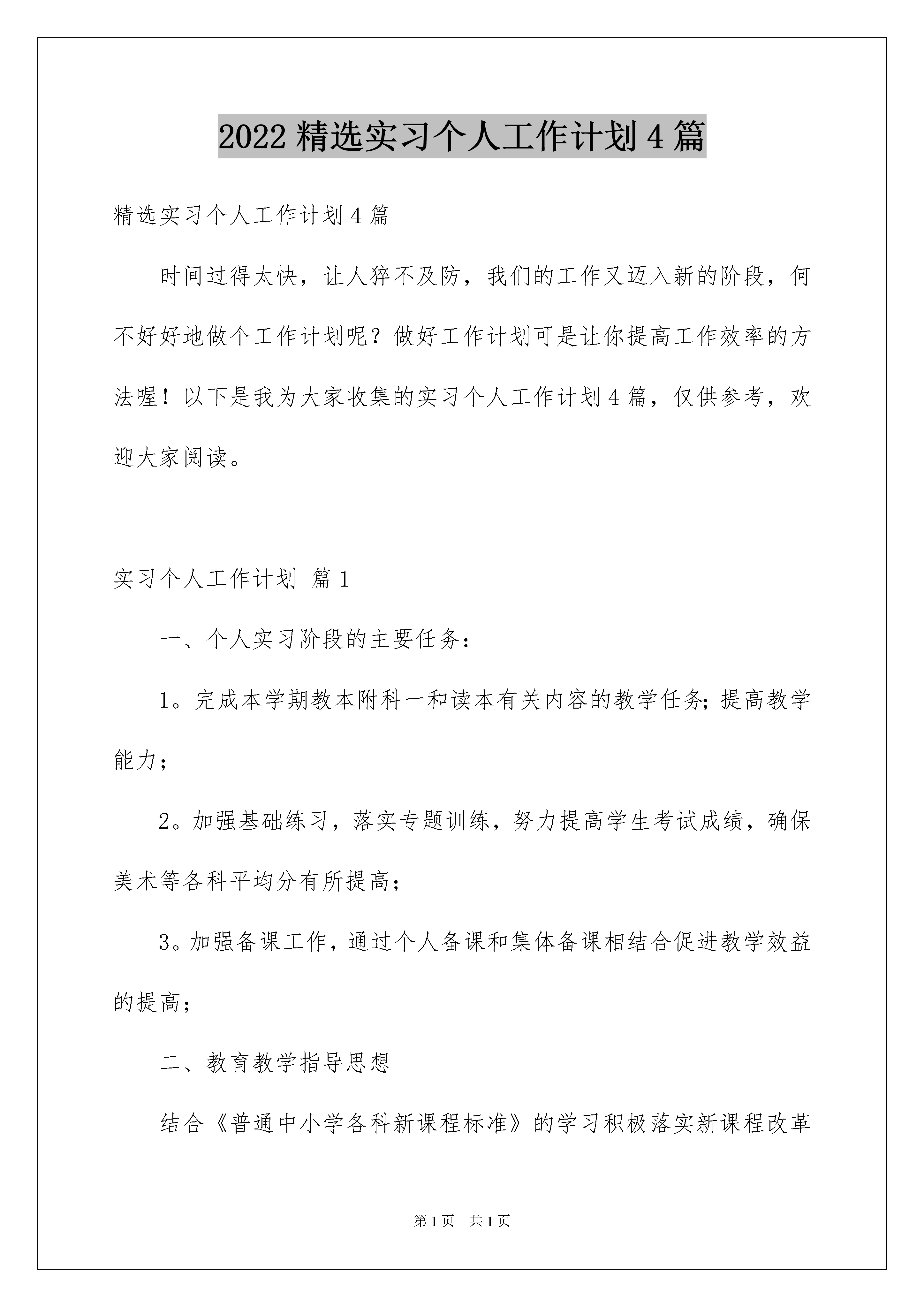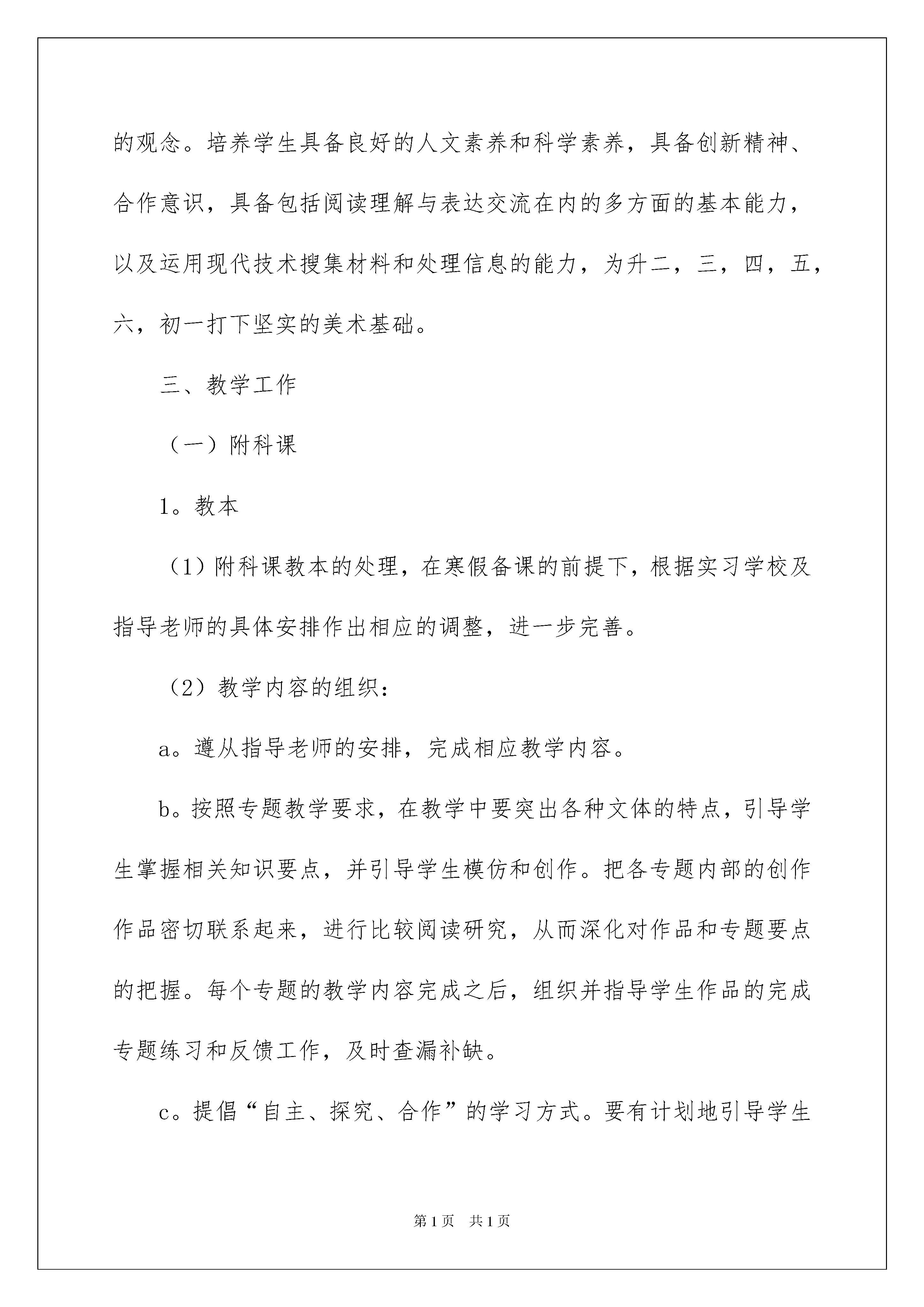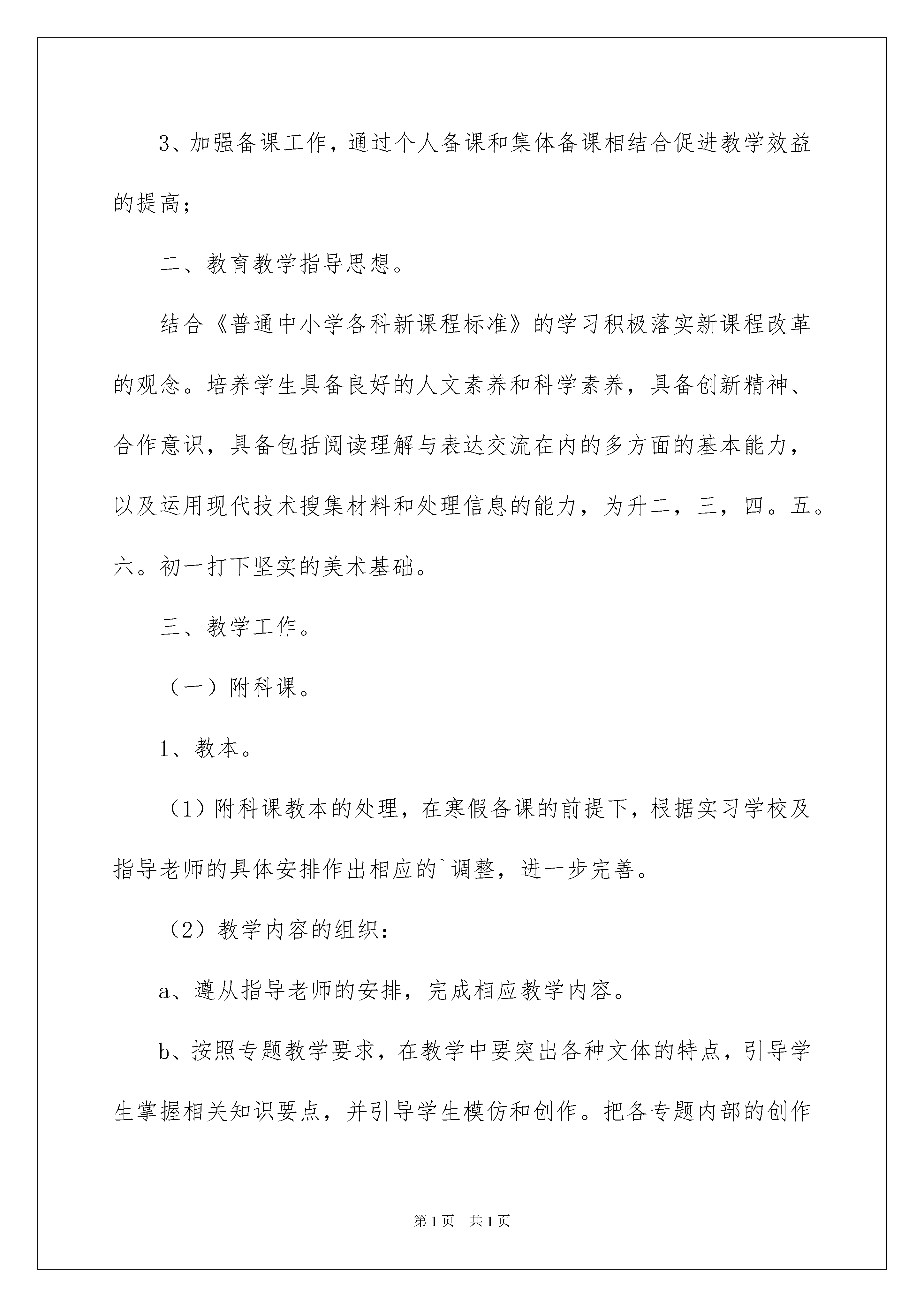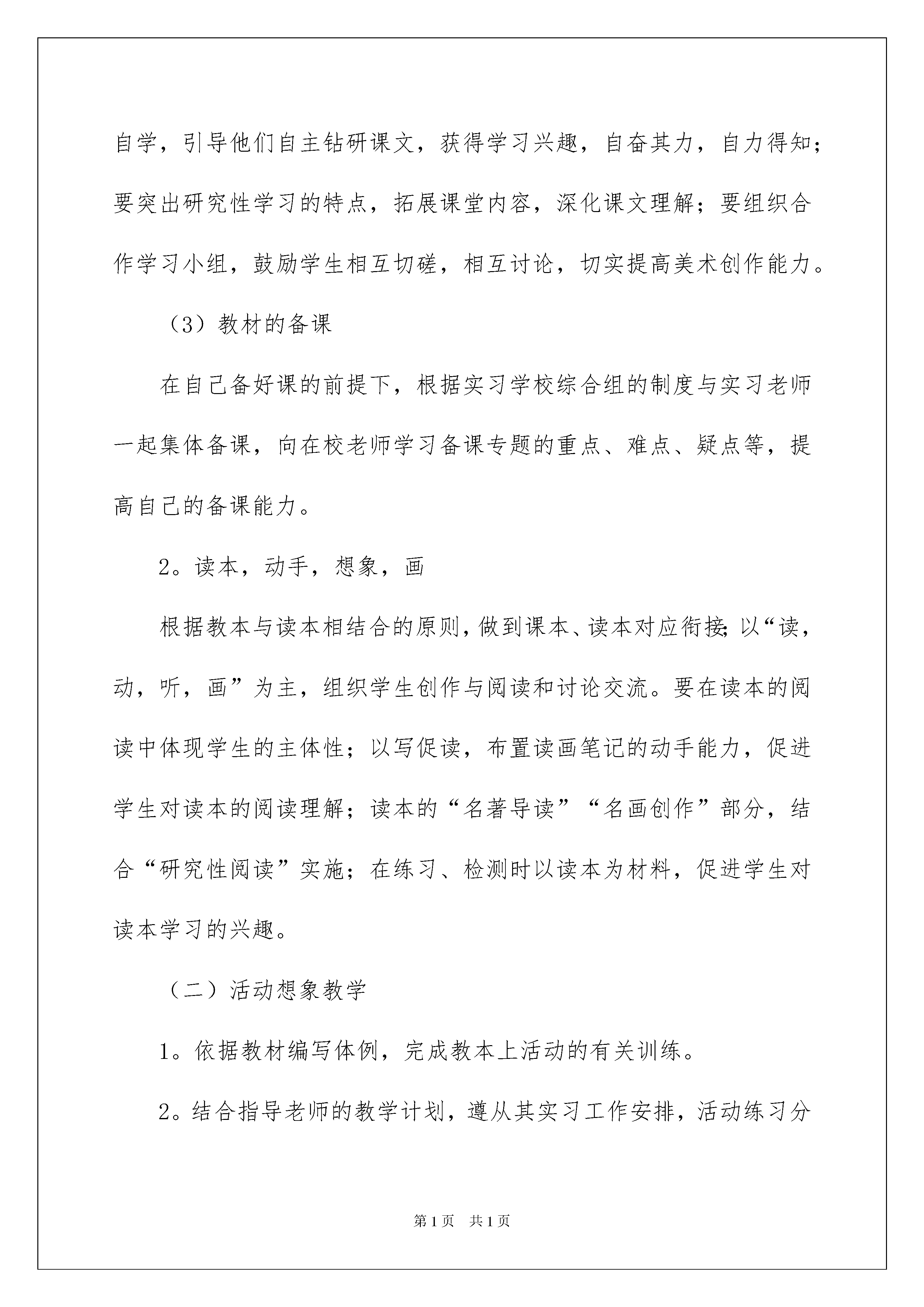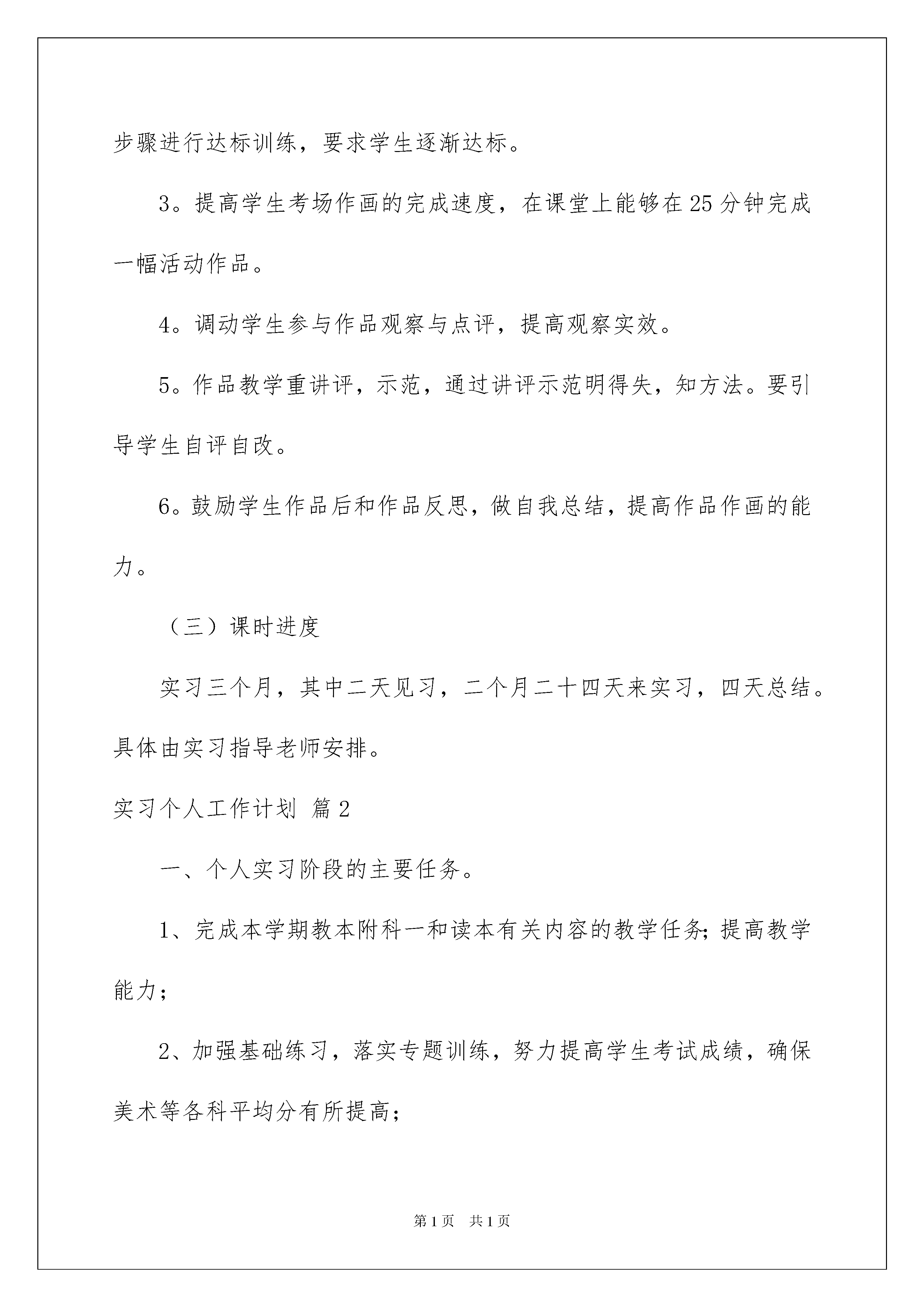 2022精选实习个人工作计划4篇精选实习个人工作计划4篇时间过得太快,让人猝不及防,我们的工作又迈入新的阶段,何不好好地做个工作计划呢?做好工作计划可是让你提高工作效率的方法喔!以下是我为大家收集的实习个人工作计划4篇,仅供参考,欢迎大家阅读。实习个人工作计划篇1一、个人实习阶段的主要任务:1。完成本学期教本附科一和读本有关内容的教学任务;提高教学能力;2。加强基础练习,落实专题训练,努力提高学生考试成绩,确保美术等各科平均分有所提高;3。加强备课工作,通过个人备课和集体备课相结合促进教学效益的提高;二、教育教学指导思想结合《普通中小学各科新课程标准》的学习积极落实新课程改革的观念。培养学生具备良好的人文素养和科学素养,具备创新精神、合作意识,具备包括阅读理解与表达交流在内的多方面的基本能力,以及运用现代技术搜集材料和处理信息的能力,为升二,三,四,五,六,初一打下坚实的美术基础。三、教学工作(一)附科课1。教本(1)附科课教本的处理,在寒假备课的前提下,根据实习学校及指导老师的具体安排作出相应的调整,进一步完善。(2)教学内容的组织:a。遵从指导老师的安排,完成相应教学内容。b。按照专题教学要求,在教学中要突出各种文体的特点,引导学生掌握相关知识要点,并引导学生模仿和创作。把各专题内部的创作作品密切联系起来,进行比较阅读研究,从而深化对作品和专题要点的把握。每个专题的教学内容完成之后,组织并指导学生作品的完成专题练习和反馈工作,及时查漏补缺。c。提倡“自主、探究、合作”的学习方式。要有计划地引导学生自学,引导他们自主钻研课文,获得学习兴趣,自奋其力,自力得知;要突出研究性学习的特点,拓展课堂内容,深化课文理解;要组织合作学习小组,鼓励学生相互切磋,相互讨论,切实提高美术创作能力。(3)教材的备课在自己备好课的前提下,根据实习学校综合组的制度与实习老师一起集体备课,向在校老师学习备课专题的重点、难点、疑点等,提高自己的备课能力。2。读本,动手,想象,画根据教本与读本相结合的原则,做到课本、读本对应衔接;以“读,动,听,画”为主,组织学生创作与阅读和讨论交流。要在读本的阅读中体现学生的主体性;以写促读,布置读画笔记的动手能力,促进学生对读本的阅读理解;读本的“名著导读”“名画创作”部分,结合“研究性阅读”实施;在练习、检测时以读本为材料,促进学生对读本学习的兴趣。(二)活动想象教学1。依据教材编写体例,完成教本上活动的有关训练。2。结合指导老师的教学计划,遵从其实习工作安排,活动练习分步骤进行达标训练,要求学生逐渐达标。3。提高学生考场作画的完成速度,在课堂上能够在25分钟完成一幅活动作品。4。调动学生参与作品观察与点评,提高观察实效。5。作品教学重讲评,示范,通过讲评示范明得失,知方法。要引导学生自评自改。6。鼓励学生作品后和作品反思,做自我总结,提高作品作画的能力。(三)课时进度实习三个月,其中二天见习,二个月二十四天来实习,四天总结。具体由实习指导老师安排。实习个人工作计划篇2一、个人实习阶段的主要任务。1、完成本学期教本附科一和读本有关内容的教学任务;提高教学能力;2、加强基础练习,落实专题训练,努力提高学生考试成绩,确保美术等各科平均分有所提高;3、加强备课工作,通过个人备课和集体备课相结合促进教学效益的提高;二、教育教学指导思想。结合《普通中小学各科新课程标准》的学习积极落实新课程改革的观念。培养学生具备良好的人文素养和科学素养,具备创新精神、合作意识,具备包括阅读理解与表达交流在内的多方面的基本能力,以及运用现代技术搜集材料和处理信息的能力,为升二,三,四。五。六。初一打下坚实的美术基础。三、教学工作。(一)附科课。1、教本。(1)附科课教本的处理,在寒假备课的前提下,根据实习学校及指导老师的具体安排作出相应的`调整,进一步完善。(2)教学内容的组织:a、遵从指导老师的安排,完成相应教学内容。b、按照专题教学要求,在教学中要突出各种文体的特点,引导学生掌握相关知识要点,并引导学生模仿和创作。把各专题内部的创作作品密切联系起来,进行比较阅读研究,从而深化对作品和专题要点的把握。每个专题的教学内容完成之后,组织并指导学生作品的完成专题练习和反馈工作,及时查漏补缺。c、提倡“自主、探究、合作”的学习方式。要有计划地引导学生自学,引导他们自主钻研课文,获得学习兴趣,自奋其力,自力得知;要突出研究性学习的特点,拓展课堂内容,深化课文理解;要组织合作学习小组,鼓励学生相互切磋,相互讨论,切实提高美术创作能力。(3)教材的备课。在自己备好课的前提下,根据实习学校综合组的制度