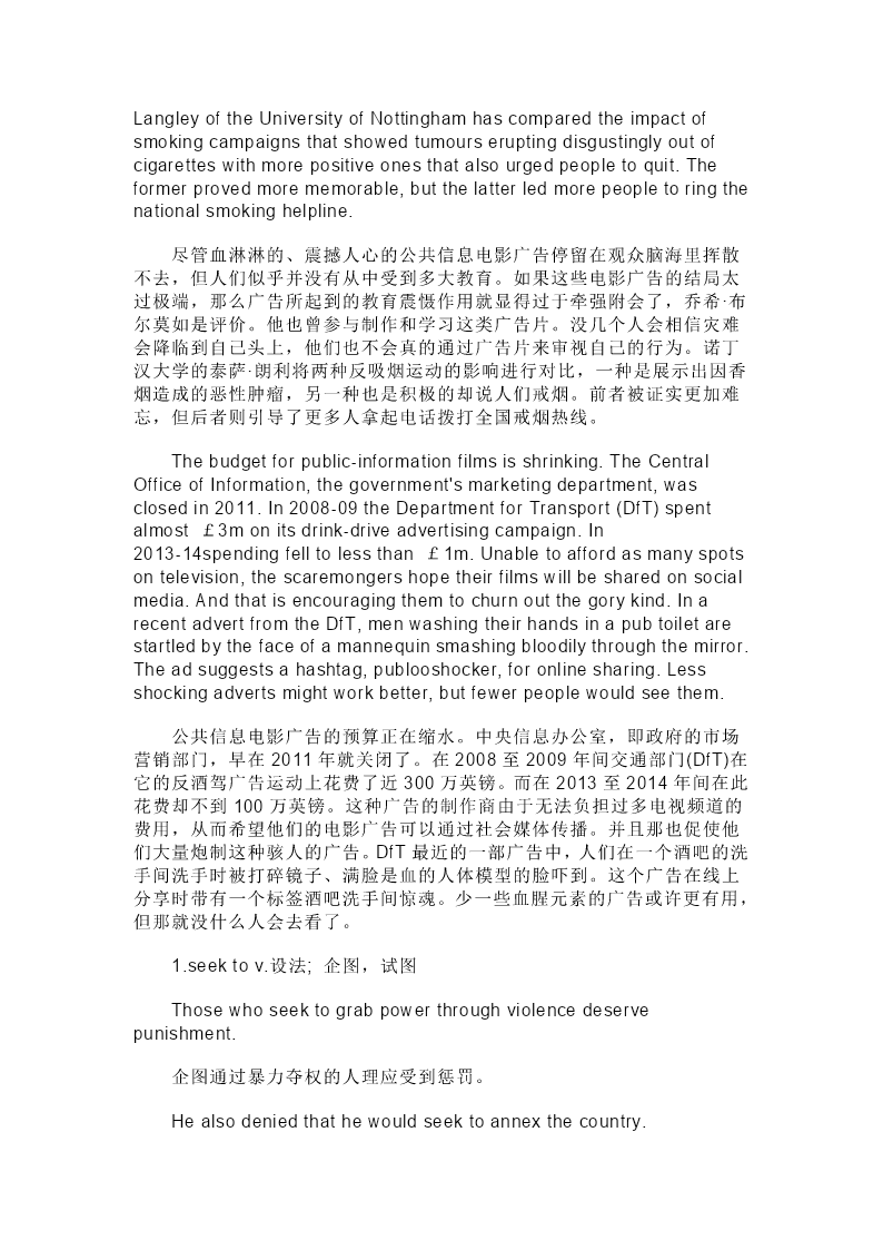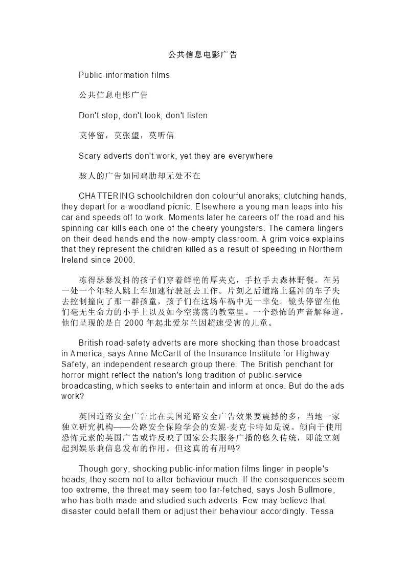 公共信息电影广告 Public-informationfilms 公共信息电影广告 Don'tstop,don'tlook,don'tlisten 莫停留,莫张望,莫听信 Scaryadvertsdon'twork,yettheyareeverywhere 骇人的广告如同鸡肋却无处不在 CHATTERINGschoolchildrendoncolourfulanoraks;clutchinghands, theydepartforawoodlandpicnic.Elsewhereayoungmanleapsintohis carandspeedsofftowork.Momentslaterhecareersofftheroadandhis spinningcarkillseachoneofthecheeryyoungsters.Thecameralingers ontheirdeadhandsandthenow-emptyclassroom.Agrimvoiceexplains thattheyrepresentthechildrenkilledasaresultofspeedinginNorthern Irelandsince2000. 冻得瑟瑟发抖的孩子们穿着鲜艳的厚夹克,手拉手去森林野餐。在另 一处一个年轻人跳上车加速行驶赶去工作。片刻之后道路上猛冲的车子失 去控制撞向了那一群孩童,孩子们在这场车祸中无一幸免。镜头停留在他 们毫无生命力的小手上以及如今空荡荡的教室里。一个恐怖的声音解释道, 他们呈现的是自2000年起北爱尔兰因超速受害的儿童。 Britishroad-safetyadvertsaremoreshockingthanthosebroadcast inAmerica,saysAnneMcCarttoftheInsuranceInstituteforHighway Safety,anindependentresearchgroupthere.TheBritishpenchantfor horrormightreflectthenation'slongtraditionofpublic-service broadcasting,whichseekstoentertainandinformatonce.Butdotheads work? 英国道路安全广告比在美国道路安全广告效果要震撼的多,当地一家 独立研究机构——公路安全保险学会的安妮·麦克卡特如是说。倾向于使用 恐怖元素的英国广告或许反映了国家公共服务广播的悠久传统,即能立刻 起到娱乐兼信息发布的作用。但这真的有用吗? Thoughgory,shockingpublic-informationfilmslingerinpeople's heads,theyseemnottoalterbehaviourmuch.Iftheconsequencesseem tooextreme,thethreatmayseemtoofar-fetched,saysJoshBullmore, whohasbothmadeandstudiedsuchadverts.Fewmaybelievethat disastercouldbefallthemoradjusttheirbehaviouraccordingly.Tessa LangleyoftheUniversityofNottinghamhascomparedtheimpactof smokingcampaignsthatshowedtumourseruptingdisgustinglyoutof cigaretteswithmorepositiveonesthatalsourgedpeopletoquit.The formerprovedmorememorable,butthelatterledmorepeopletoringthe nationalsmokinghelpline. 尽管血淋淋的、震撼人心的公共信息电影广告停留在观众脑海里挥散 不去,但人们似乎并没有从中受到多大教育。如果这些电影广告的结局太 过极端,那么广告所起到的教育震慑作用就显得过于牵强附会了,乔希·布 尔莫如是评价。他也曾参与制作和学习这类广告片。没几个人会相信灾难 会降临到自己头上,他们也不会真的通过广告片来审视自己的行为。诺丁 汉大学的泰萨·朗利将两种反吸烟运动的影响进行对比,一种是展示出因香 烟造成的恶性肿瘤,另一种也是积极的却说人们戒烟。前者被证实更加难 忘,但后者则引导了更多人拿起电话拨打全国戒烟热线。 Thebudgetforpublic-informationfilmsisshrinking.TheCentral O