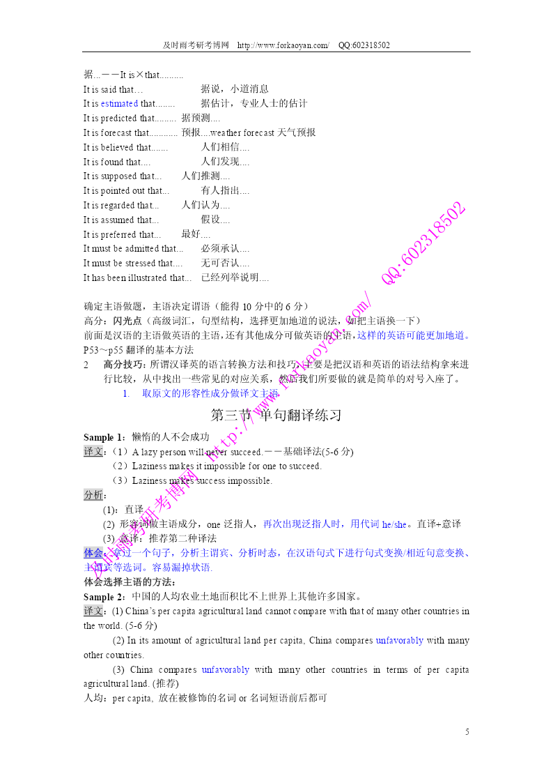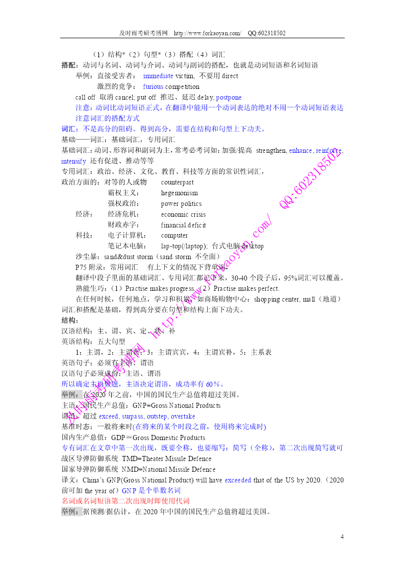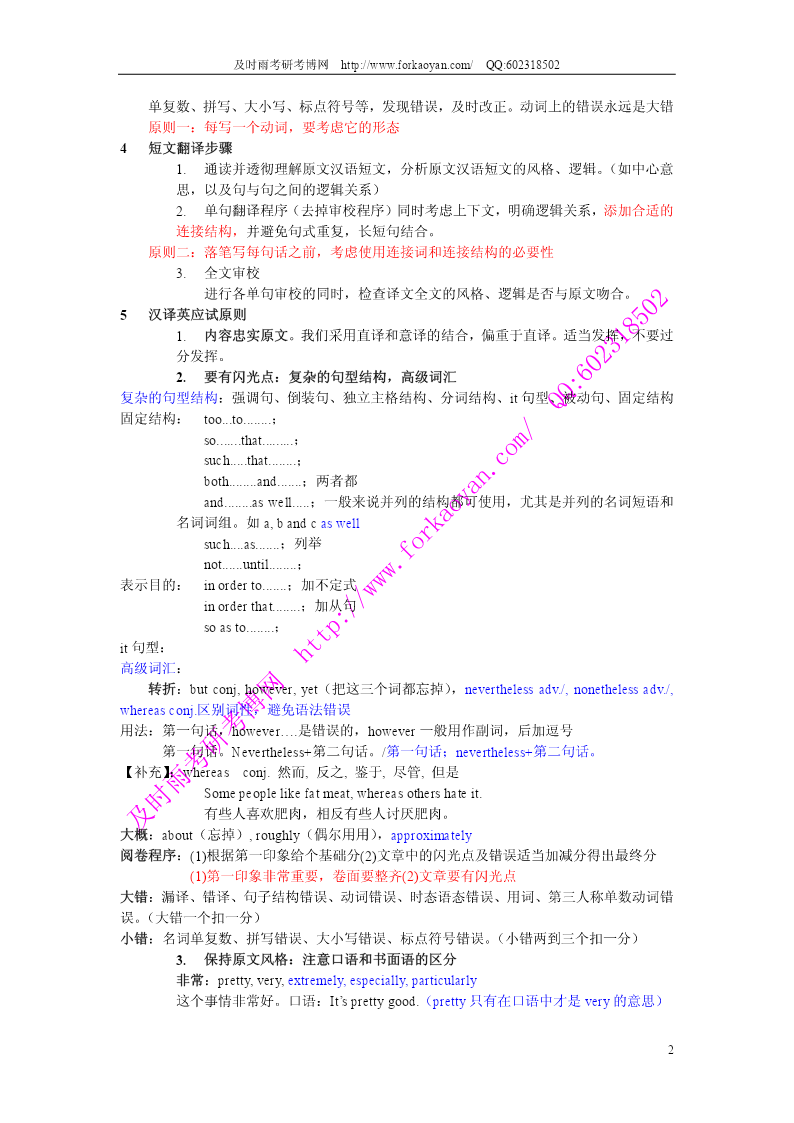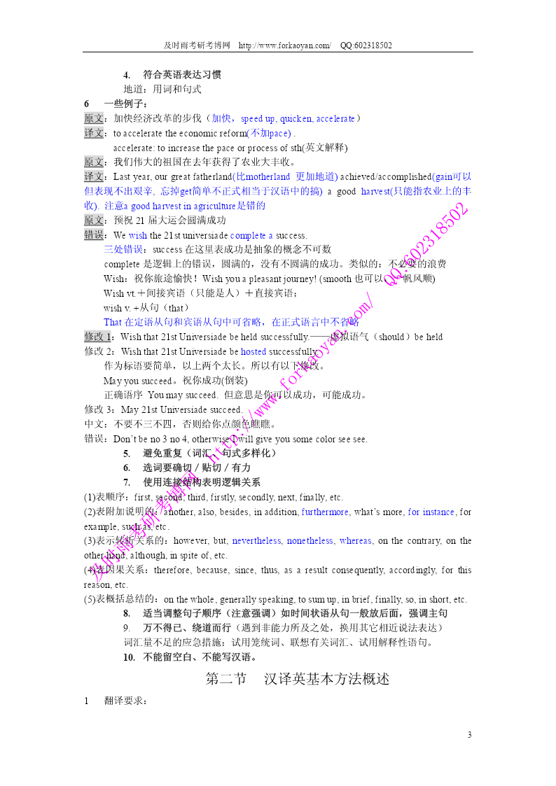 及时雨考研考博网http://www.forkaoyan.com/QQ:602318502 第一讲汉译英的特点和步骤 一、汉译英的特点和基本程序 1汉译英都是短文翻译,而作为基础则需要从句子开始. 2汉译英题目的测试点:在于测试考生对英语常用词汇、习惯用法和句子结构的掌握情 况。同时还要测试考生将汉语短文转换为英语时对上下文的理解。表达原文的连贯性、 完整性、以及行文流畅的能力。 3汉译英基本程序——单句翻译过程 3.1阅读 通读并透彻理解原文汉语句子,分析原文汉语句子的风格、逻辑和句型。 a)风格:正式还是非正式 b)逻辑:短语和短语之间的逻辑关系 c)句型:分析汉语句型,因为汉语句型和英语句型有着特定的对应关系。 例子:现在必须采取措施来保护环境(表目的) 分析:找主语->无主语,也就是无主句 无主语:对应英文三种句型:形式主语、therebe句型、被动句型。 例句:必须采取措施保护环境。 1.形式主语:Itisnecessary...,Itisessential... Itisnecessarytotakemeasurestoprotecttheenvironment.(不定式表目的). “必须”:essential,imperative。能用高级词汇就用高级词汇。 Itisimperativeto… adoptmeasures采取措施 adopt:有两个意思,采取采纳;收养; Itisimperativetoadoptmeasurestoprotecttheenvironment. 2.therebe句型 Thereisnecessitytoadoptmeasurestoprotecttheenvironment. 3.被动句型(找被动句型的主语-:措施) Measuresshouldbeadopted(taken)toprotecttheenvironment. 4.特殊句型:是到做某事的时候了 Itistimetodosth....是到做某事的时候了 Itishightimetoadoptmeasurestoprotecttheenvironment.(更加地道) 使用从句,从句使用虚拟语气,动词用一般过去时 Itishightimethatmeasureswereadoptedtoprotecttheenvironment. 3.2确定句型、结构 1)确定基准时态,能够避免犯大的语法错误 比如:记叙文――一般过去时,以及他的变化 议论文、说明文――一般现在时 2)确定主语、确定句型、结构、定修饰语(定、状、补)位置 在理解基础上变换原文汉语句子的说法和词序的过程,即汉英两种语言表达方式的转 换过程. 3)译文句子的组织、表达 3.3审校 这是不可缺少的一个重要环节,一定要对照原文,首先检查译文是否正确的转述了原 文的内容,是否有错译和漏译;其次,检查是否有语言上的明显错误,如:时态、语态、 1 及时雨考研考博网http://www.forkaoyan.com/QQ:602318502 单复数、拼写、大小写、标点符号等,发现错误,及时改正。动词上的错误永远是大错 原则一:每写一个动词,要考虑它的形态 4短文翻译步骤 1.通读并透彻理解原文汉语短文,分析原文汉语短文的风格、逻辑。(如中心意 思,以及句与句之间的逻辑关系) 2.单句翻译程序(去掉审校程序)同时考虑上下文,明确逻辑关系,添加合适的 连接结构,并避免句式重复,长短句结合。 原则二:落笔写每句话之前,考虑使用连接词和连接结构的必要性 3.全文审校 进行各单句审校的同时,检查译文全文的风格、逻辑是否与原文吻合。 5汉译英应试原则 1.内容忠实原文。我们采用直译和意译的结合,偏重于直译。适当发挥,不要过 分发挥。 2.要有闪光点:复杂的句型结构,高级词汇 复杂的句型结构:强调句、倒装句、独立主格结构、分词结构、it句型、被动句、固定结构 固定结构:too...to........; so.......that.........; such.....that........; both........and.......;两者都 and........aswell.....;一般来说并列的结构都可使用,尤其是并列的名词短语和 名词词组。如a,bandcaswell such....as.......;列举 not......until........; 表示目的:inorderto.......;加不定式 inorderthat........;加从句 soasto........; it句型: 高级词汇: 转折:butconj,however,yet(把这三个词都忘掉),neverthelessadv./,nonethelessadv./, whe