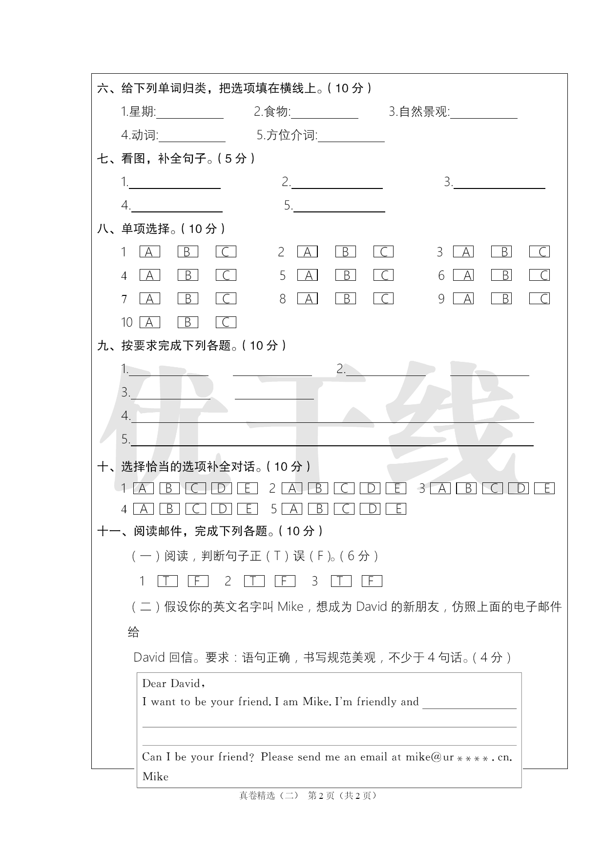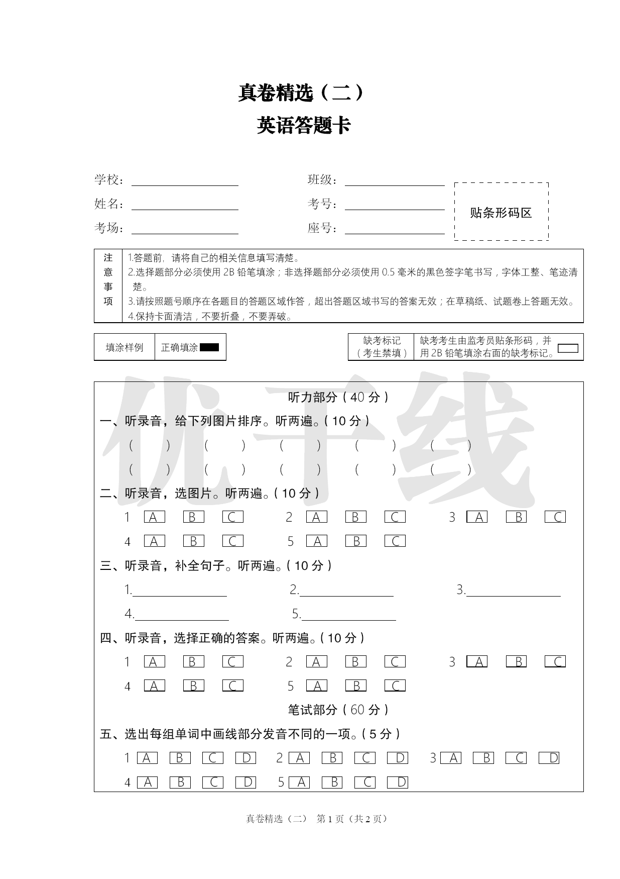 真卷精选(二)第页() 真卷精选(二) 英语答题卡 贴条形码区学校:班级: 姓名:考号: 考场:座号: 注意事项1.答题前,请将自己的相关信息填写清楚。 2.选择题部分必须使用2B铅笔填涂;非选择题部分必须使用0.5毫米的黑色签字笔书写,字体工整、笔迹清楚。 3.请按照题号顺序在各题目的答题区域作答,超出答题区域书写的答案无效;在草稿纸、试题卷上答题无效。 4.保持卡面清洁,不要折叠,不要弄破。 填涂样例正确填涂缺考标记 (考生禁填)缺考考生由监考员贴条形码,并 用2B铅笔填涂右面的缺考标记。 听力部分(40分) 听录音,给下列图片排序。听两遍。(10分) ()()()()() ()()()()() 听录音,选图片。听两遍。(10分) 1ABC2ABC3ABC 4ABC5ABC 三、听录音,补全句子。听两遍。(10分) 1.2.3. 4.5. 四、听录音,选择正确的答案。听两遍。(10分) 1ABC2ABC3ABC 4ABC5ABC 笔试部分(60分) 选出每组单词中画线部分发音不同的一项。(5分) 1ABCD2ABCD3ABCD 4ABCD5ABCD 六、给下列单词归类,把选项填在横线上。(10分) 1.星期:2.食物:3.自然景观: 4.动词:5.方位介词: 看图,补全句子。(5分) 1.2.3. 4.5. 八、单项选择。(10分) 1ABC2ABC3ABC 4ABC5ABC6ABC 7ABC8ABC9ABC 10ABC 九、按要求完成下列各题。(10分) 1.2. 3. 4. 5. 选择恰当的选项补全对话。(10分) 1ABCDE2ABCDE3ABCDE 4ABCDE5ABCDE 阅读邮件,完成下列各题。(10分) 阅读,判断句子正(T)误(F)。(6分) 1TF2TF3TF 假设你的英文名字叫Mike,想成为David的新朋友,仿照上面的电子邮件给 David回信。要求:语句正确,书写规范美观,不少于4句话。(4分)