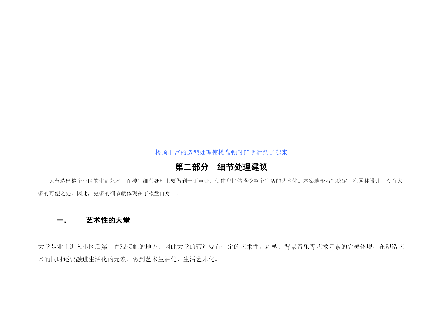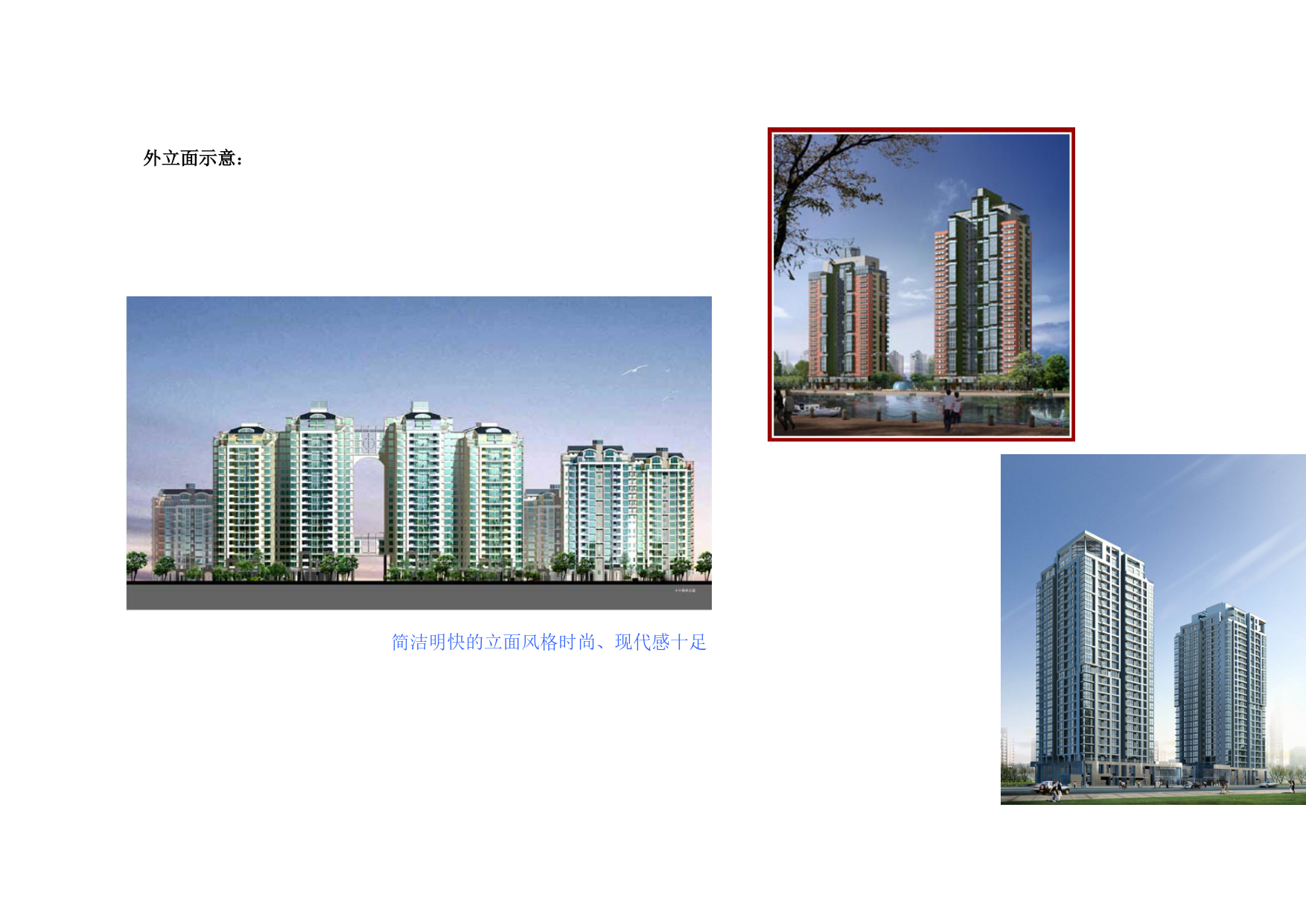 产品篇 因本项目的产品设计已基本完成,并且户型设计比较合理。我公司策划部仅对本项目的立面、物管、大堂及智能化等细节问题提出部分建议,仅供参考。 第一部分立面处理建议 1、现代精神:无论是外在还是建筑的精神内涵都体现了现代人的快节奏,高效率,意气风发的生活实质。 2、时尚视界:使人们从看到的第一眼就认同了它与时尚的同步,与现代生活的融洽。 虽然建筑物为单体点式建筑,在建筑形体上存在一定的弊端,但在色彩和材质的设计同样可以用心体现出鲜明的设计个性, ◆底层采用深色系毛面板岩贴面:用材料的质感体现楼盘的沉稳。 ◆大型落地外挑凸窗或玻璃厅墙结合部分面砖外墙丰富外立面的变化,色彩用明快的冷色调强化建筑的现代感 ◆窗台线脚和外分隔线条等细部处理上采用不同颜色的色带 ◆在楼顶的处理上采用上翘的飘顶或独特造型丰富现代建筑普遍存在的楼顶单调的视觉感。 外立面示意: 简洁明快的立面风格时尚、现代感十足 楼顶示意: 楼顶丰富的造型处理使楼盘顿时鲜明活跃了起来 第二部分细节处理建议 为营造出整个小区的生活艺术,在楼宇细节处理上要做到于无声处,使住户悄然感受整个生活的艺术化。本案地形特征决定了在园林设计上没有太多的可塑之处。因此,更多的细节就体现在了楼盘自身上。 一.艺术性的大堂 大堂是业主进入小区后第一直观接触的地方。因此大堂的营造要有一定的艺术性,雕塑、背景音乐等艺术元素的完美体现,在塑造艺术的同时还要融进生活化的元素。做到艺术生活化,生活艺术化。 二.艺术走廊 在每层入户走廊设置艺术字画、名人名言等具有浓厚艺术气息的装饰品。在提升整个楼盘艺术品位的同时,将“雅致”房产之所谓为雅致的开发理念展现给住户。 第三部分物业管理建议 本项目物业管理应注重以下几个方面: ◆树立超前物业管理服务理念,大胆外聘专业品牌物业管理公司。物业公司主要做到: 其一:负责制定和解释小区管理的有关规章制度;其二:负责清洁、环卫、绿化、治安保卫等工作;其三:负责公共设施,市政管网的维护和保养;其四:为区内业主提供家居清洁、洗衣、订票、维修、送餐各类有偿服务;其五:组织各类社区文化活动。 ◆倡导“体验式”物业管理模式,给业主健康、休闲、浪漫的全新生活体验。突出从以下几方面“体验”: 体验式环境:如背景音乐、景点灯光精心布置营造浪漫情怀。 体验式氛围:定期举办不同主题的社区文化活动,营造温馨家园。 体验式服务:提供常规服务、个性服务,营造亲情与个性化社区。 ◆小区周边外围设置景观围墙,利于小区和周边隔离,加强安保措施,24小时巡查、监控,消除周边带来的安全隐患。 ◆采用统一的VI形象系统进行配置,创建统一的小区标识系统 ◆智能化物业管理,智能化系统有: 物业管理智能化系统:楼宇自控系统,背景音乐系统系统,车库智能化管理系统。 电子安防系统:闭路监控系统,红外防盗报警系统,瓦斯火警系统,IC门禁系统。 信息网络系统:紧急广播系统,有线电视通讯系统。 家居智能化管理系统:因特网,室内网控系统。 物业管理公司的提前介入有利于楼盘的营销推广及品牌形象塑 第四部分一层底商改造建议 济南的商业经过多年沉淀,形成泉城路(高档零售为主的综合业态)、经二路(中高档百货为主的商业零售综合业态)、经四路(中档百货为主的商业零售综合业态)、花园路(区域配套为主的商业零售综合业态)、北园路(家具、建材为主的综合业态)、山大路(数码产品为主的综合业态)、济泺路(百货批发为主的商业零售综合业态)七大商圈,满足全市甚至辐射山东全省居民的衣食住行。 本项目地段恰是经四路商圈的副中心位置,具有浓厚的商业氛围,因此本项目底商具有较强的商业投资价值,是众多商家追捧的对象。但是当前的规划设计,将楼盘大堂入口处设置在了经四路上,虽然从形象上考虑,提升了楼盘的品质感,但从贵司的开发利润而言,无疑大大的降低了利润空间。由于本项目南北进深为34米,此长度于底层商铺来说还是较为适宜的距离,因此,我司建议,将大堂入口移至南方。将一层全部作为底商,对外销售。 如果单从贵司利润最大化考虑,我司建议将项目按店面均匀分割,每个约为100平米左右的单店销售,此分割方式有利于将单店价格提升,加大利润率。如考虑楼盘整体品牌形象,则建议对外引进银行、电信等形象型企业,整体出售。此方式操作简单,但不利于利润最大化。