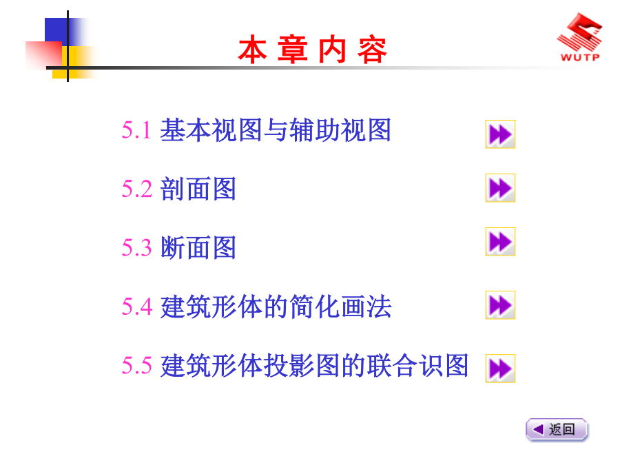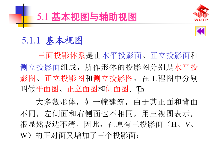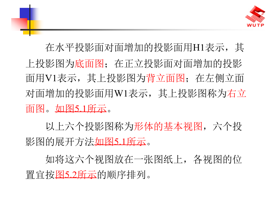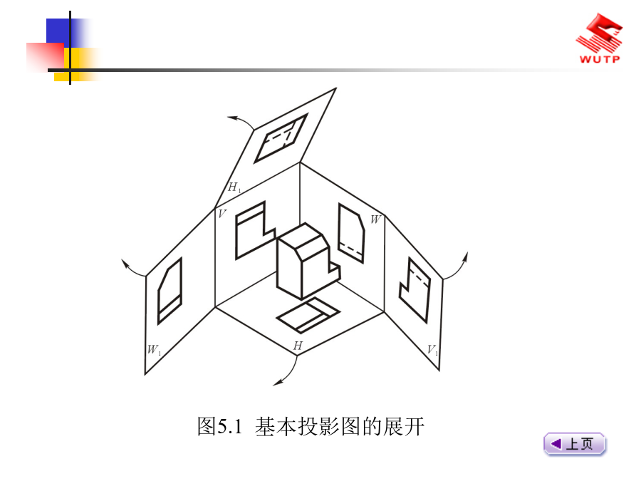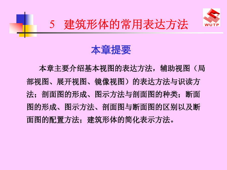 5建筑形体的常用表达方法本章内容三面投影体系是由水平投影面、正立投影面和侧立投影面组成,所作形体的投影图分别是水平投影图、正立投影图和侧立投影图,在工程图中分别叫做平面图、正立面图和侧面图。 大多数形体,如一幢建筑,由于其正面和背面不同,左侧面和右侧面也不相同,用三视图表示,很显然表达不清。因此,在原有三投影面(H、V、W)的正对面又增加了三个投影面:在水平投影面对面增加的投影面用H1表示,其上投影图为底面图;在正立投影面对面增加的投影面用V1表示,其上投影图为背立面图;在左侧立面对面增加的投影面用W1表示,其上投影图称为右立面图。如图5.1所示。 以上六个投影图称为形体的基本视图,六个投影图的展开方法如图5.1所示。 如将这六个视图放在一张图纸上,各视图的位置宜按图5.2所示的顺序排列。图5.1基本投影图的展开图5.2基本投影图的配置5.1.2辅助视图图5.3局部视图有些形体由互相不垂直的两部分组成,作投影图时,可以将平行于其中一部分的面作为一个投影面,而另一部分必然与这个投影面不平行,在该投影面上的投影将不反映实形,不能具体反映形体的形状和大小。 为此,将该部分进行旋转,使其旋转到与基本投影面平行的位置,再作投影图,这种投影图称为展开投影图,如图5.4所示。图5.4展开视图当从上向下的正投影法所绘图样的虚线过多、尺寸标注不清楚,无法读图时,可以采用镜像投影的方法投影,如图5.5所示,但应在原有图名后注写“镜像”二字。 绘图时,把镜面放在形体下方,代替水平投影面,形体在镜面中反射得到的图像,称为“平面图(镜像)”。图5.5镜像投影图的画法5.2剖面图如果用一正平面通过形体的前后对称面将其剖切开,则原来的不可见的部分全部暴露出来,从而使虚线变成实线,读图和尺寸标注都容易进行,如图5.8所示。 用一个假想的剖切平面将形体剖切开,移去位于观察者和剖切平面之间的部分,作出剩余部分的正投影图叫做剖面图。图5.6建筑形体正投影图与剖面图的比较图5.7形体的三面投影图图5.8剖面图的形成5.2.2剖面图的画图步聚为了将形体中被剖切平面切到的部分和未切到部分区分开,《房屋建筑制图统一标准》(GB/T50001—2001)规定,形体剖面图中,被剖切平面剖切到的部分轮廓线用粗实线绘制,未被剖切平面剖切到但可见部分的轮廓线用中粗实线绘制,不可见的部分可以不画。形体被剖切后,断面反映出构件所采用的材料,因此,在剖面图中,相应的断面上应画出相应的材料符号。表5.1是《房屋建筑制图统一标准》(GB/T50001—2001)(详见P58)中规定的部分常用建筑材料的图例符号,画图时应按照规定执行。 在钢筋混凝土构件投影图中,当剖面图主要用于表达钢筋的布置时,可不画混凝土的材料图例。《房屋建筑制图统一标准》(GB/T50001—2001)中规定剖切符号由剖切位置线和剖视方向线组成,剖切位置线是长度为6~10mm的粗实线,剖视方向线是4~6mm的粗实线,剖切位置线与剖视方向线垂直相交,并应在剖视方向线旁边加注编号。 如图5.9所示,在剖面图的下方应写上带有编号的图名,如“×-×剖面图”。图5.9剖切符号的画法用一个剖切平面将形体完整地剖切开,得到的剖面图,叫做全剖面图。全剖面图一般应用于不对称的建筑形体,或对称但较简单的建筑构件中。 如图5.10所示,该形体虽然对称,但比较简单,分别用正平面、侧平面和水平面剖切,得到1-1剖面图、2-2剖面图和3-3剖面图。图5.10形体的全剖面图如果形体对称,画图时常把投影图一半画成剖面图,另一半画成外观图,这样组合而成的投影图叫做半剖面图。 如图5.11所示为前面图5.7的形体,因形体的前后对称,用侧平面将形体的左前方剖切开,使得侧面投影的一半为外视图,一半为剖面图。 图5.12为一独立基础的施工图,该图中平面图是普通正投影图,正面投影和侧面投影都采用半剖面图,将形体外表面和内部全部反映出来。图5.11形体的半剖面图图5.12独立基础的半剖面图用两个或两个以上的互相平行的剖切平面将形体剖切开,得到的剖面图称为阶梯剖面图。如图5.13所示。用两个或两个以上相交剖切平面剖切形体,所得到的剖面图称作展开剖面图。 展开剖面图的图名后应加注“展开”字样,剖切符号的画法如图5.14所示。 因展开剖面图将形体剖切开后需要将形体进行旋转,因此,有时也称为旋转剖面图。 图5.15为筒仓建筑物的施工图图5.14楼梯的展开剖面图图5.15筒仓建筑物的施工图当仅仅需要表达形体的某局部内部构造时,可以只将该局部剖切开,只作该部分的剖面图,称为局部剖面图。 如图5.16所示为基础局部剖面图。波浪线不得超过图形轮廓线,也不能画成图形的延长线。 对一些具有不同层次构造的建筑构件,可按实际需要,用分层剖切的方法获得剖面图,称为分层剖面图。