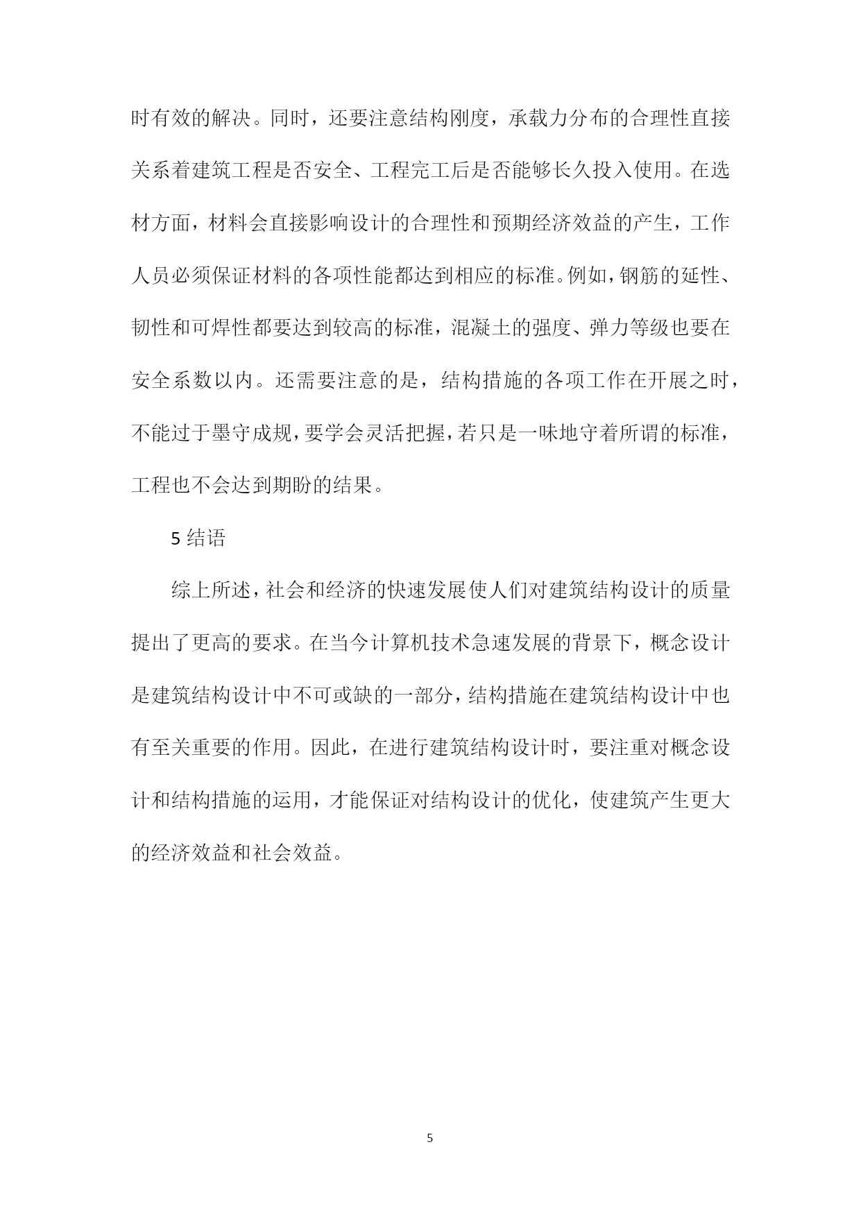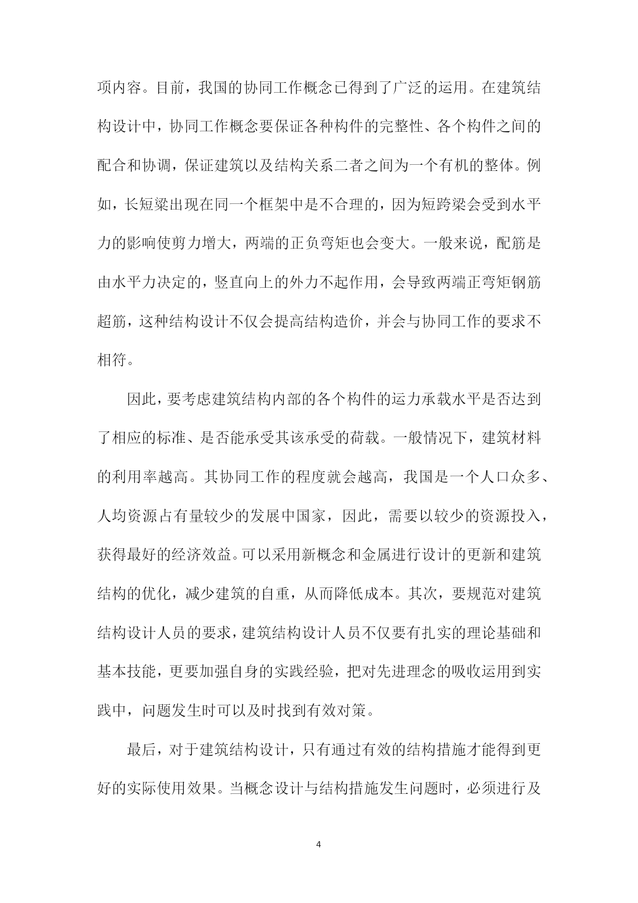 概念设计在建筑结构设计的运用 1引言 近年来,建筑产业得到了突飞猛进的发展,社会对建筑设计也提出了更高的要求。在当今的建筑工程设计中,结构设计不再局限于传统的设计模式中,有了新技术和新理念,有效促进了建筑结构的优化与创新,给建筑施工技术带来了更好的发展空间。 2建筑结构设计概述 建筑结构设计就是建筑结构设计人员对所要施工的建筑的表达。一般来说,建筑结构设计主要分为3个阶段:结构方案阶段、结构计算阶段和施工图设计阶段。结构设计方案是指根据建筑方案及建筑的重要性、工程地质勘测报告、建筑所在地抗震设防烈度以及建筑的高度和楼层等确定建筑的结构形式。确定结构形式后,根据需要的不同结构形式的特点和要求布置结构的承重体系和抗震体系,最后,根据实际情况绘制建筑结构平面布置图。在建筑结构设计工作中,概念设计和结构措施十分重要,它反映了设计工作人员的设计水平和工作成果。近年来,我国设计行业高速发展,其设计理念和设计方法也由传统的经验计算、容许应力计算和破损计算状态逐步发展成一种为人们普遍所接受的设计模式[1]。 3建筑结构设计中的概念设计与结构措施 3.1概念设计与结构措施概述。建筑结构设计中的概念设计,就是利用人们对建筑结构抗震设计的相关知识,加强对建筑结构设计工作中的问题的把握和控制。通常情况下,在利用概念设计时,主要内容是从建筑结构设计的总方案开始。但是从宏观角度讲,通常所说的概念设计和结构措施的运用,是指对建筑结构设计中发现的问题进行有效的分析和评价,并通过合理的方法进行鉴别,最终进行优化选择,根据计算加强对相关数据的整理以及对建筑结构设计中的薄弱部位进行控制和优化。在这个过程中,对建筑结构设计工作人员的判断思维能力有很高的要求,他们需要从大量的经验中总结出有效的方法,利用概念设计与结构措施,有效地解决建筑结构设计中出现的问题,不断优化结构方案及计算模型。 不仅要对建筑的整体结构的抗震设计及其相关特点有全方面的了解,还要考虑建筑结构承载力的分布情况,及时找到合理的方法和设计理念进行设计。建筑结构设计中的结构措施首先是要在结构体系中保持各结构构件协调工作,建筑结构内部各部件之间应相互协作,共同工作,并且要有共同的耐久时间,共同承受荷载。其次,是在协调工作中保证材料的利用率,一般来说,材料利用率越高,结构的稳定性和协调工作能力越高。在我国的建筑结构设计中,一般都会要求用最少的投入获得最大的产出,因此,对材料的充分利用是结构设计的基本要求。 3.2建筑结构设计中概念设计的重要性。首先,概念设计可以提高方案的完美性,在建筑设计的方案时期,通过概念设计可以加强对建筑结构体系的分析,通过比较做出合理的选择。因此,通过概念设计做出的方案有清晰的概念和正确的定性,并可以有效避免不必要的烦琐的运算,还可以保证方案设计的经济性。其次,概念设计加强了计算结果的可靠性,概念设计可以及时解决设计中出现的问题,提高设计水平,在设计过程中出现的问题都可以通过概念设计分析出原因,使问题得到有效解决。 并且概念设计可以提高建筑结构设计的创新性,如果建筑工程师的经验十分丰富,那么概念设计也会做得很好,设计成果也会优秀。当今社会分工明确,设计过程中不能依赖所谓的设计手册和设计规范,因此,只有通过概念设计才能保证设计的创新性,才能突破传统的设计局限。最后,概念设计可以弥补建筑结构设计中计算机设计的不足,因为计算机是无法完成初步设计的,只有通过概念设计,结合工程师掌握的知识和经验才能做出最优化的结构方案。 4概念设计与结构措施在建筑结构设计中的运用分析 首先,要保证协调设计工作的有序发展和材料利用率的提高,协同工作与材料利用率的应用是概念设计与结构措施中十分重要的一项内容。目前,我国的协同工作概念已得到了广泛的运用。在建筑结构设计中,协同工作概念要保证各种构件的完整性、各个构件之间的配合和协调,保证建筑以及结构关系二者之间为一个有机的整体。例如,长短粱出现在同一个框架中是不合理的,因为短跨梁会受到水平力的影响使剪力增大,两端的正负弯矩也会变大。一般来说,配筋是由水平力决定的,竖直向上的外力不起作用,会导致两端正弯矩钢筋超筋,这种结构设计不仅会提高结构造价,并会与协同工作的要求不相符。 因此,要考虑建筑结构内部的各个构件的运力承载水平是否达到了相应的标准、是否能承受其该承受的荷载。一般情况下,建筑材料的利用率越高。其协同工作的程度就会越高,我国是一个人口众多、人均资源占有量较少的发展中国家,因此,需要以较少的资源投入,获得最好的经济效益。可以采用新概念和金属进行设计的更新和建筑结构的优化,减少建筑的自重,从而降低成本。其次,要规范对建筑结构设计人员的要求,建筑结构设计人员不仅要有扎实的理论基础和基本技能,更要加强自身的实践经验,把对先进理念的吸收运用到实践中,问题发