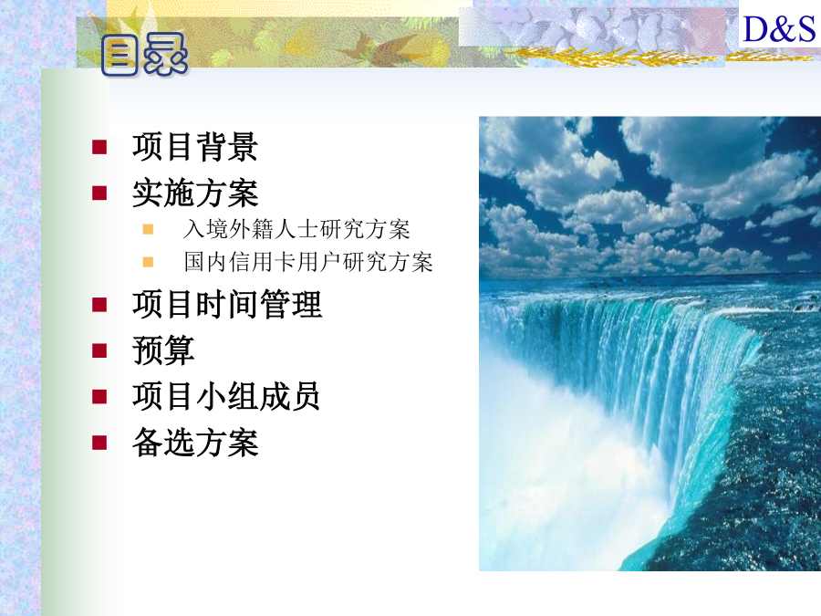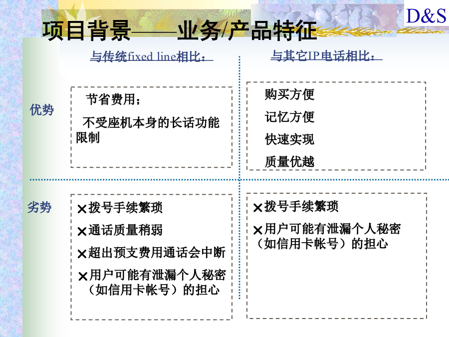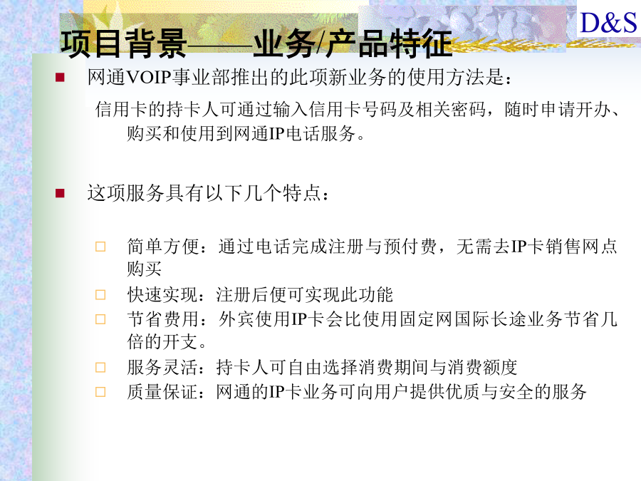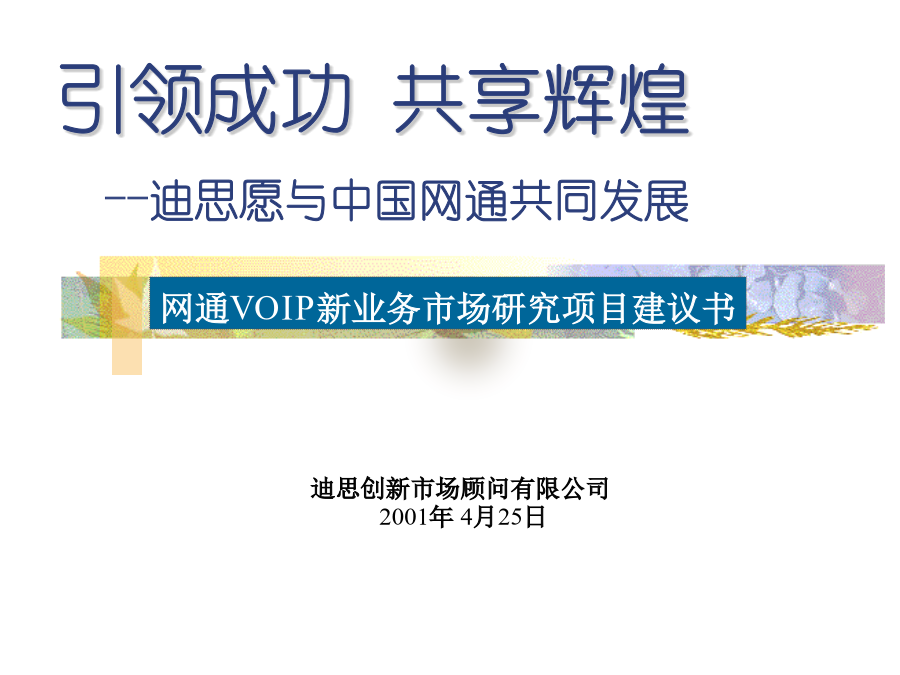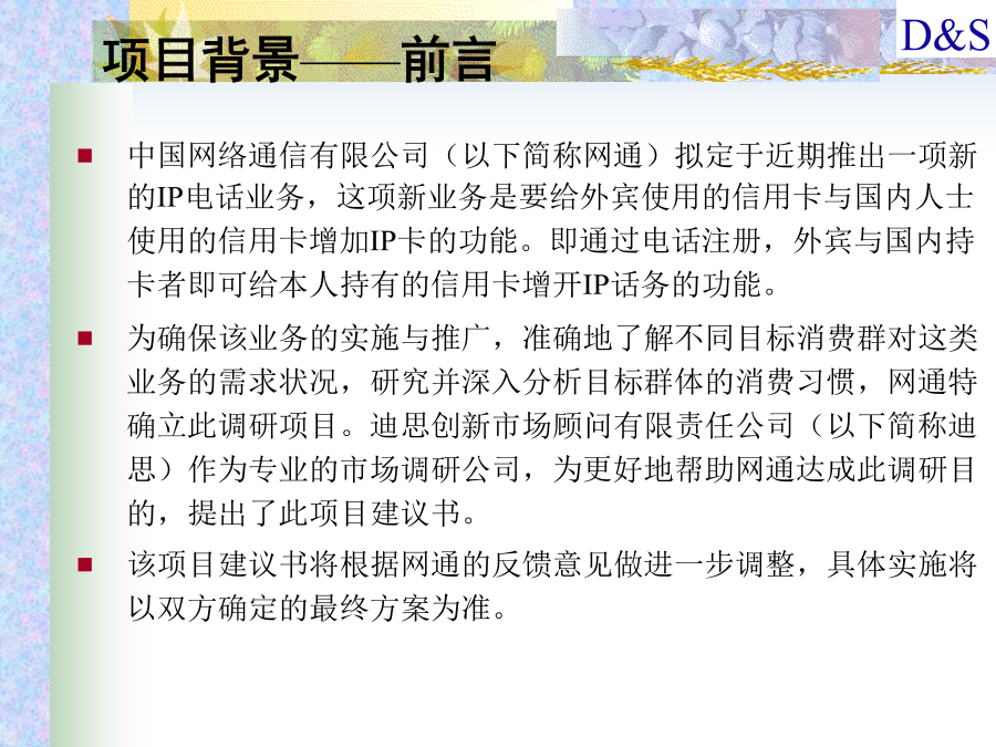 引领成功共享辉煌目录项目背景——前言网通VOIP事业部推出的此项新业务的使用方法是: 信用卡的持卡人可通过输入信用卡号码及相关密码,随时申请开办、购买和使用到网通IP电话服务。 这项服务具有以下几个特点: 简单方便:通过电话完成注册与预付费,无需去IP卡销售网点购买 快速实现:注册后便可实现此功能 节省费用:外宾使用IP卡会比使用固定网国际长途业务节省几倍的开支。 服务灵活:持卡人可自由选择消费期间与消费额度 质量保证:网通的IP卡业务可向用户提供优质与安全的服务项目背景——业务/产品特征通过调查主要了解以下问题 定义和描述愿意接受这种服务的用户的人群特征,预测市场份额,并主要对以下几个方面进行研究: 目标人群的金融消费习惯是不是符合这项服务的特点; 目标人群是否信任网通,愿意提供信用卡信息; 目标人群对与此相类的服务的接受习惯,对网通的此项服务的服务方式上的建议目标群体 入境外籍人士(旅游人士及商业人士) 国内持有信用卡的用户 测试地点: 入境外籍人士:北京、西安 国内持有信用卡的用户:北京、西安、福州(或厦门) 实施方案样本分析 抽样方法 样本细分 样本特点 调研手段样本分析:来中国旅游的外籍人士呈逐年递增趋势据2000年7月24日世界旅游组织做出的分析预测说,中国将成第一大旅游目的国 世界旅游组织预测到2020年中国将成为世界第一大旅游目的国和第四大旅游客源输出国。 世界旅游组织亚太部官员徐京先生说,2020年将有1.37亿国际旅游者到中国旅游,整个东亚及亚太地区接待国际旅游者人数可达到4.38亿,中国在这一区域市场中将占有31%的份额。抽样方法我们根据外籍人士来华的目的差异做出如下的市场细分项目可行性分析:样本特点我们的调查方案样本分析 抽样方法 样本细分 样本特点 调研手段样本分析抽样方法样本细分项目可行性分析:样本特点样本分布复杂项目时间管理项目时间管理项目时间管理报价报价项目小组人员组成考虑到前期沟通时网通提出的关于样本数量与预算方面的要求,我们特提供此备选方案以供网通进行选择。 我们可以通过减少一定的样本量的方法来降低部分的费用。通过迪思项目组成员的分析,在各地抽取以下的样本数量,也能够代表整个待调查的样本集合的所有特性。项目时间管理报价报价谢谢!