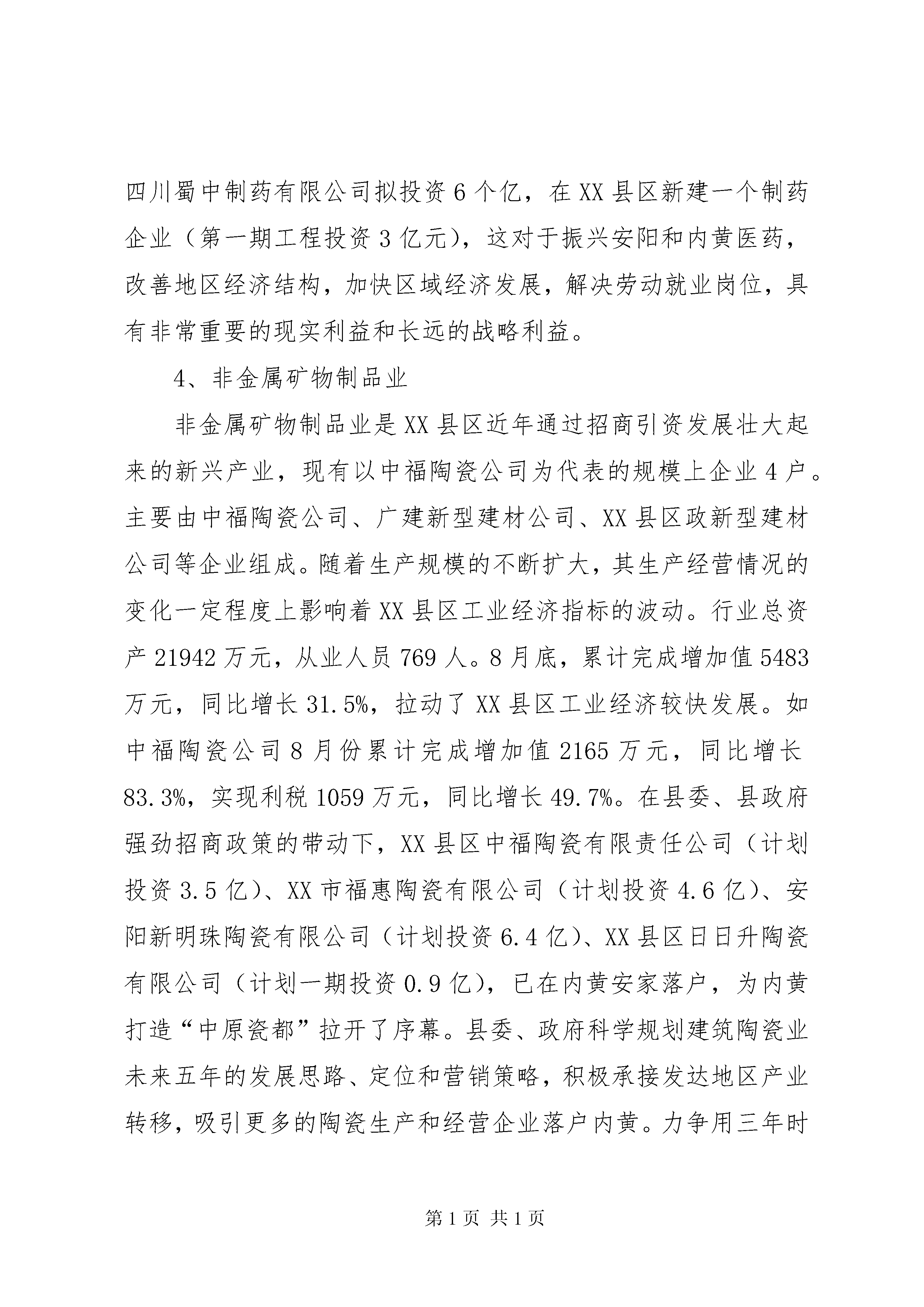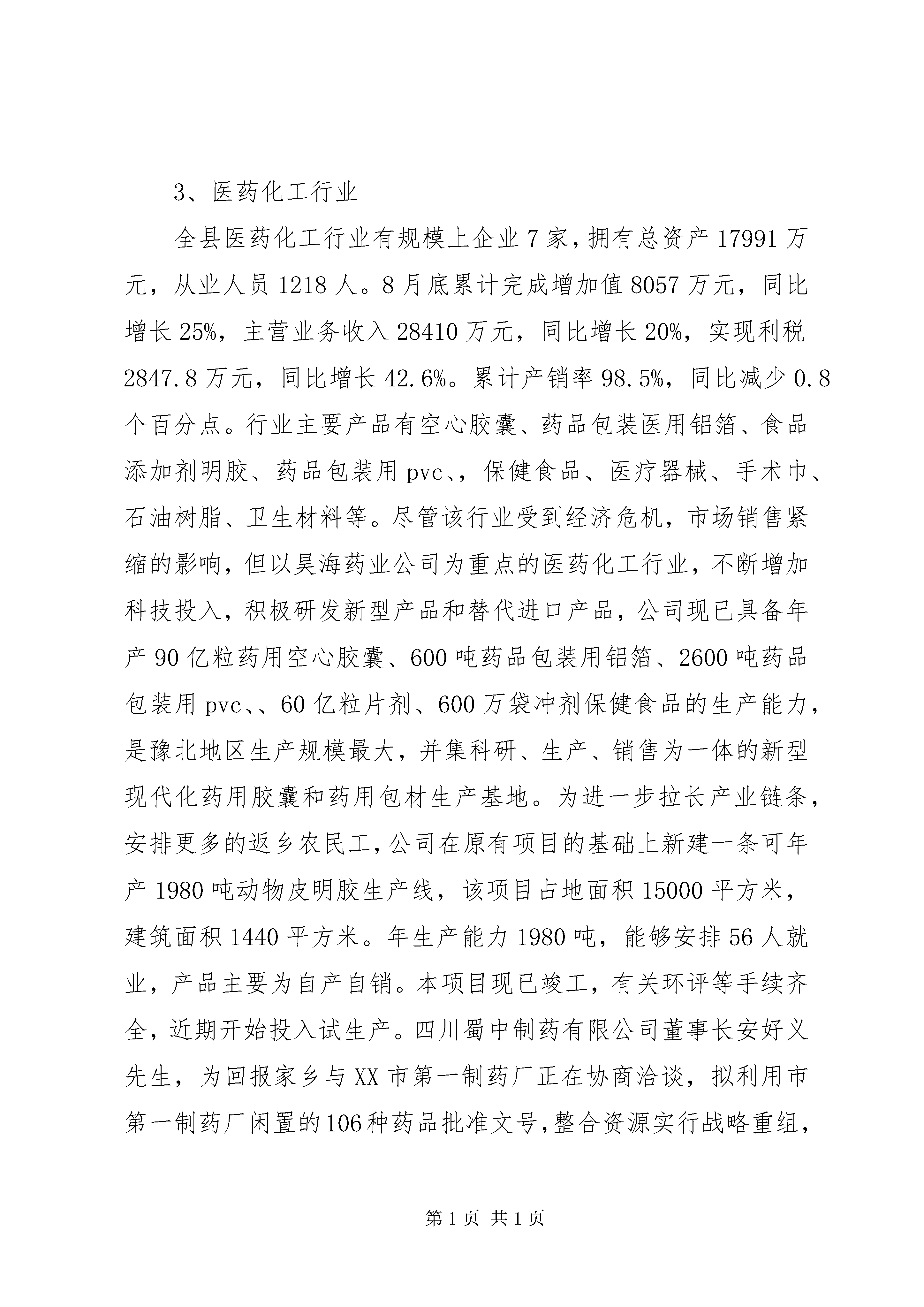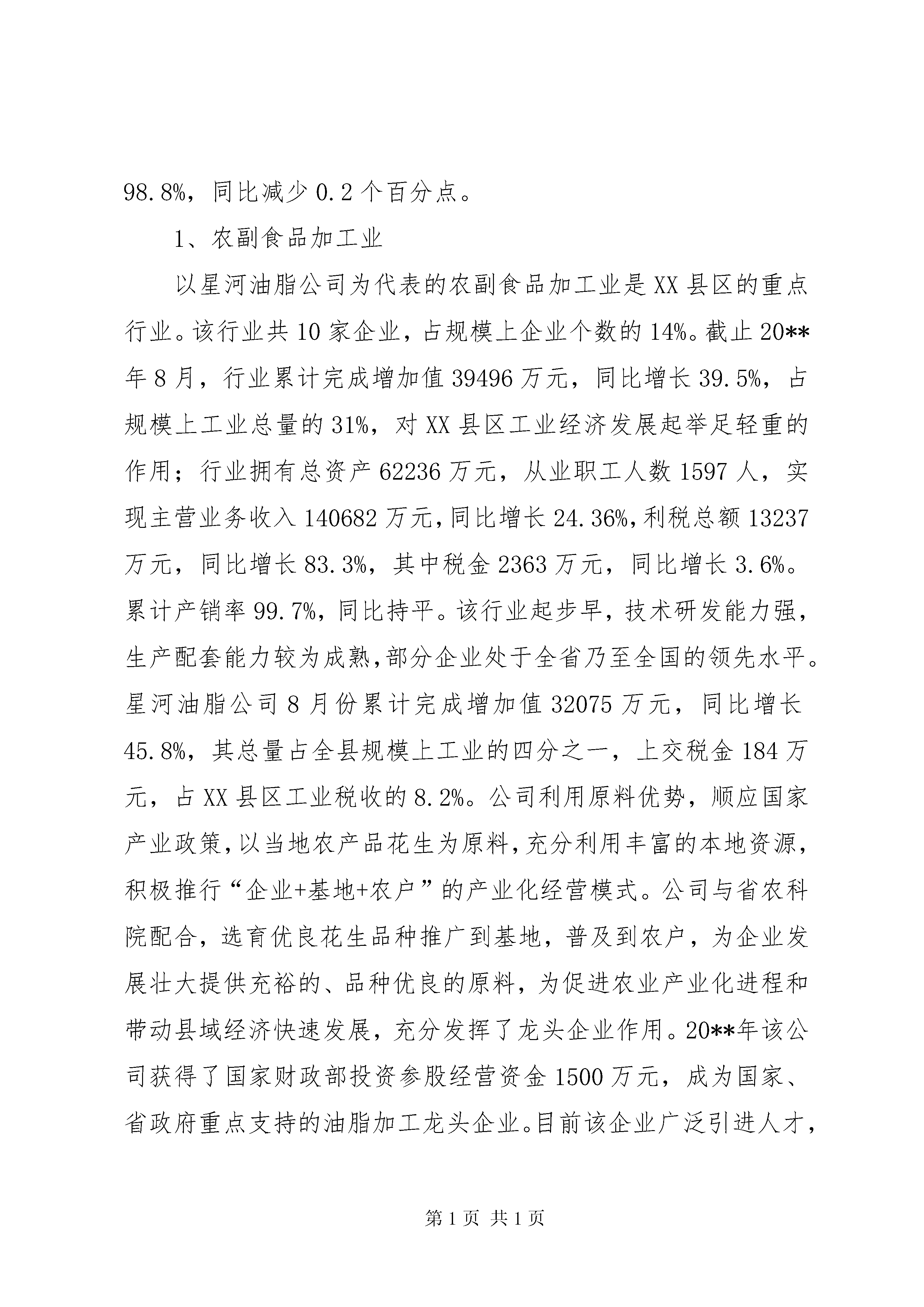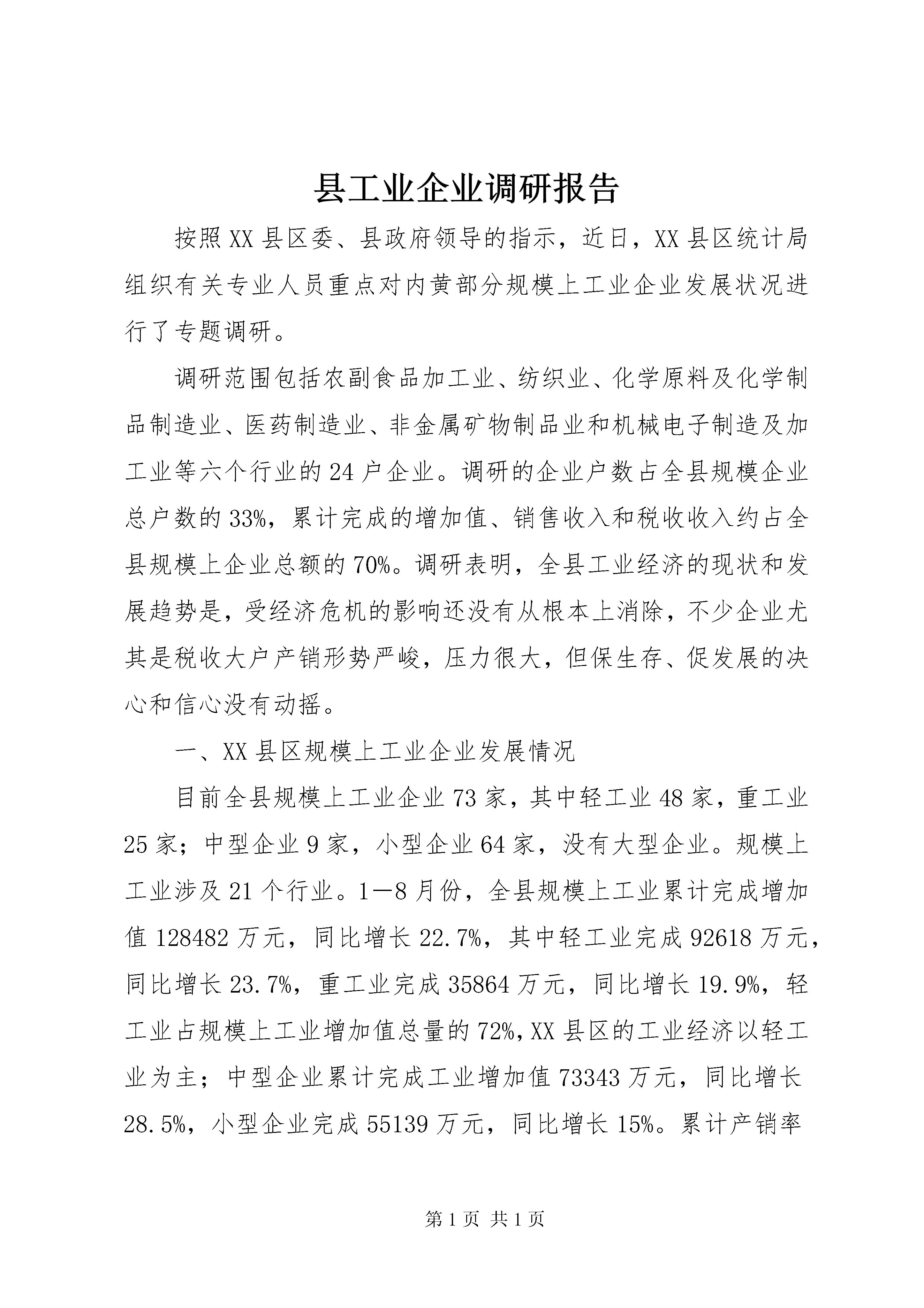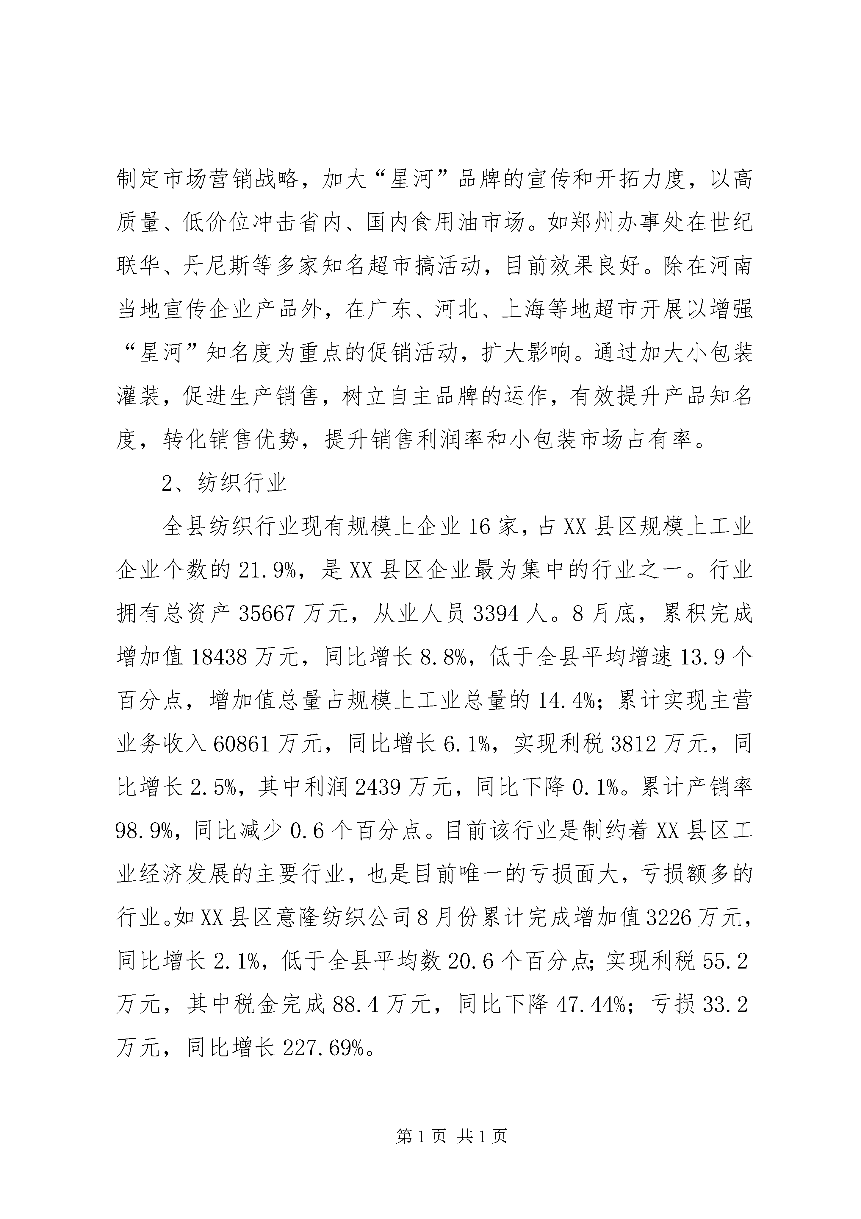 县工业企业调研报告按照XX县区委、县政府领导的指示,近日,XX县区统计局组织有关专业人员重点对内黄部分规模上工业企业发展状况进行了专题调研。调研范围包括农副食品加工业、纺织业、化学原料及化学制品制造业、医药制造业、非金属矿物制品业和机械电子制造及加工业等六个行业的24户企业。调研的企业户数占全县规模企业总户数的33%,累计完成的增加值、销售收入和税收收入约占全县规模上企业总额的70%。调研表明,全县工业经济的现状和发展趋势是,受经济危机的影响还没有从根本上消除,不少企业尤其是税收大户产销形势严峻,压力很大,但保生存、促发展的决心和信心没有动摇。一、XX县区规模上工业企业发展情况目前全县规模上工业企业73家,其中轻工业48家,重工业25家;中型企业9家,小型企业64家,没有大型企业。规模上工业涉及21个行业。1―8月份,全县规模上工业累计完成增加值128482万元,同比增长22.7%,其中轻工业完成92618万元,同比增长23.7%,重工业完成35864万元,同比增长19.9%,轻工业占规模上工业增加值总量的72%,XX县区的工业经济以轻工业为主;中型企业累计完成工业增加值73343万元,同比增长28.5%,小型企业完成55139万元,同比增长15%。累计产销率98.8%,同比减少0.2个百分点。1、农副食品加工业以星河油脂公司为代表的农副食品加工业是XX县区的重点行业。该行业共10家企业,占规模上企业个数的14%。截止20**年8月,行业累计完成增加值39496万元,同比增长39.5%,占规模上工业总量的31%,对XX县区工业经济发展起举足轻重的作用;行业拥有总资产62236万元,从业职工人数1597人,实现主营业务收入140682万元,同比增长24.36%,利税总额13237万元,同比增长83.3%,其中税金2363万元,同比增长3.6%。累计产销率99.7%,同比持平。该行业起步早,技术研发能力强,生产配套能力较为成熟,部分企业处于全省乃至全国的领先水平。星河油脂公司8月份累计完成增加值32075万元,同比增长45.8%,其总量占全县规模上工业的四分之一,上交税金184万元,占XX县区工业税收的8.2%。公司利用原料优势,顺应国家产业政策,以当地农产品花生为原料,充分利用丰富的本地资源,积极推行“企业+基地+农户”的产业化经营模式。公司与省农科院配合,选育优良花生品种推广到基地,普及到农户,为企业发展壮大提供充裕的、品种优良的原料,为促进农业产业化进程和带动县域经济快速发展,充分发挥了龙头企业作用。20**年该公司获得了国家财政部投资参股经营资金1500万元,成为国家、省政府重点支持的油脂加工龙头企业。目前该企业广泛引进人才,制定市场营销战略,加大“星河”品牌的宣传和开拓力度,以高质量、低价位冲击省内、国内食用油市场。如郑州办事处在世纪联华、丹尼斯等多家知名超市搞活动,目前效果良好。除在河南当地宣传企业产品外,在广东、河北、上海等地超市开展以增强“星河”知名度为重点的促销活动,扩大影响。通过加大小包装灌装,促进生产销售,树立自主品牌的运作,有效提升产品知名度,转化销售优势,提升销售利润率和小包装市场占有率。2、纺织行业全县纺织行业现有规模上企业16家,占XX县区规模上工业企业个数的21.9%,是XX县区企业最为集中的行业之一。行业拥有总资产35667万元,从业人员3394人。8月底,累积完成增加值18438万元,同比增长8.8%,低于全县平均增速13.9个百分点,增加值总量占规模上工业总量的14.4%;累计实现主营业务收入60861万元,同比增长6.1%,实现利税3812万元,同比增长2.5%,其中利润2439万元,同比下降0.1%。累计产销率98.9%,同比减少0.6个百分点。目前该行业是制约着XX县区工业经济发展的主要行业,也是目前唯一的亏损面大,亏损额多的行业。如XX县区意隆纺织公司8月份累计完成增加值3226万元,同比增长2.1%,低于全县平均数20.6个百分点;实现利税55.2万元,其中税金完成88.4万元,同比下降47.44%;亏损33.2万元,同比增长227.69%。3、医药化工行业全县医药化工行业有规模上企业7家,拥有总资产17991万元,从业人员1218人。8月底累计完成增加值8057万元,同比增长25%,主营业务收入28410万元,同比增长20%,实现利税2847.8万元,同比增长42.6%。累计产销率98.5%,同比减少0.8个百分点。行业主要产品有空心胶囊、药品包装医用铝箔、食品添加剂明胶、药品包装用pvc、,保健食品、医疗器械、手术巾、石油树脂、卫生材料等。尽管该行业受到经济危机,市场销售紧缩的影响,但以昊海药业公司为重点的医药化工行业,不断增加科技投入,积极研发新型产品