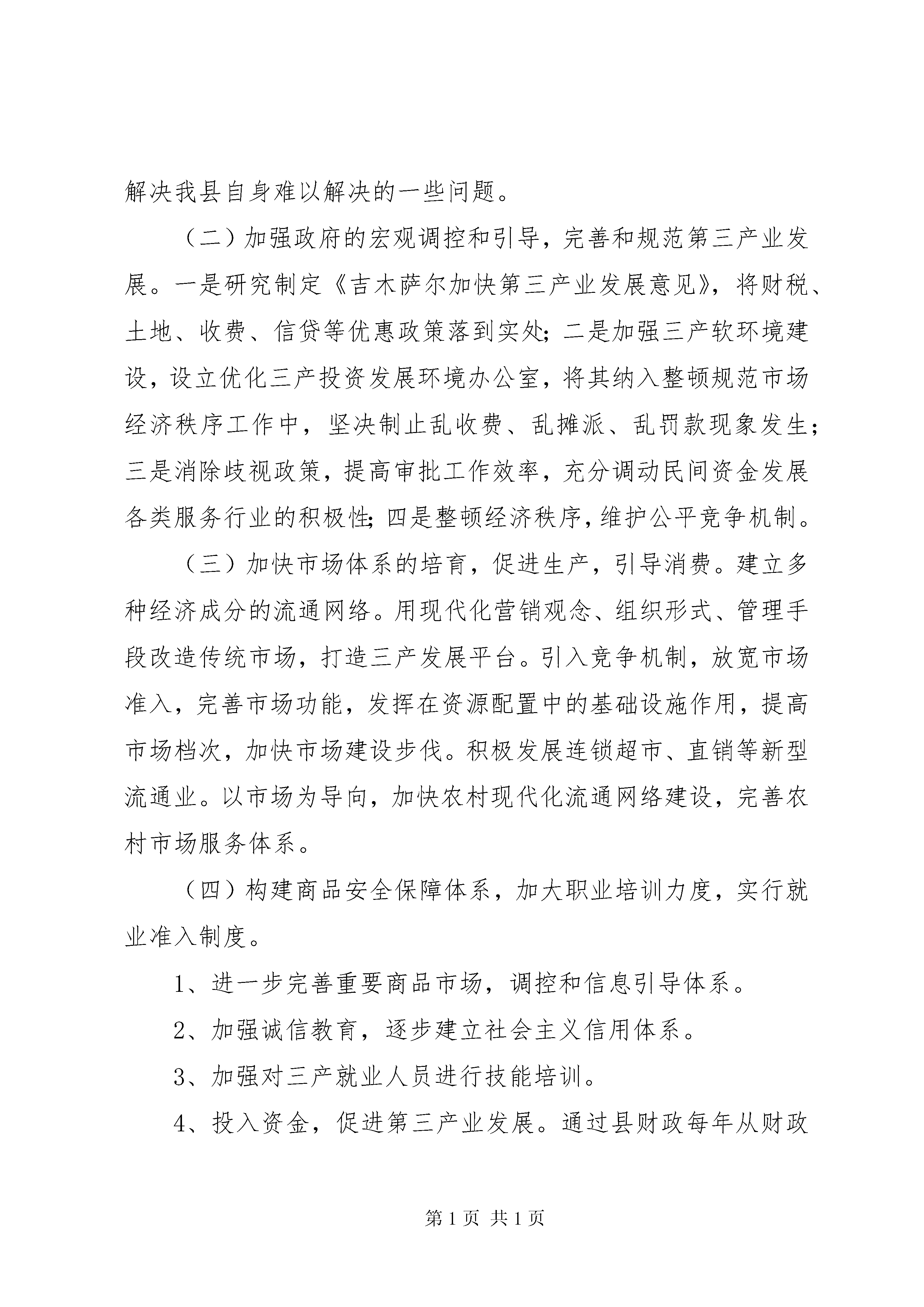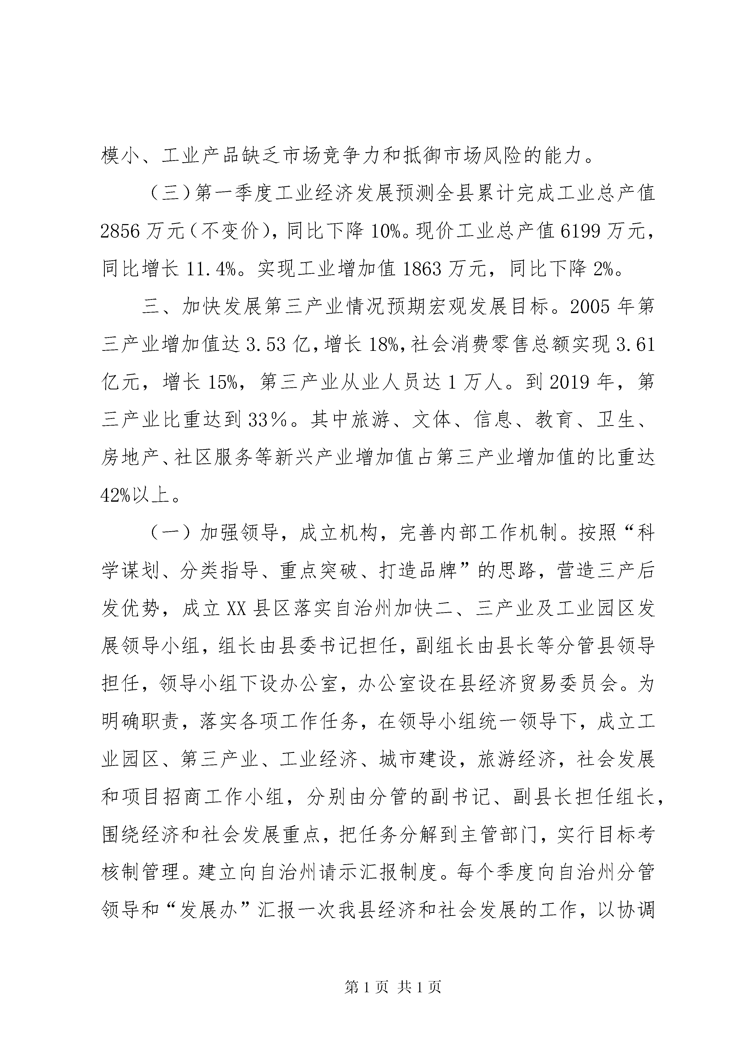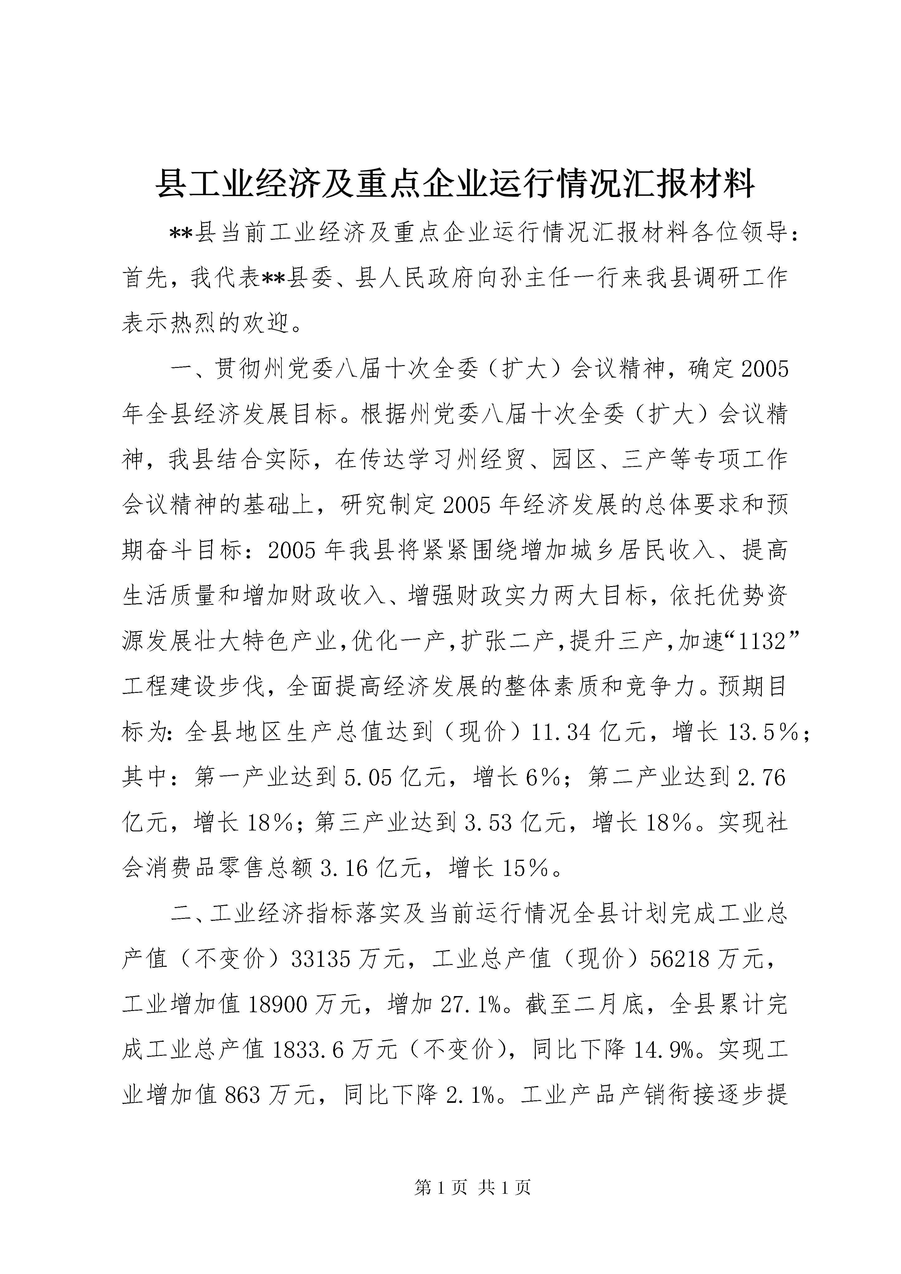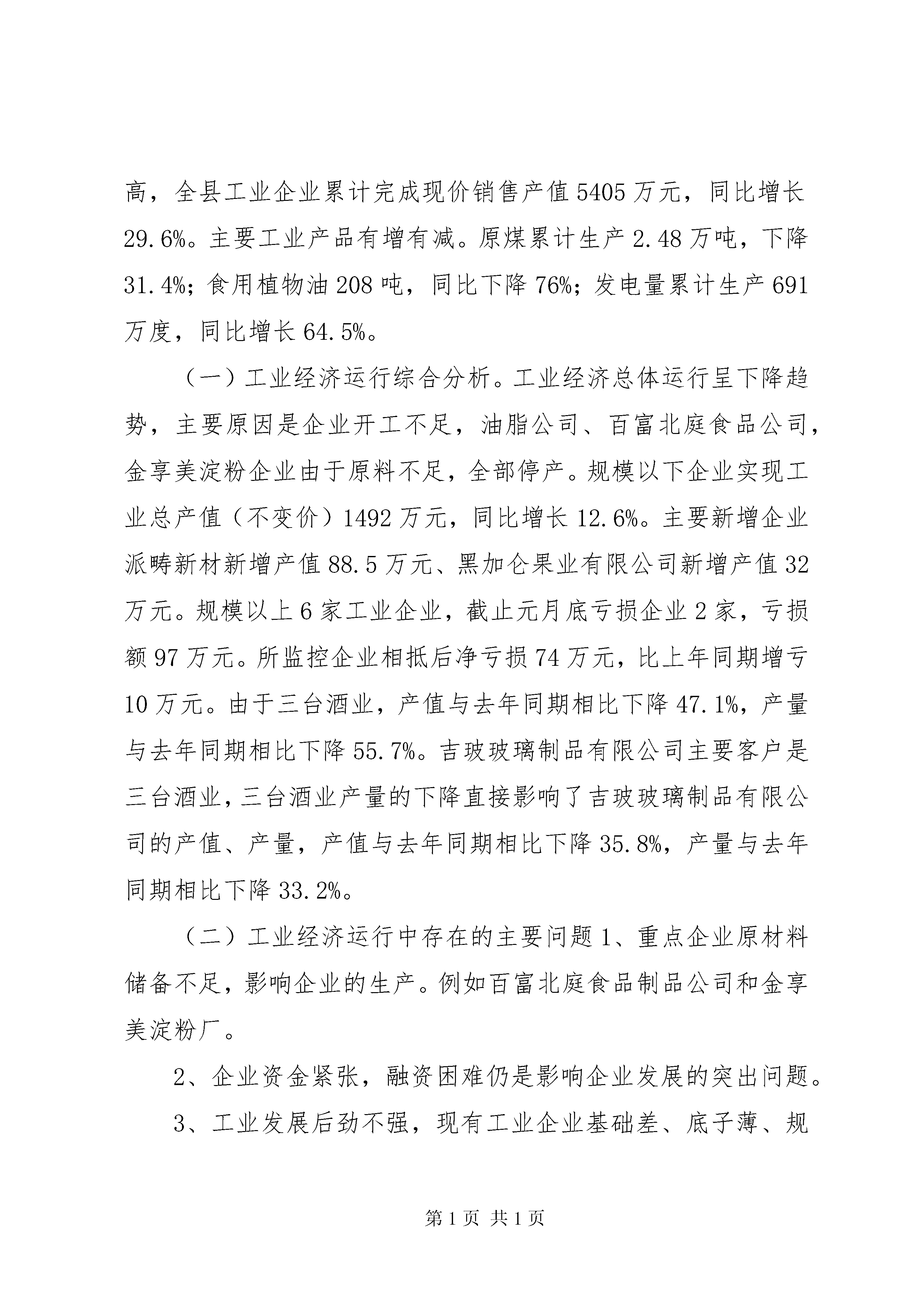 县工业经济及重点企业运行情况汇报材料**县当前工业经济及重点企业运行情况汇报材料各位领导:首先,我代表**县委、县人民政府向孙主任一行来我县调研工作表示热烈的欢迎。一、贯彻州党委八届十次全委(扩大)会议精神,确定2005年全县经济发展目标。根据州党委八届十次全委(扩大)会议精神,我县结合实际,在传达学习州经贸、园区、三产等专项工作会议精神的基础上,研究制定2005年经济发展的总体要求和预期奋斗目标:2005年我县将紧紧围绕增加城乡居民收入、提高生活质量和增加财政收入、增强财政实力两大目标,依托优势资源发展壮大特色产业,优化一产,扩张二产,提升三产,加速“1132”工程建设步伐,全面提高经济发展的整体素质和竞争力。预期目标为:全县地区生产总值达到(现价)11.34亿元,增长13.5%;其中:第一产业达到5.05亿元,增长6%;第二产业达到2.76亿元,增长18%;第三产业达到3.53亿元,增长18%。实现社会消费品零售总额3.16亿元,增长15%。二、工业经济指标落实及当前运行情况全县计划完成工业总产值(不变价)33135万元,工业总产值(现价)56218万元,工业增加值18900万元,增加27.1%。截至二月底,全县累计完成工业总产值1833.6万元(不变价),同比下降14.9%。实现工业增加值863万元,同比下降2.1%。工业产品产销衔接逐步提高,全县工业企业累计完成现价销售产值5405万元,同比增长29.6%。主要工业产品有增有减。原煤累计生产2.48万吨,下降31.4%;食用植物油208吨,同比下降76%;发电量累计生产691万度,同比增长64.5%。(一)工业经济运行综合分析。工业经济总体运行呈下降趋势,主要原因是企业开工不足,油脂公司、百富北庭食品公司,金享美淀粉企业由于原料不足,全部停产。规模以下企业实现工业总产值(不变价)1492万元,同比增长12.6%。主要新增企业派畴新材新增产值88.5万元、黑加仑果业有限公司新增产值32万元。规模以上6家工业企业,截止元月底亏损企业2家,亏损额97万元。所监控企业相抵后净亏损74万元,比上年同期增亏10万元。由于三台酒业,产值与去年同期相比下降47.1%,产量与去年同期相比下降55.7%。吉玻玻璃制品有限公司主要客户是三台酒业,三台酒业产量的下降直接影响了吉玻玻璃制品有限公司的产值、产量,产值与去年同期相比下降35.8%,产量与去年同期相比下降33.2%。(二)工业经济运行中存在的主要问题1、重点企业原材料储备不足,影响企业的生产。例如百富北庭食品制品公司和金享美淀粉厂。2、企业资金紧张,融资困难仍是影响企业发展的突出问题。3、工业发展后劲不强,现有工业企业基础差、底子薄、规模小、工业产品缺乏市场竞争力和抵御市场风险的能力。(三)第一季度工业经济发展预测全县累计完成工业总产值2856万元(不变价),同比下降10%。现价工业总产值6199万元,同比增长11.4%。实现工业增加值1863万元,同比下降2%。三、加快发展第三产业情况预期宏观发展目标。2005年第三产业增加值达3.53亿,增长18%,社会消费零售总额实现3.61亿元,增长15%,第三产业从业人员达1万人。到2019年,第三产业比重达到33%。其中旅游、文体、信息、教育、卫生、房地产、社区服务等新兴产业增加值占第三产业增加值的比重达42%以上。(一)加强领导,成立机构,完善内部工作机制。按照“科学谋划、分类指导、重点突破、打造品牌”的思路,营造三产后发优势,成立XX县区落实自治州加快二、三产业及工业园区发展领导小组,组长由县委书记担任,副组长由县长等分管县领导担任,领导小组下设办公室,办公室设在县经济贸易委员会。为明确职责,落实各项工作任务,在领导小组统一领导下,成立工业园区、第三产业、工业经济、城市建设,旅游经济,社会发展和项目招商工作小组,分别由分管的副书记、副县长担任组长,围绕经济和社会发展重点,把任务分解到主管部门,实行目标考核制管理。建立向自治州请示汇报制度。每个季度向自治州分管领导和“发展办”汇报一次我县经济和社会发展的工作,以协调解决我县自身难以解决的一些问题。(二)加强政府的宏观调控和引导,完善和规范第三产业发展。一是研究制定《吉木萨尔加快第三产业发展意见》,将财税、土地、收费、信贷等优惠政策落到实处;二是加强三产软环境建设,设立优化三产投资发展环境办公室,将其纳入整顿规范市场经济秩序工作中,坚决制止乱收费、乱摊派、乱罚款现象发生;三是消除歧视政策,提高审批工作效率,充分调动民间资金发展各类服务行业的积极性;四是整顿经济秩序,维护公平竞争机制。(三)加快市场体系的培育,促进生产,引导消费。建立多种经济成分的流通网络。用现代化营销观念、组织形式、管理手段改造传统市场,打造三产发