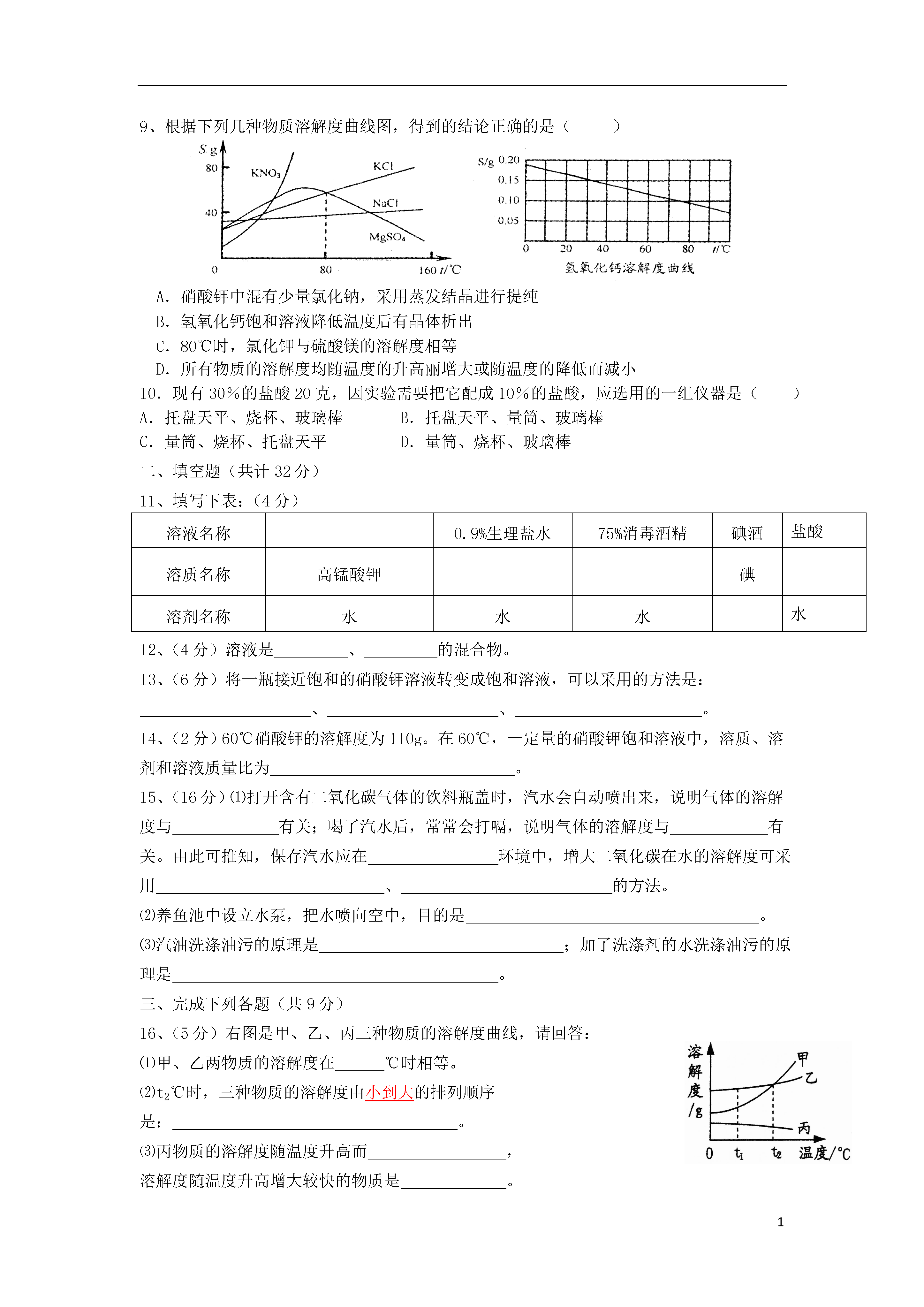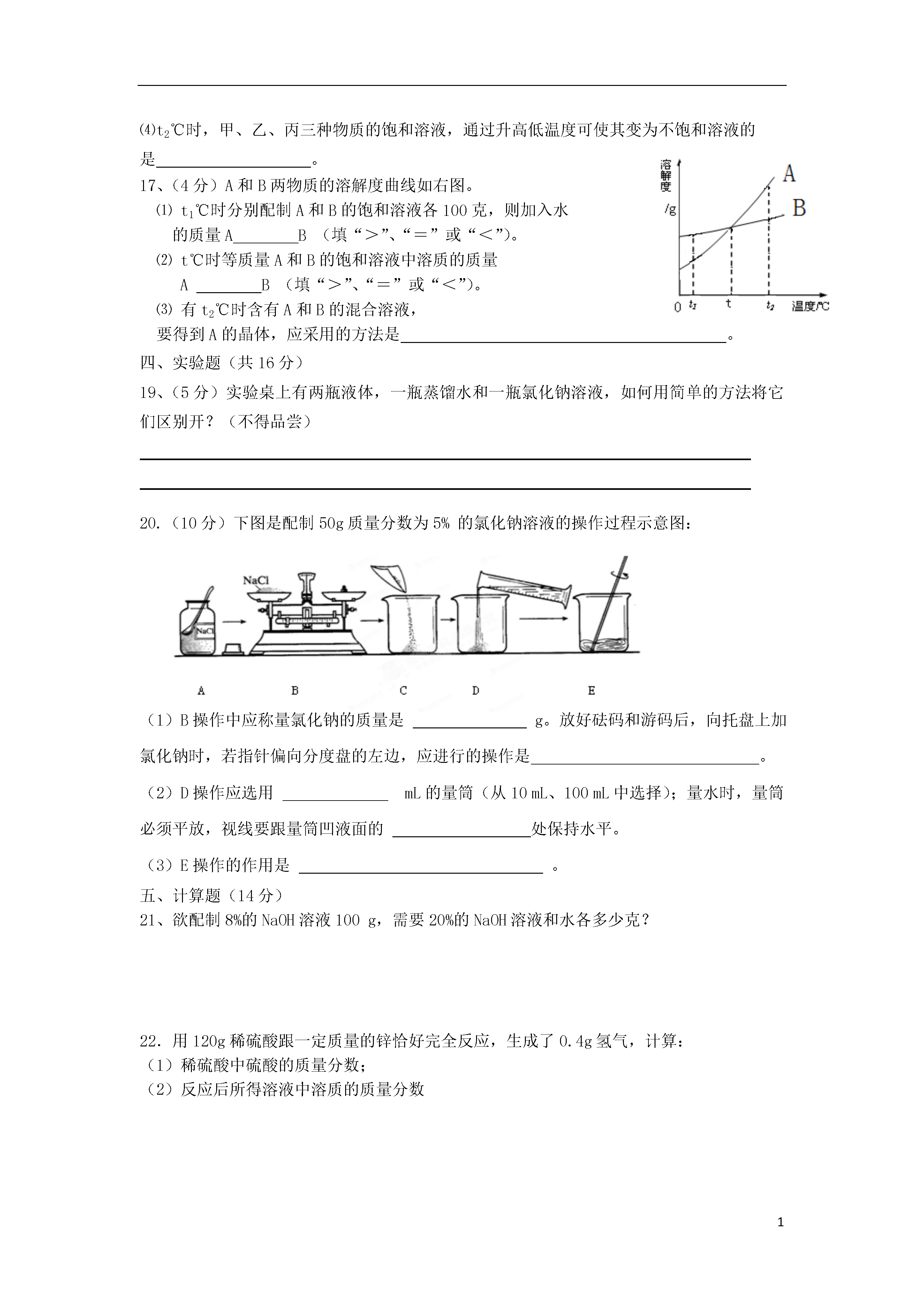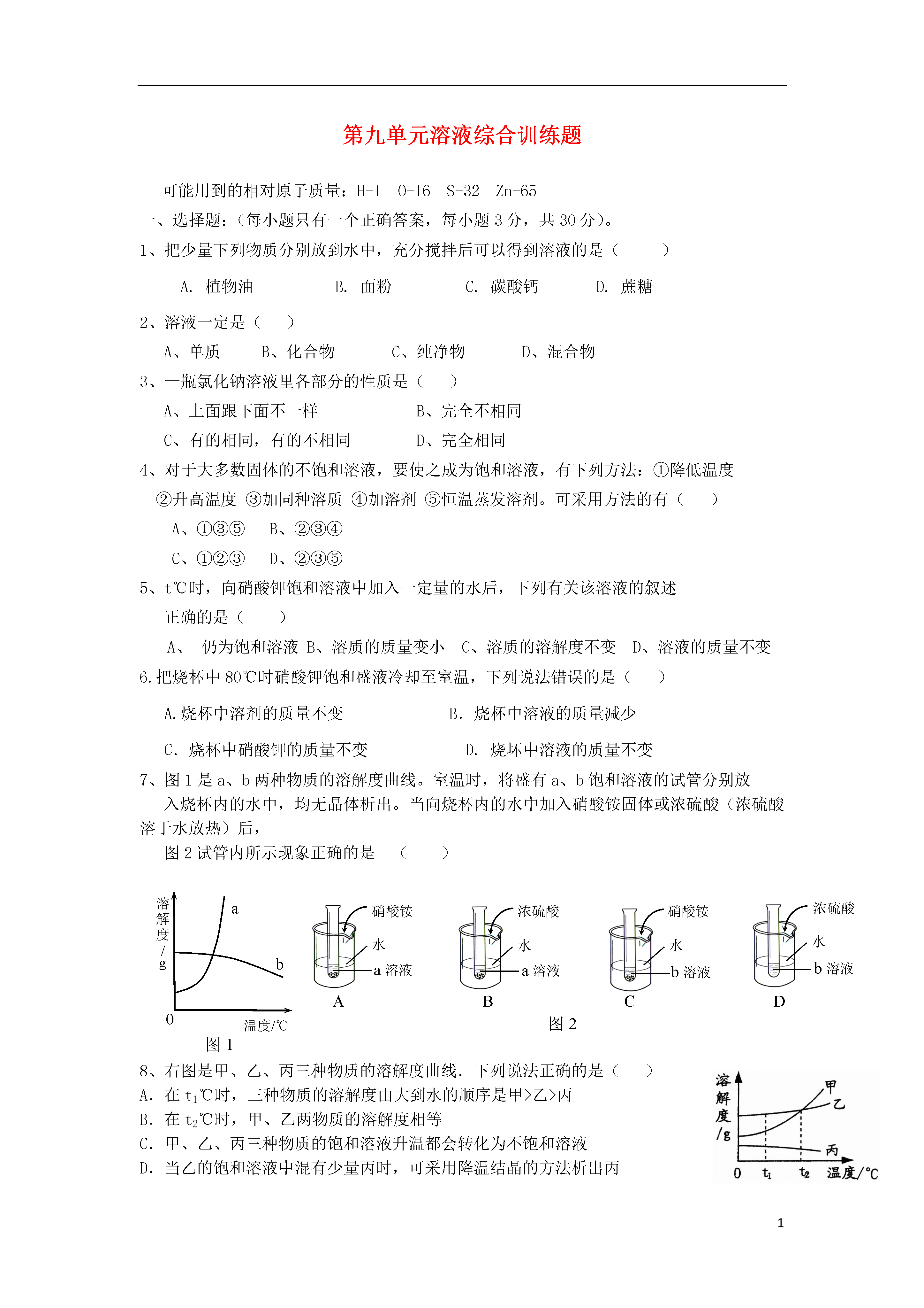 1第九单元溶液综合训练题可能用到的相对原子质量:H-1O-16S-32Zn-65一、选择题:(每小题只有一个正确答案,每小题3分,共30分)。1、把少量下列物质分别放到水中,充分搅拌后可以得到溶液的是()A.植物油B.面粉C.碳酸钙D.蔗糖2、溶液一定是()A、单质B、化合物C、纯净物D、混合物3、一瓶氯化钠溶液里各部分的性质是()A、上面跟下面不一样B、完全不相同C、有的相同,有的不相同D、完全相同4、对于大多数固体的不饱和溶液,要使之成为饱和溶液,有下列方法:①降低温度②升高温度③加同种溶质④加溶剂⑤恒温蒸发溶剂。可采用方法的有()A、①③⑤B、②③④C、①②③D、②③⑤5、t℃时,向硝酸钾饱和溶液中加入一定量的水后,下列有关该溶液的叙述正确的是()仍为饱和溶液B、溶质的质量变小C、溶质的溶解度不变D、溶液的质量不变6.把烧杯中80℃时硝酸钾饱和盛液冷却至室温,下列说法错误的是()A.烧杯中溶剂的质量不变B.烧杯中溶液的质量减少C.烧杯中硝酸钾的质量不变D.烧坏中溶液的质量不变7、图1是a、b两种物质的溶解度曲线。室温时,将盛有a、b饱和溶液的试管分别放入烧杯内的水中,均无晶体析出。当向烧杯内的水中加入硝酸铵固体或浓硫酸(浓硫酸溶于水放热)后,图2试管内所示现象正确的是()图1溶解度/g温度/℃0ba图2硝酸铵浓硫酸硝酸铵a溶液浓硫酸ABCD水水水水a溶液b溶液b溶液8、右图是甲、乙、丙三种物质的溶解度曲线.下列说法正确的是()A.在t1℃时,三种物质的溶解度由大到水的顺序是甲>乙>丙B.在t2℃时,甲、乙两物质的溶解度相等C.甲、乙、丙三种物质的饱和溶液升温都会转化为不饱和溶液D.当乙的饱和溶液中混有少量丙时,可采用降温结晶的方法析出丙9、根据下列几种物质溶解度曲线图,得到的结论正确的是()A.硝酸钾中混有少量氯化钠,采用蒸发结晶进行提纯B.氢氧化钙饱和溶液降低温度后有晶体析出C.80℃时,氯化钾与硫酸镁的溶解度相等D.所有物质的溶解度均随温度的升高丽增大或随温度的降低而减小10.现有30%的盐酸20克,因实验需要把它配成10%的盐酸,应选用的一组仪器是()A.托盘天平、烧杯、玻璃棒B.托盘天平、量筒、玻璃棒C.量筒、烧杯、托盘天平D.量筒、烧杯、玻璃棒二、填空题(共计32分)11、填写下表:(4分)溶液名称0.9%生理盐水75%消毒酒精碘酒盐酸溶质名称高锰酸钾碘溶剂名称水水水水12、(4分)溶液是、的混合物。13、(6分)将一瓶接近饱和的硝酸钾溶液转变成饱和溶液,可以采用的方法是:、、。14、(2分)60℃硝酸钾的溶解度为110g。在60℃,一定量的硝酸钾饱和溶液中,溶质、溶剂和溶液质量比为。15、(16分)⑴打开含有二氧化碳气体的饮料瓶盖时,汽水会自动喷出来,说明气体的溶解度与有关;喝了汽水后,常常会打嗝,说明气体的溶解度与有关。由此可推知,保存汽水应在环境中,增大二氧化碳在水的溶解度可采用、的方法。⑵养鱼池中设立水泵,把水喷向空中,目的是。⑶汽油洗涤油污的原理是;加了洗涤剂的水洗涤油污的原理是。三、完成下列各题(共9分)16、(5分)右图是甲、乙、丙三种物质的溶解度曲线,请回答:⑴甲、乙两物质的溶解度在℃时相等。⑵t2℃时,三种物质的溶解度由小到大的排列顺序是:。⑶丙物质的溶解度随温度升高而,溶解度随温度升高增大较快的物质是。⑷t2℃时,甲、乙、丙三种物质的饱和溶液,通过升高低温度可使其变为不饱和溶液的是。17、(4分)A和B两物质的溶解度曲线如右图。⑴t1℃时分别配制A和B的饱和溶液各100克,则加入水的质量AB(填“>”、“=”或“<”)。⑵t℃时等质量A和B的饱和溶液中溶质的质量AB(填“>”、“=”或“<”)。⑶有t2℃时含有A和B的混合溶液,要得到A的晶体,应采用的方法是。四、实验题(共16分)19、(5分)实验桌上有两瓶液体,一瓶蒸馏水和一瓶氯化钠溶液,如何用简单的方法将它们区别开?(不得品尝)20.(10分)下图是配制50g质量分数为5%的氯化钠溶液的操作过程示意图:(1)B操作中应称量氯化钠的质量是g。放好砝码和游码后,向托盘上加氯化钠时,若指针偏向分度盘的左边,应进行的操作是。(2)D操作应选用mL的量筒(从10mL、100mL中选择);量水时,量筒必须平放,视线要跟量筒凹液面的处保持水平。(3)E操作的作用是。五、计算题(14分)21、欲配制8%的NaOH溶液100g,需要20%的NaOH溶液和水各多少克?22.用120g稀硫酸跟一定质量的锌恰好完全反应,生