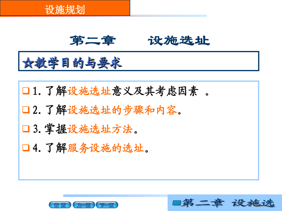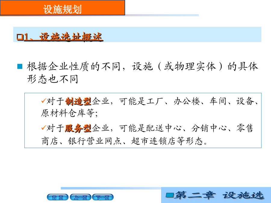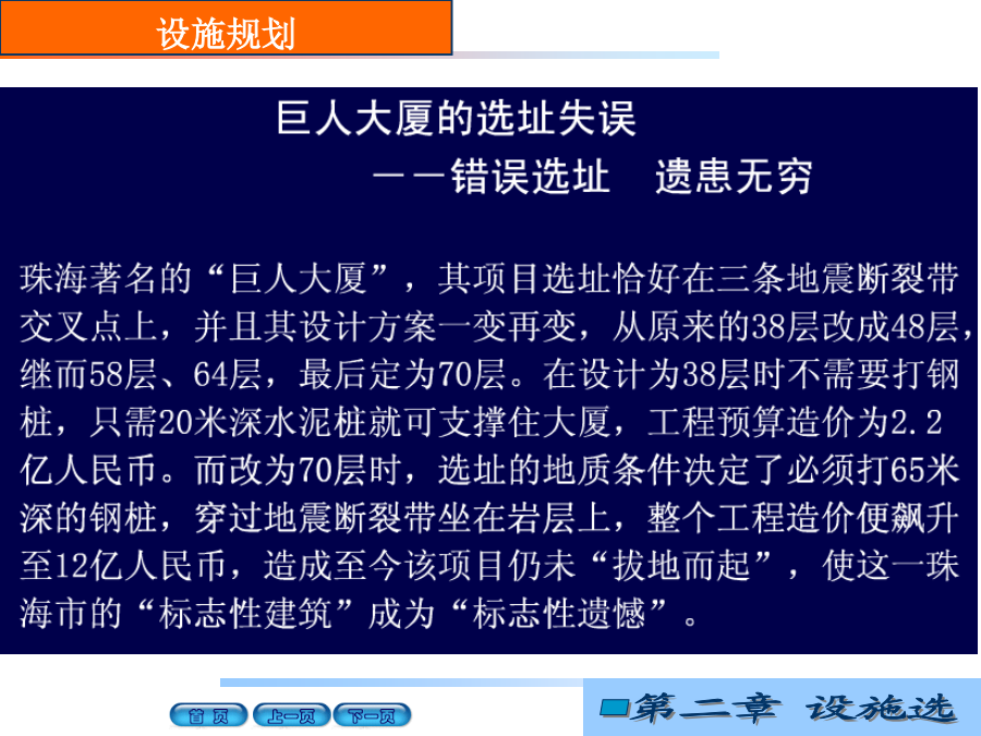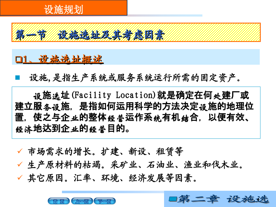 第二章设施选址4567渠道/用户服务水平 用户服务 产品和服务支持 回收处理3、设施选址的意义1213141516171819202122232425262728第二节设施选址的步骤及方案评价2、场址选择的步骤和内容41优缺点比较法用评价表格454647超市选址A地环境B地环境C地环境D地环境确定方法加权因素法步骤确定权重确定权重确定权重确定权重4加权因素法步骤确定等级确定等级确定等级确定等级考虑因素加权因素法步骤经营规模潜在顾客所处商圈竞争对手交通情况商品结构营业时间 考虑因素合计总结考虑 因素结论79808182作业84(2)重心法当产品成本中运输费用所占比重较大,企业的原材料由多个原材料供应地提供或其产品运往多个销售点,可以考虑用重心法选择运输费用最少的场址。表示第个供应点的运量 表示单位距离的运输费率 表示第供应点到工厂的距离90作业:某公司拟在某城市建设一座化工厂,该厂每年要从A、B、C、D四个原料供应地运来不同的原料。各地与城市中心的距离和年运量如下表,假定各种材料运输费率相同,用重心法确定该厂的合理位置。重心法单设施选址的假设条件93多设施选址多起点、多终点运输运输问题的模型98[例]某彩电公司有两个工厂A和B,三个仓库U、V、W,分别位于不同的城市。为求得发展,决定选择某城市建一新厂。现有两个备选厂址X和Y,位于不同城市,基本条件如下,请做出选择。表上作业法的基本思想是将产品优先分配给运费最少的销售点,解题步骤如下: 因供需不平衡,故在本题中增加虚拟仓库. 首先假设厂址X选中,其解如下: 第一步.选择最小运价为10(工厂A至仓库U),将工厂A的生产的2200台彩电运至仓库U,工厂A还剩600台,仓库U已需求满足,同时从表上将仓库U一列划去,不需要再讨论.工厂工厂第三步.选择最小运价为14(工厂B至仓库W),将工厂B的生产的200台彩电运至仓库W,工厂B还剩1800台,仓库W已需求满足,同时从表上将仓库W一列划去,不需要再讨论. 工厂工厂第五步,根据供需平衡,所以A运至虚拟仓库的运量为600台,B为400台.工厂假定厂址Y被选中,同理可通过以上步骤求得最终结果如下表所示:工厂作业:某企业通过两家工厂F1和F2向A、B、C、D四个售货点供货。现欲设另一工厂,可供选择的厂址的地点为F3和F4,各厂单位产品的生产费用及各厂至四个城市的运输费用如下表所示。试用线性规划----运输法选择一个最佳厂址。1121132010.01.06115116如果一条商业街上的店铺要出租,而你恰好想租一个铺位开店,那么,租哪段位置的铺位最好呢? 或者许多想当老板的人有这样的心理:租路口或街口当头的第一间,截住顾客,先吃头啖汤,生意一定最好!如果你这样选择,那就错了,大错特错!因为老板的心理不同于顾客的心理,老板想多赚钱而顾客却想少花钱,两者的心理恰恰是相反的。若想生意做得好,必须从顾客的心理去考虑。 两头的1/3处机会最大 价格几乎相同的日用小摊档,如青菜摊、凉茶摊之类的情况却与此相反,顾客越方便的摊位越好。 当然,这里说的是一般情况,如果你经营的非常好或非常差,在老顾客中造成了很大的声誉差距,情况就会发生变化。2010.01.06第五节选址问题基础及应用5.1选址问题分类的基础二、按选址目标区域的特征分类三、按选址的目标和成本函数分类Minisum/MinimaxMinisum/Minimax距离5.2选址问题模型应用132133134135WinQSB求解WinQSB求解138139140142多设施选址问题的主要应用之一是物流网络规划,或称为供应链设施选址。物流网络规划不仅仅是一个设施选址的问题,它的主要任务是确定产品从原材料起点到市场终点的整个流通渠道的结构,包括物流设施的类型、数量与位置,设施所服务的顾客群体与产品类型,以及产品在设施之间的运输方式。 物流网络规划主要解决的问题是:仓库数量、选址、所的权及规模;顾客需求在多个供应点(仓库或工厂)之间的分配;各地的库存量、使用的运输服务类型和顾客服务水平等。 由于供应商及顾客数量较大,仓库和工厂可选地址太多、运输方式选择多等原因,设计最优的物流网络结构是一个相当复杂的任务。 如果有足够的信息,可以借助一些数学与计算机模型,如图表模型、仿真模型、优化模型、启发式模型和专家系统模型来确定满意的设计方案。 对于多设施选址问题,如果还要确定每个新设施要为哪些客户(现有设施)服务,这个问题就是选址-分配问题(location-allocationproblem,LAP) 物流网络的进一步发展就是供应链决策,除了选址-分配决策之外,还包括容量、库存、采购、生产、运输方式和路径规划等决策问题,以及逆向物流、金融、风险管理等。145146Setcoveringormaxcovering?148