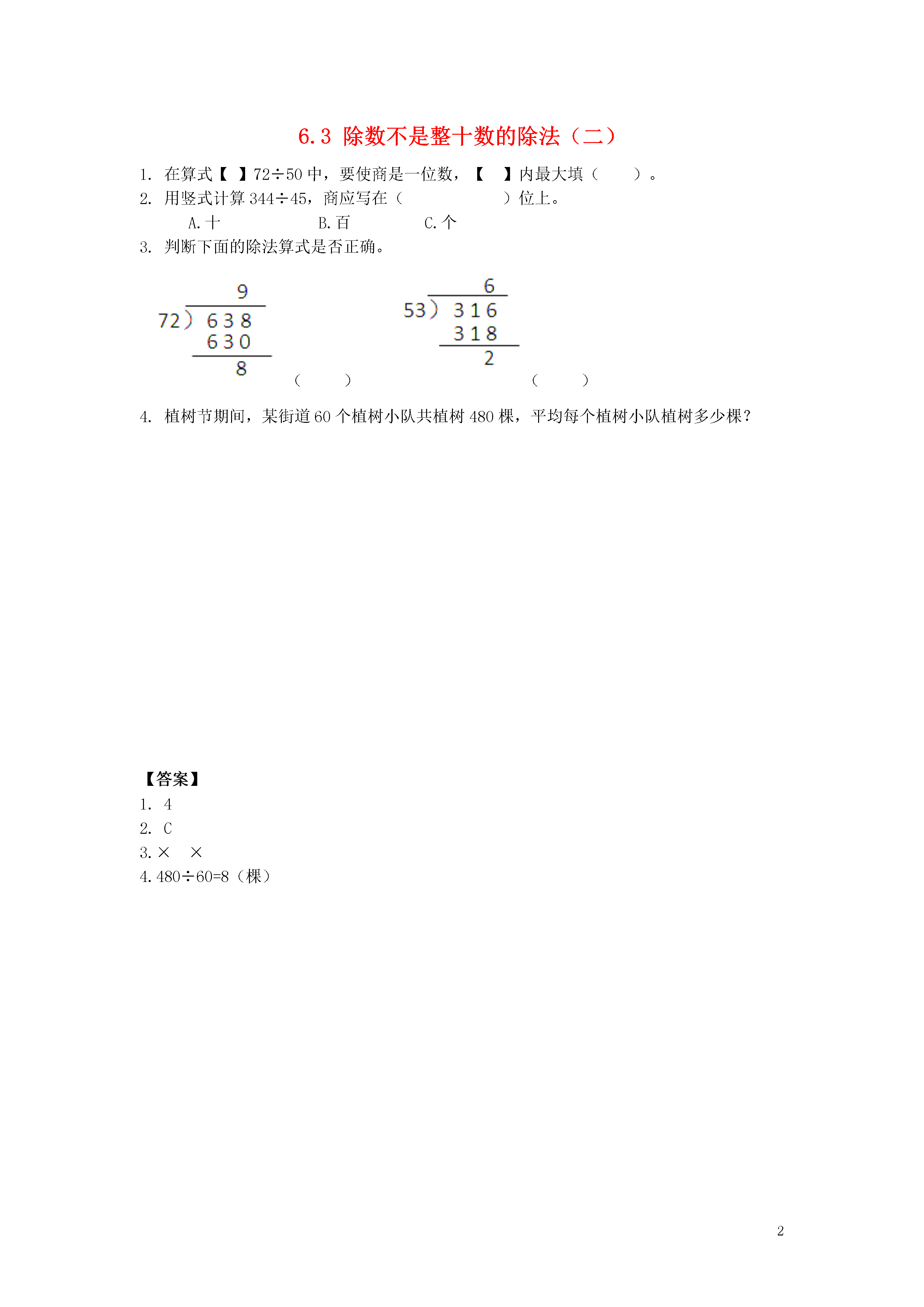 26.3除数不是整十数的除法(二)1.在算式【】72÷50中,要使商是一位数,【】内最大填()。2.用竖式计算344÷45,商应写在()位上。A.十B.百C.个3.判断下面的除法算式是否正确。()()4.植树节期间,某街道60个植树小队共植树480棵,平均每个植树小队植树多少棵?【答案】1.42.C3.××4.480÷60=8(棵)